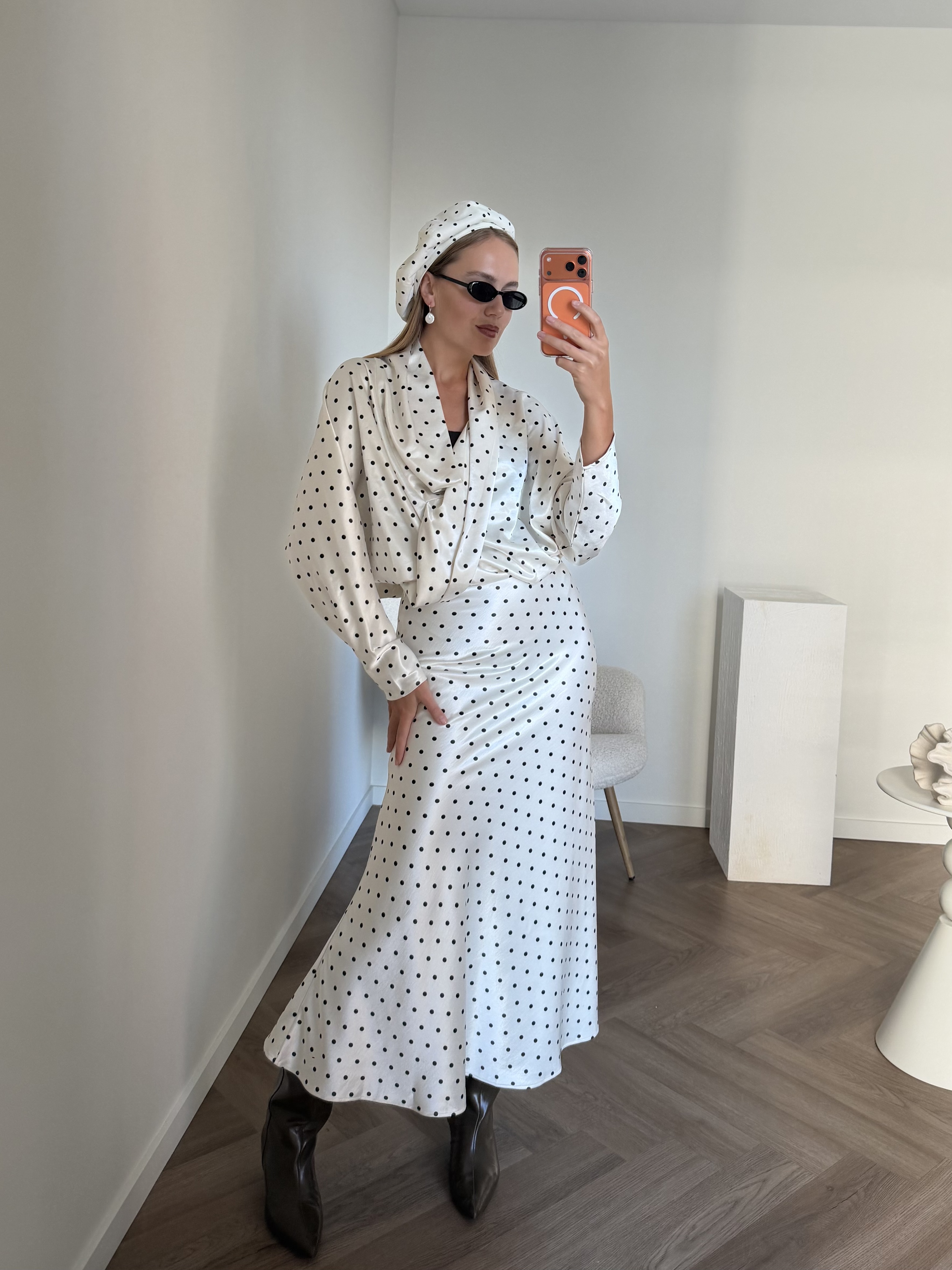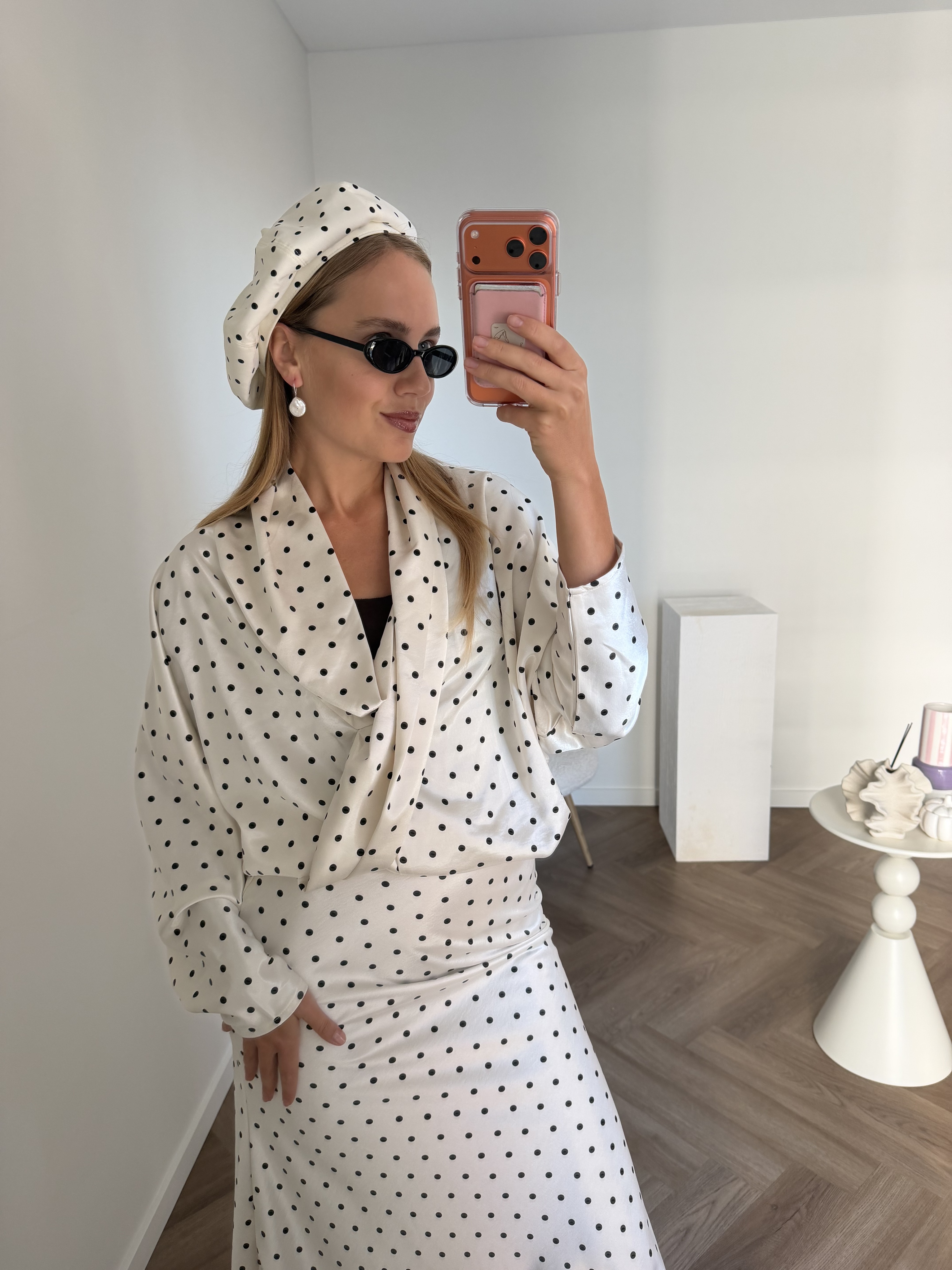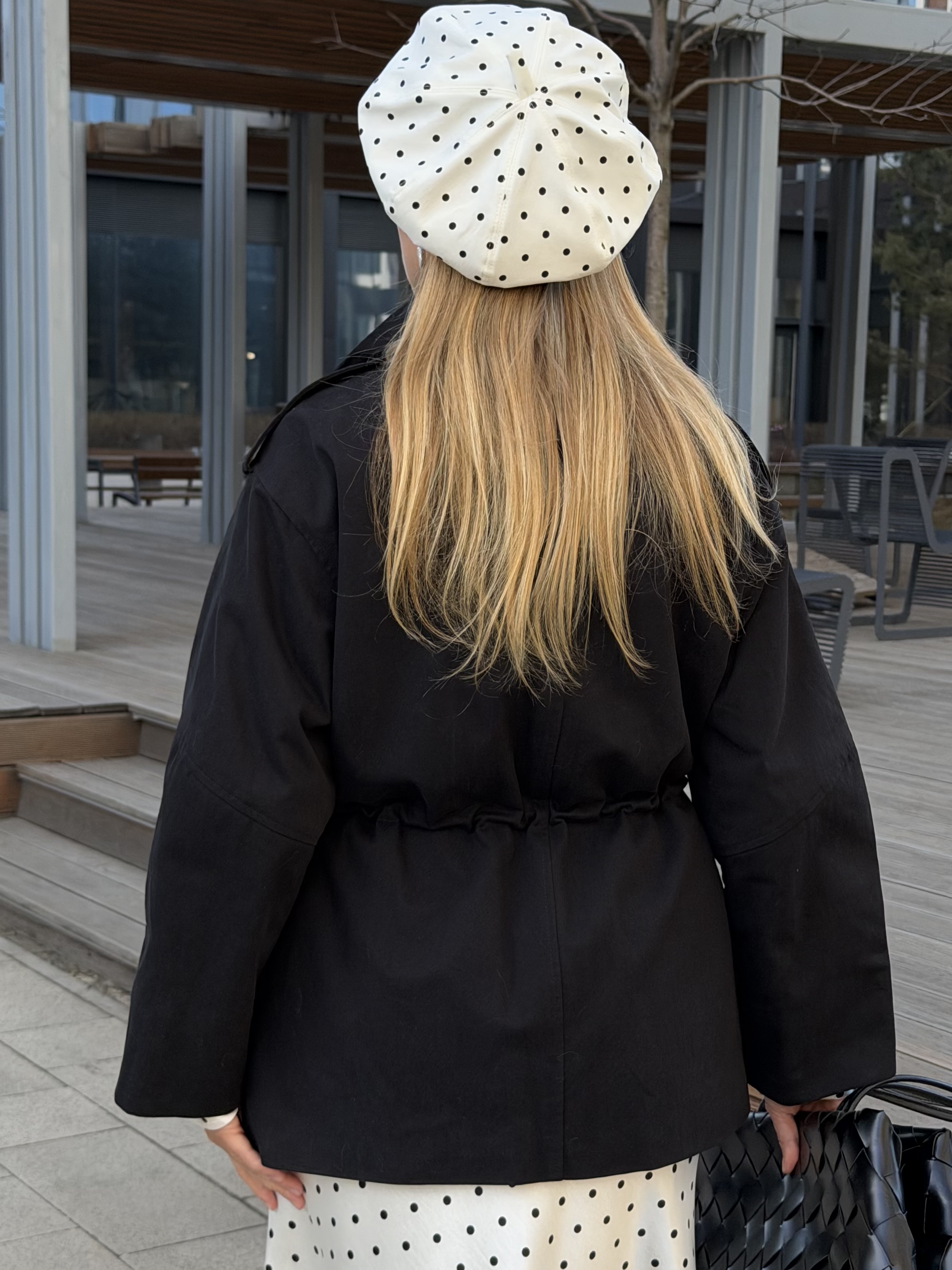 Мягкий текстильный берет классической формы с аккуратной посадкой по голове. Модель выполнена из лёгкой ткани и украшена мелким контрастным горошком.