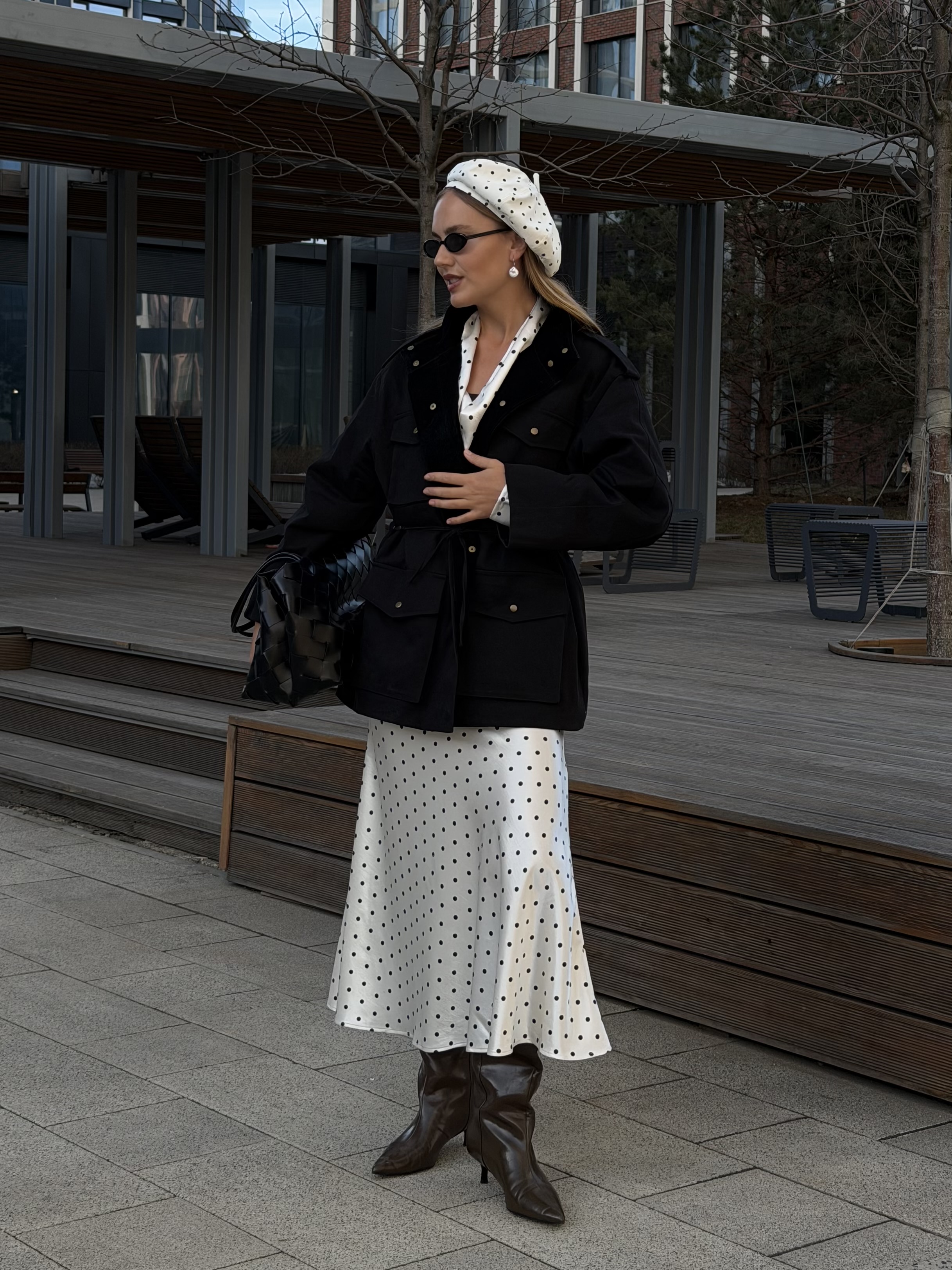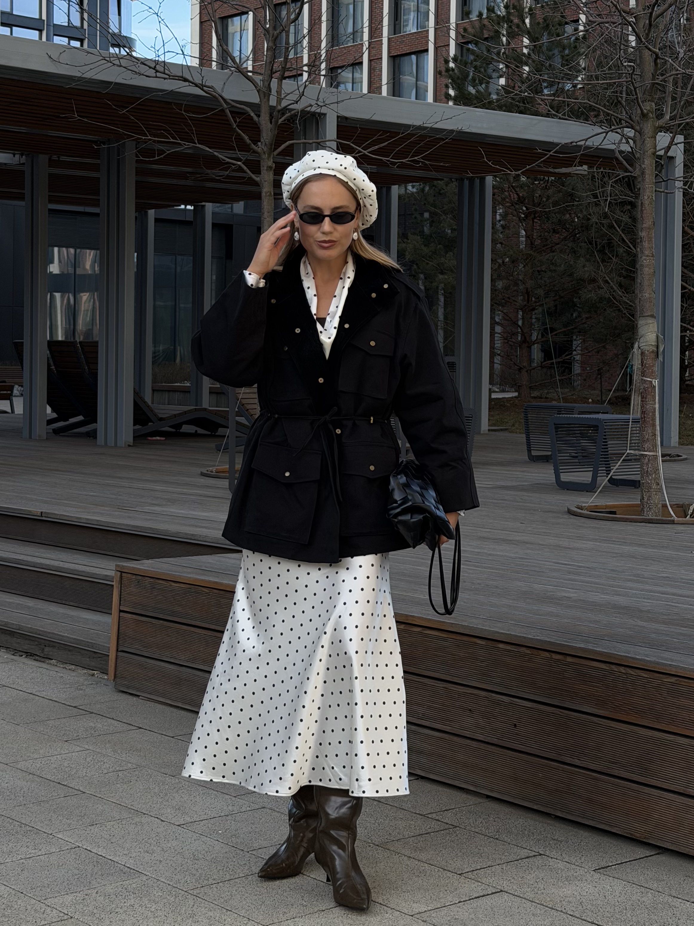 Берет добавляет образу французское настроение и служит выразительным акцентом, сохраняя лёгкость и игривость стилизации.