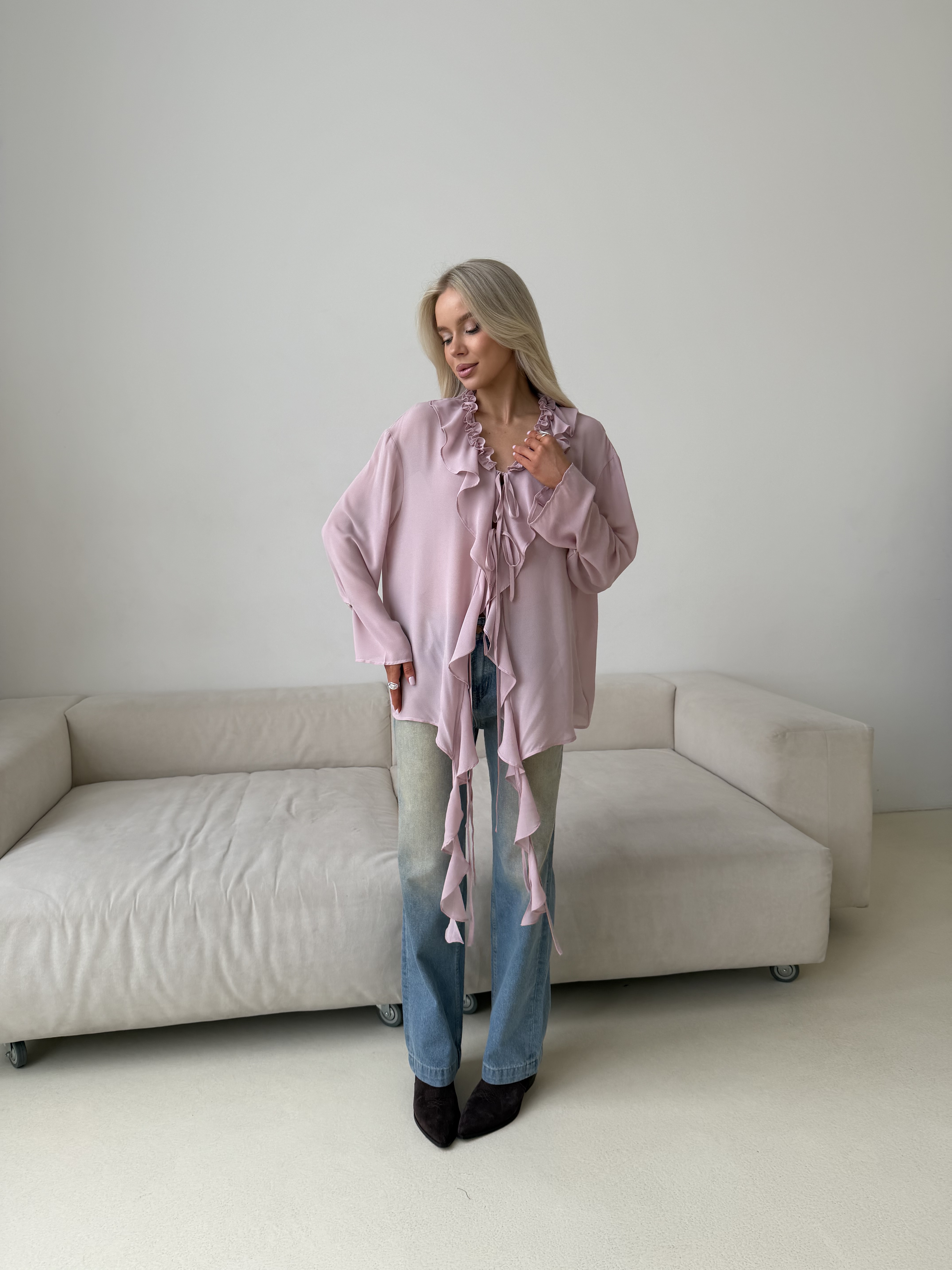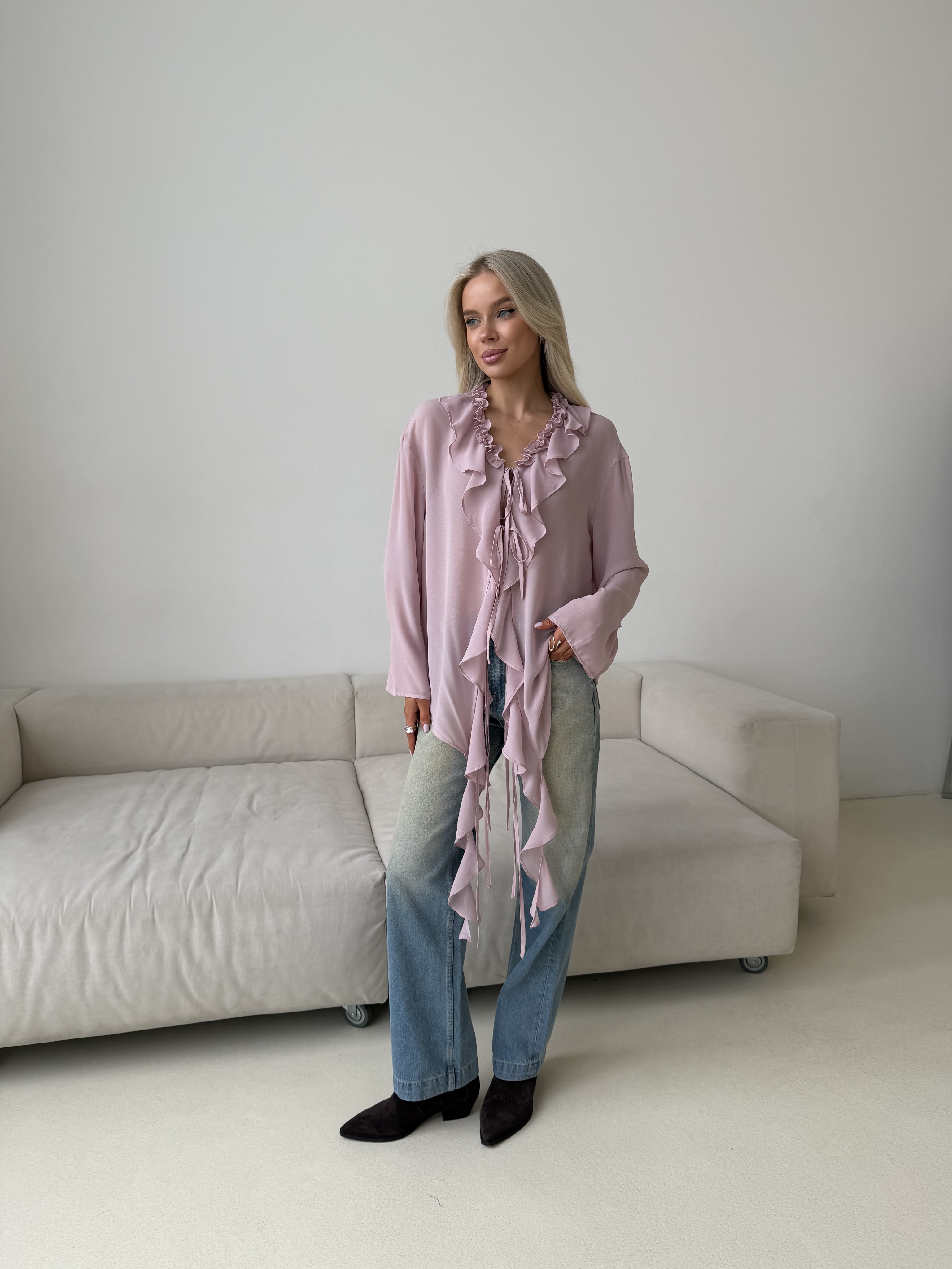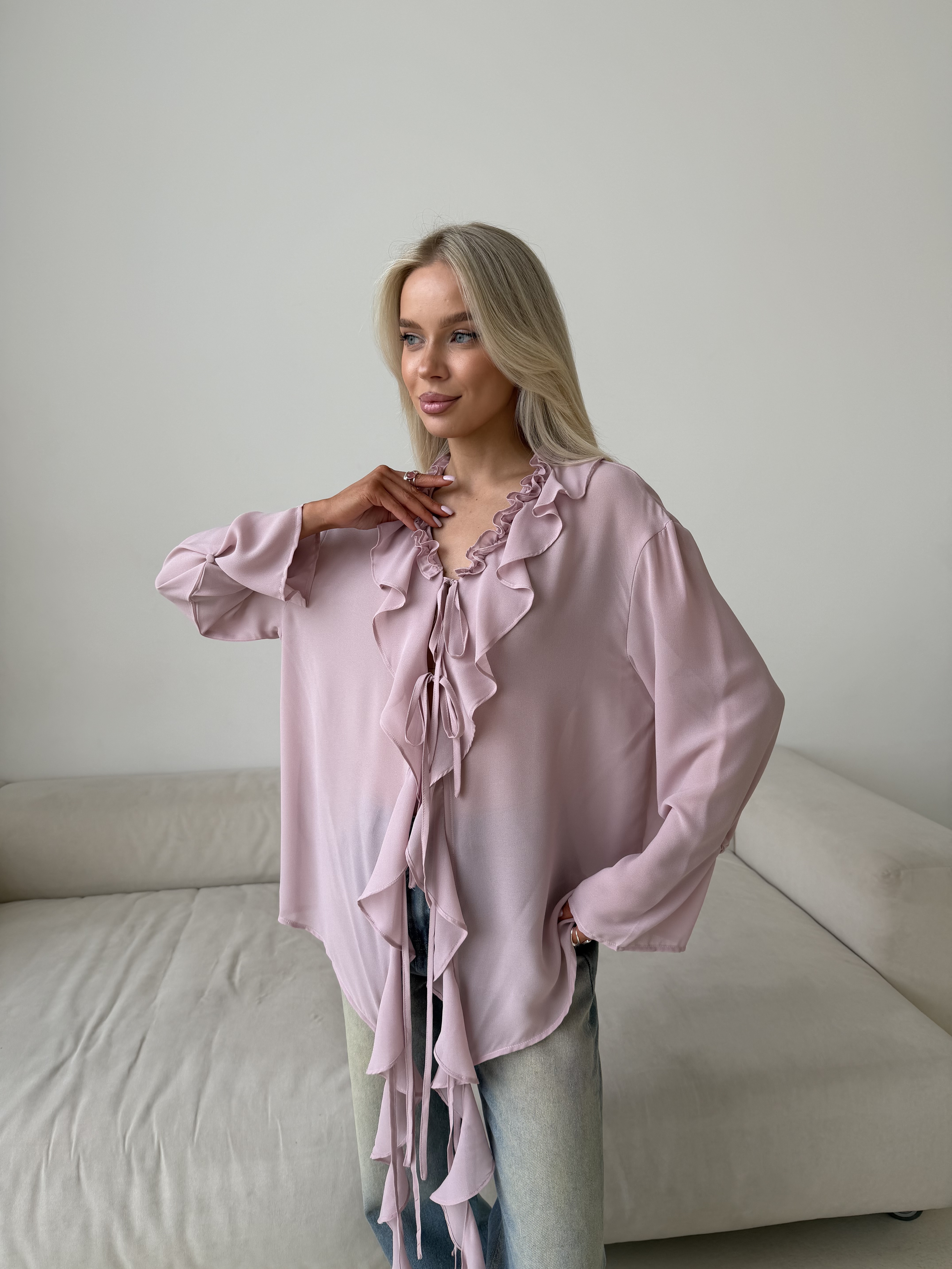 Лёгкая блуза с акцентной вертикалью из рюшей и декоративными завязками спереди делает силуэт более вытянутым и визуально стройным.