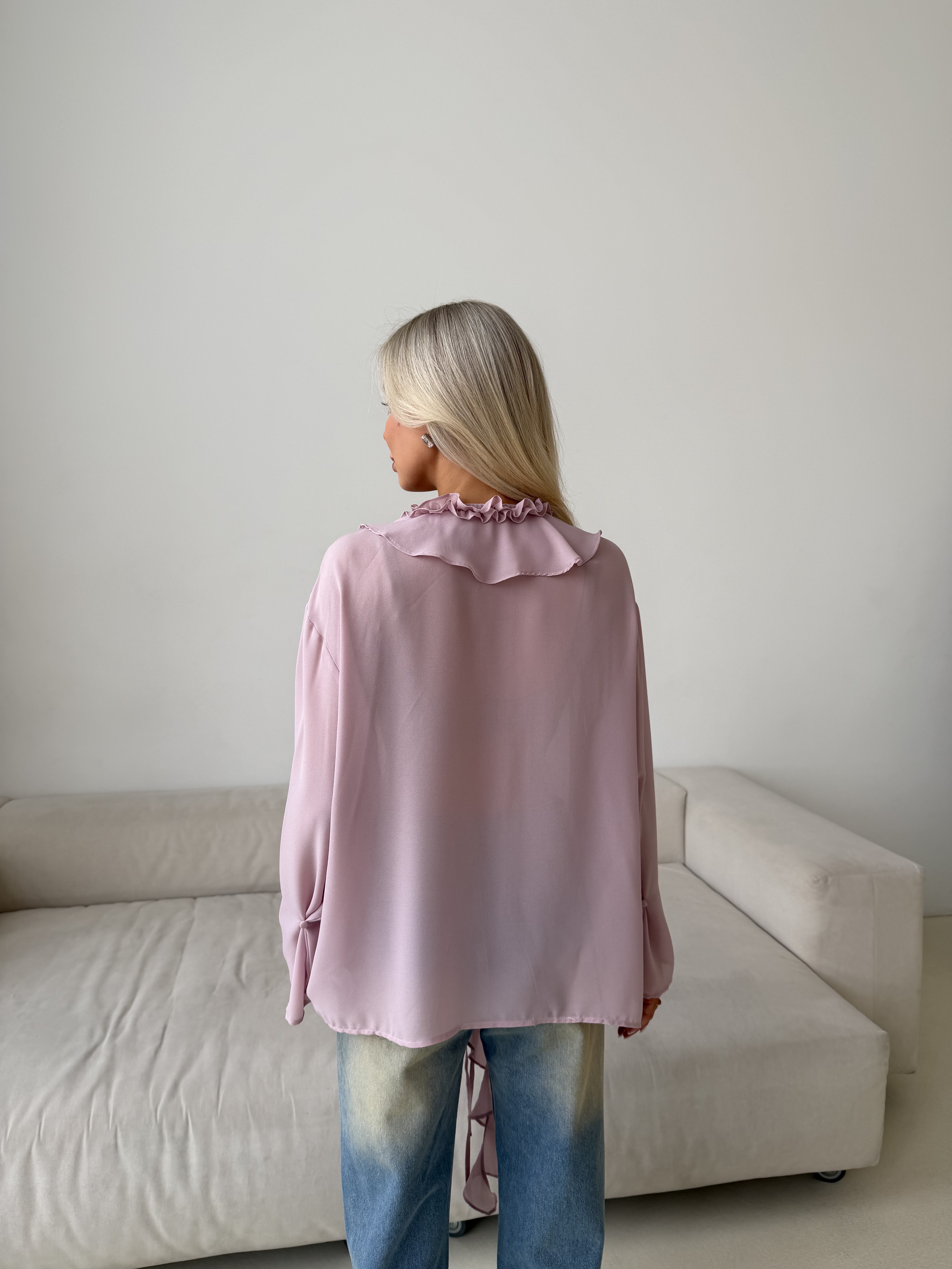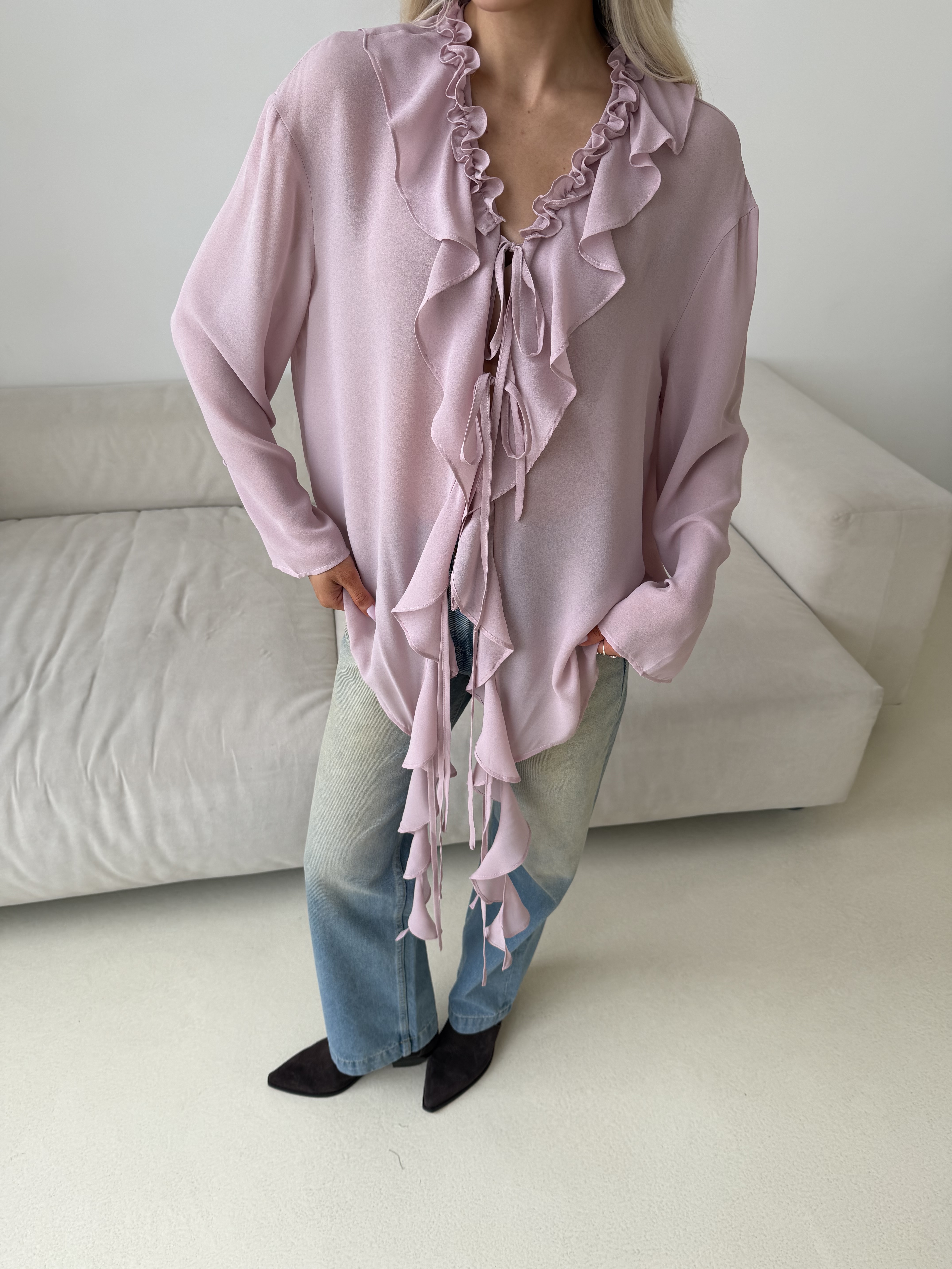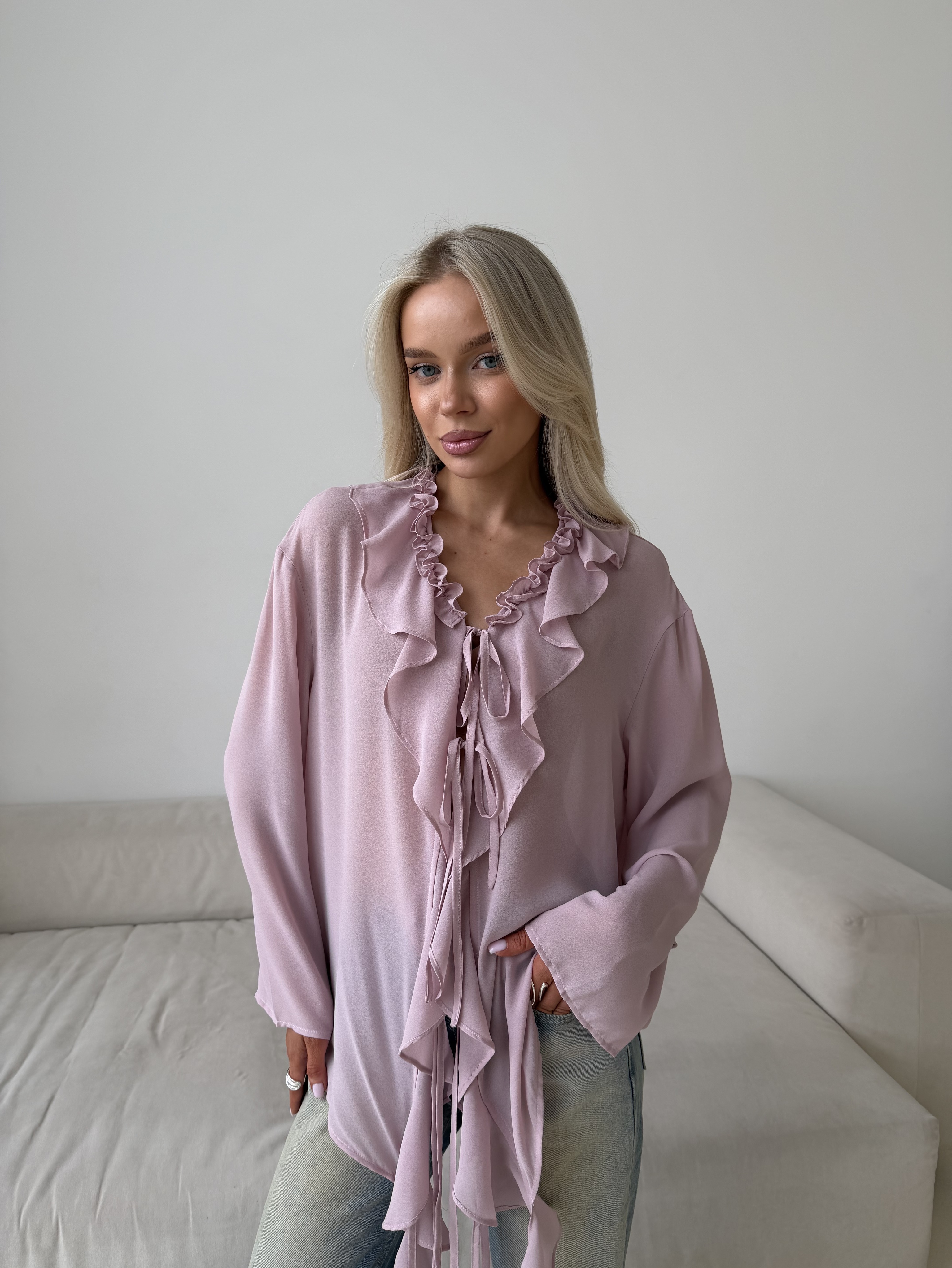 Лёгкая блуза с акцентной вертикалью из рюшей и декоративными завязками спереди делает силуэт более вытянутым и визуально стройным.