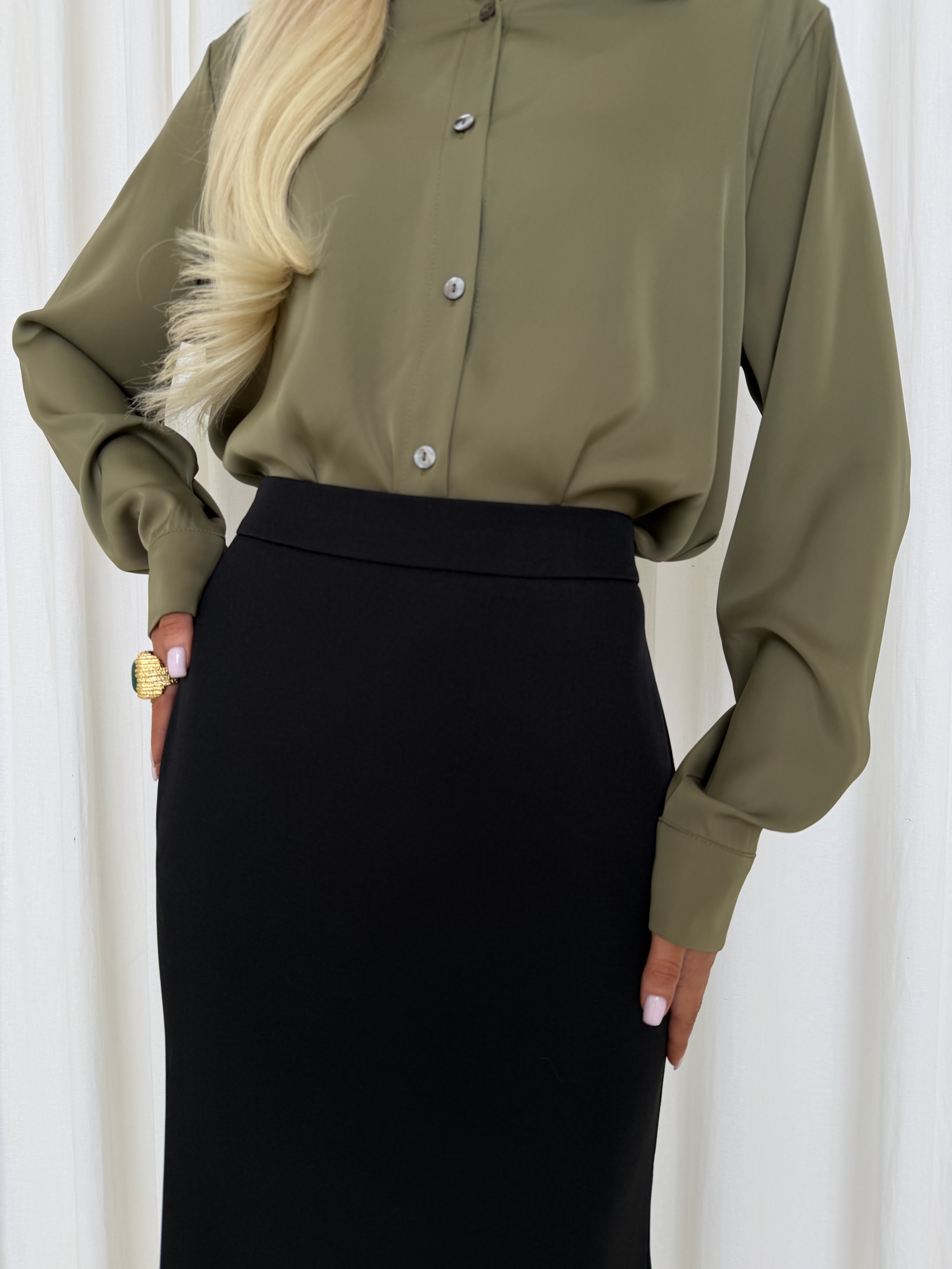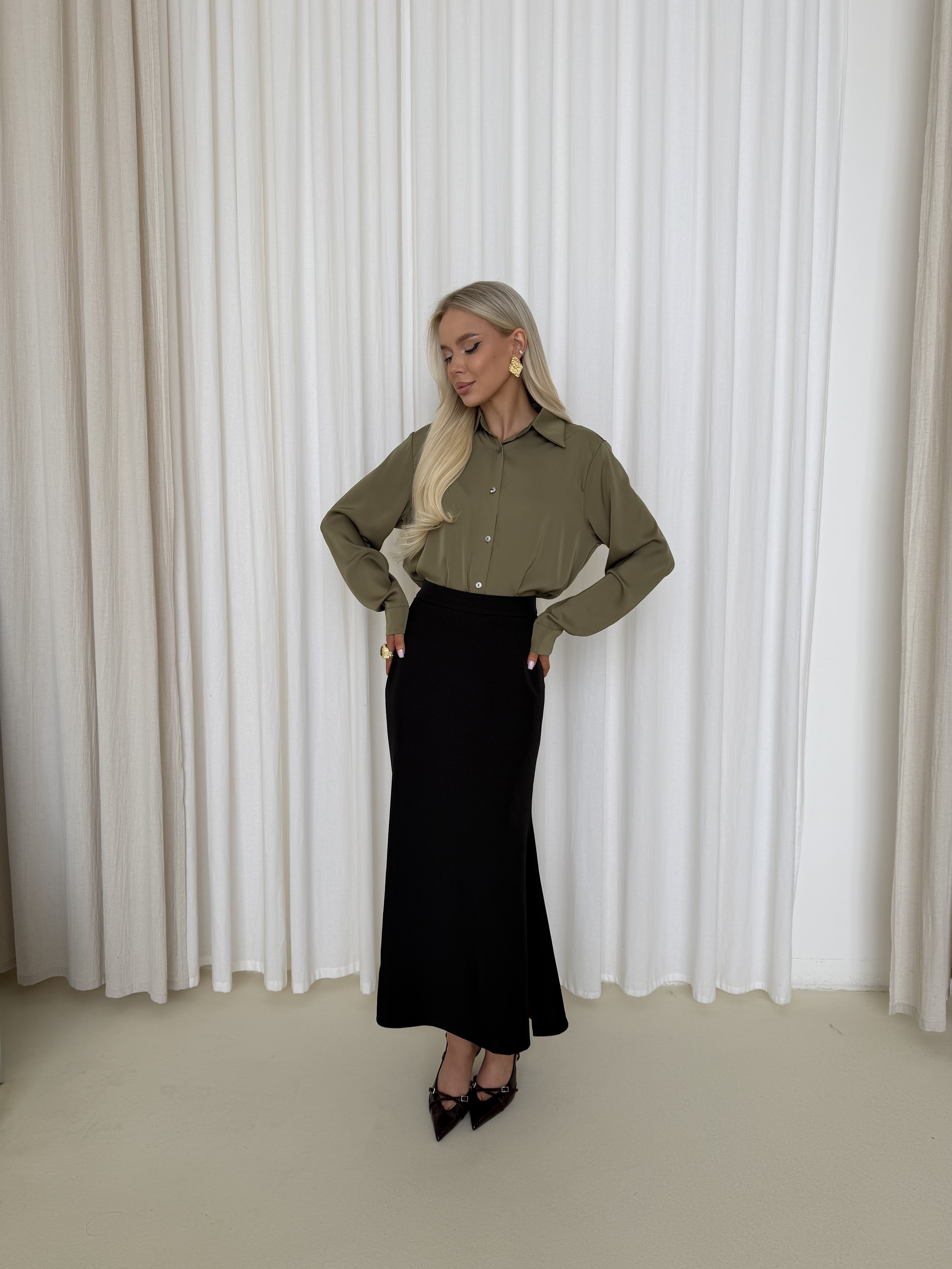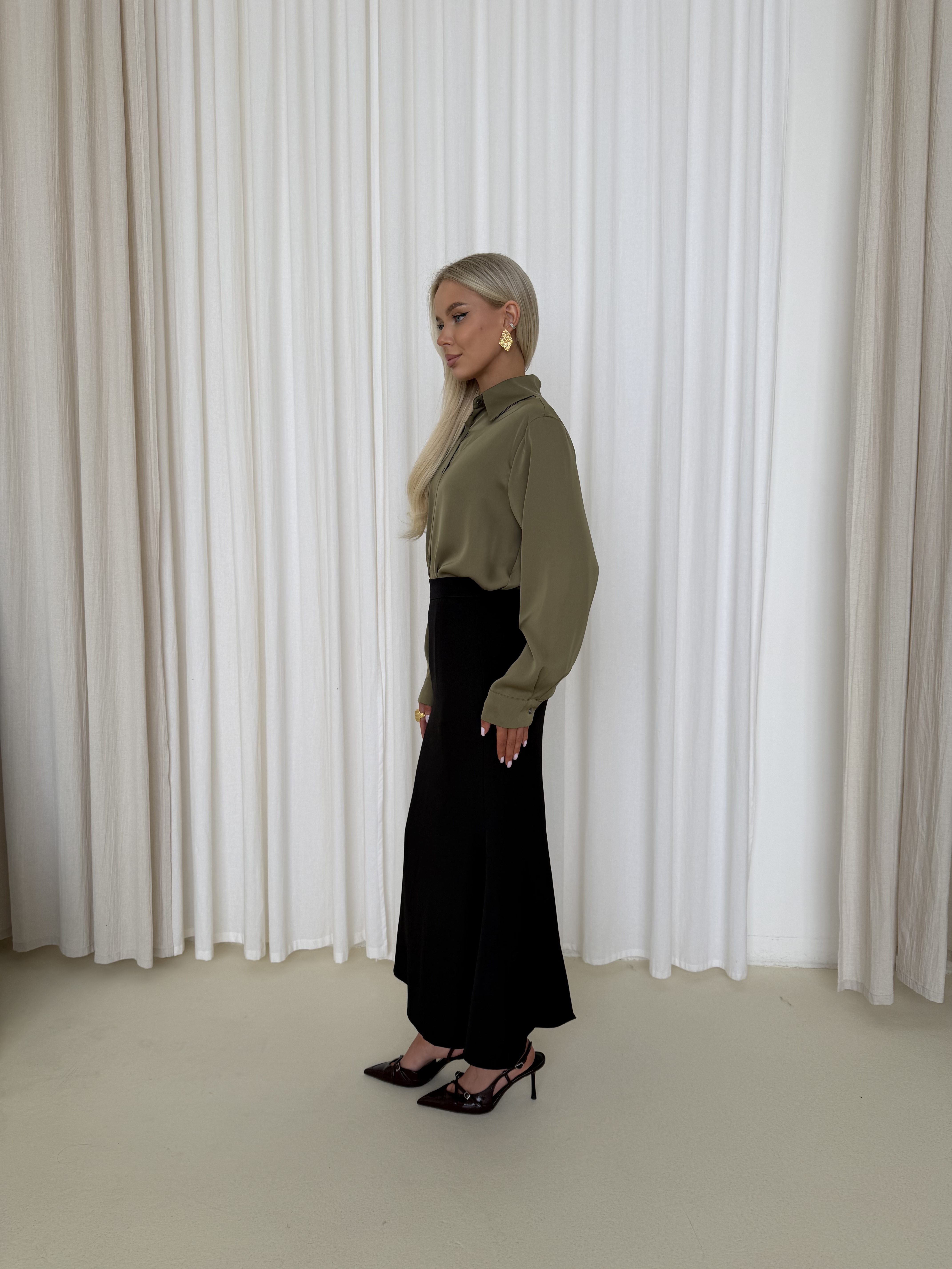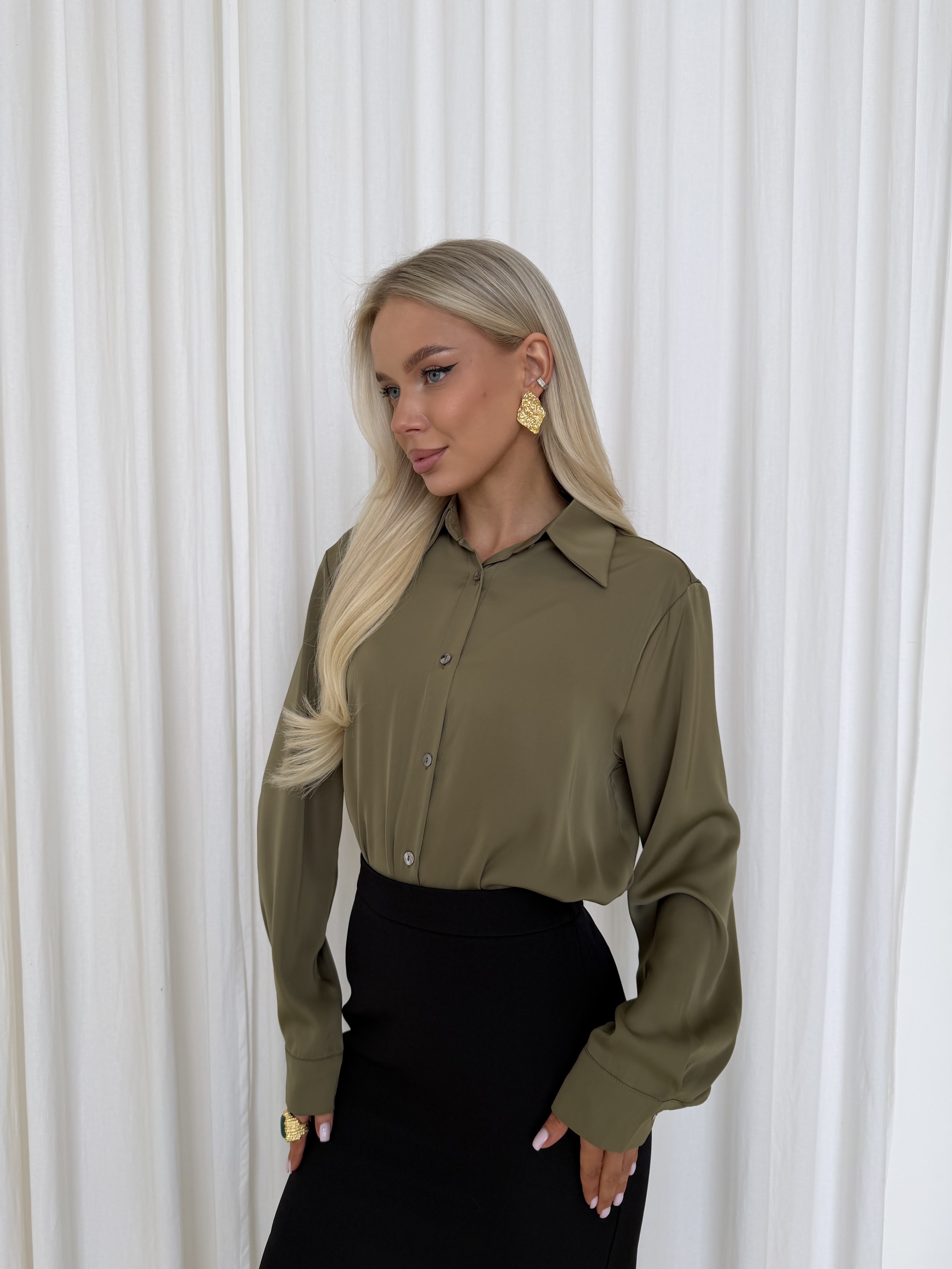 Блуза из атласа в оттенке олива — элегантная модель с мягким благородным блеском. Ткань красиво переливается при движении и придаёт образу глубину, оставаясь при этом лаконичной и универсальной.