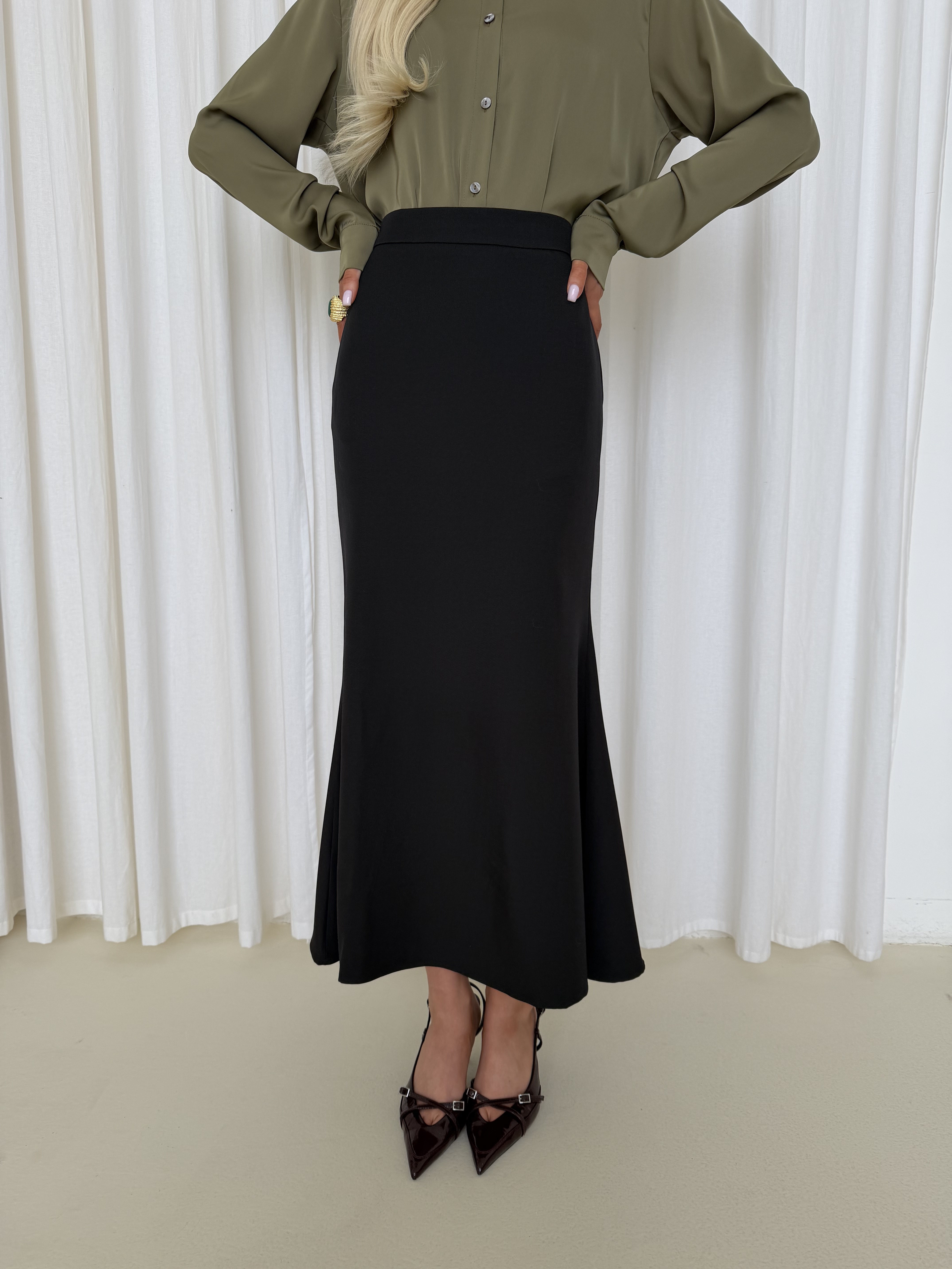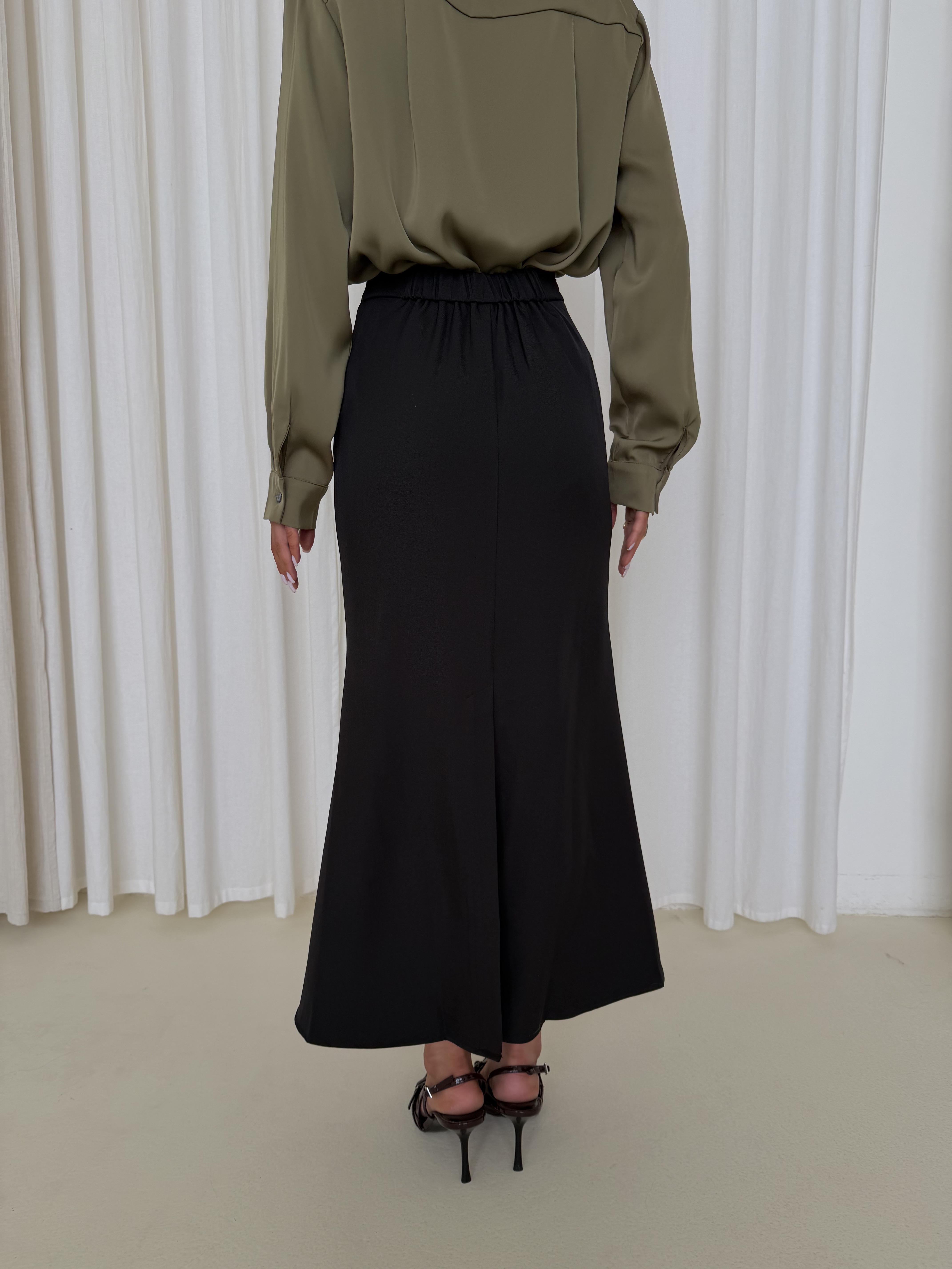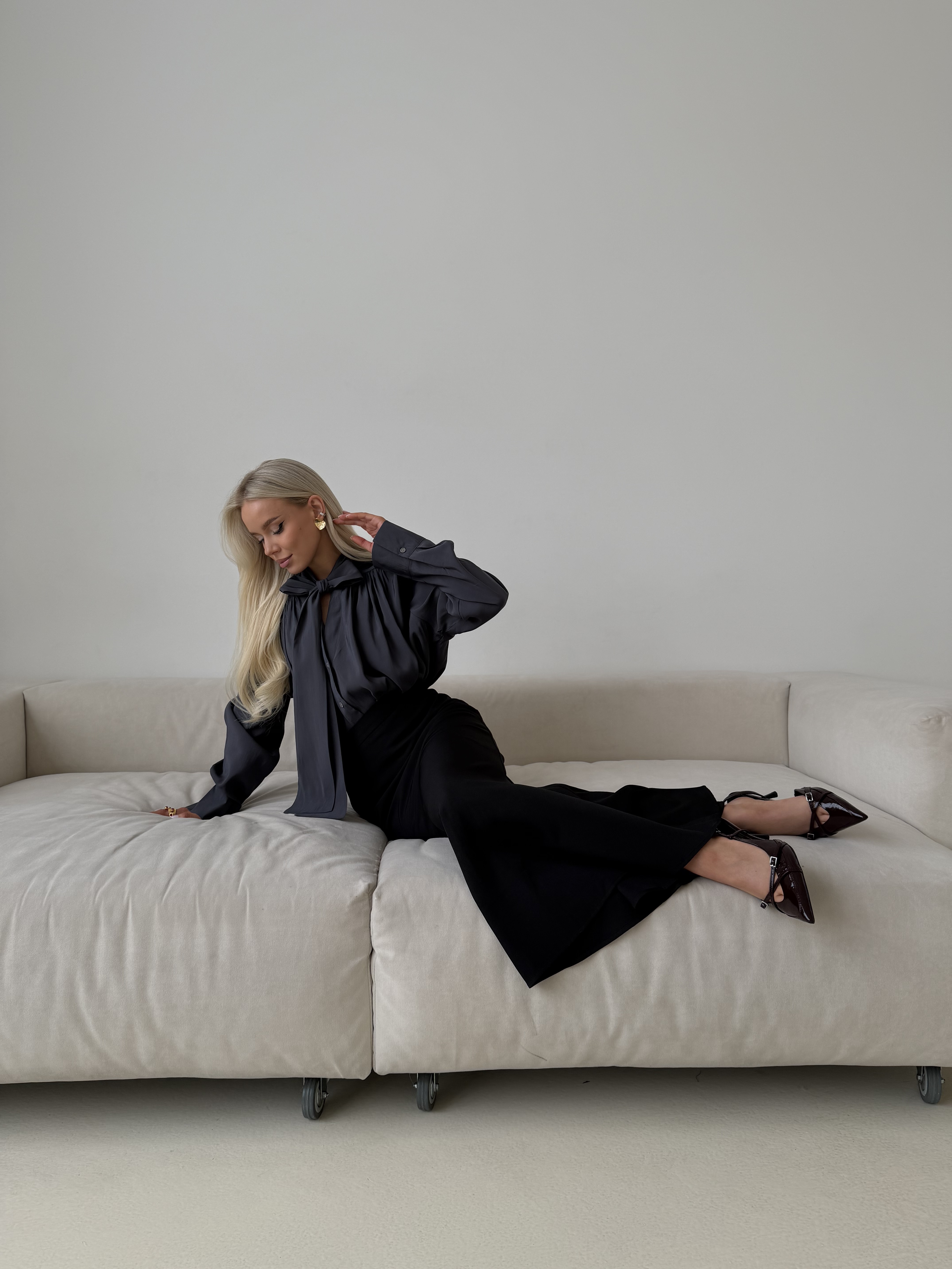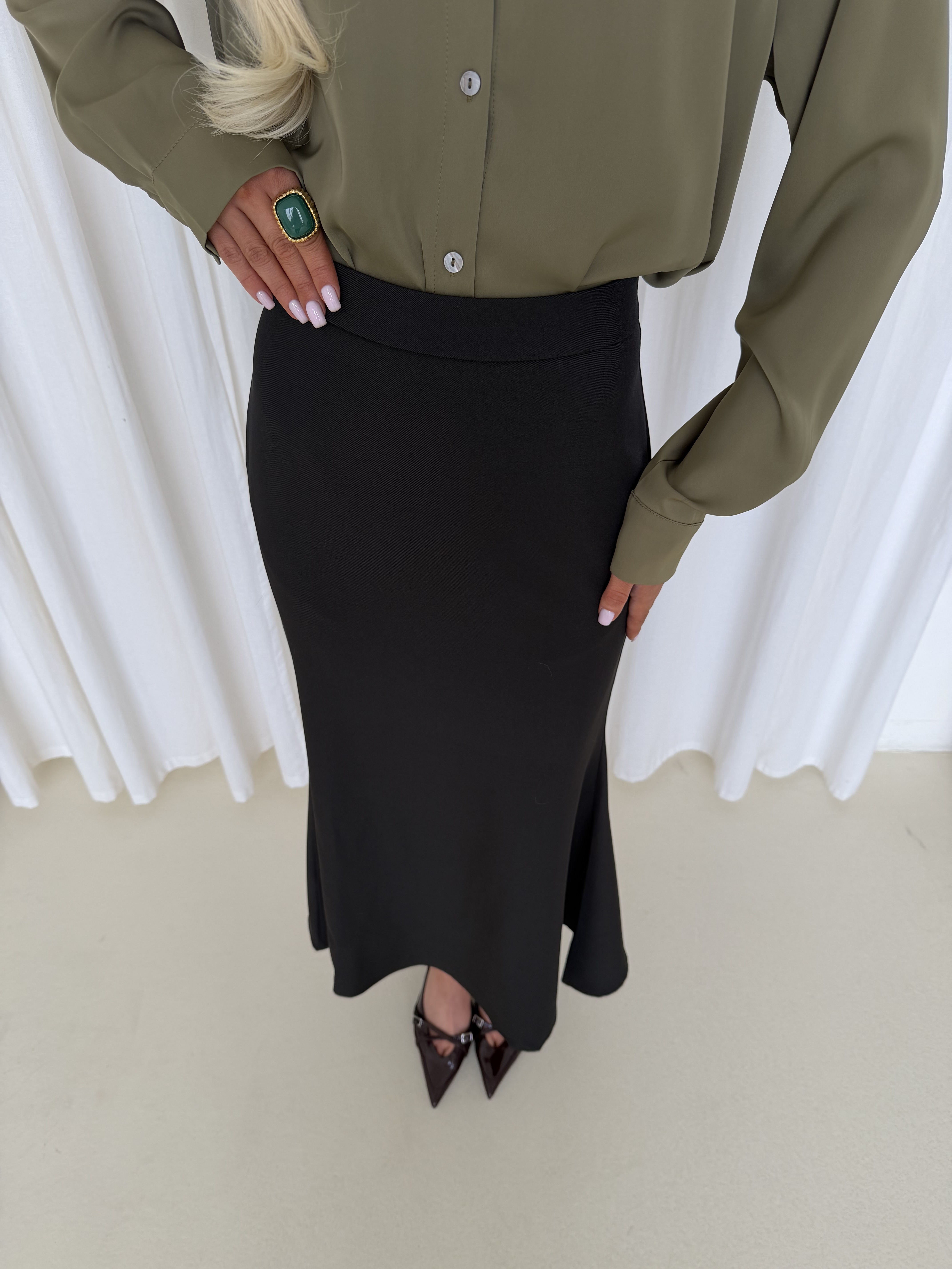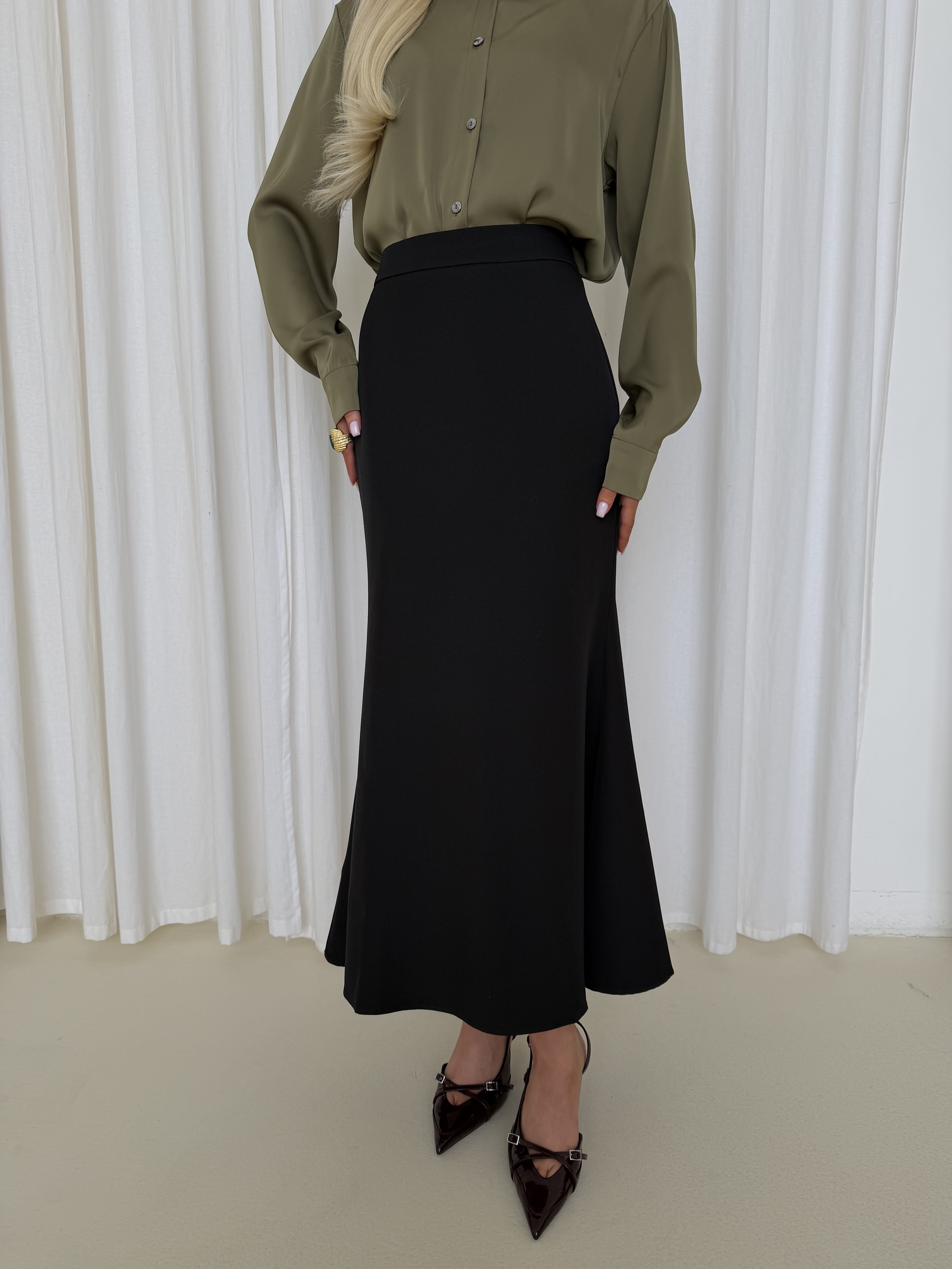 Блуза из атласа в оттенке олива — элегантная модель с мягким благородным блеском. Ткань красиво переливается при движении и придаёт образу глубину, оставаясь при этом лаконичной и универсальной.