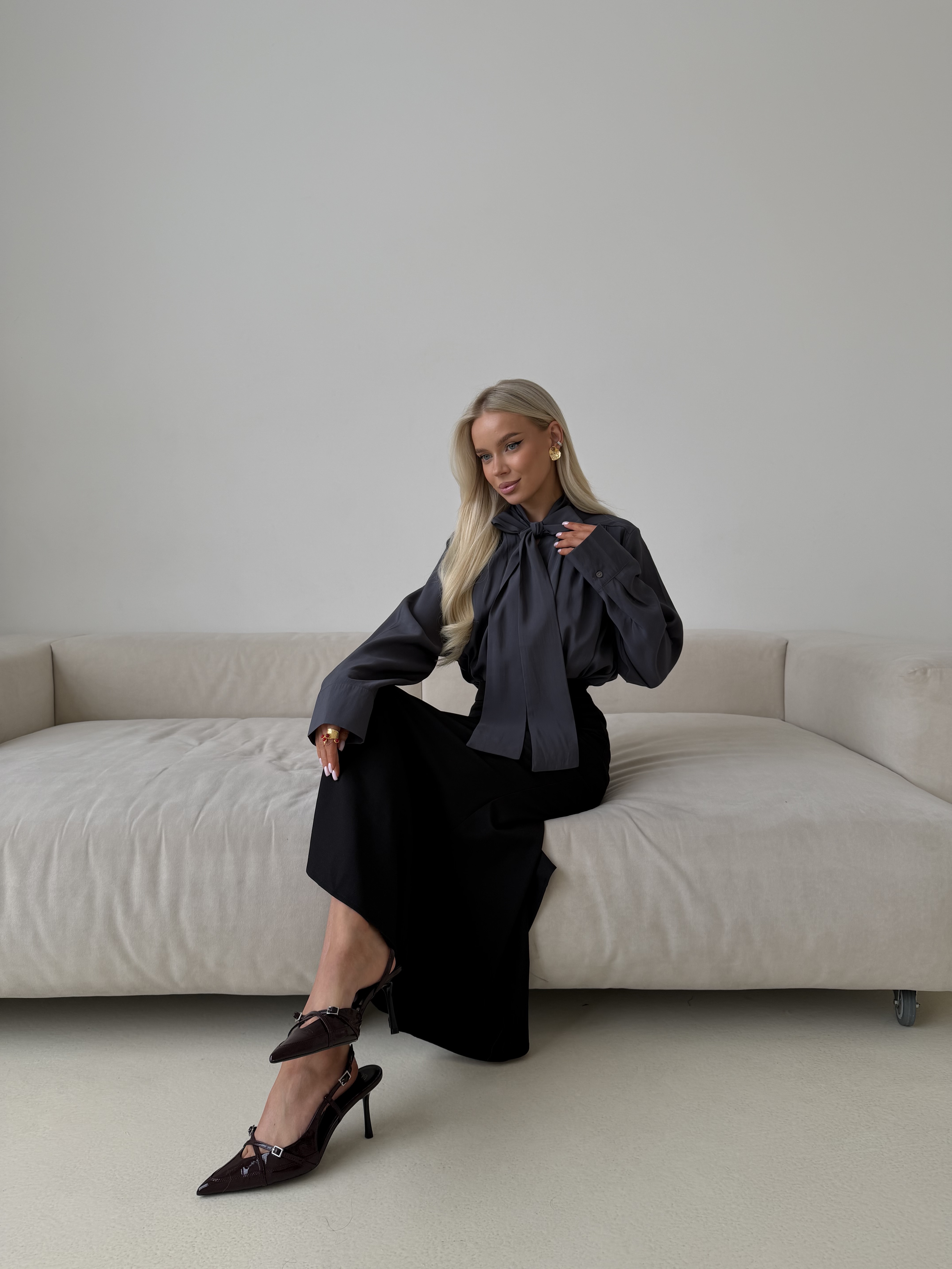 Аккуратный воротничок добавляет структуру и делает силуэт более собранным. Блуза легко сочетается как с классическими брюками и юбками, так и с денимом — идеальный вариант для образов от офиса до вечерних встреч.