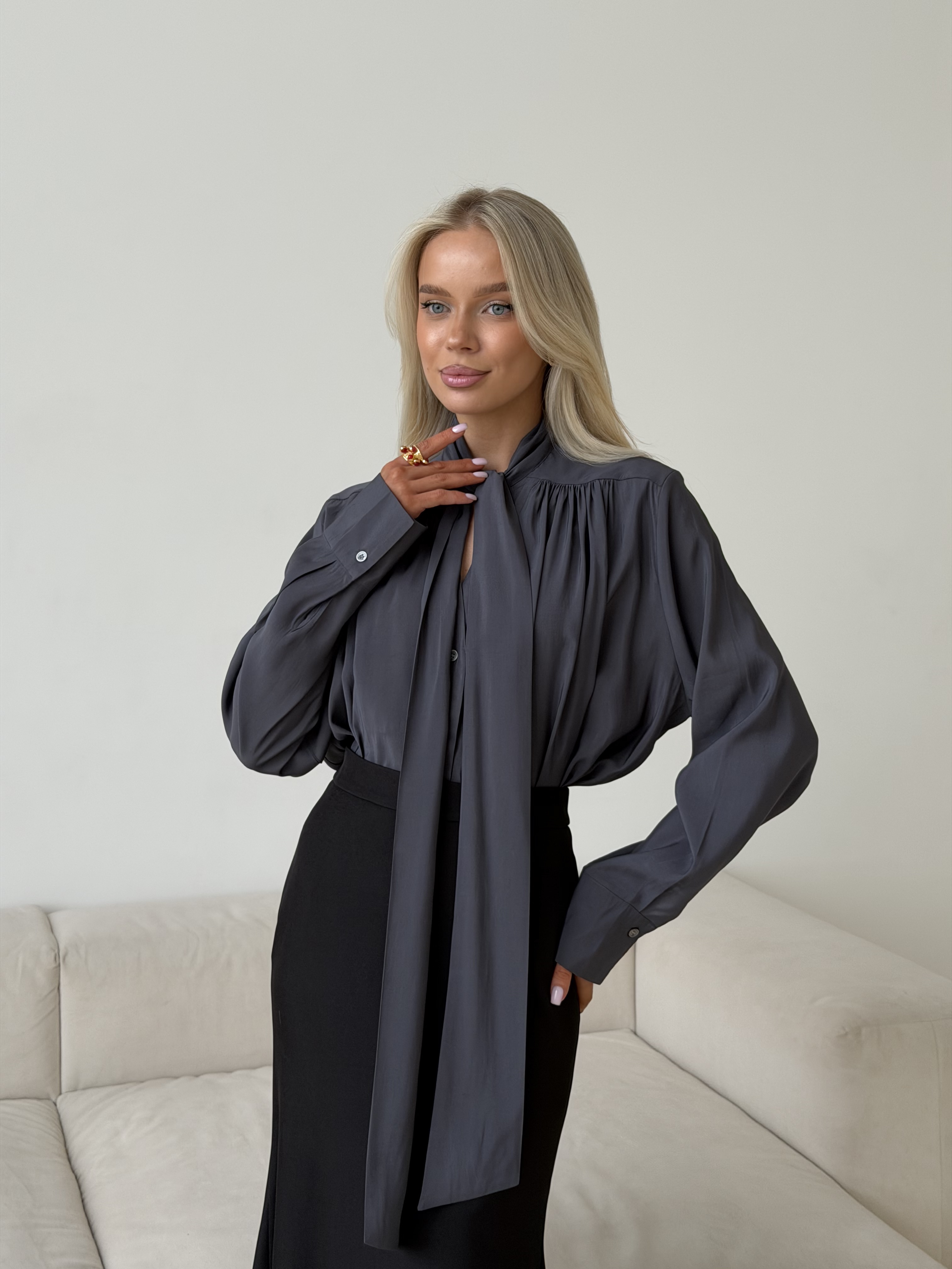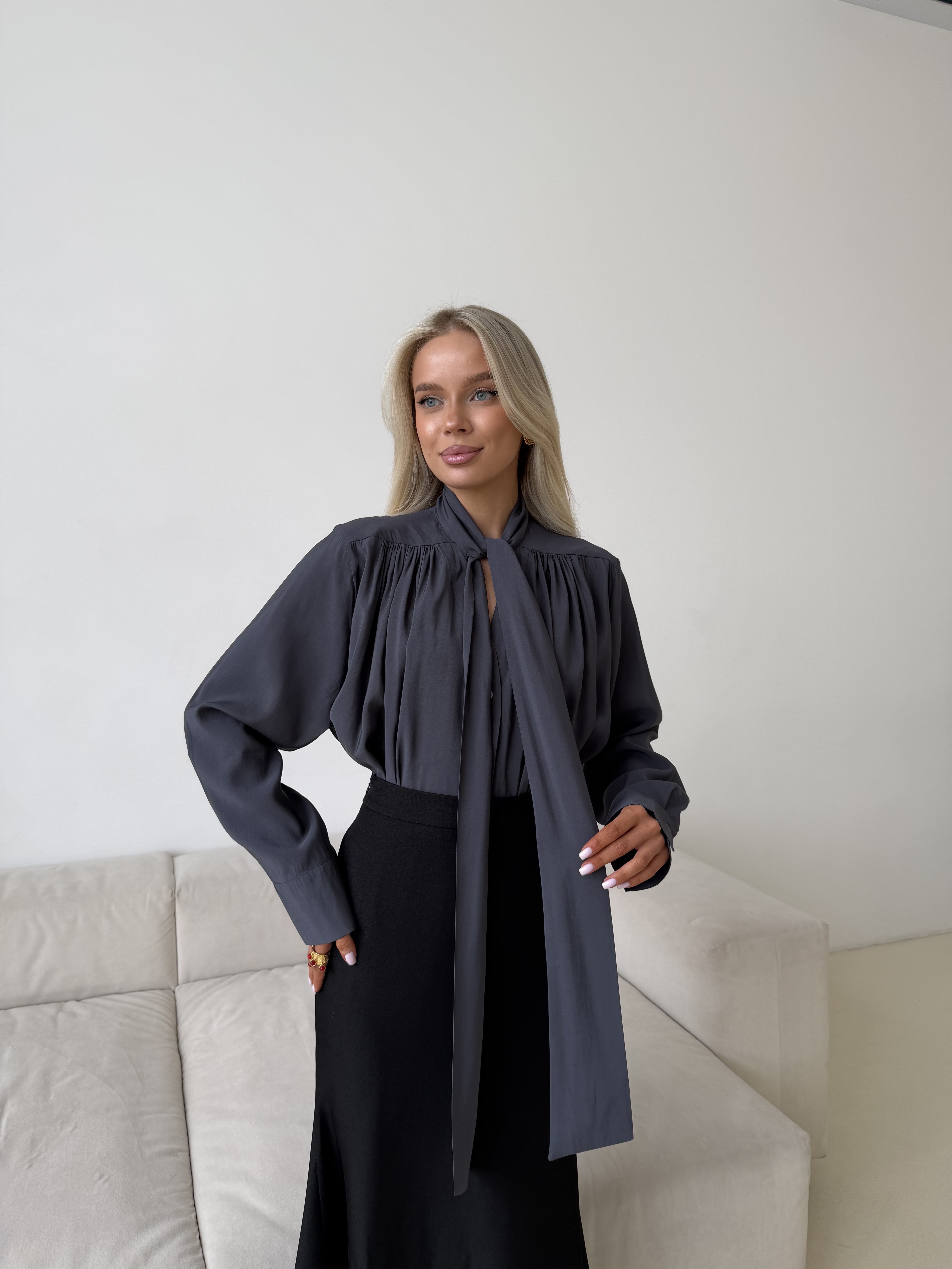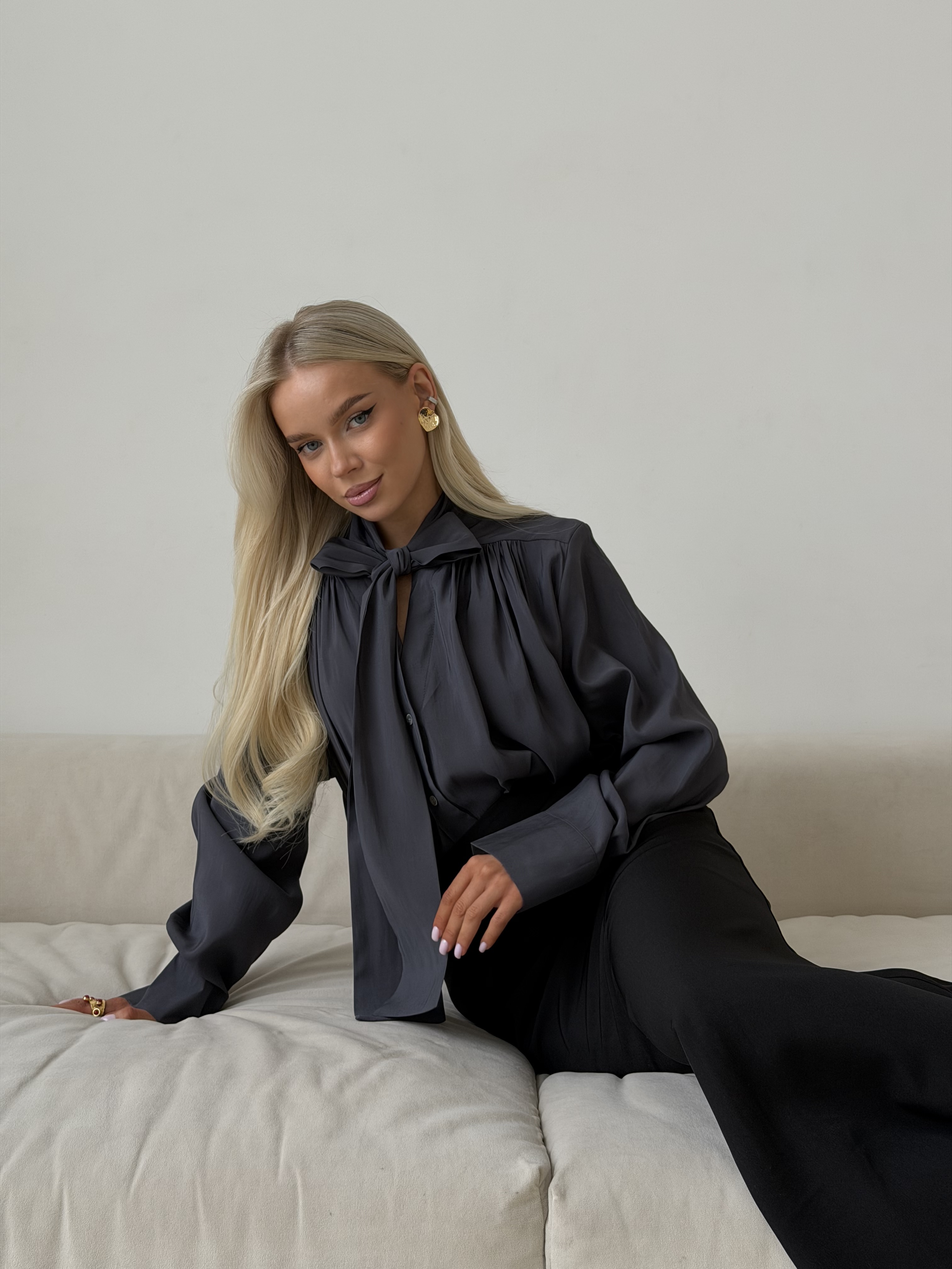 Акцентный бант у воротника делает силуэт более утончённым и позволяет варьировать настроение образа: завязать аккуратно и строго или оставить более свободно для лёгкой романтики. Идеальный вариант для работы, встреч и особых поводов.