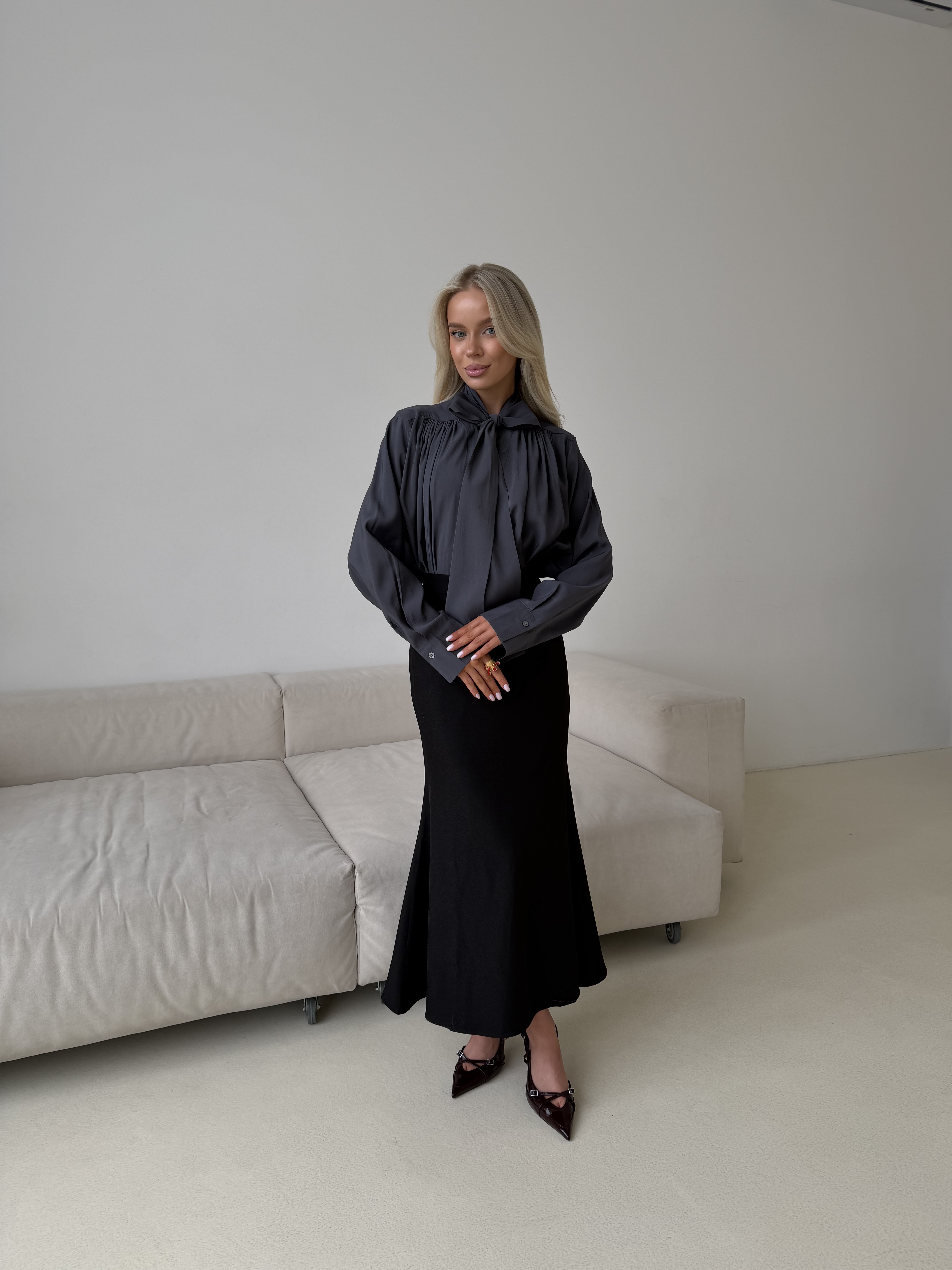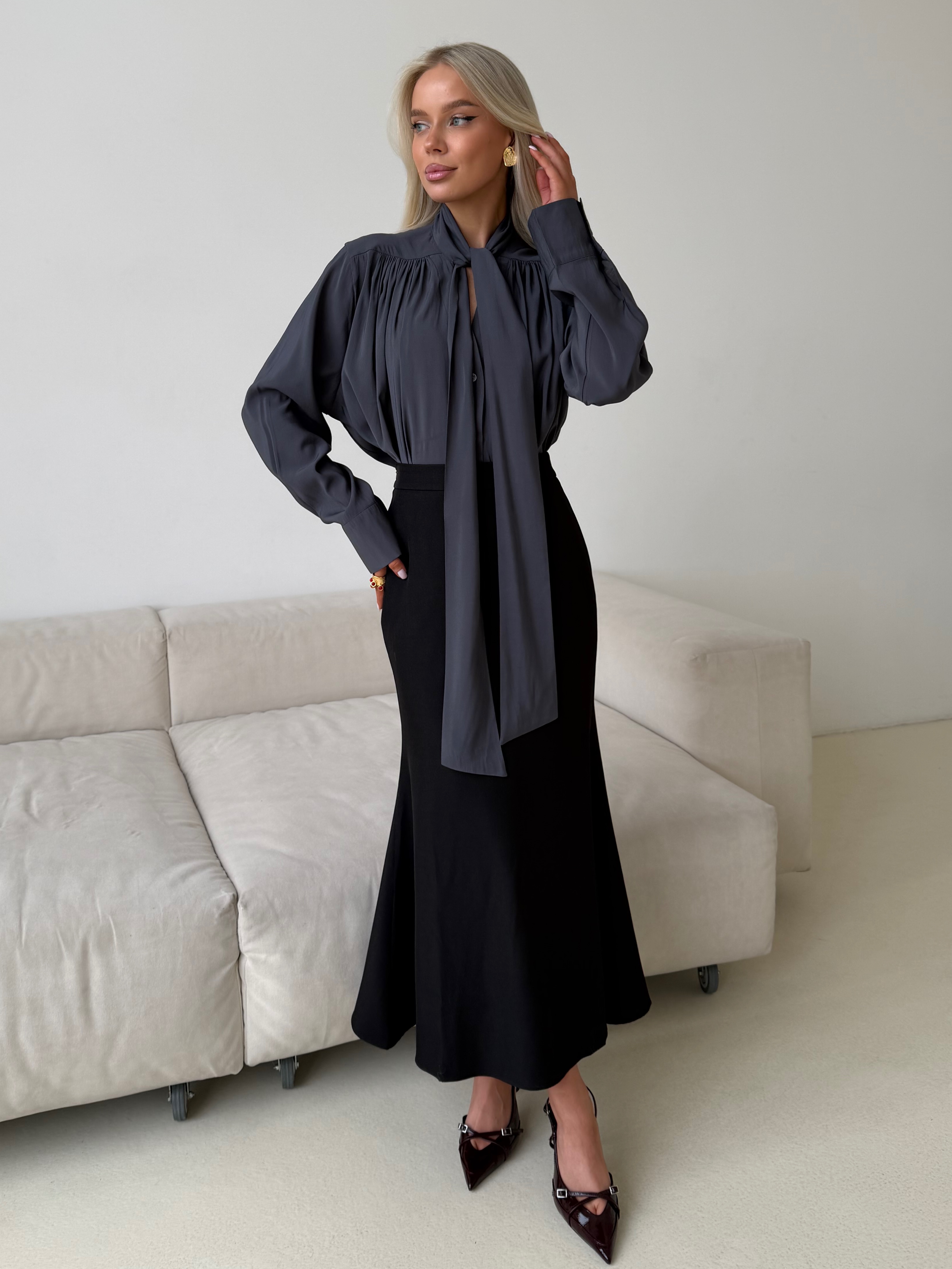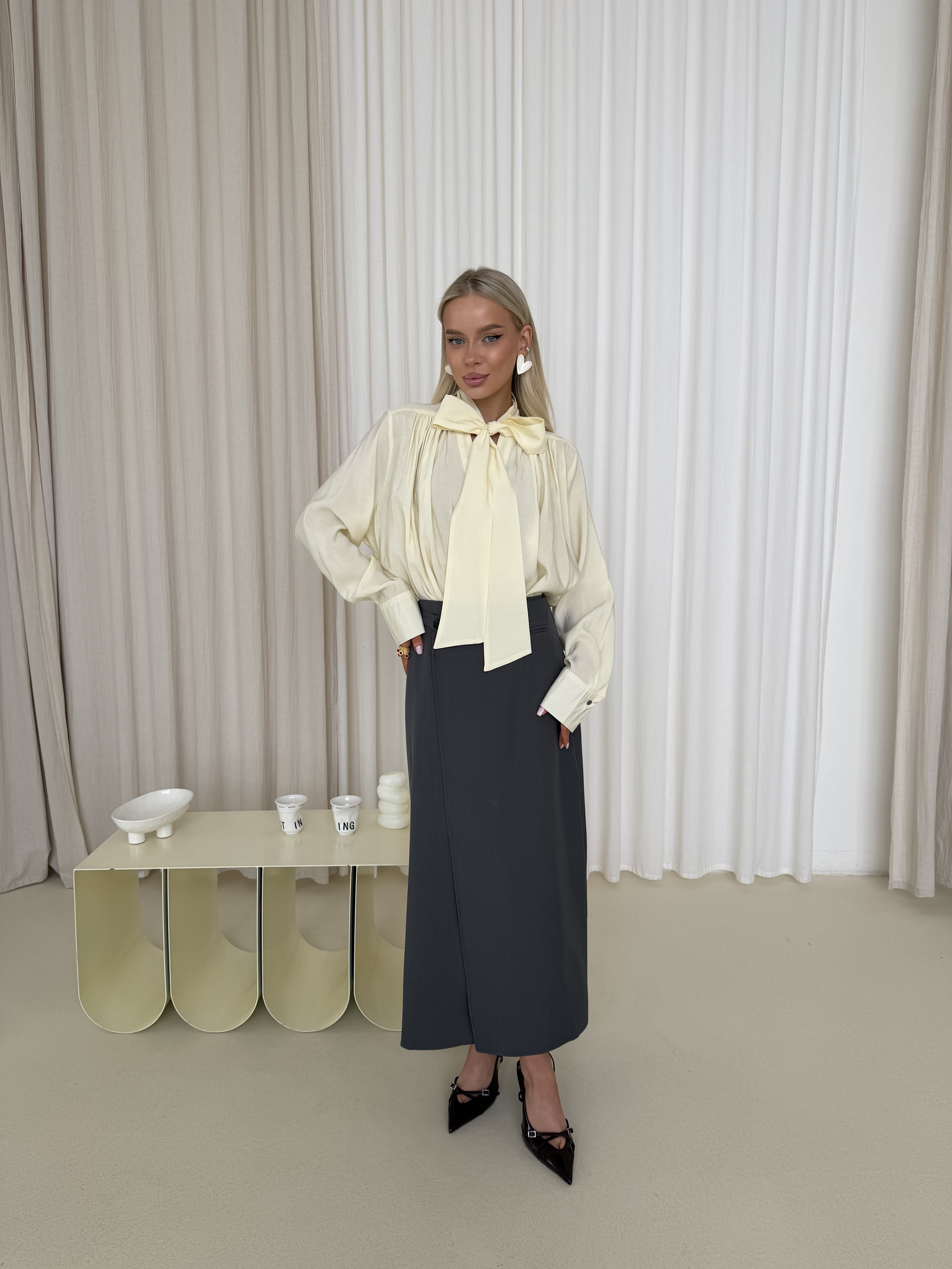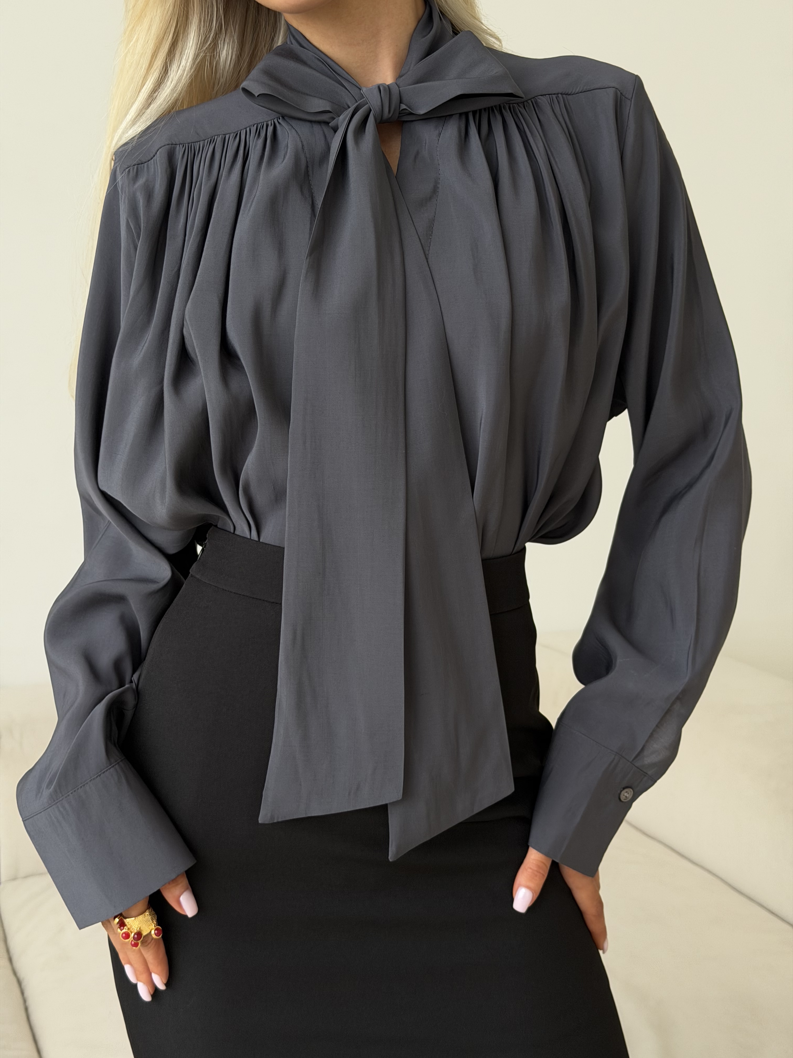 Акцентный бант у воротника делает силуэт более утончённым и позволяет варьировать настроение образа: завязать аккуратно и строго или оставить более свободно для лёгкой романтики. Идеальный вариант для работы, встреч и особых поводов.