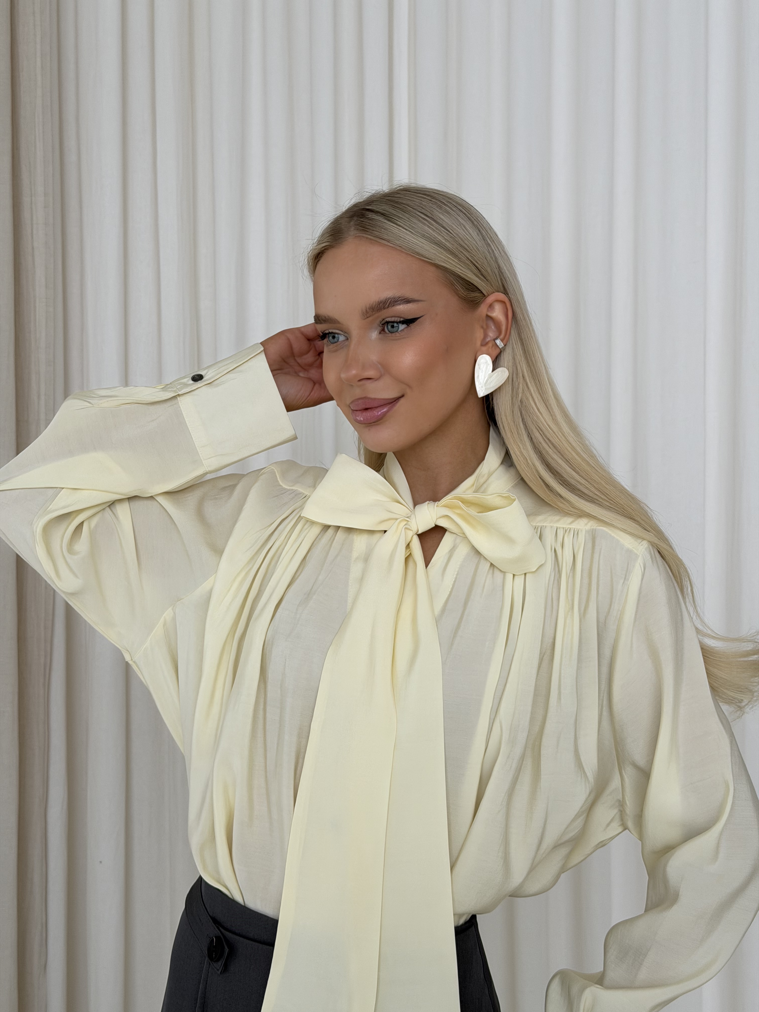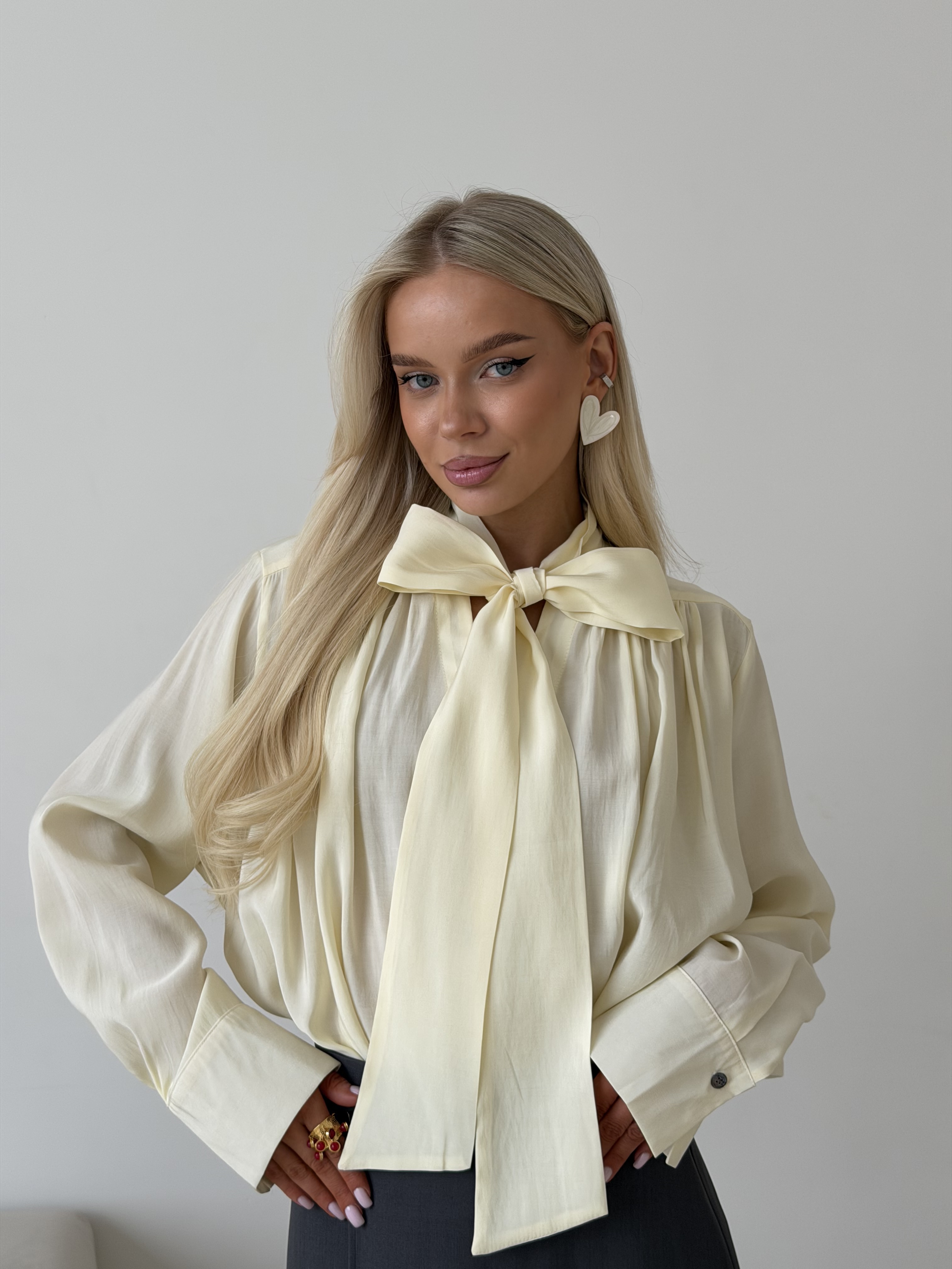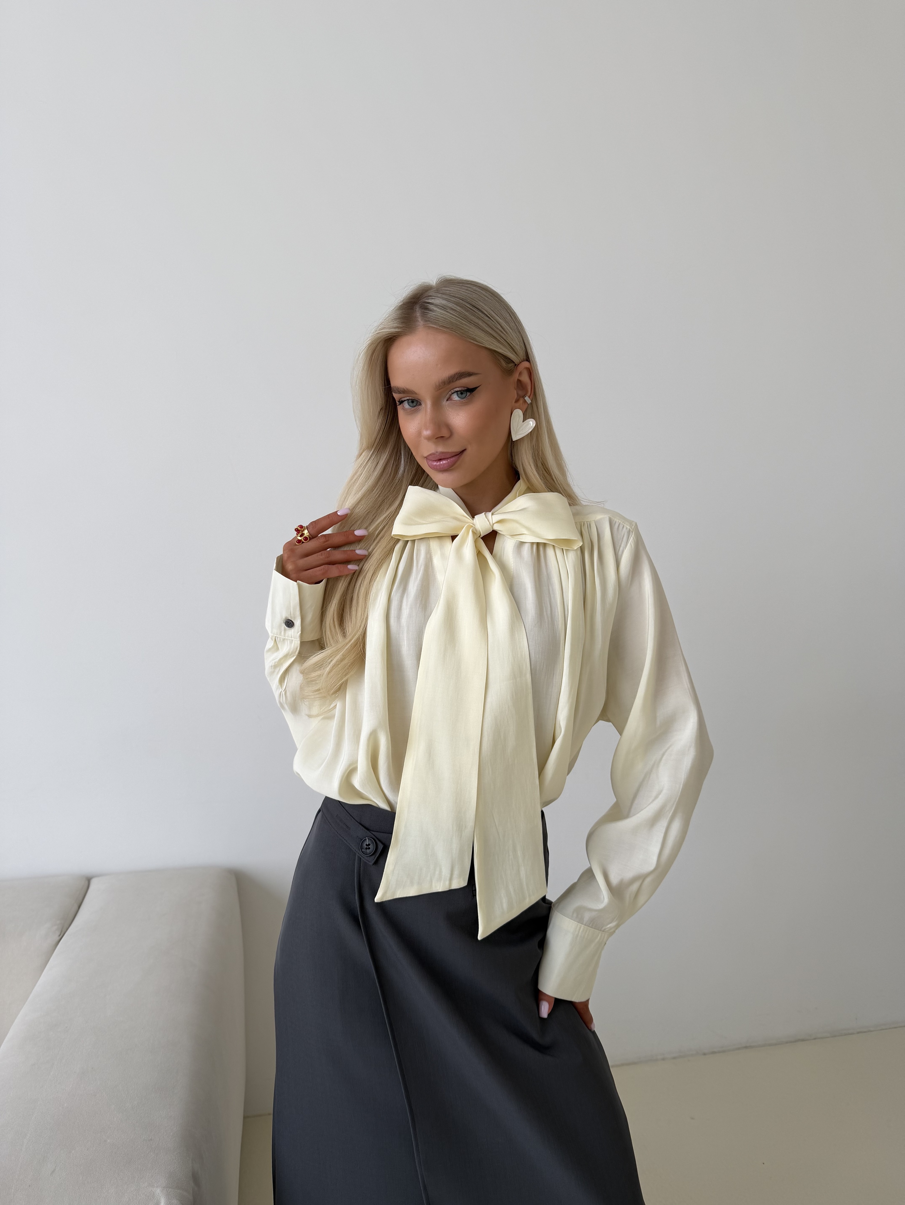 Блуза с бантом в молочном цвете — изящная модель, которая добавляет образу мягкости и женственности. Нежный оттенок освежает и легко сочетается как с классическими брюками, так и с джинсами или юбками.