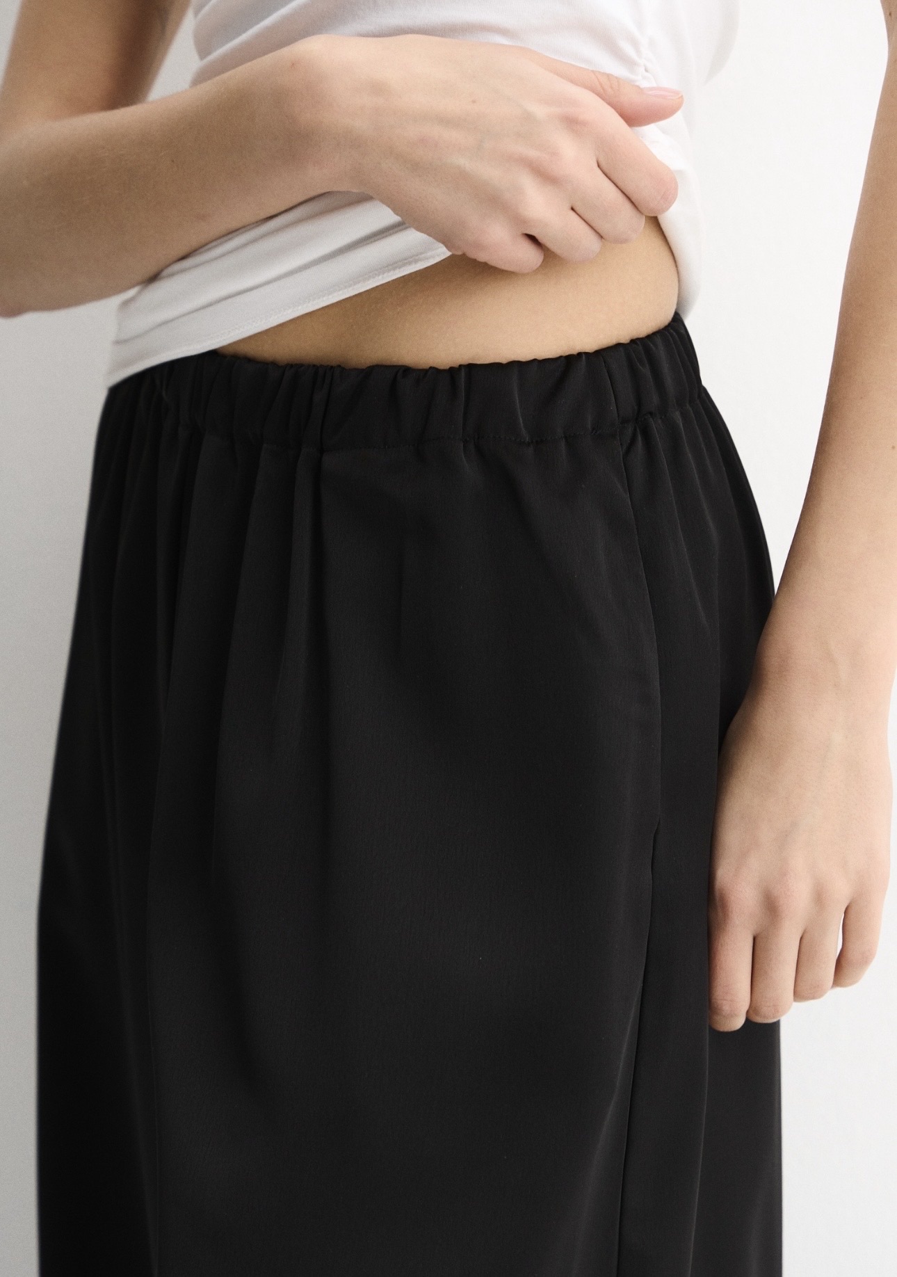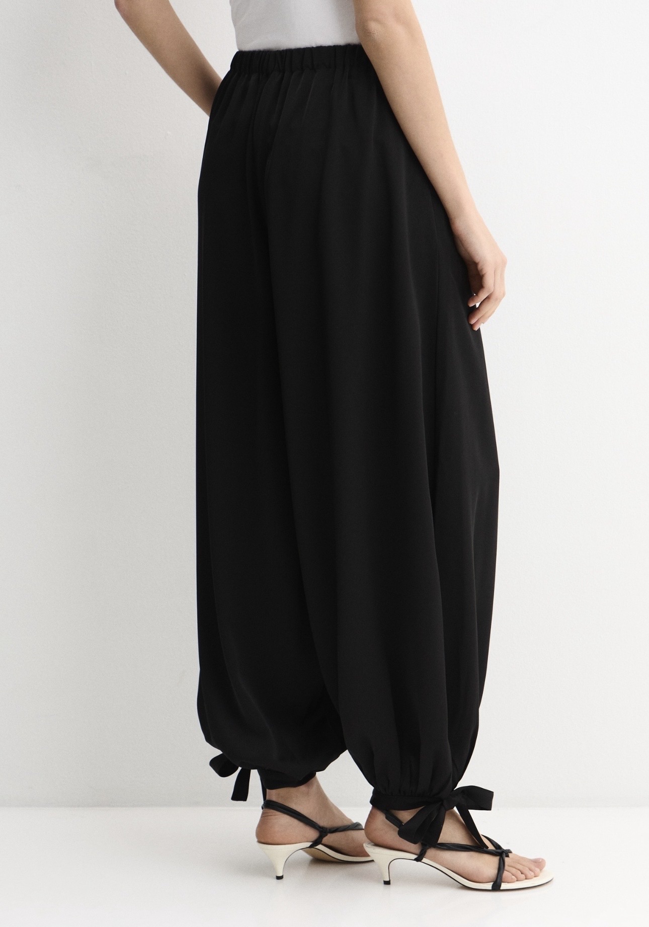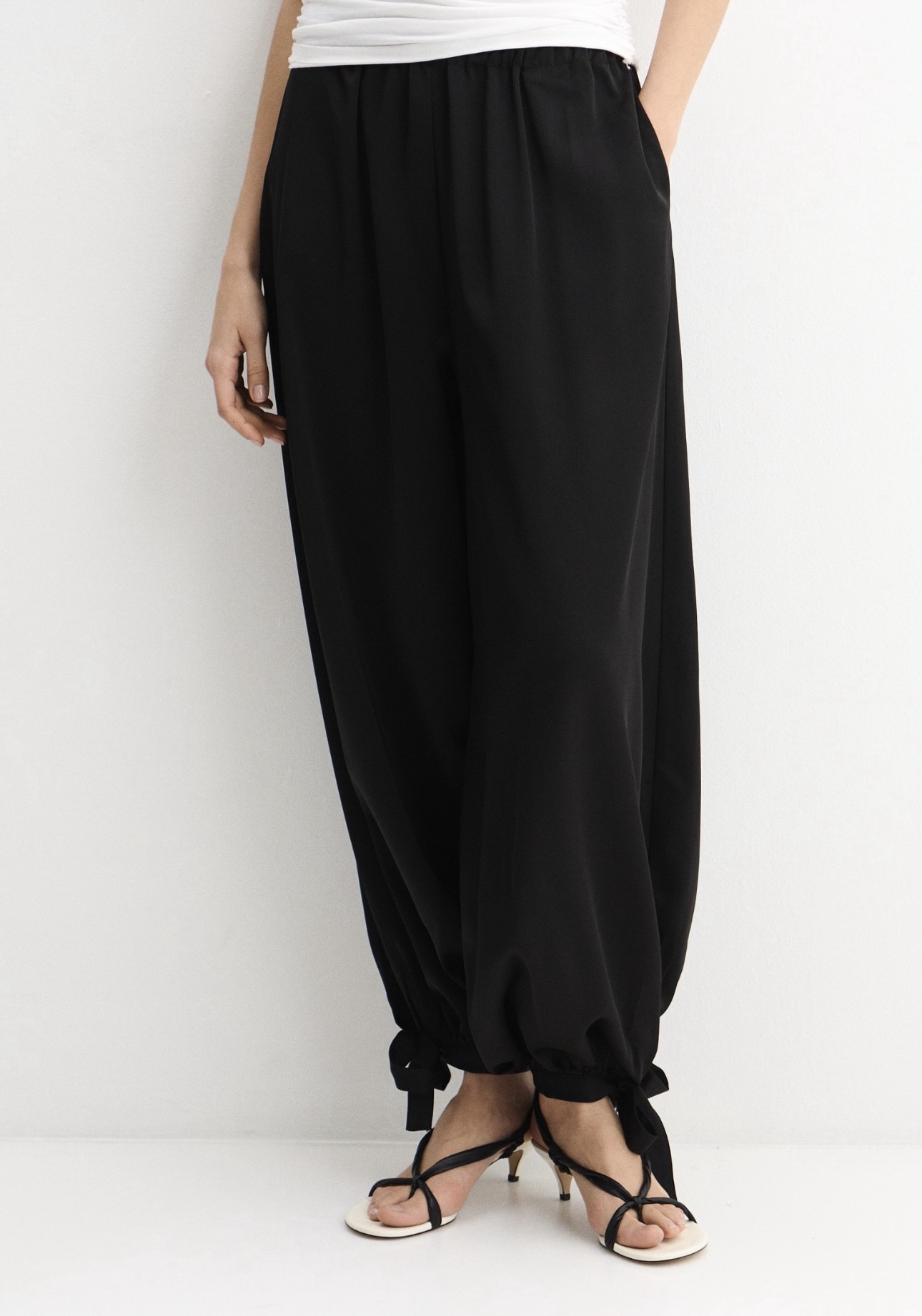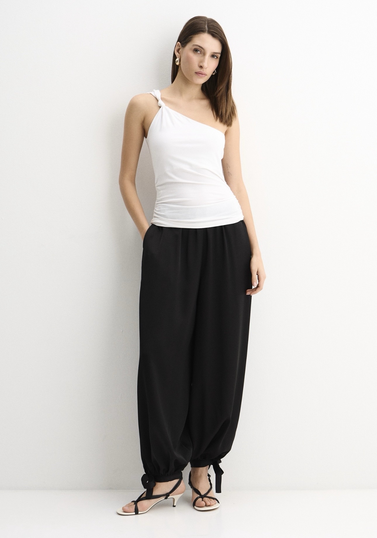 Брюки свободного силуэта с мягкой посадкой на талии и эластичным поясом, который обеспечивает комфортную фиксацию без лишнего давления. Низ оформлен кулисками с завязками, за счёт чего можно регулировать объём и формировать более собранный силуэт. Лёгкая струящаяся ткань красиво драпируется в движении, создавая расслабленный, но аккуратный образ.