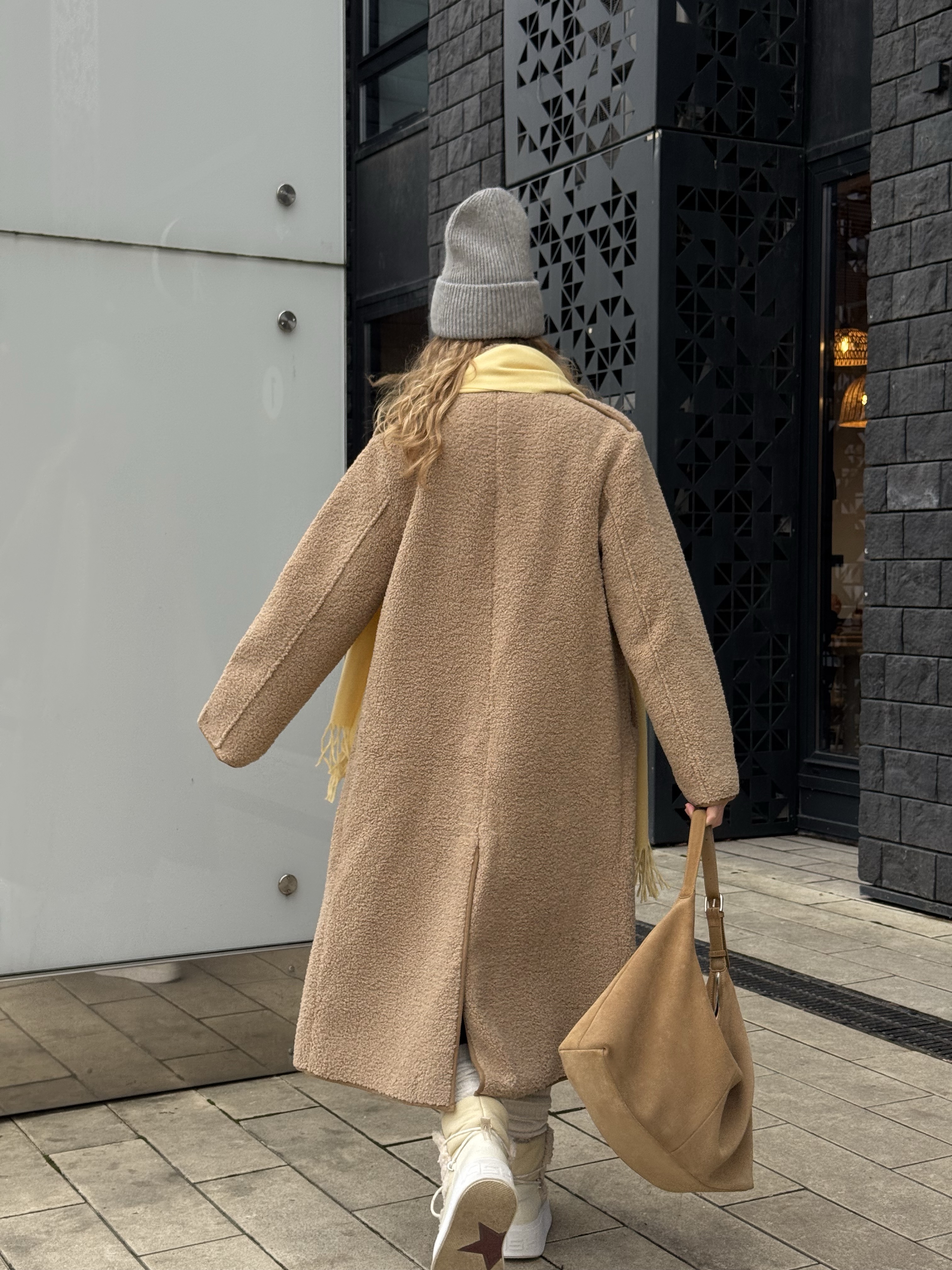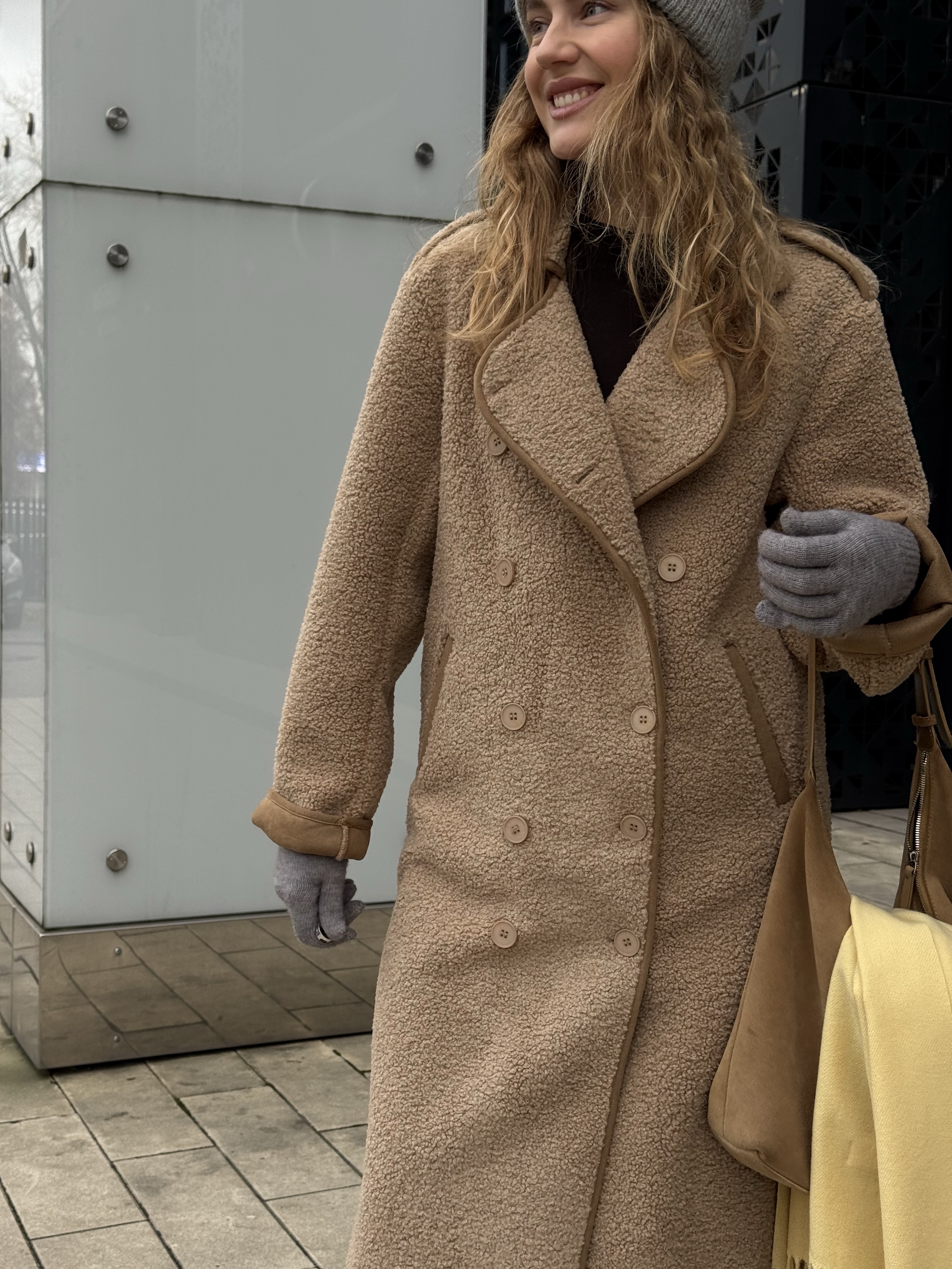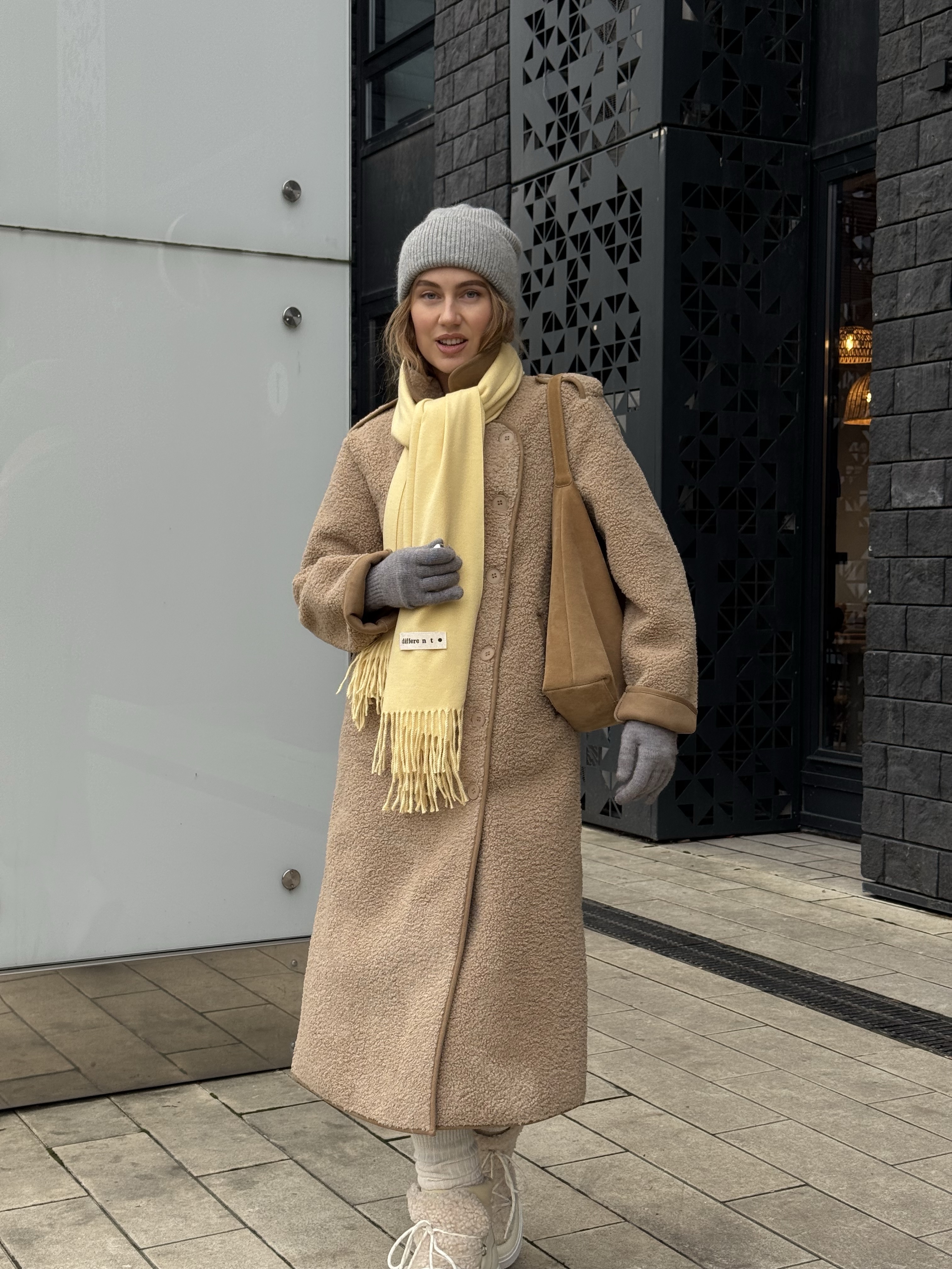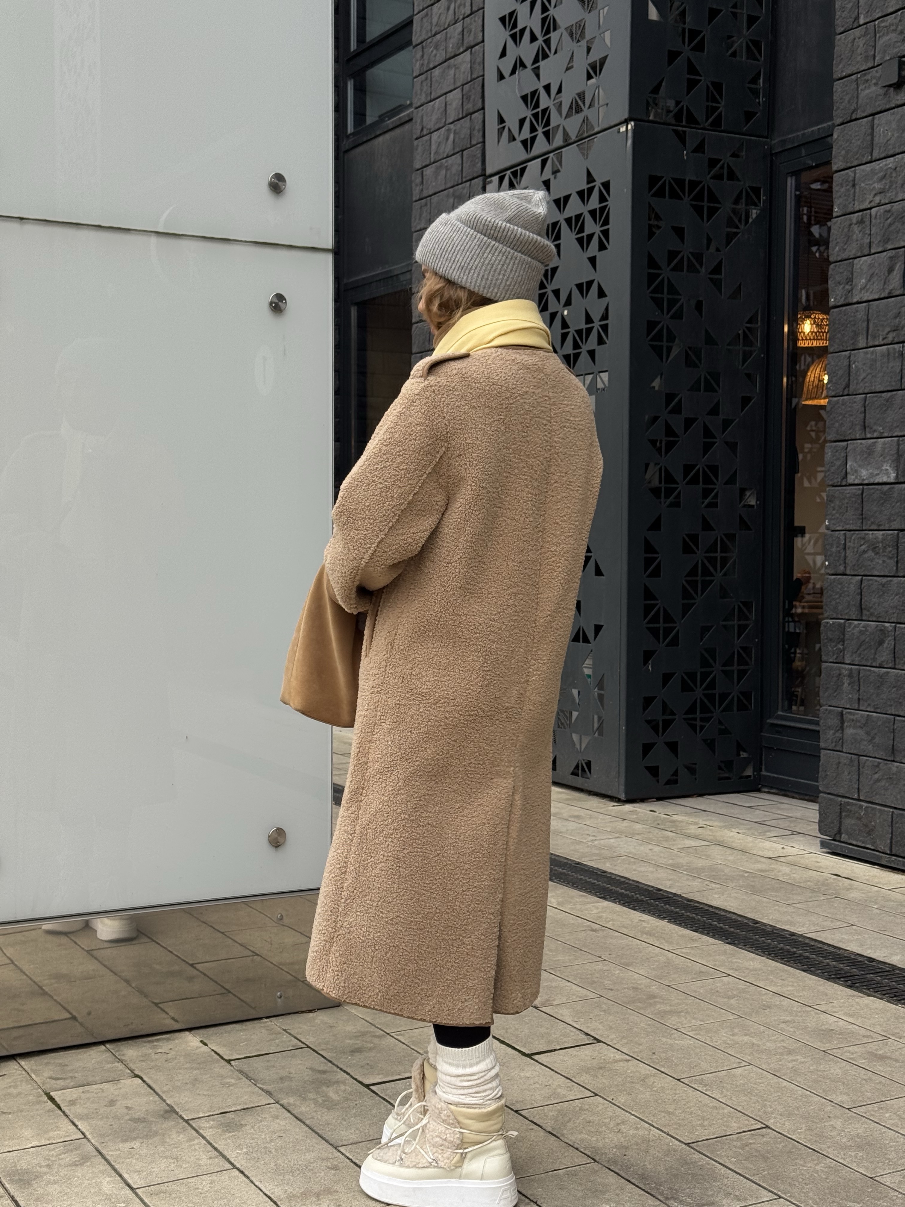 Длинная дублёнка, которая выглядит одновременно минималистично и очень благородно. Её мягкая, аккуратная фактура создаёт впечатление дорогой, спокойной текстуры, а удлинённый прямой крой визуально вытягивает силуэт, придавая образу стройность и собранность.