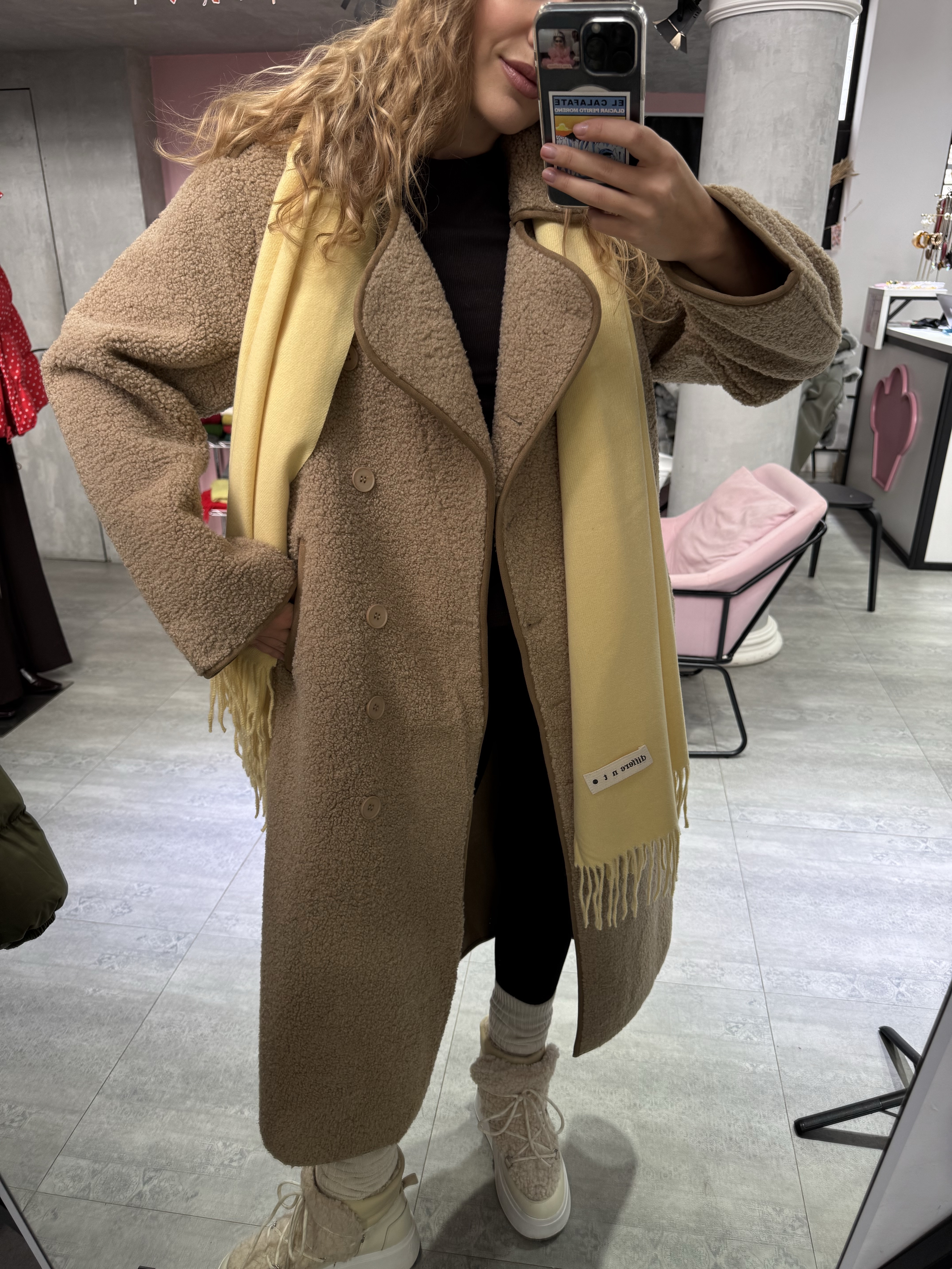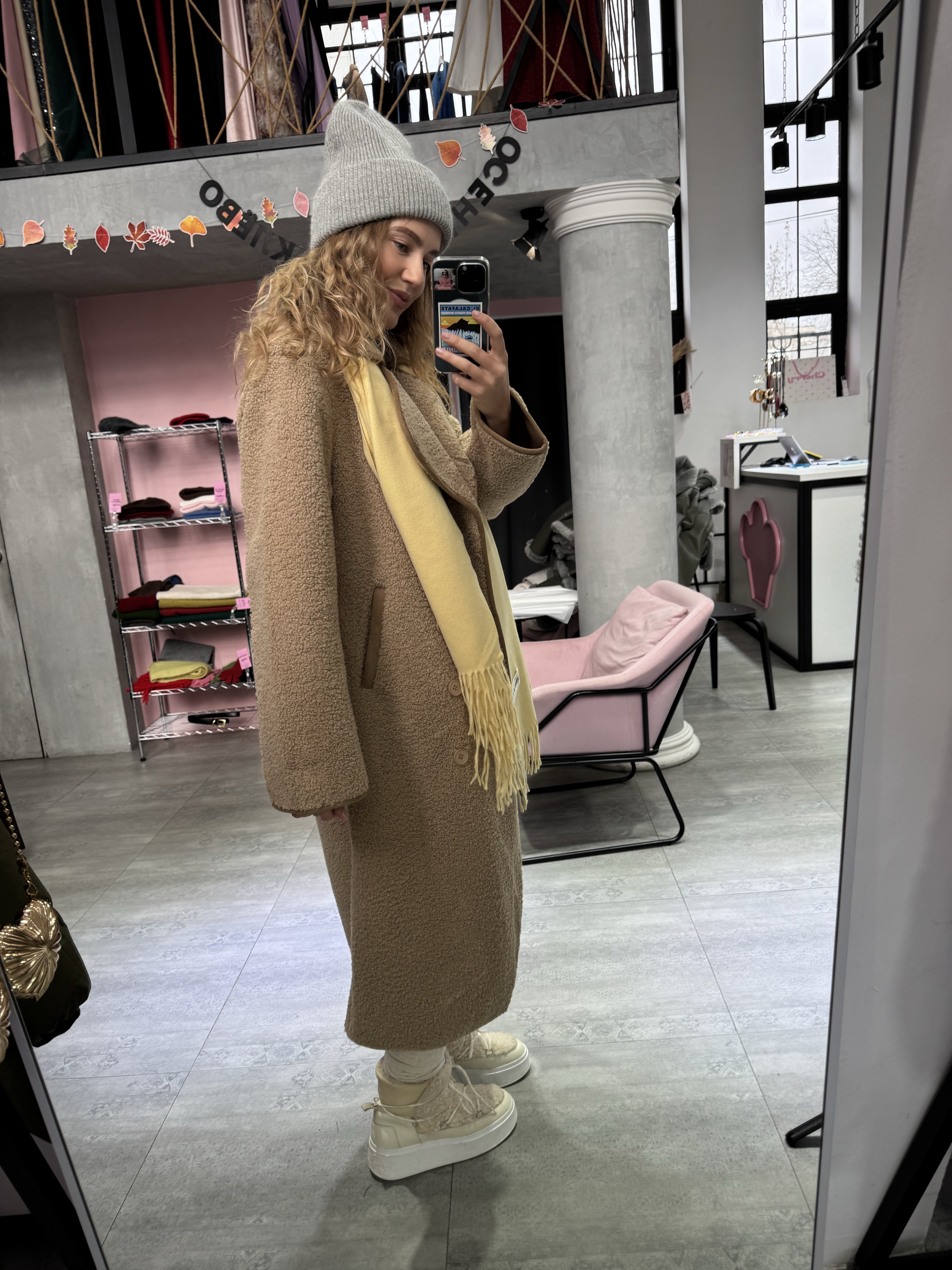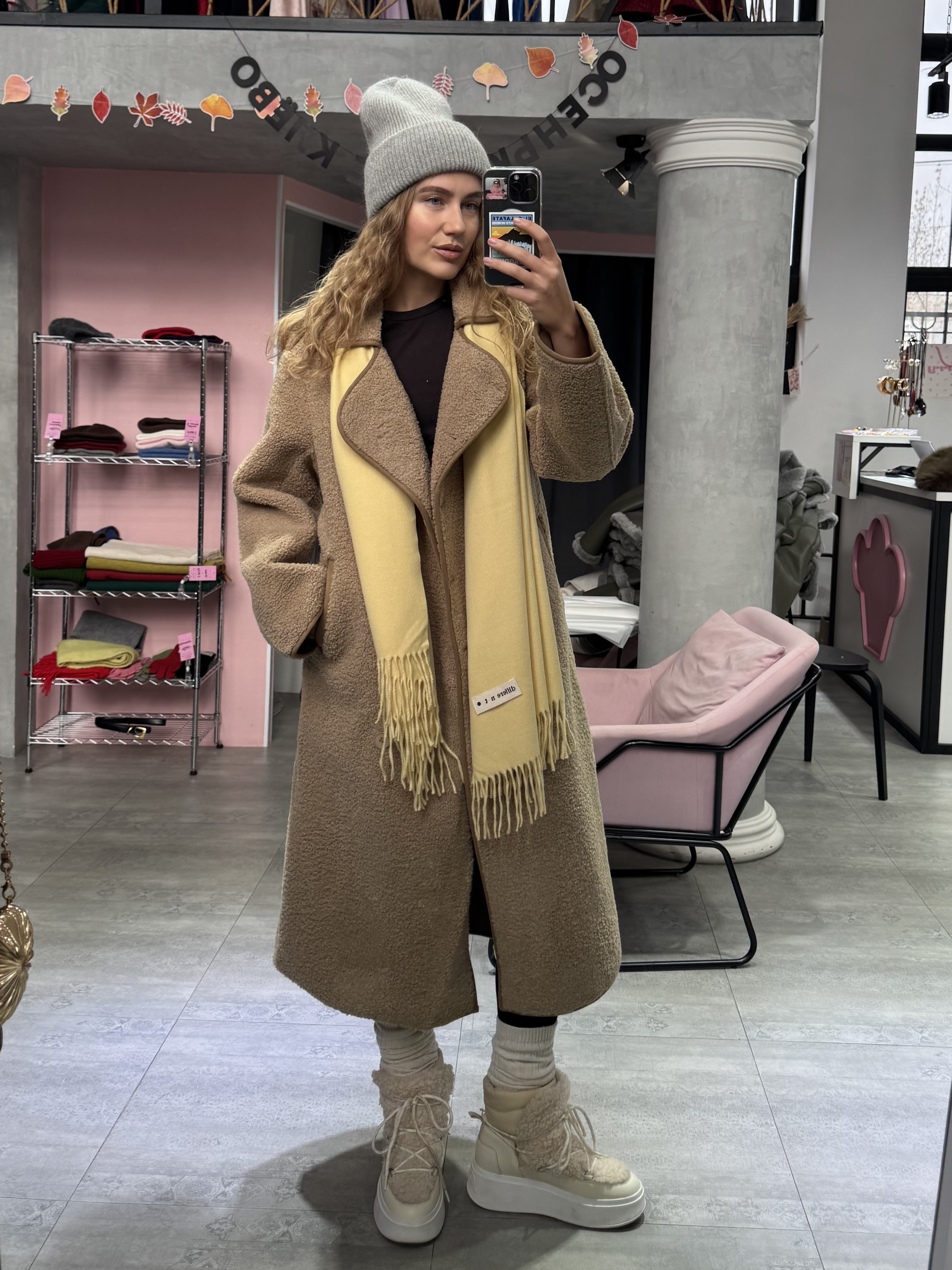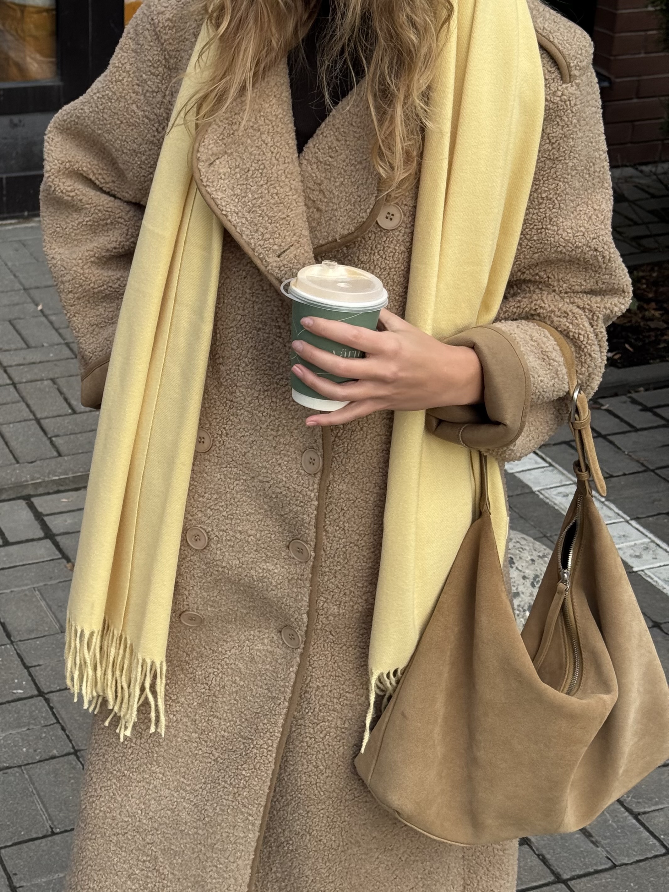 Длинная дублёнка, которая выглядит одновременно минималистично и очень благородно. Её мягкая, аккуратная фактура создаёт впечатление дорогой, спокойной текстуры, а удлинённый прямой крой визуально вытягивает силуэт, придавая образу стройность и собранность.