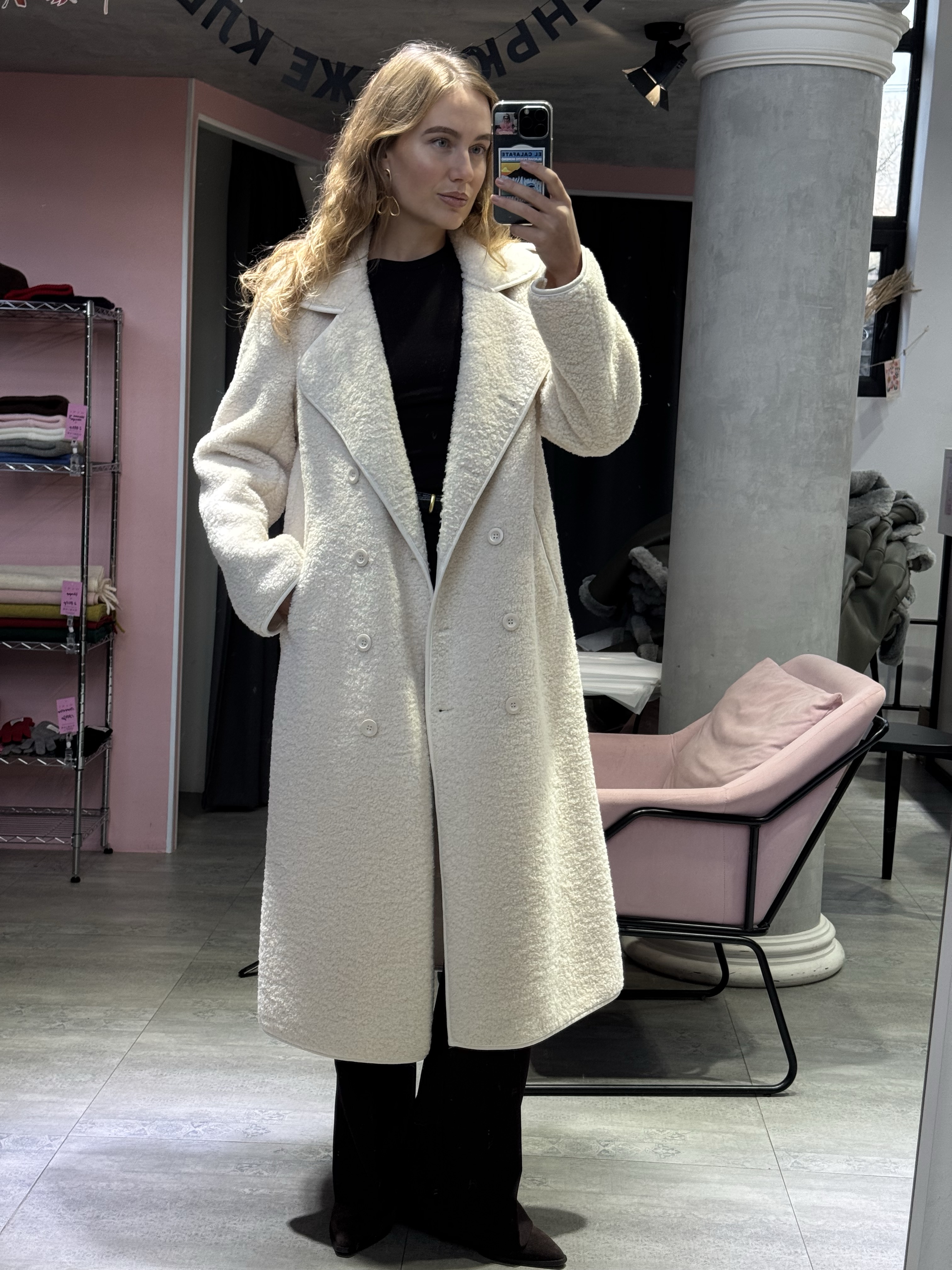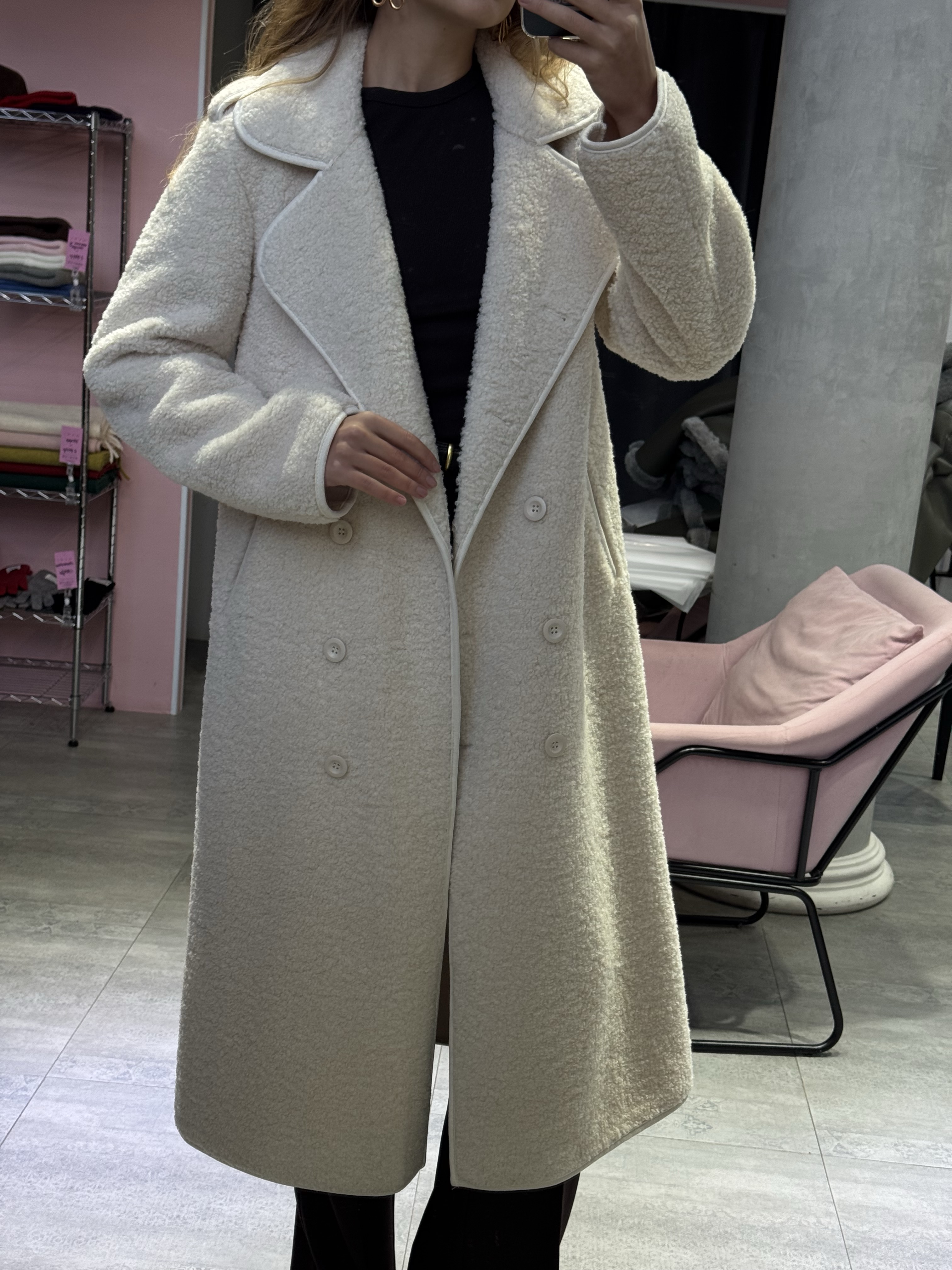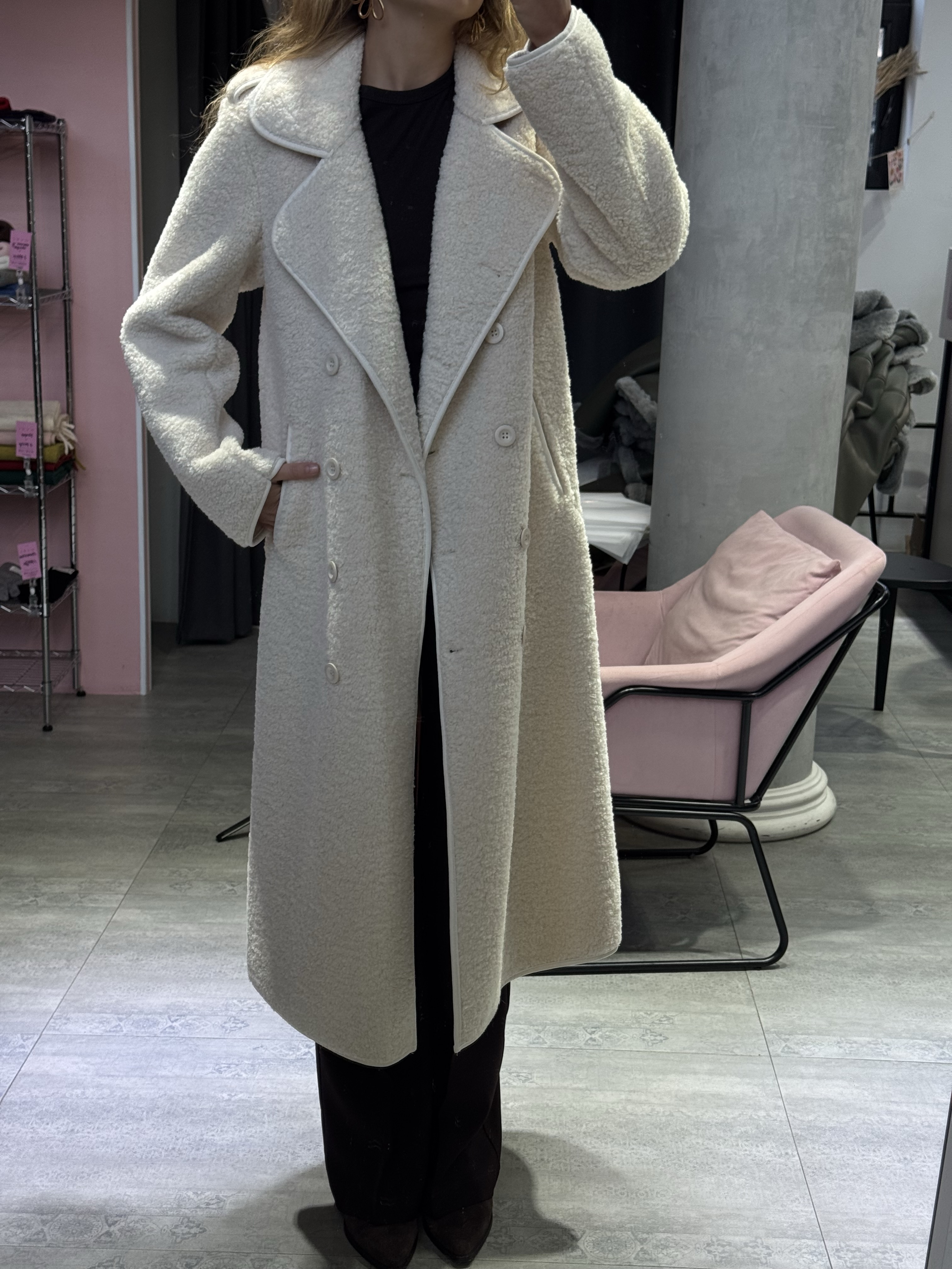 Широкие лацканы делают линию плеч аккуратной, а скрытая застёжка сохраняет чистоту дизайна — модель выглядит цельной, без лишних деталей.