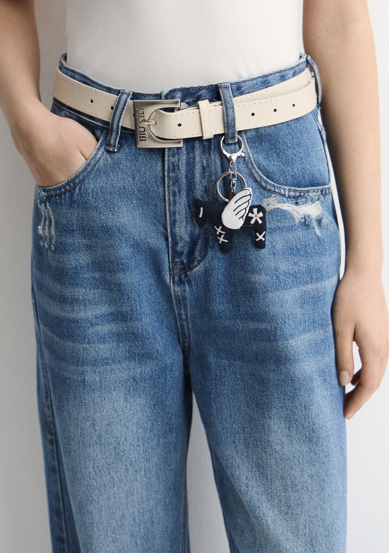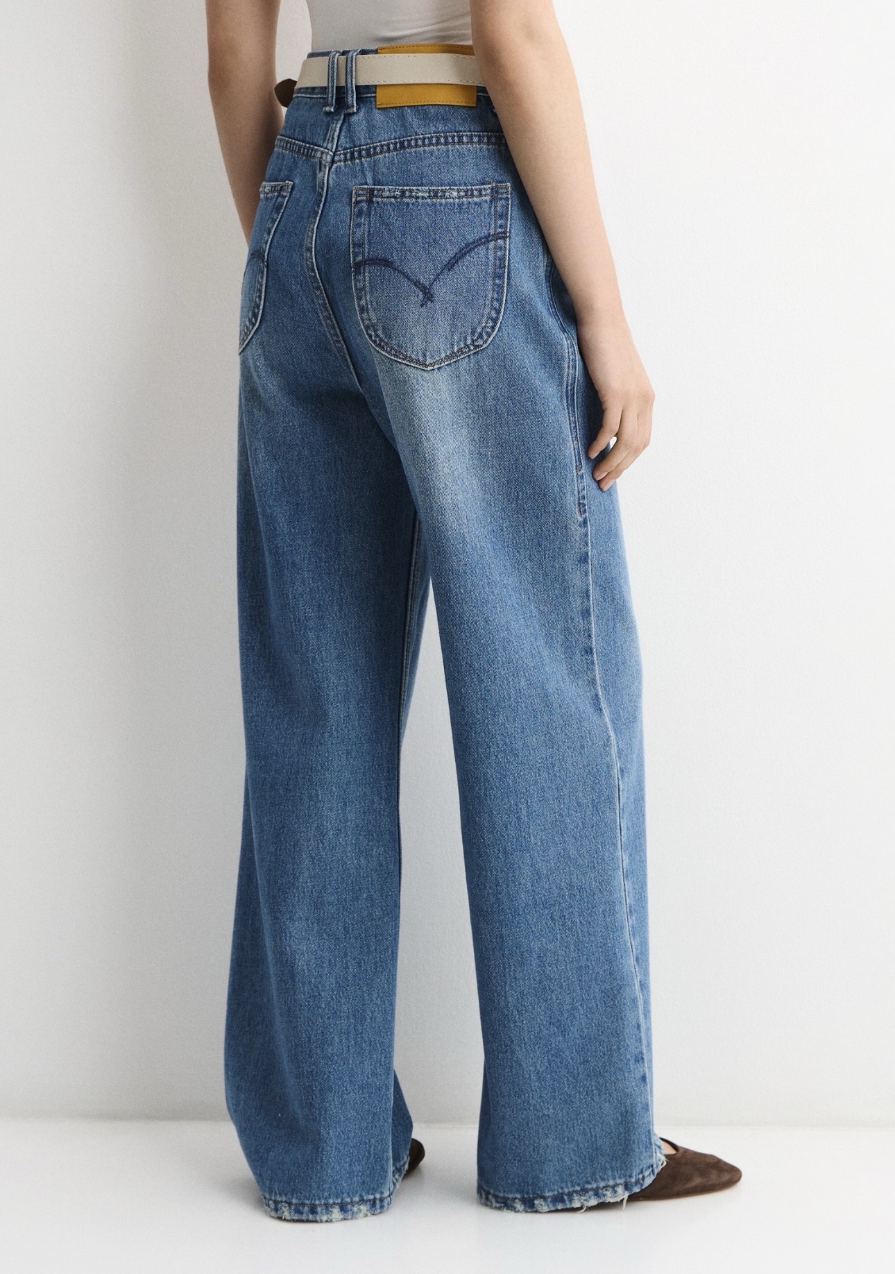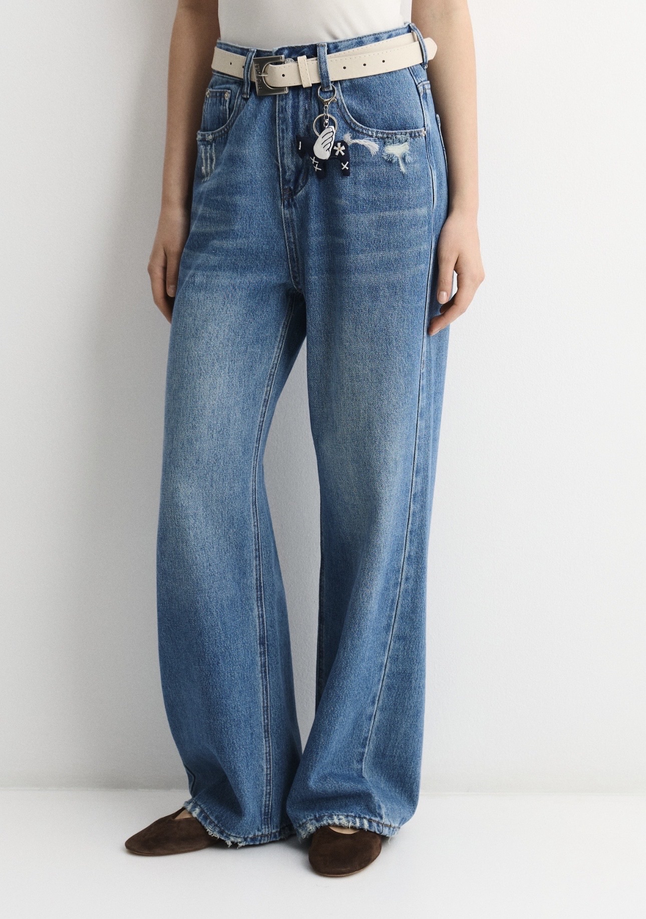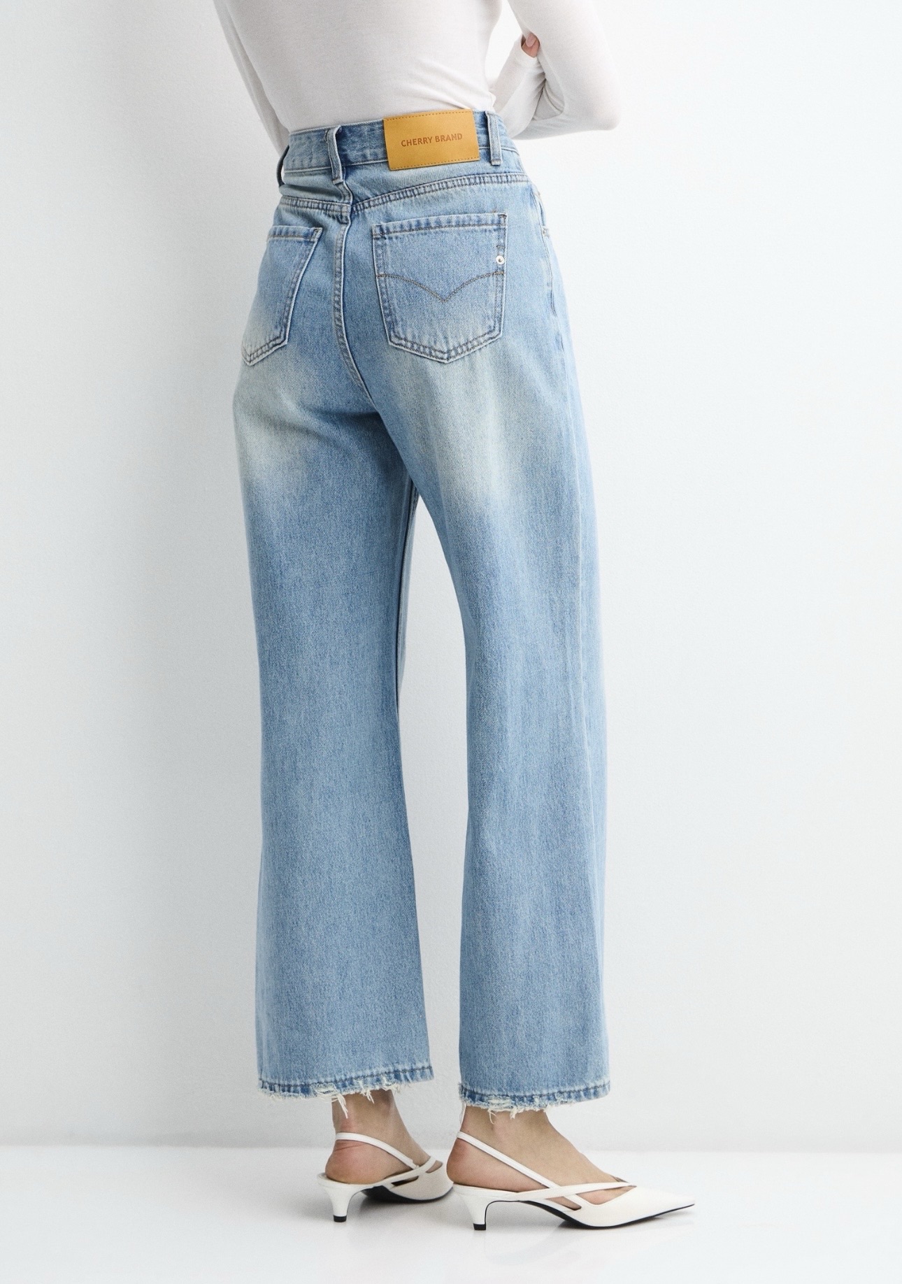 Классический дизайн дополнен карманами, шлёвками для ремня и застёжкой на молнию с пуговицей. Низ аккуратно обработан, при этом в некоторых местах ткань слегка протёрта, создавая деликатный эффект бахромы и добавляя модели лёгкий винтажный акцент.