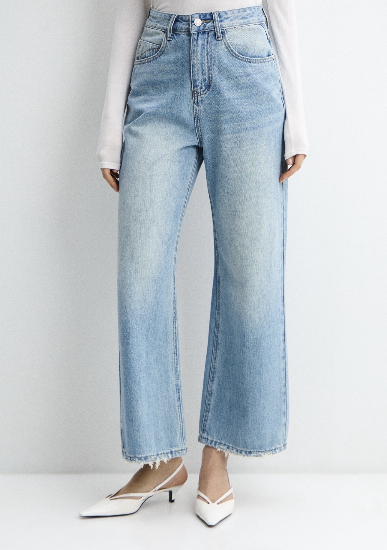 Джинсы из плотного денима светло-голубого оттенка с мягким эффектом выбеливания. Модель с высокой посадкой, которая подчёркивает линию талии и формирует аккуратный силуэт. Крой прямой и свободный, благодаря чему джинсы комфортно сидят и легко вписываются в повседневный гардероб.
