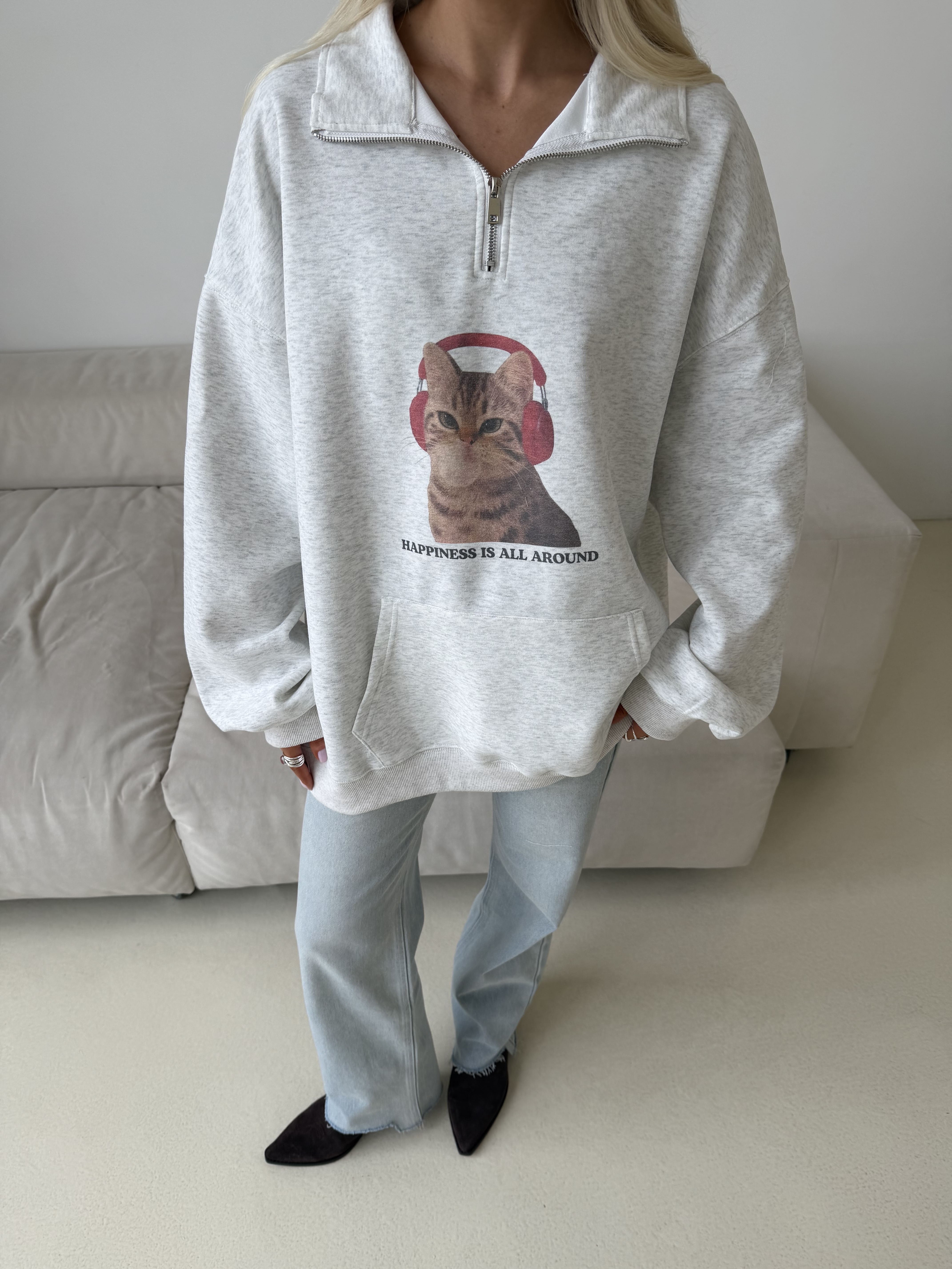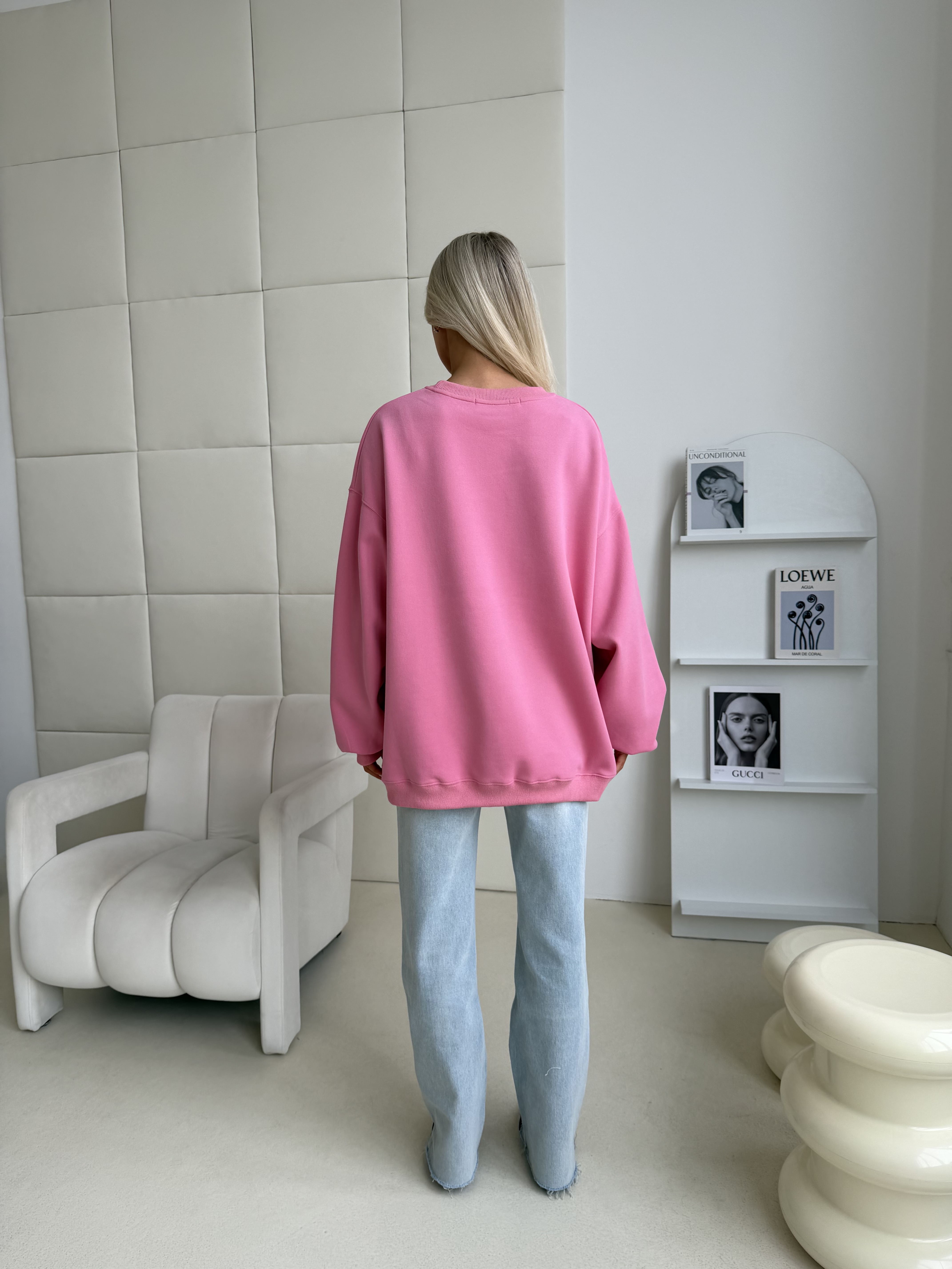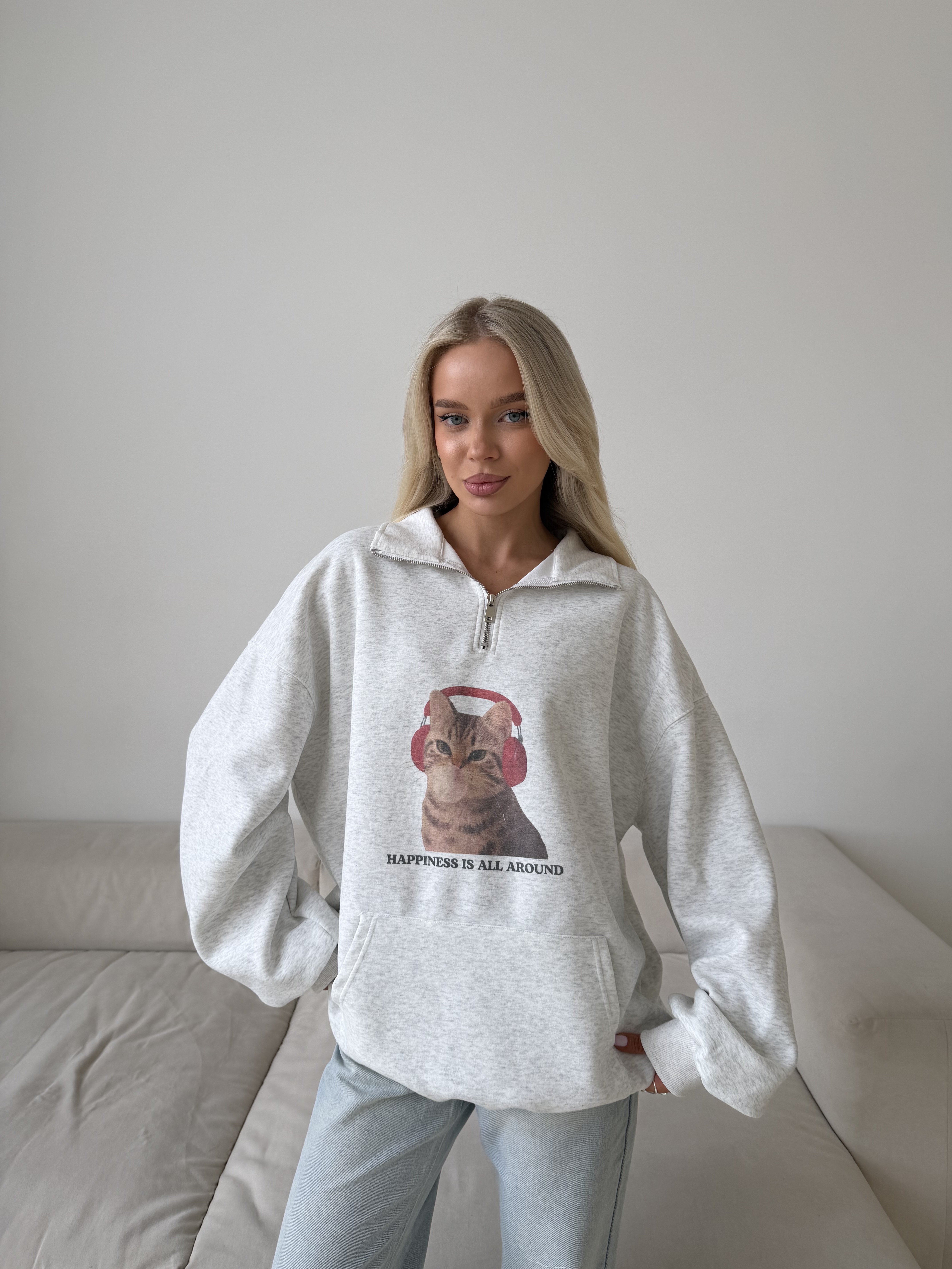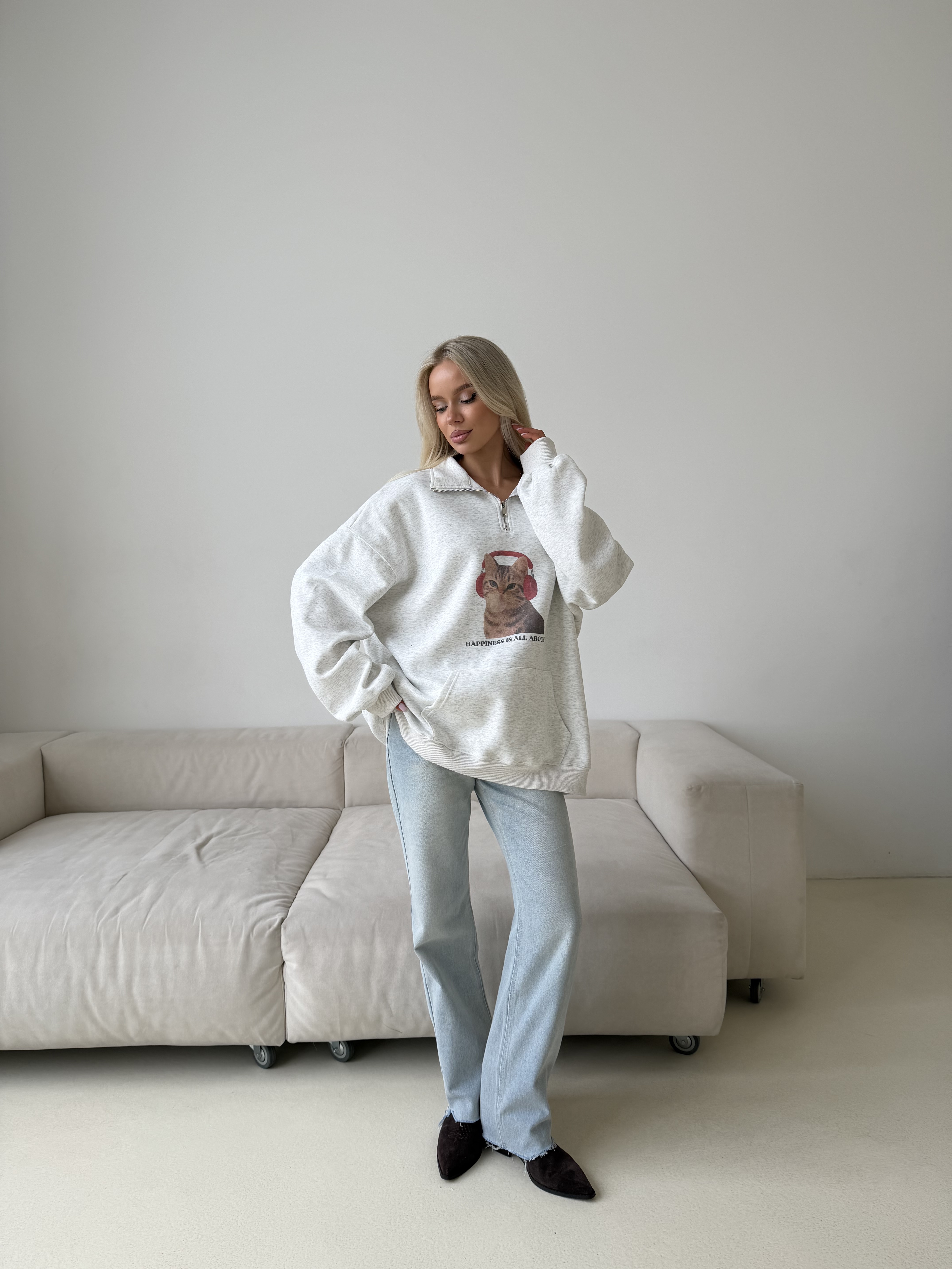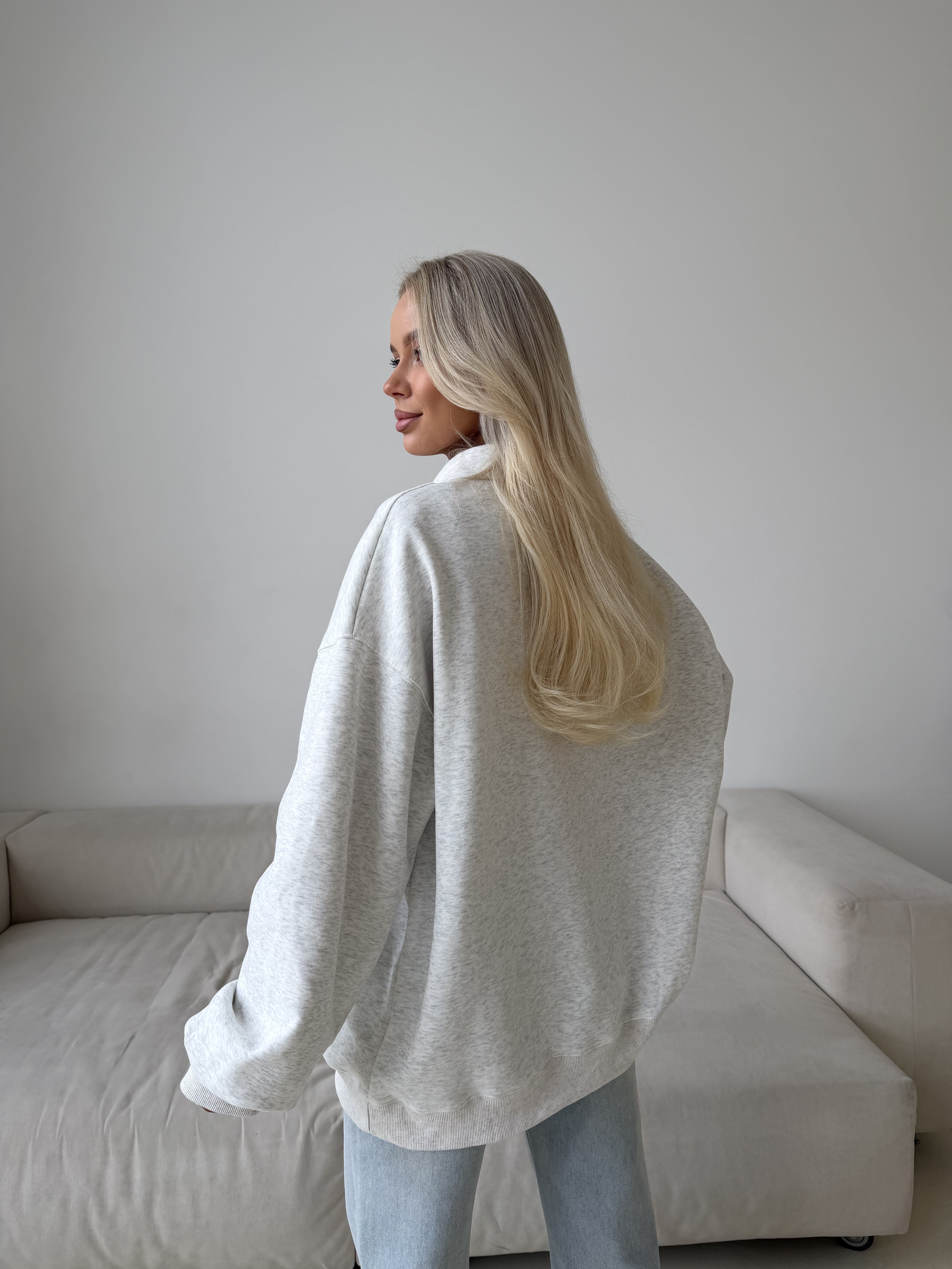 Свободный крой со спущенной линией плеча создаёт мягкий силуэт и ощущение уюта. Идеальный вариант для повседневных образов — сочетается с джинсами, спортивными брюками или мини-юбкой для более смелой стилизации.