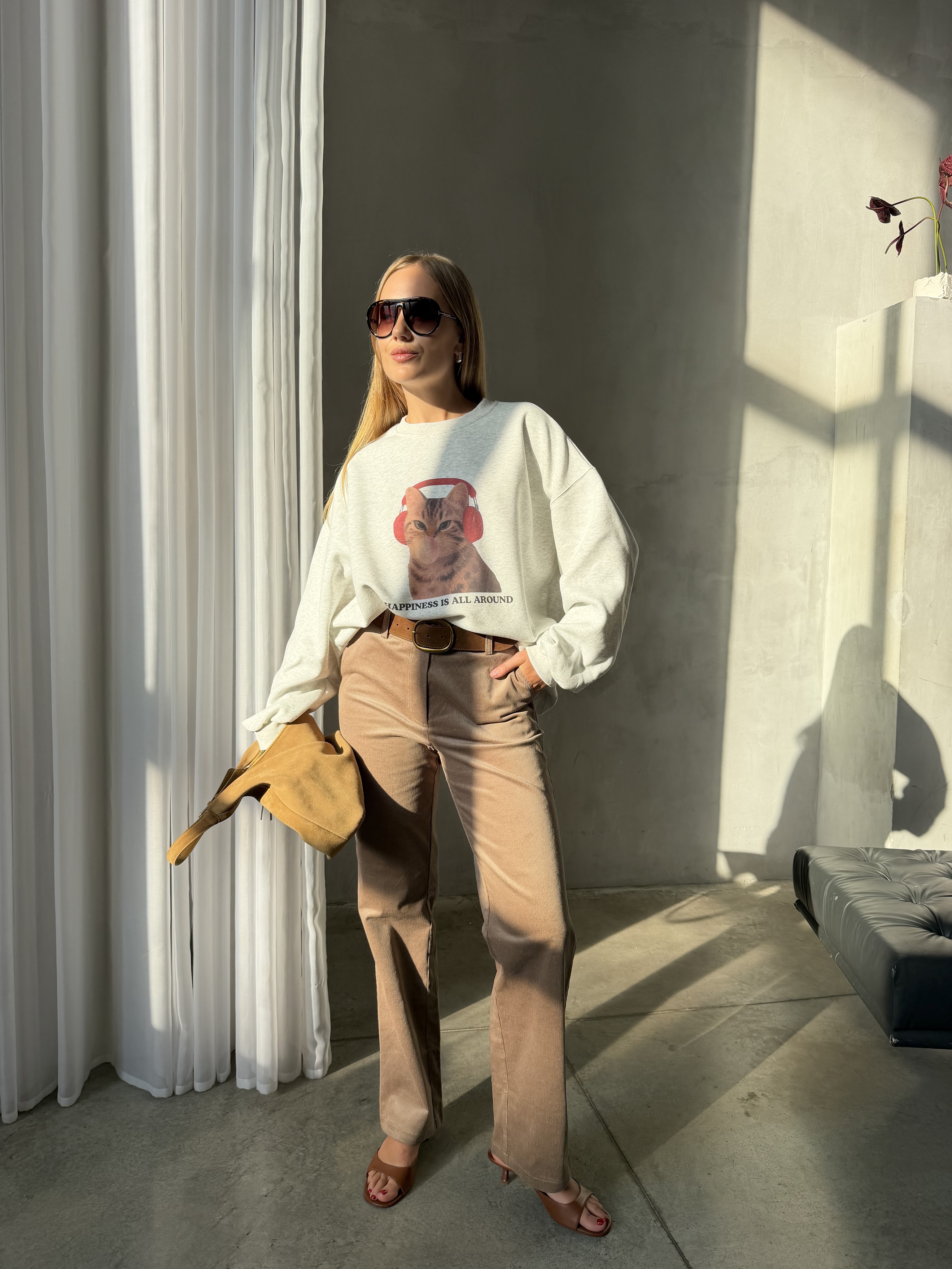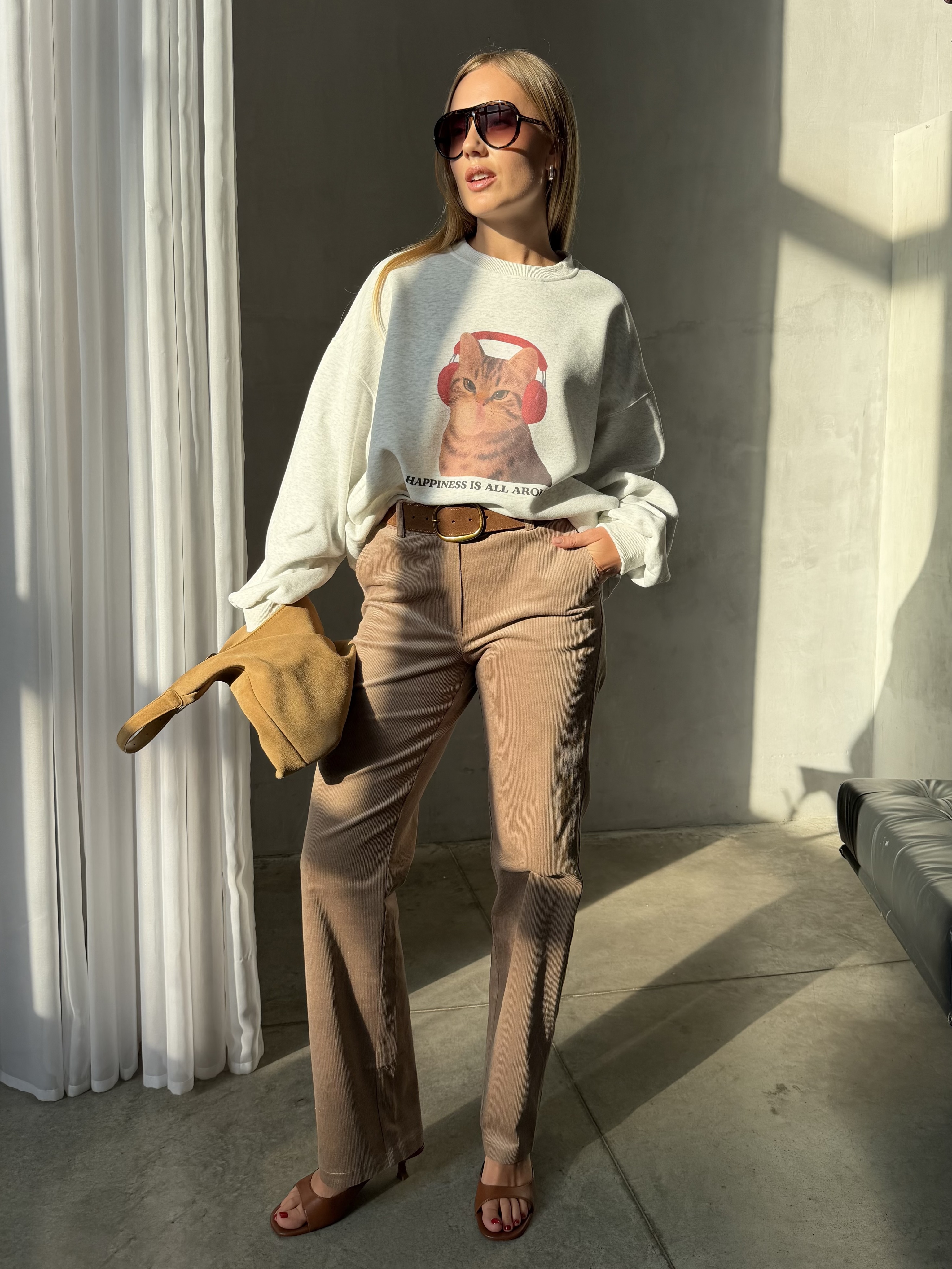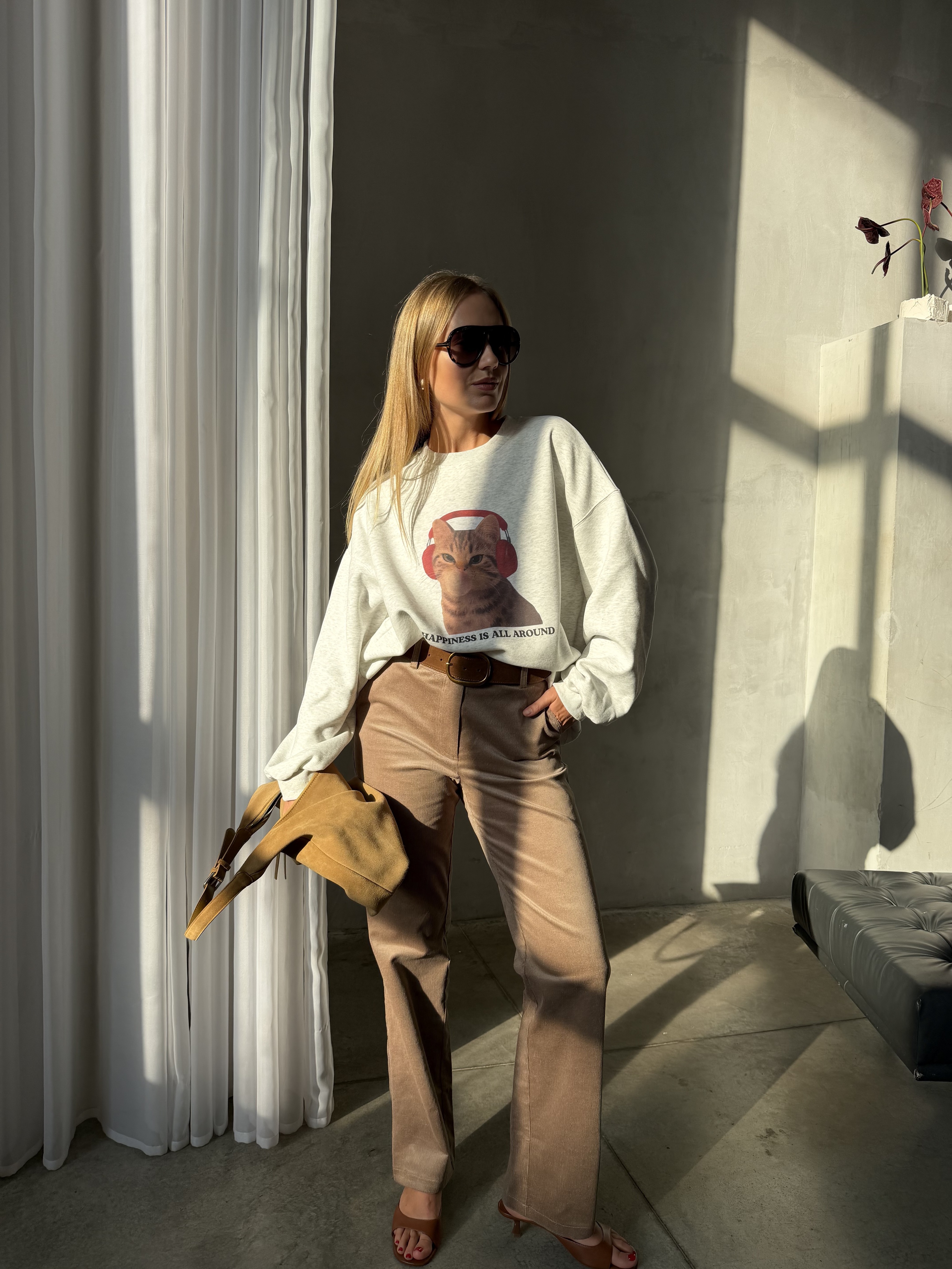 Главная деталь — принт кота в наушниках, который придаёт худи игривое настроение и делает образ более живым. Идеальный вариант для расслабленных городских образов с лёгкой ноткой юмора.