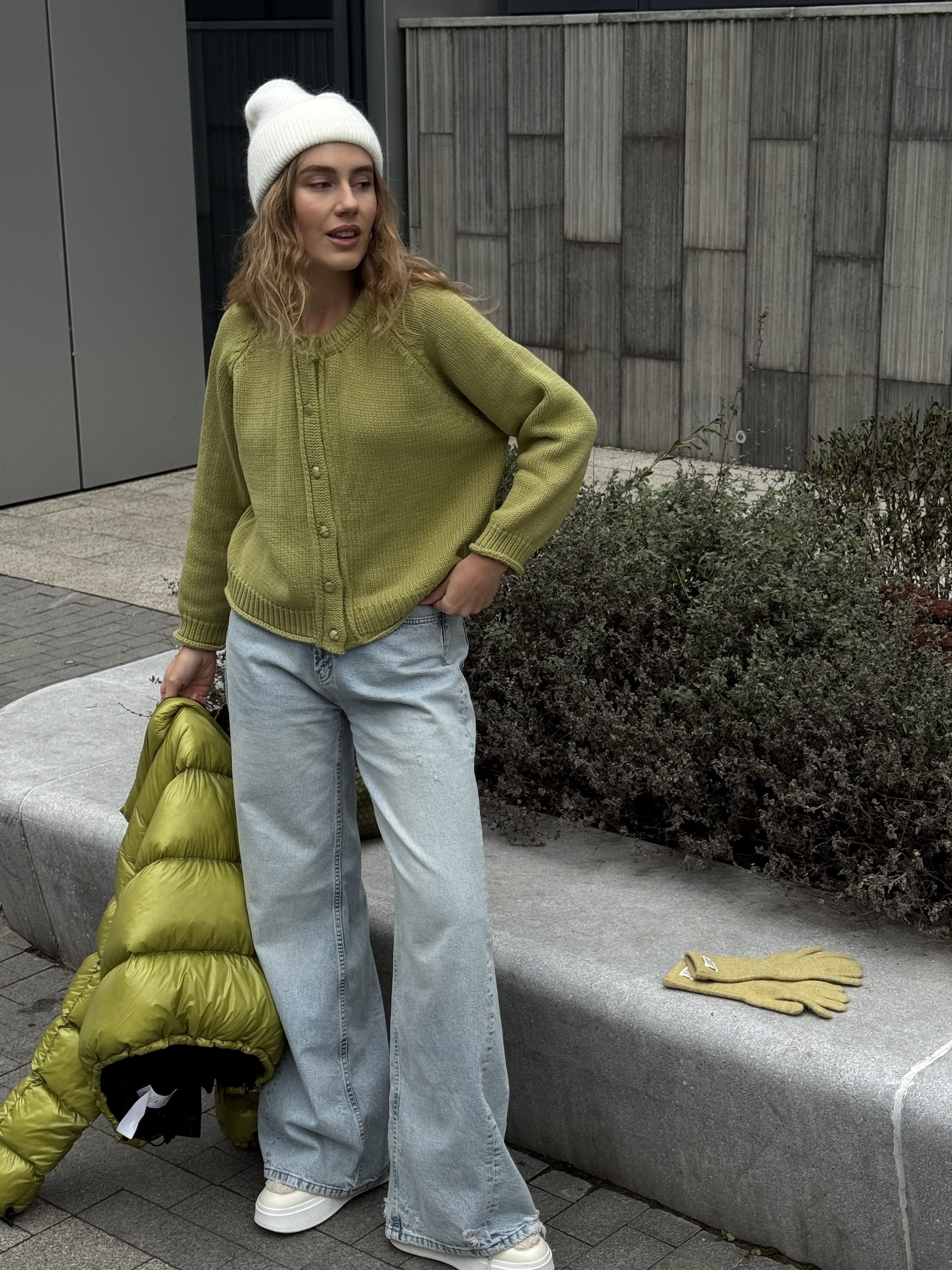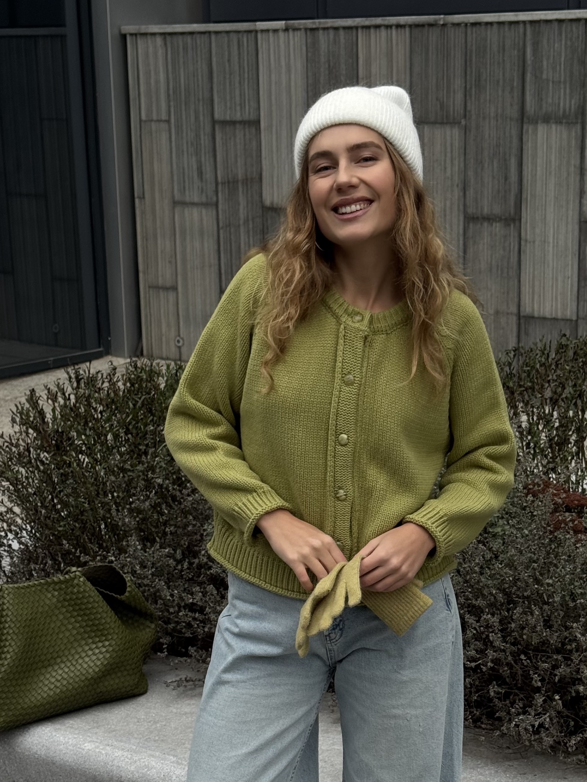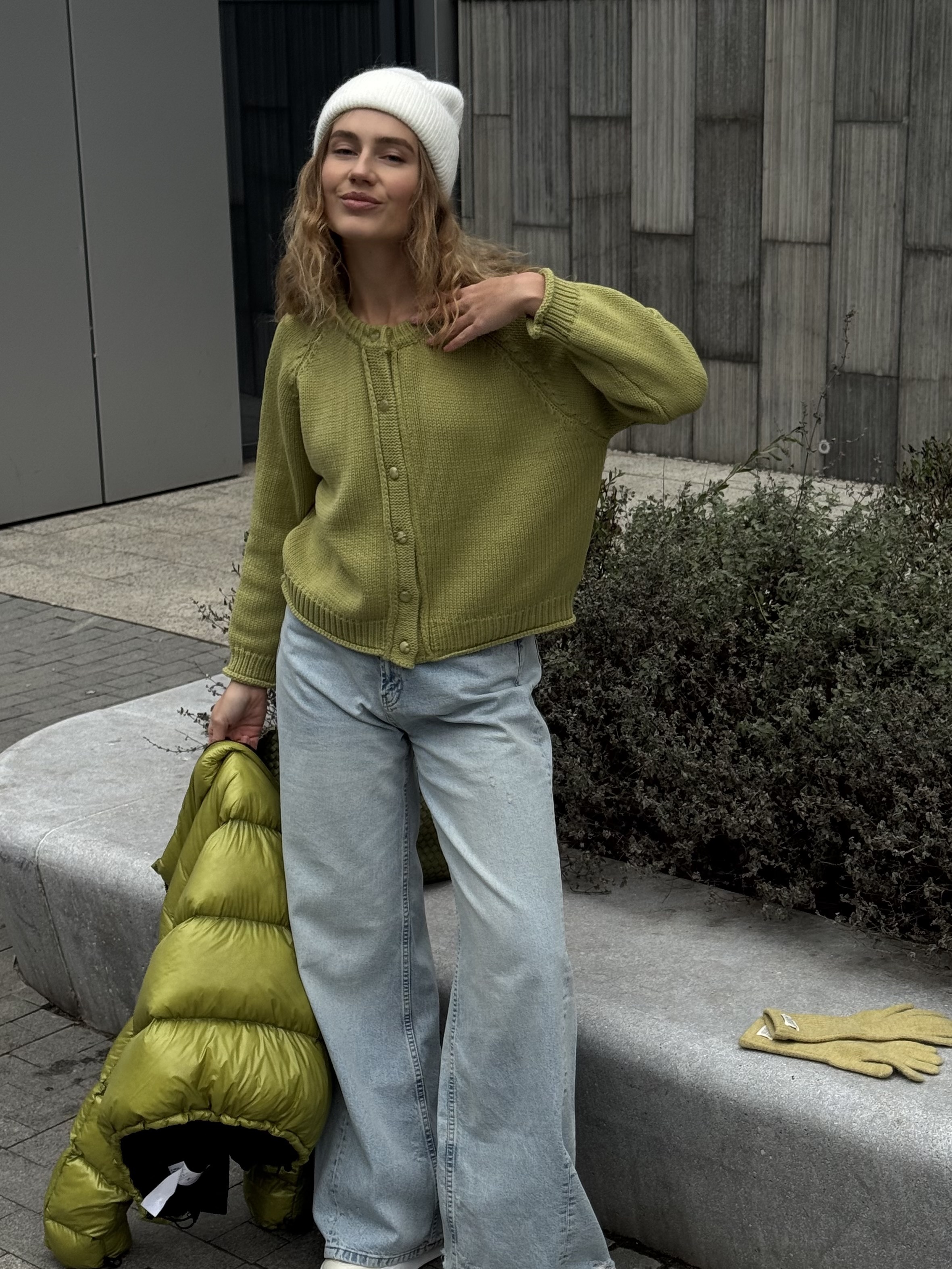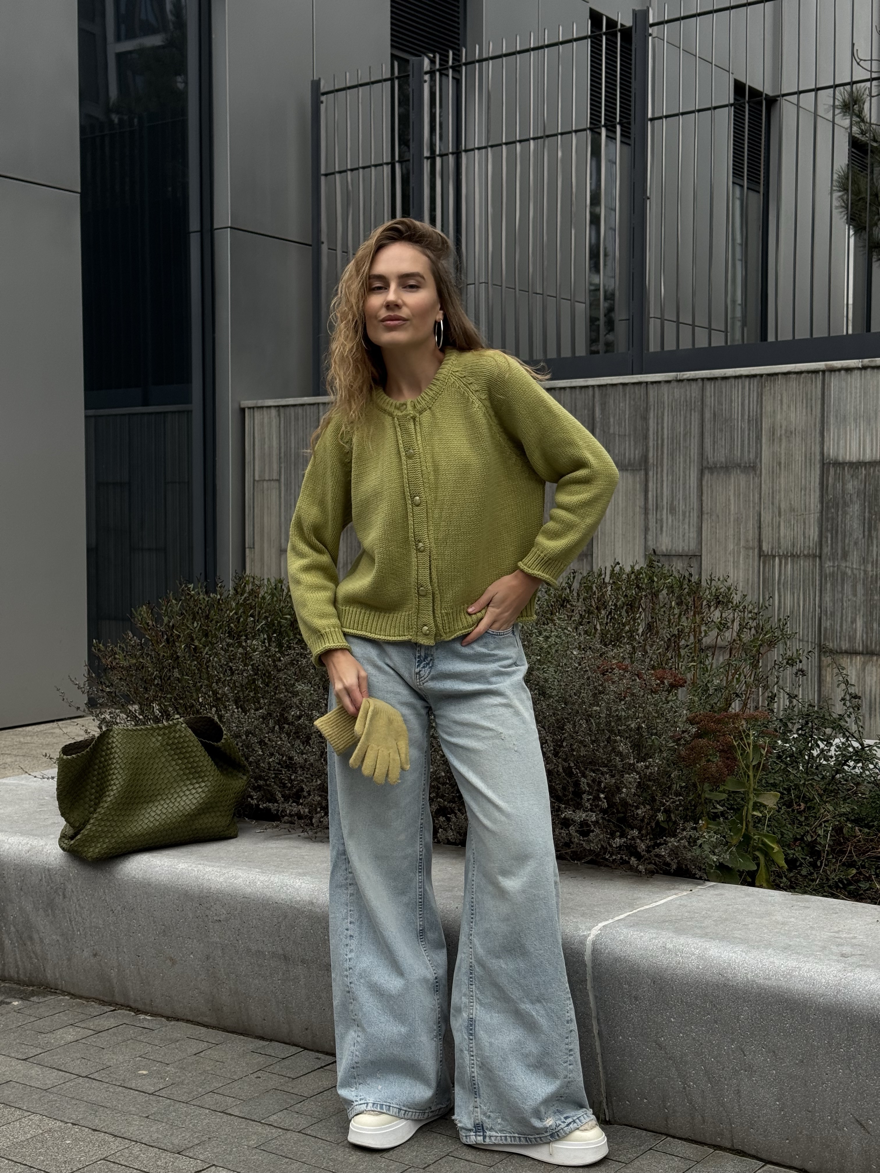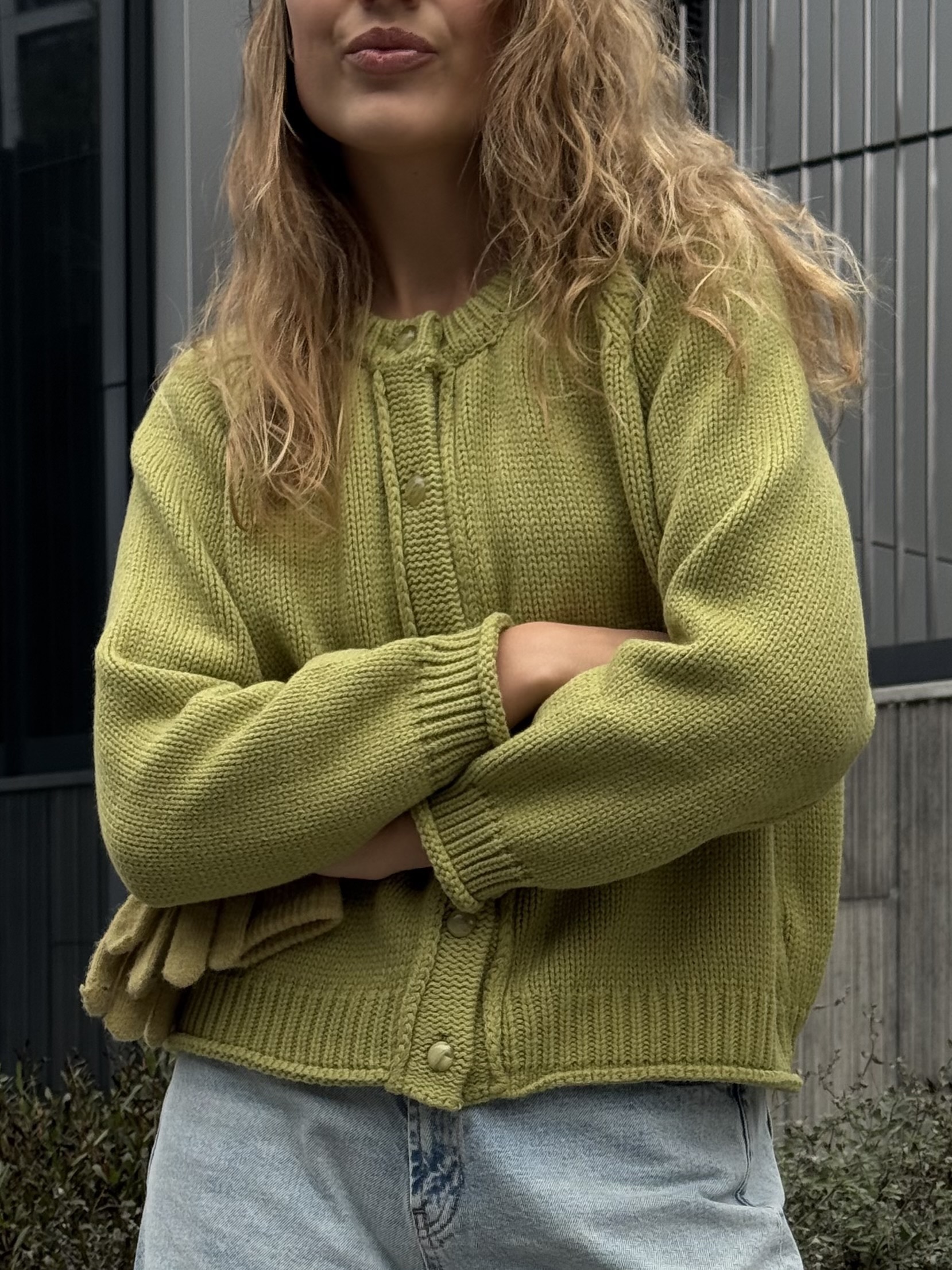 Объёмный вязаный кардиган с мягкой фактурой и ровной плотной вязкой. Модель имеет аккуратную круглую горловину, широкие манжеты и ровный низ, которые создают аккуратный и собранный силуэт. Застёжка выполнена на пуговицы в тон, что делает кардиган лаконичным и легко сочетаемым с любой базой.