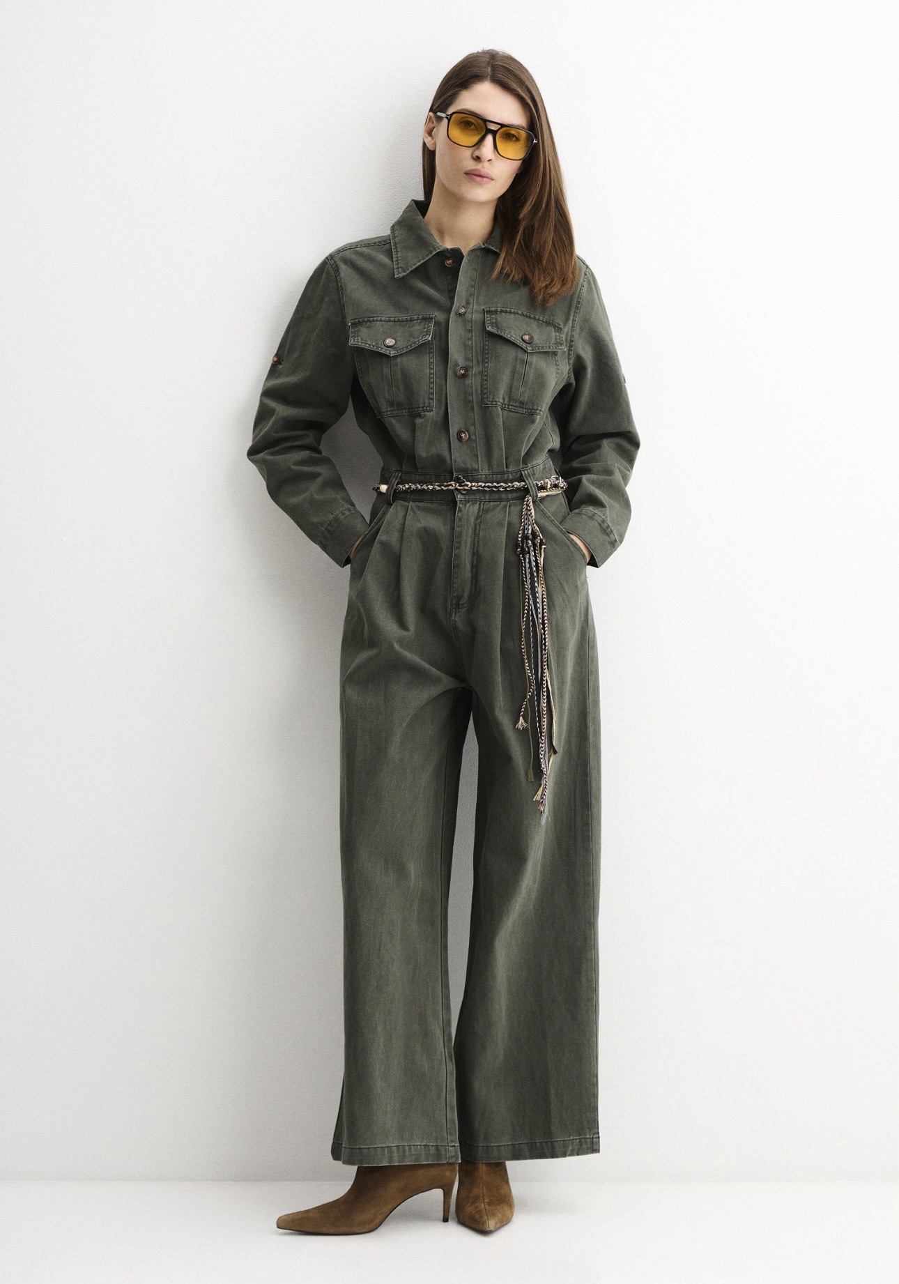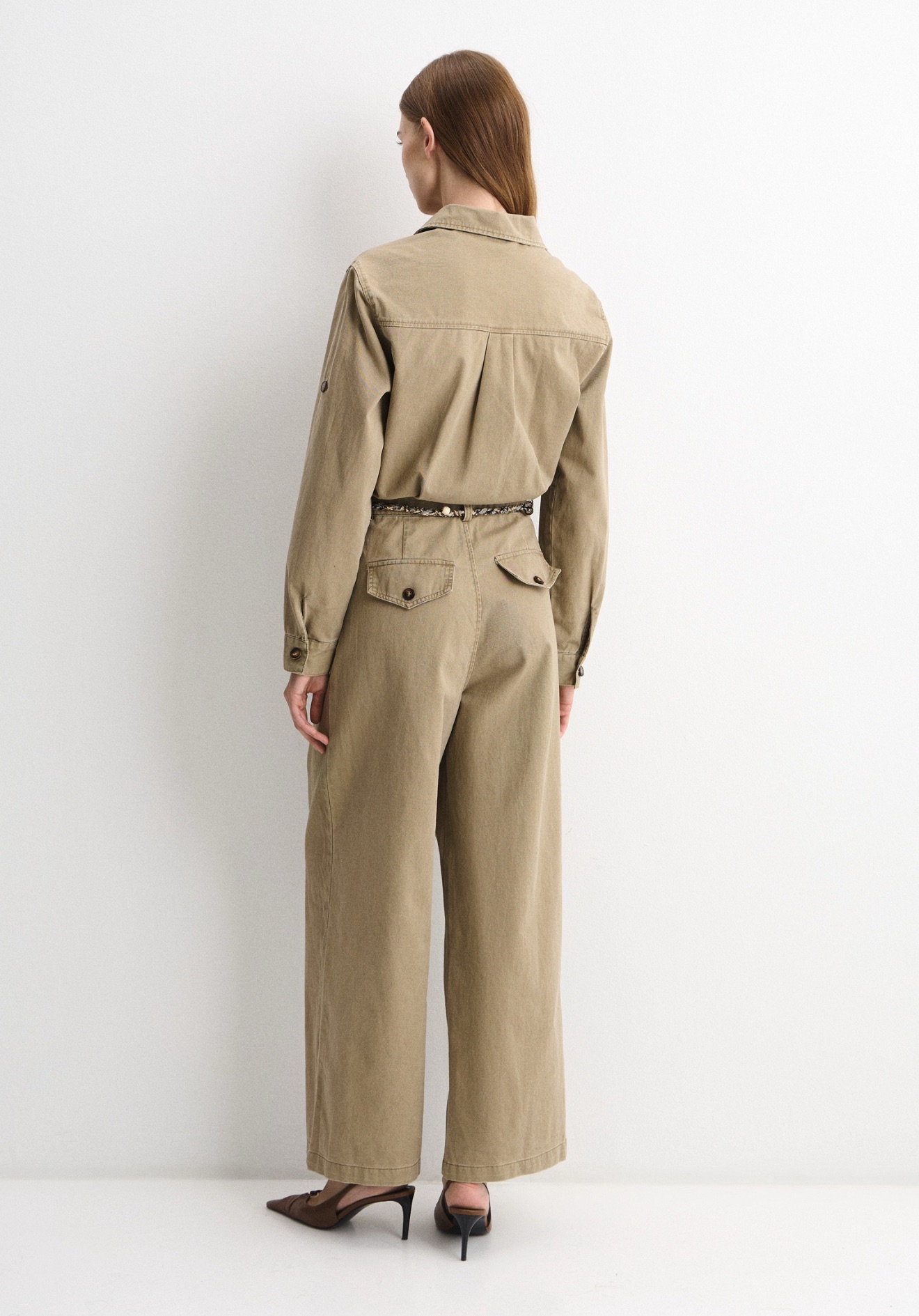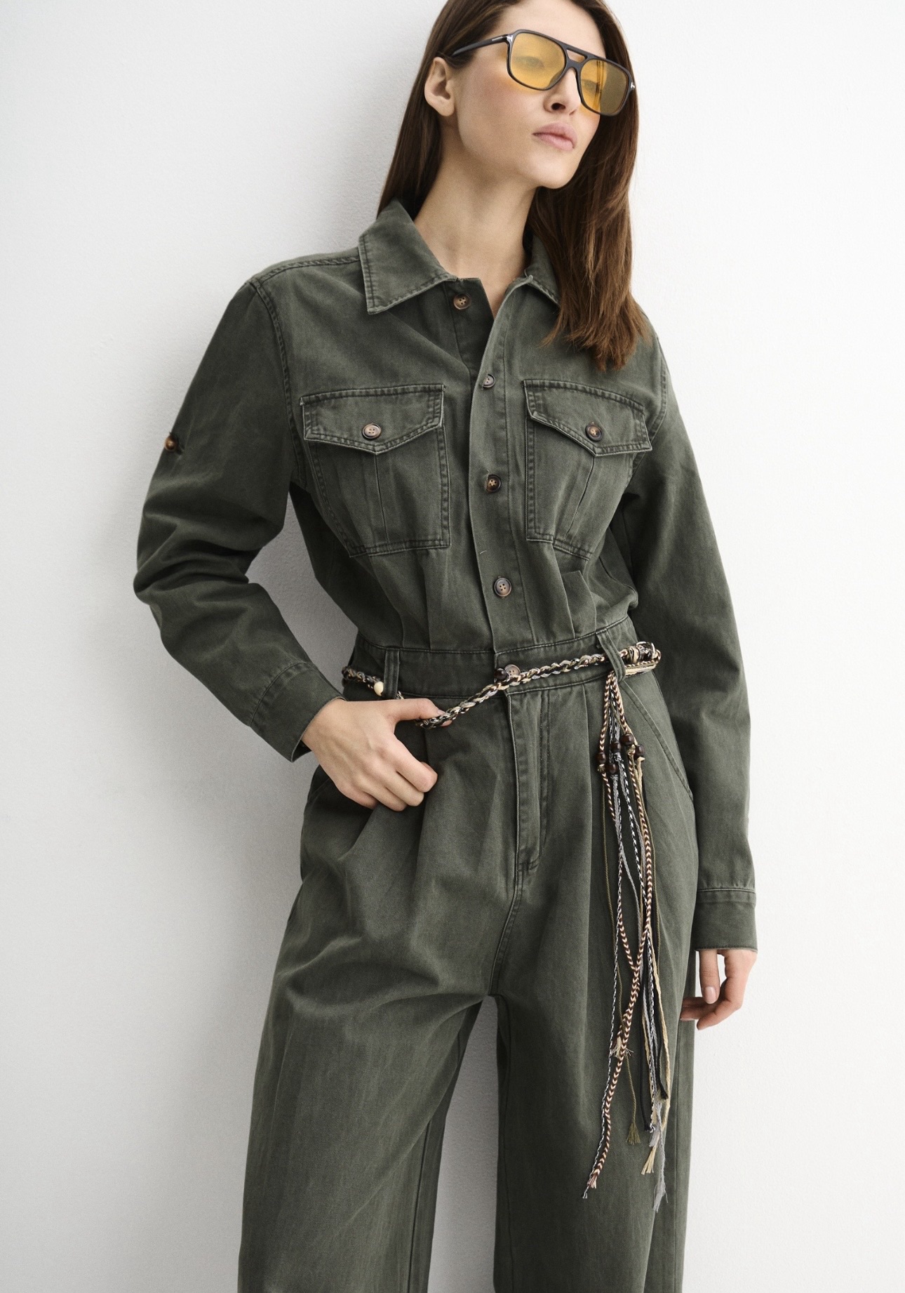 Комбинезон из плотного хлопкового материала выглядит утилитарно и минималистично. Верх напоминает рабочую рубашку с карманами и отложным воротником, а пояс формирует аккуратную линию талии. Свободный крой внизу обеспечивает комфорт в движении и делает силуэт актуальным. Ремень идёт в комплекте и помогает сразу собрать образ. Сзади на брюках расположены накладные карманы с клапанами, которые добавляют вещи характер и функциональность.