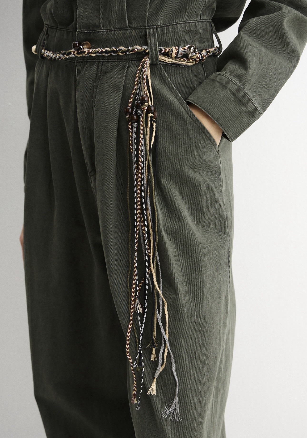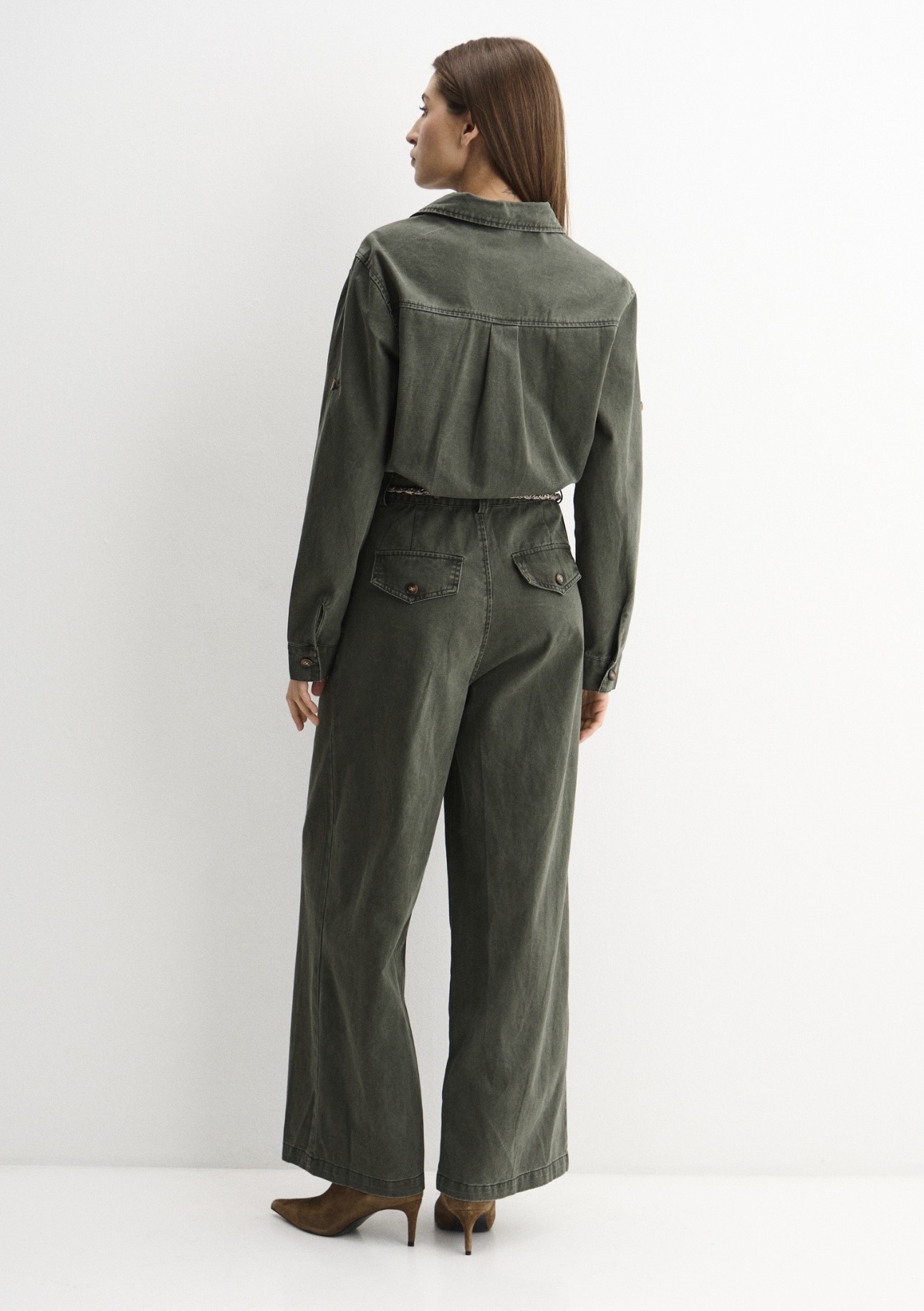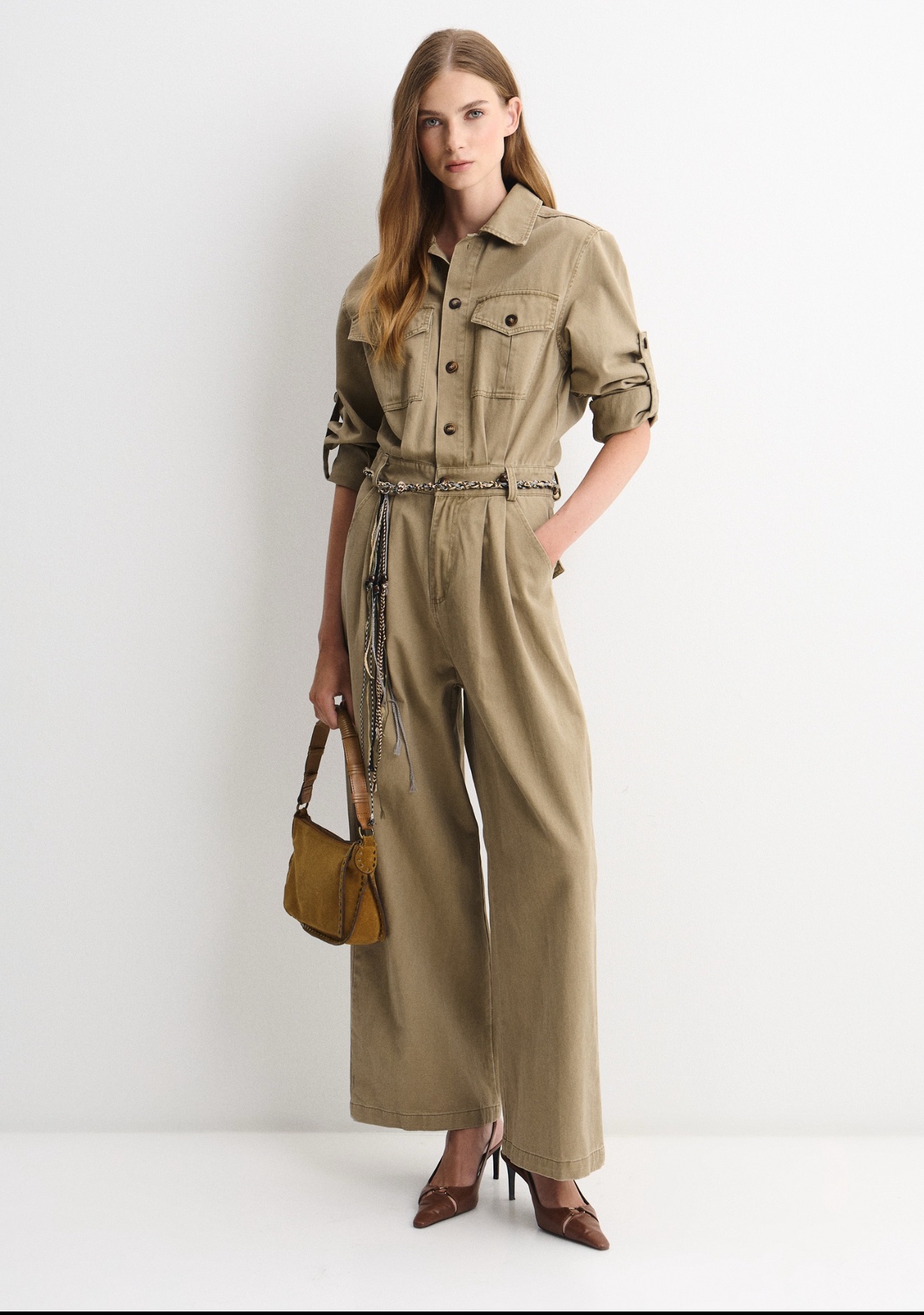 Комбинезон из плотного хлопкового материала выглядит утилитарно и минималистично. Верх напоминает рабочую рубашку с карманами и отложным воротником, а пояс формирует аккуратную линию талии. Свободный крой внизу обеспечивает комфорт в движении и делает силуэт актуальным. Ремень идёт в комплекте и помогает сразу собрать образ. Сзади на брюках расположены накладные карманы с клапанами, которые добавляют вещи характер и функциональность.