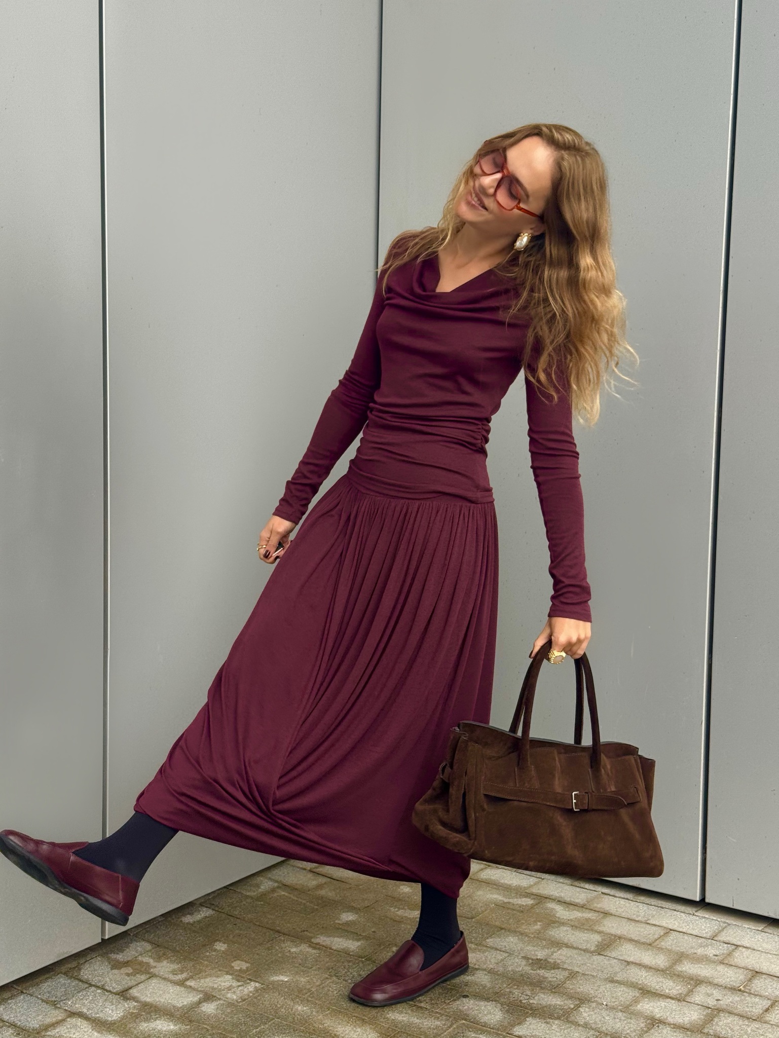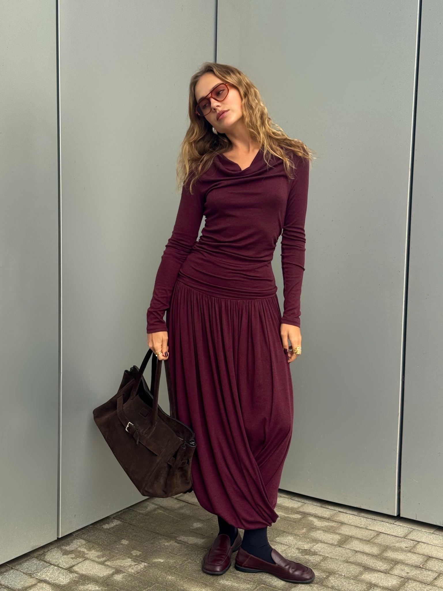 Однотонный костюм в оттенке тёплого шоколада, выполненный из мягкой, струящейся ткани с матовой текстурой. Свободный верх с молнией до груди и мягкой резинкой на талии создаёт комфортную посадку и подчёркивает фигуру без излишней фиксации. Широкие прямые брючины формируют вытянутый силуэт, а лаконичные манжеты на рукавах добавляют завершённости образу.