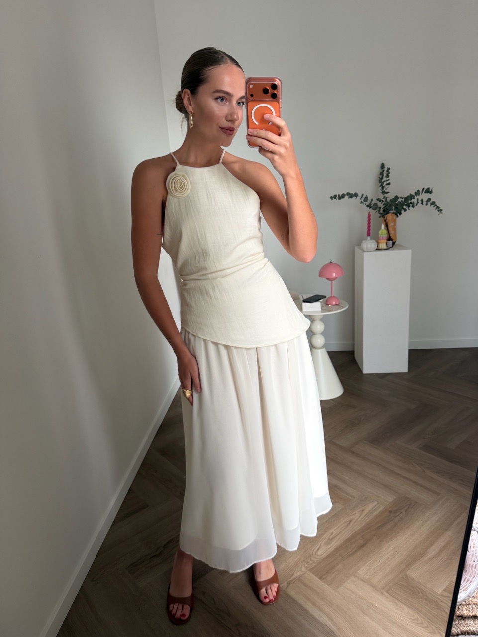 Нежный костюм Rose — это гармоничное сочетание топа с декоративной розочкой и лёгкой юбки, созданное для мягкого, романтичного образа. Топ с высоко посаженным вырезом подчёркивает линию плеч и талию, а изящная розочка добавляет женственного акцента; юбка средней длины с плавными складками обеспечивает воздушную посадку и элегантную силуэтную пропорцию.