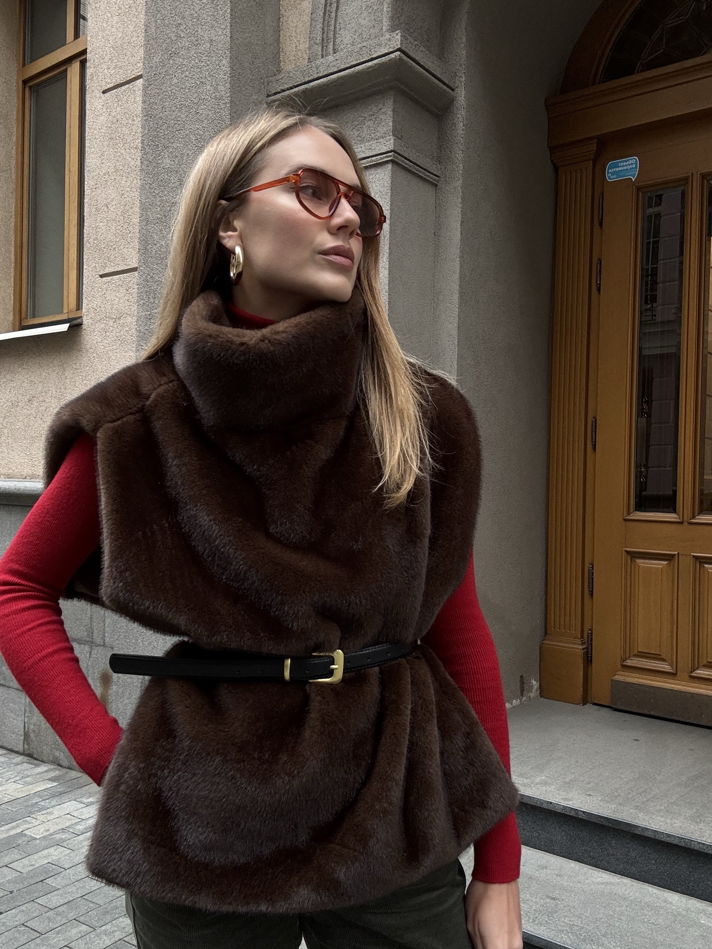 Манишка, которая сразу делает образ богаче — без лишних слов и усилий. Мягкий мех красиво ложится по фигуре, создавая аккуратный объём и уютную «объятую» посадку. Высокий воротник держит форму и защищает шею от ветра.