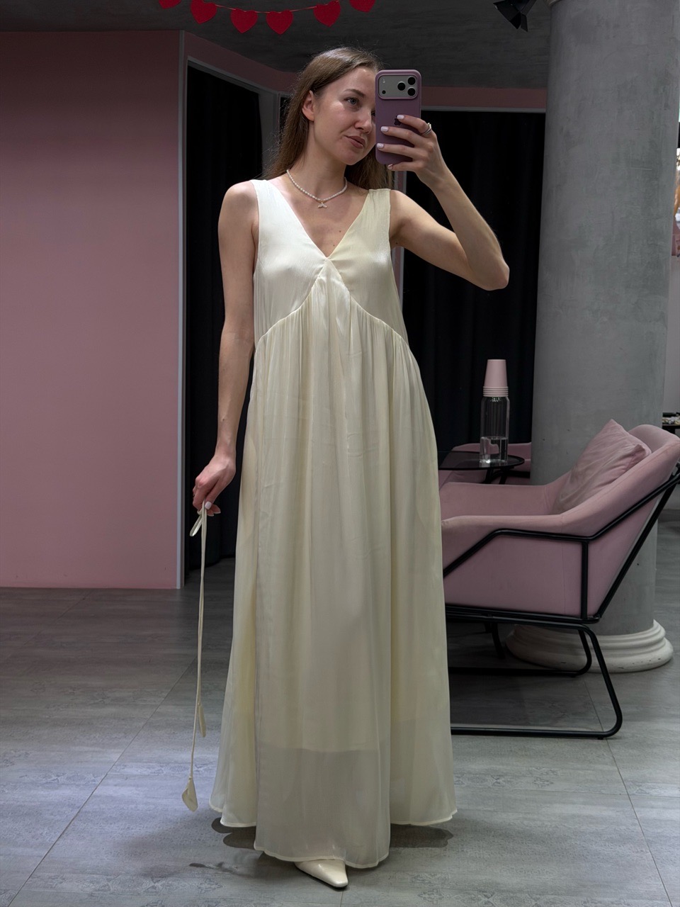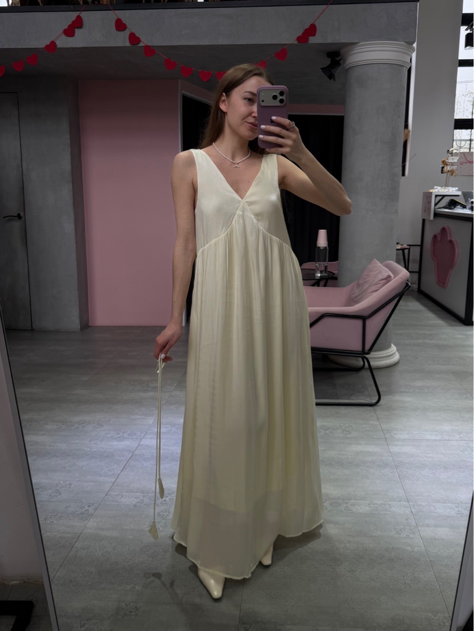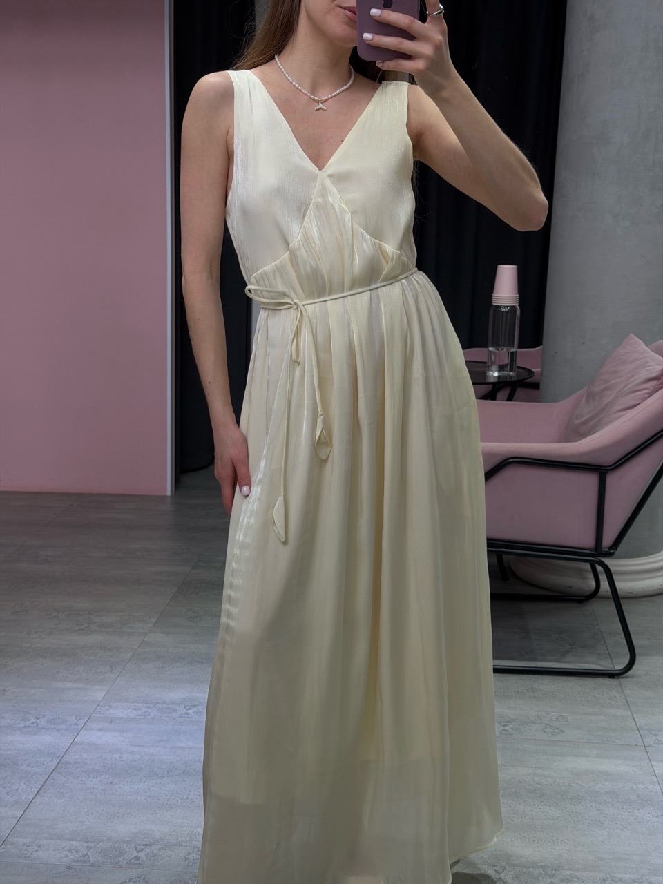 Платье макси свободного силуэта с глубоким V-вырезом и поясом в комплекте, который позволяет подчеркнуть талию или оставить посадку более расслабленной.