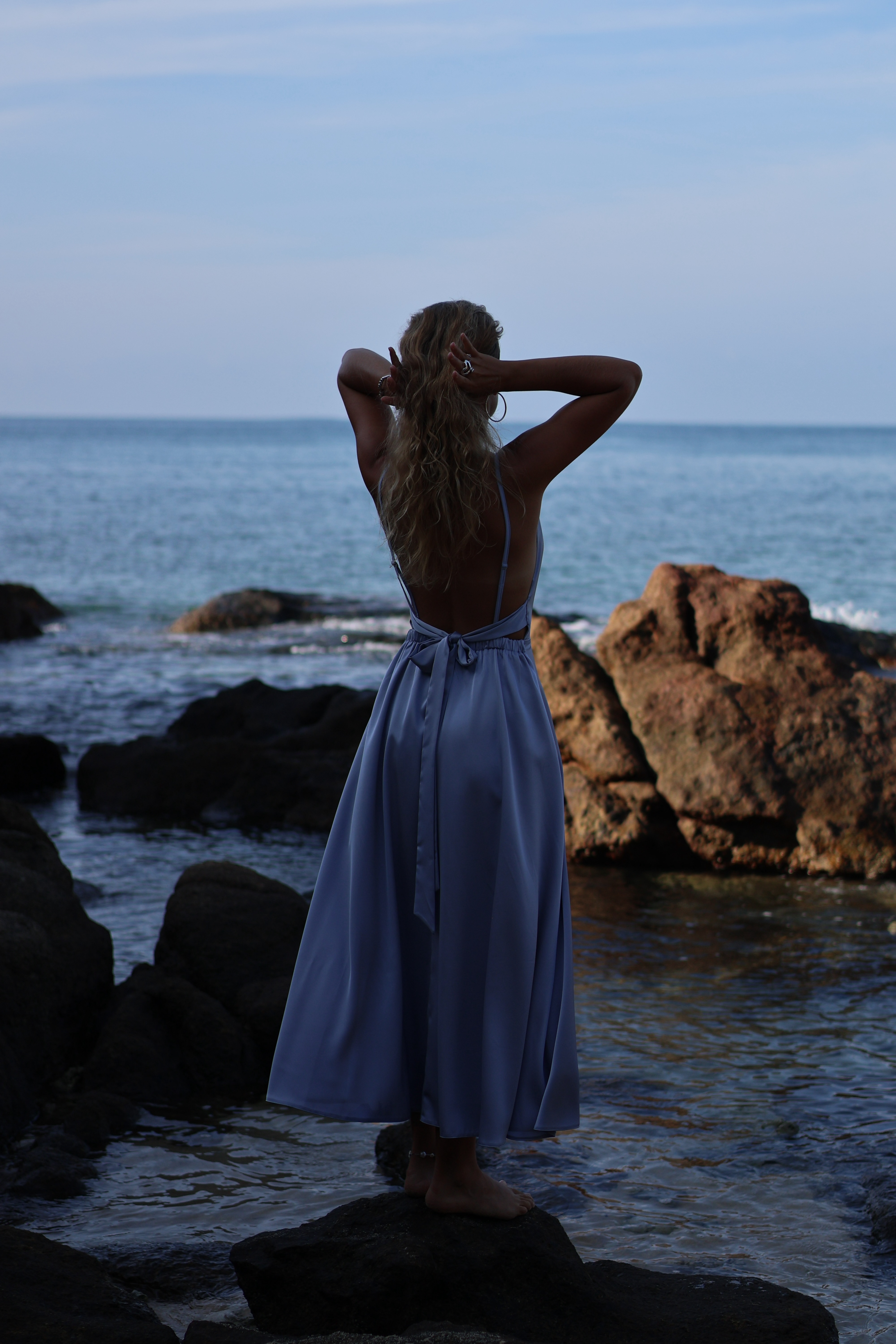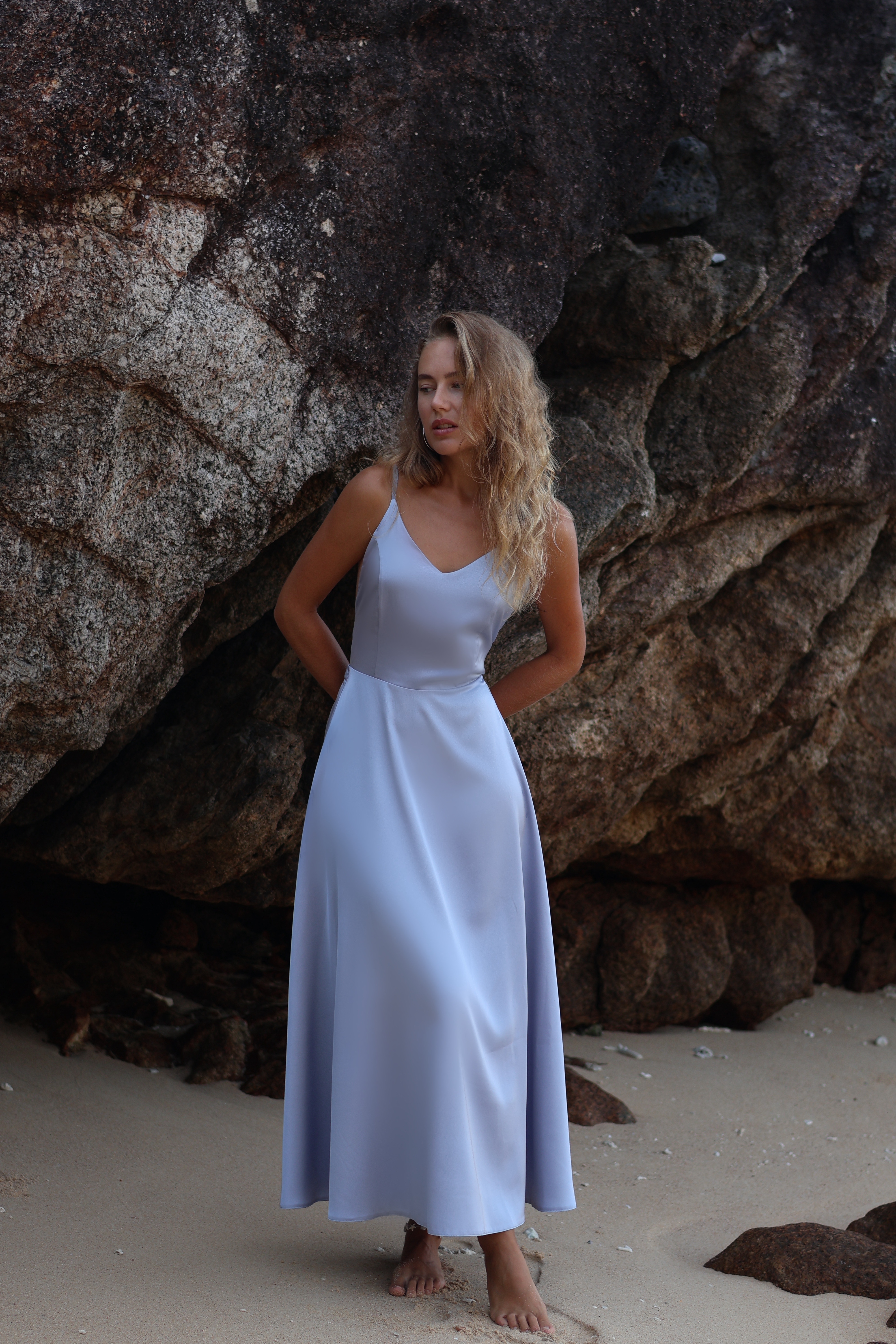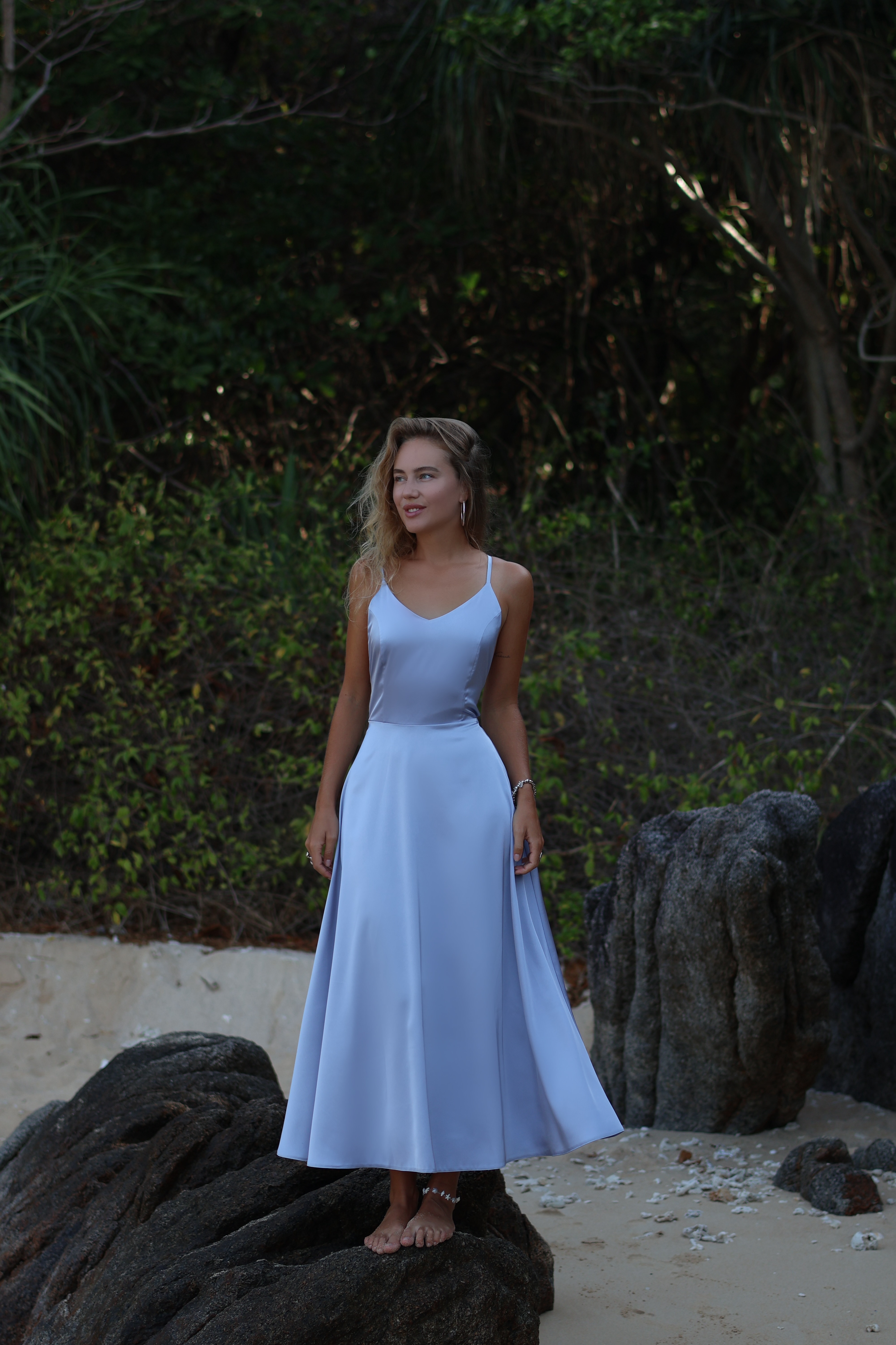 Платье цвета серо-голубого шелка с открытой спинкой и струящейся юбкой миди — как лёгкий ветер в конце весны: нежное, уверенное, изысканное.