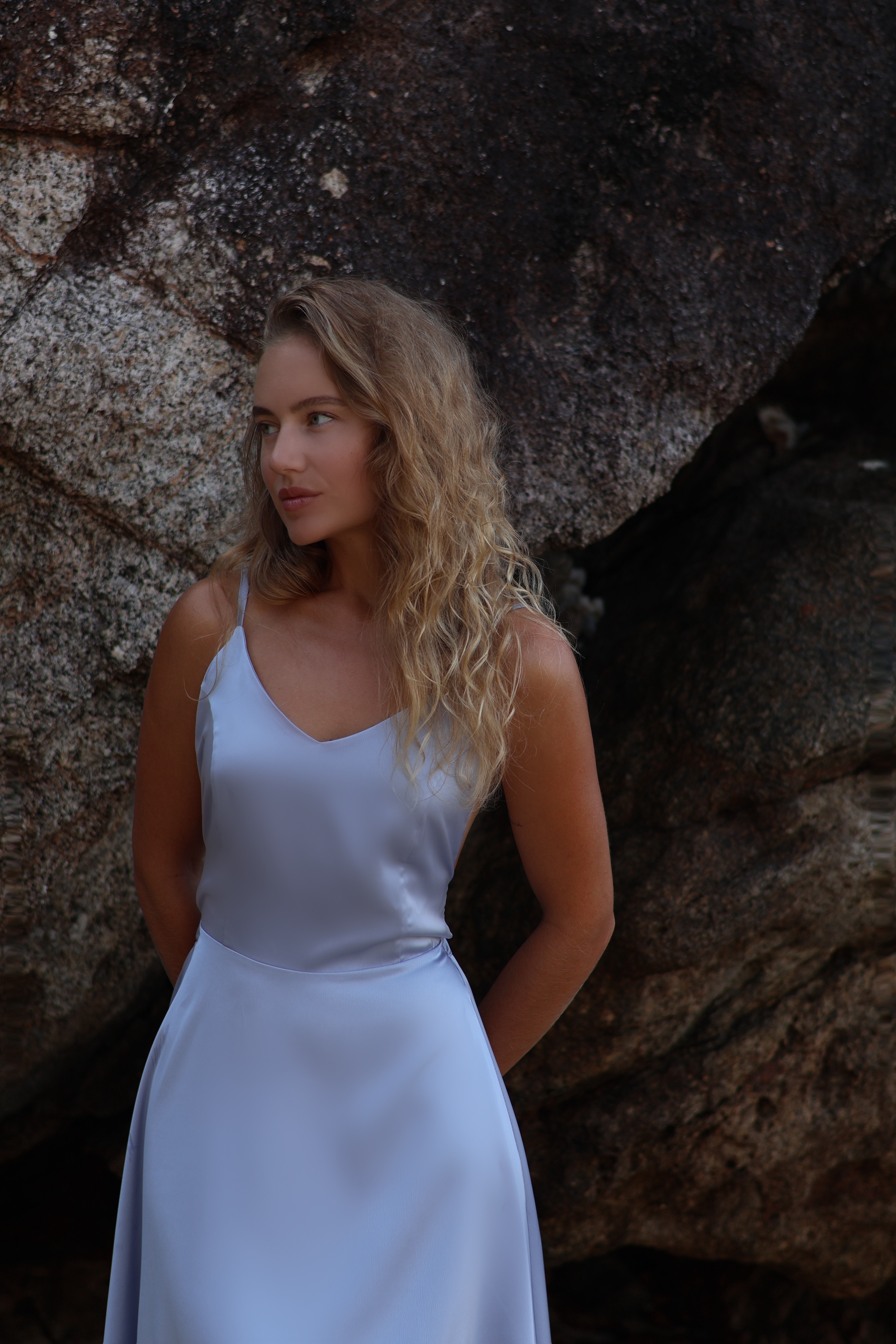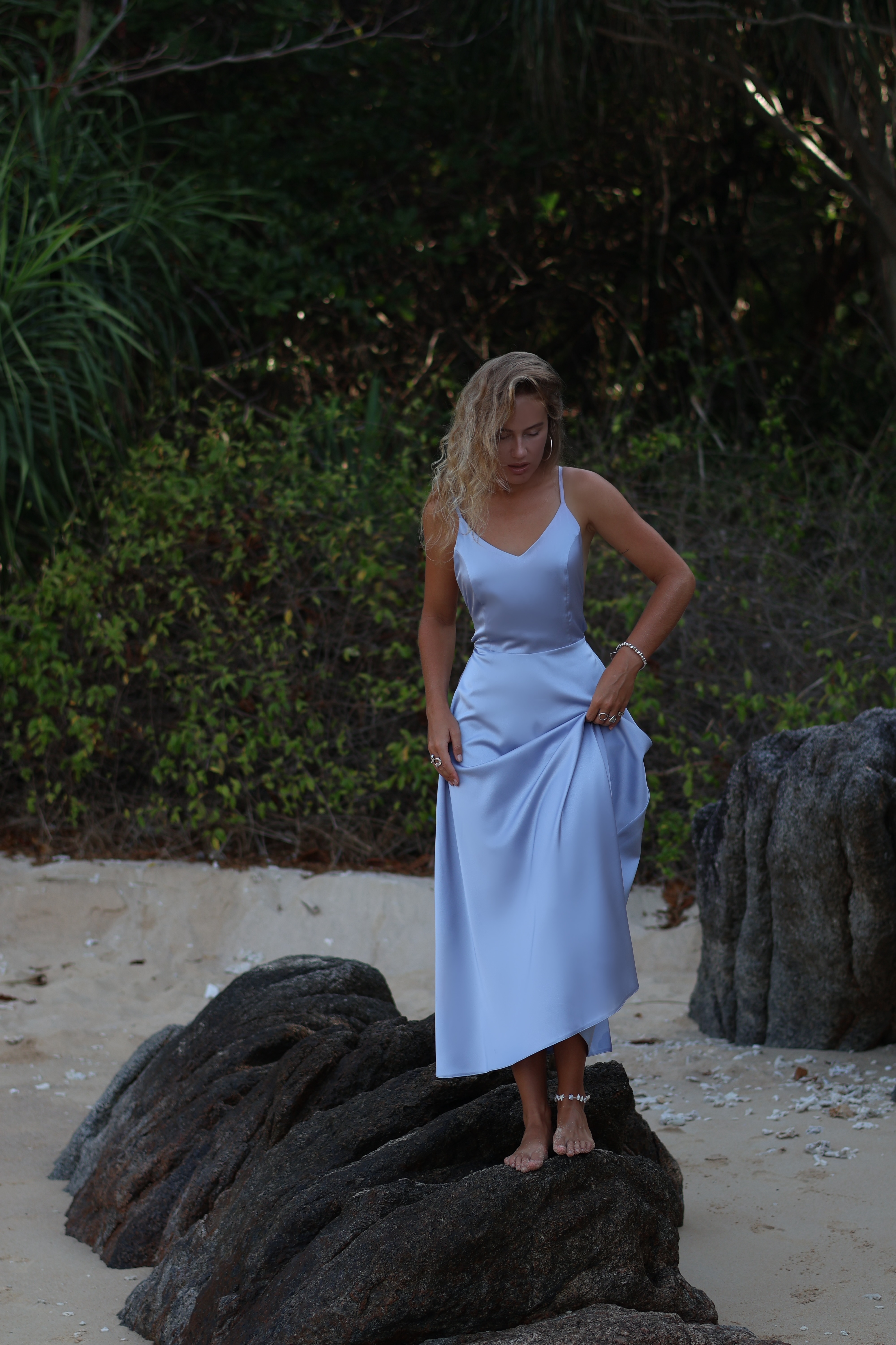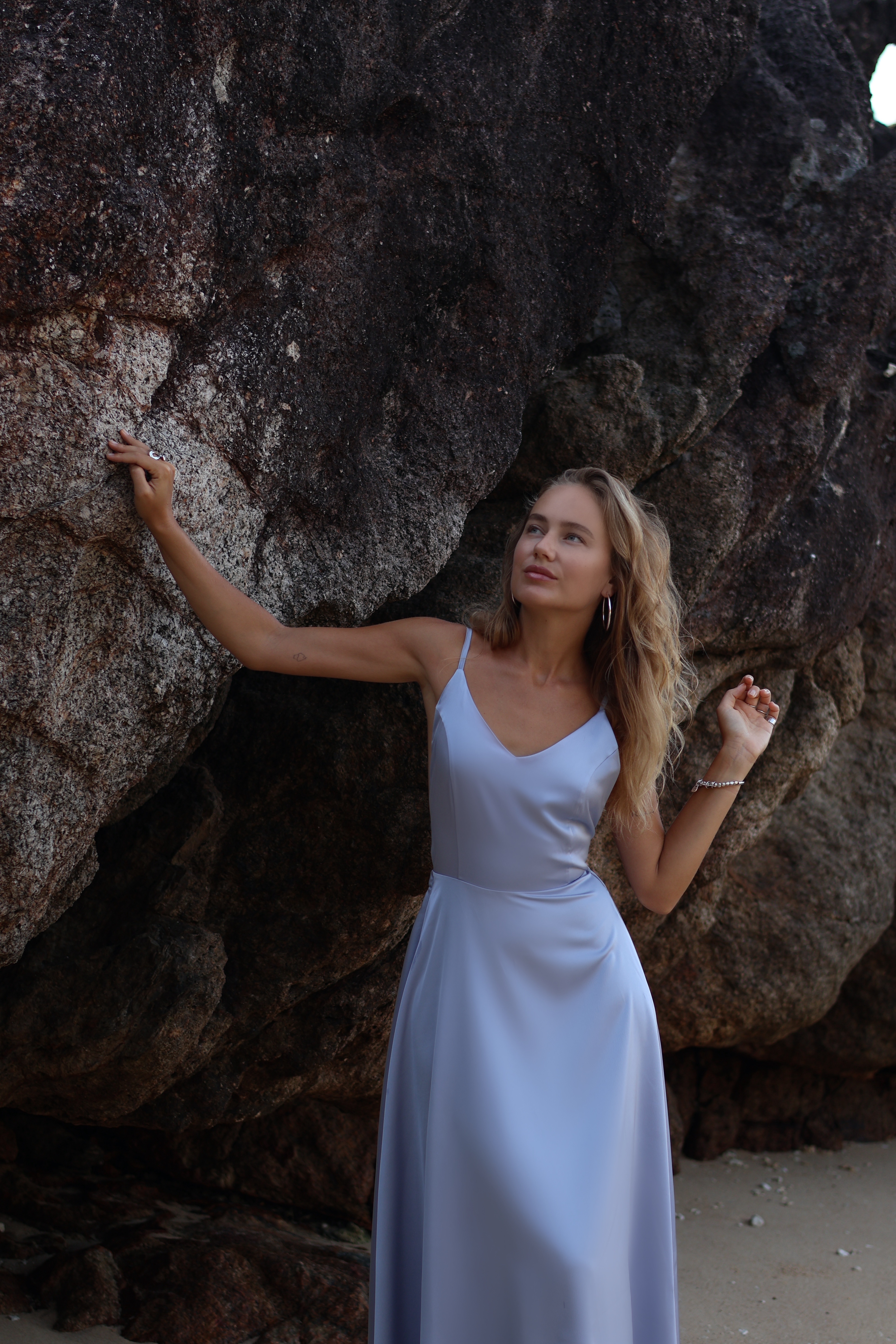 Платье цвета серо-голубого шелка с открытой спинкой и струящейся юбкой миди — как лёгкий ветер в конце весны: нежное, уверенное, изысканное.