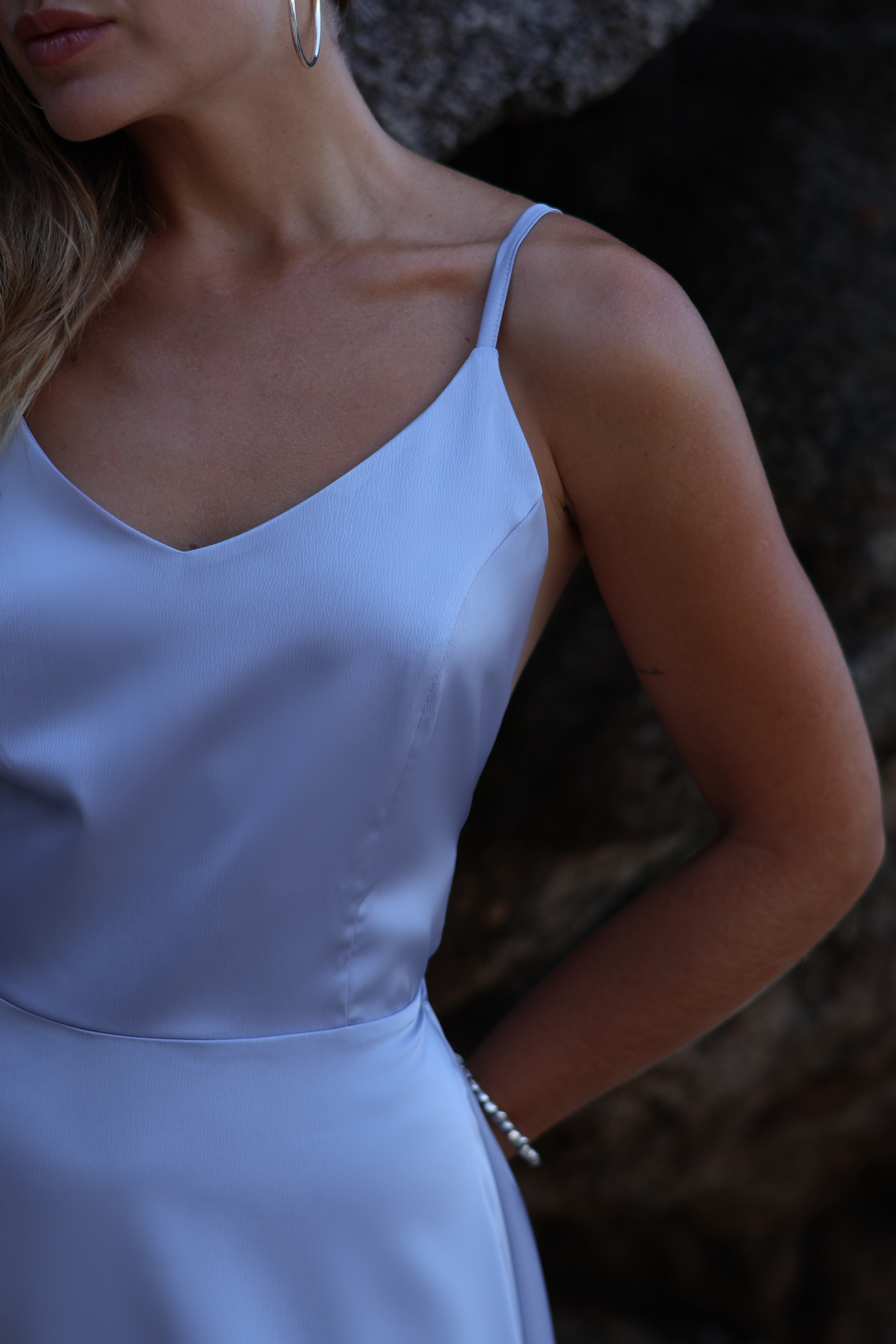 Лаконичный V-образный вырез подчёркивает линию декольте, тонкие бретели оставляют спину полностью открытой, а матовый блеск ткани играет на свету, создавая эффект текучего сияния.
