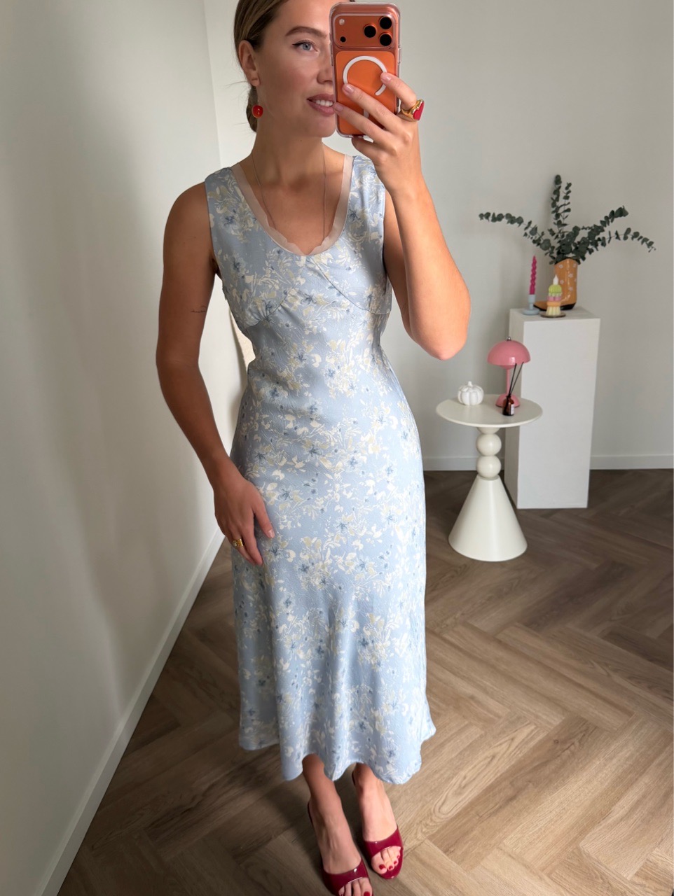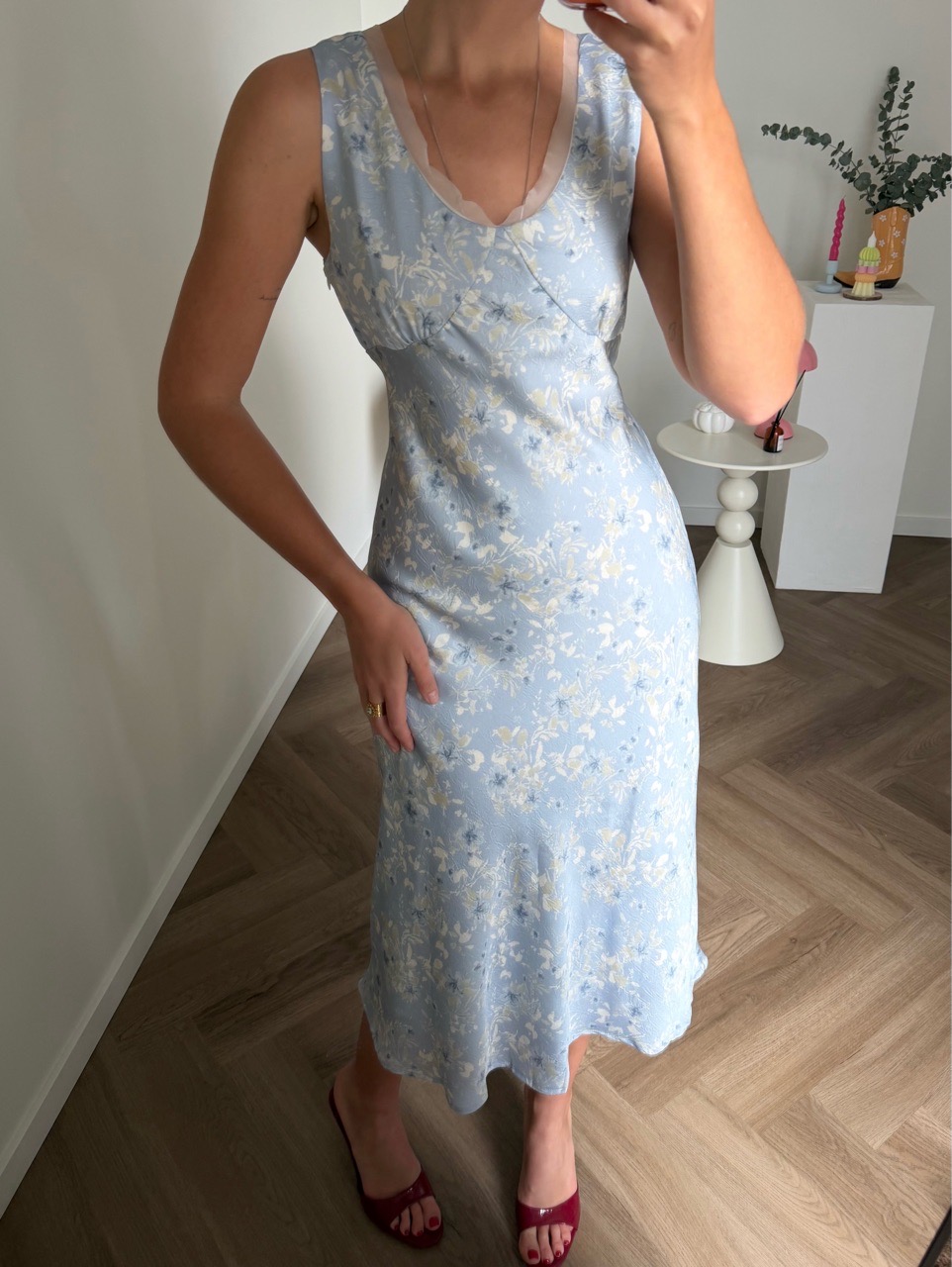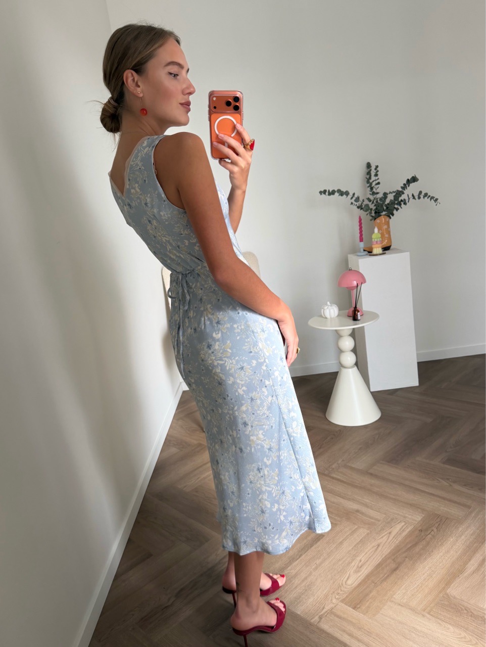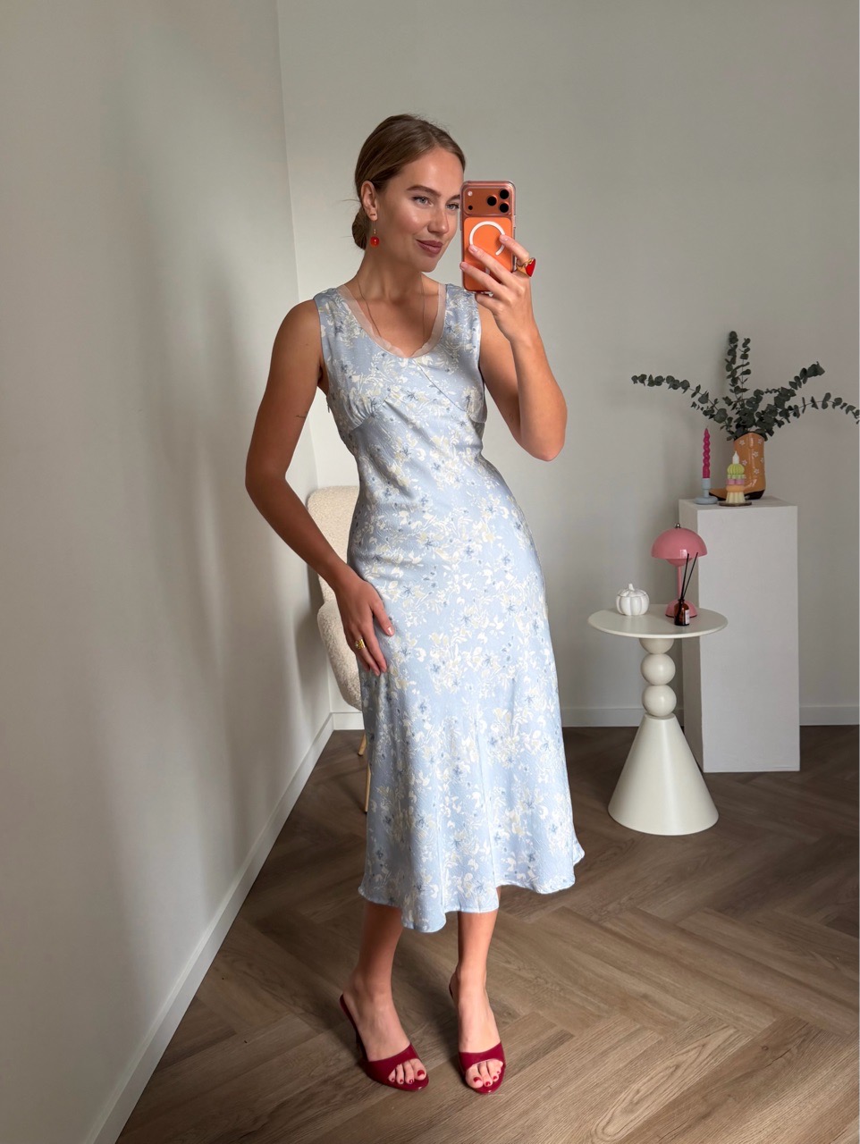 Нежное платье в голубом цвете с мелким цветочным принтом — идеальный выбор для тёплых дней и романтических вечеров. Мягкая лёгкая ткань с едва уловимым сатиновым блеском красиво ложится по фигуре, а приталенный лиф с аккуратными вытачками подчёркивает талию и обеспечивает женственный силуэт. Лёгкая трапециевидная юбка добавляет свободного движения и воздушности, а глубокий вырез придаёт образу изящества без лишней открытости.