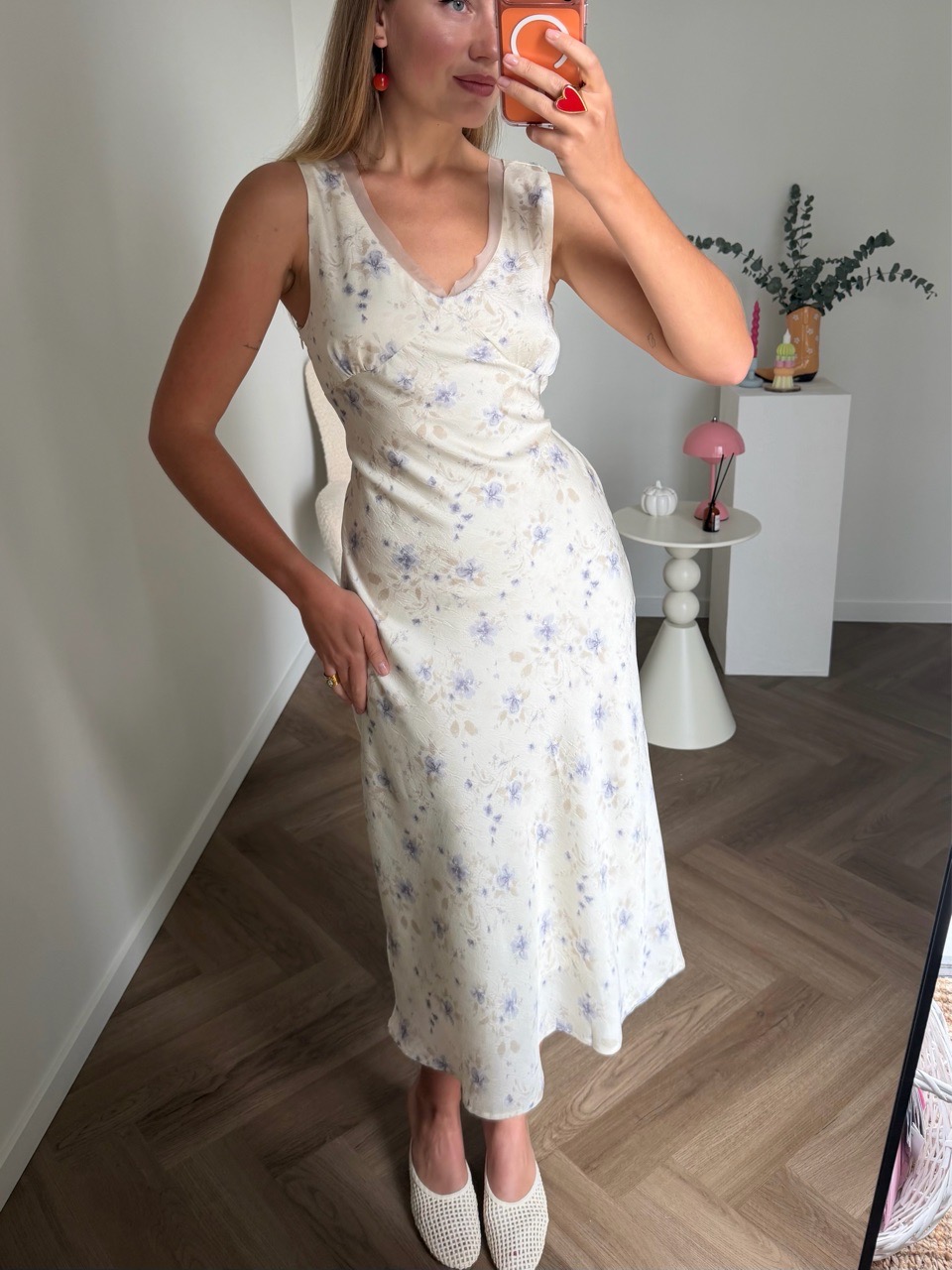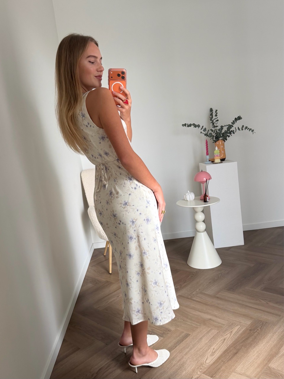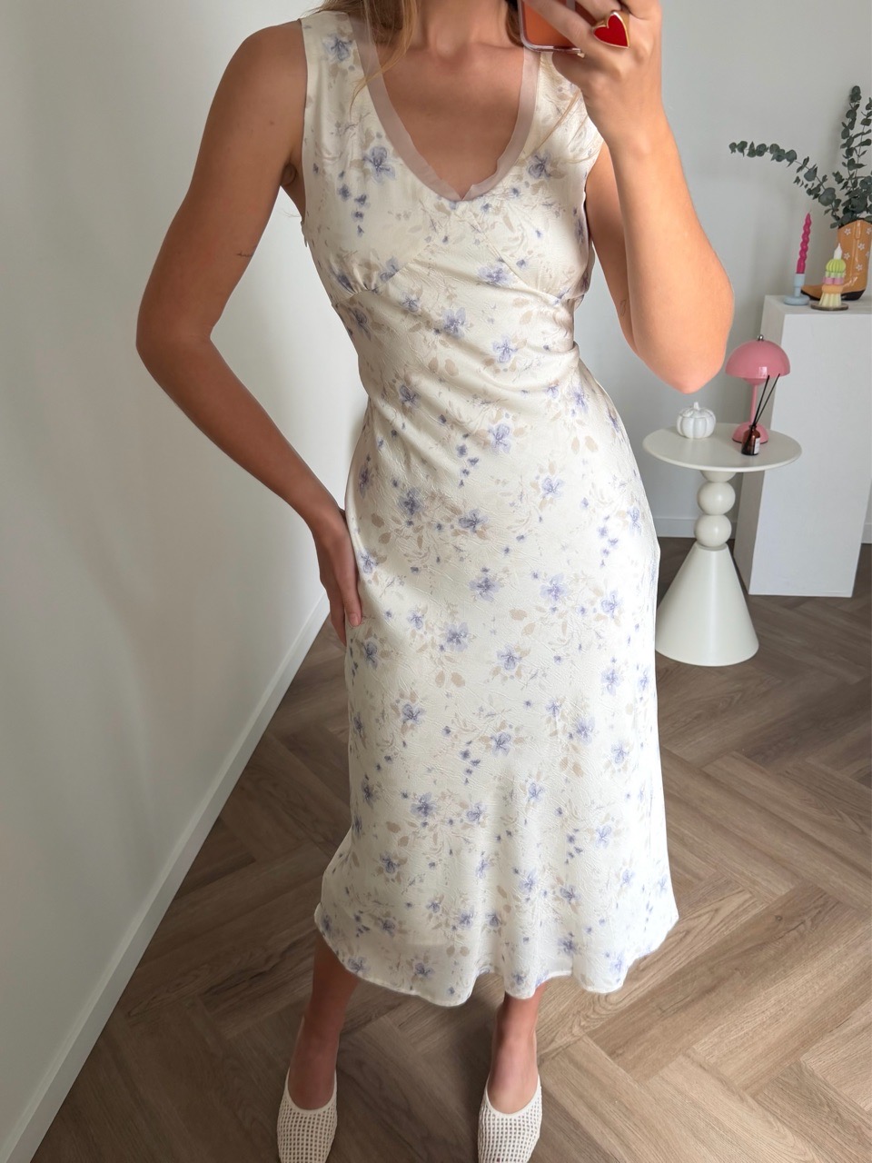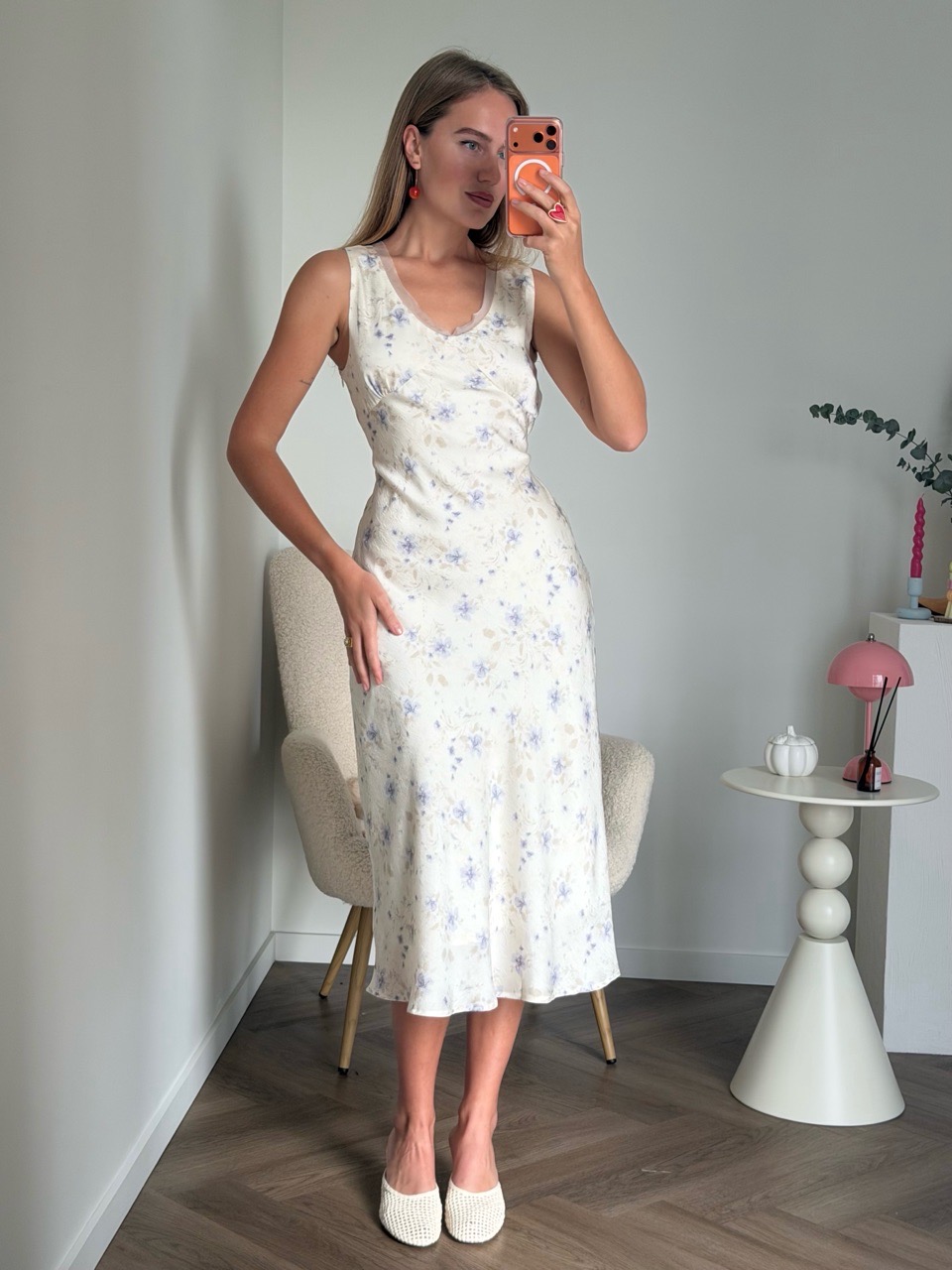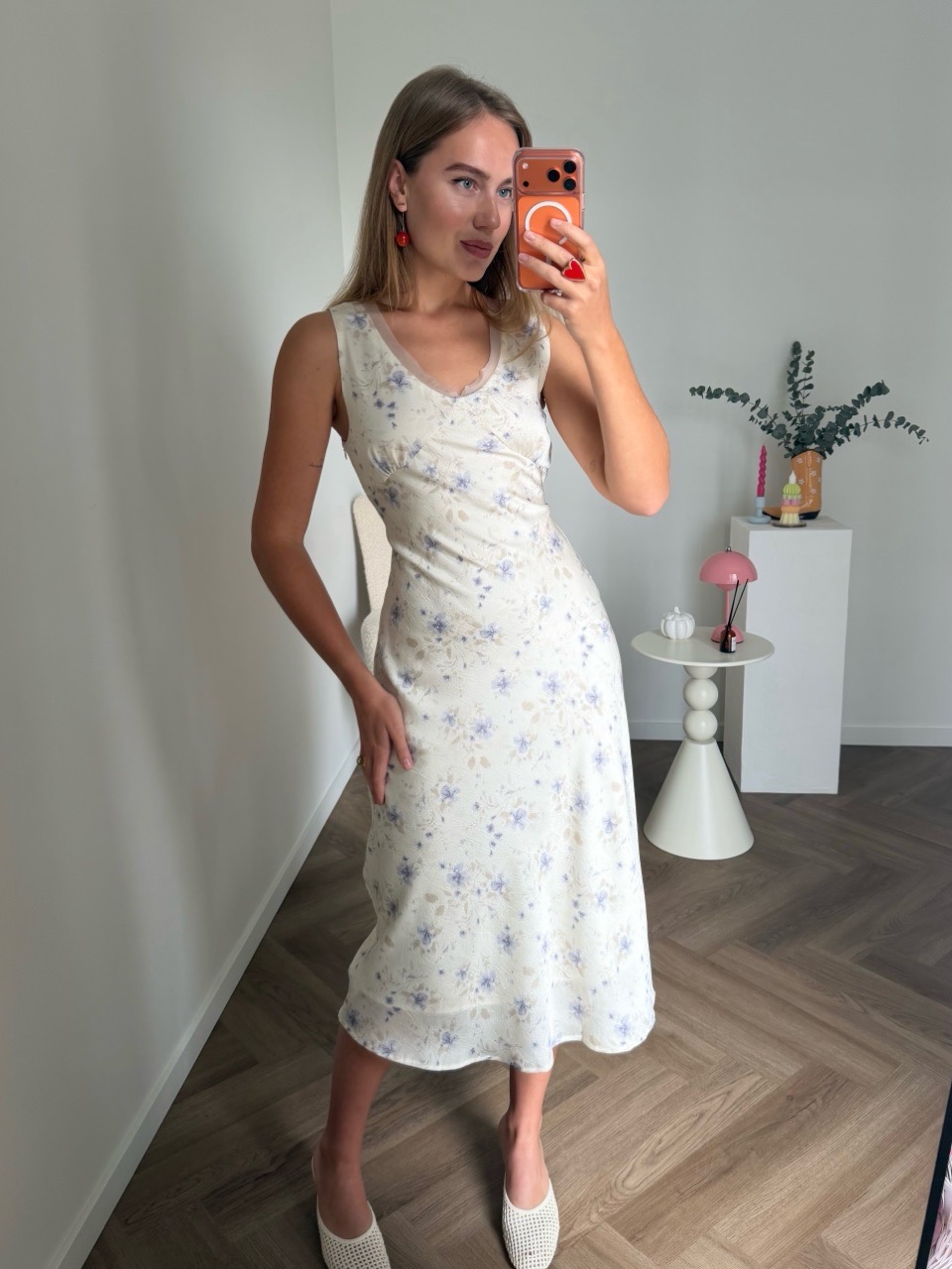Нежное платье в молочном цвете с лавандовым цветочным принтом — идеальный выбор для тёплых дней и романтических вечеров. Мягкая лёгкая ткань с едва уловимым сатиновым блеском красиво ложится по фигуре, а приталенный лиф с аккуратными вытачками подчёркивает талию и обеспечивает женственный силуэт. Лёгкая трапециевидная юбка добавляет свободного движения и воздушности, а глубокий вырез придаёт образу изящества без лишней открытости.