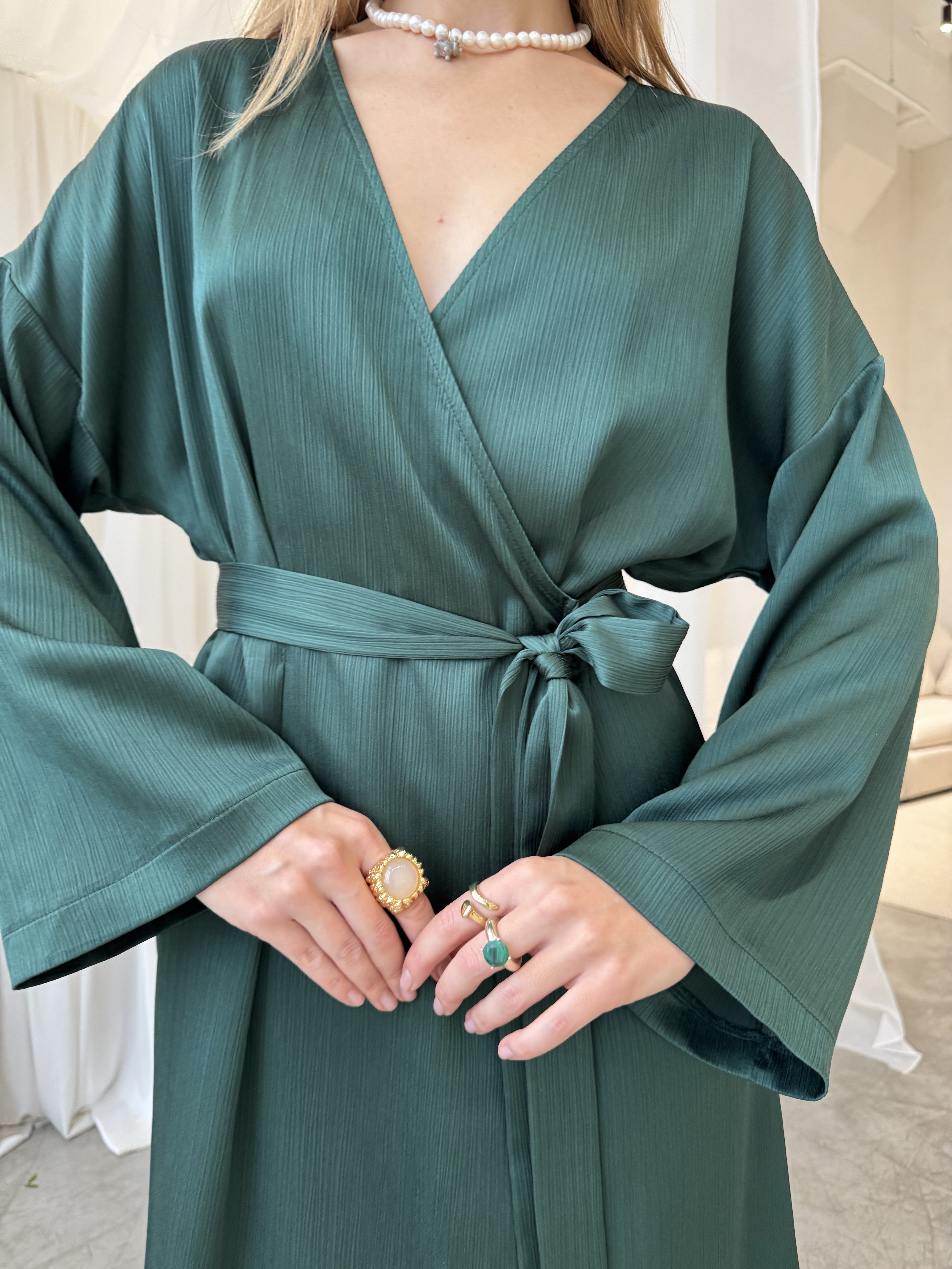 Кимоно платье — для эффектных выходов. Благородный цвет притягивает взгляды, а крой на запах мягко подчёркивает талию, создавая изящный, женственный силуэт.