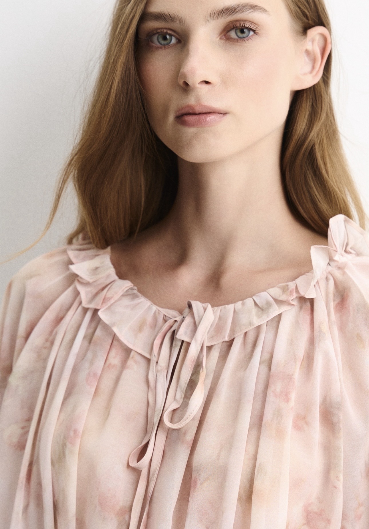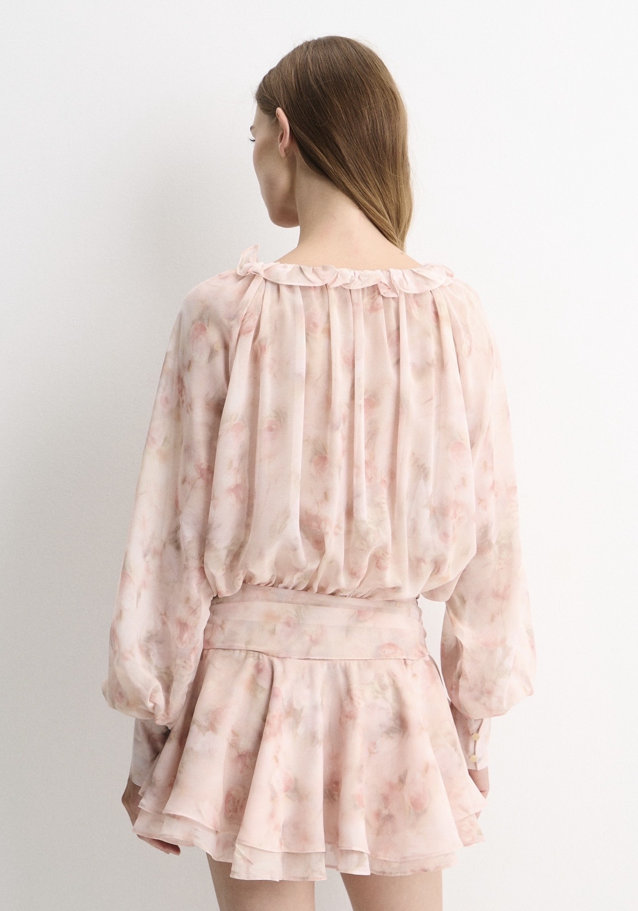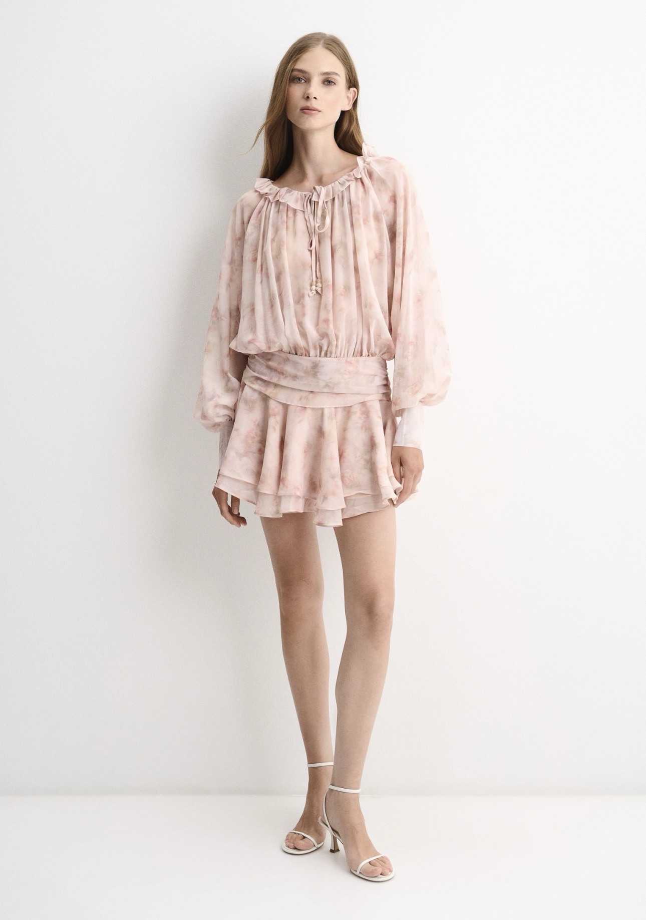Платье дополнено аккуратным V-образным вырезом и короткими рукавами с мягким объёмом. Нижняя часть оформлена лёгким воланом, который придаёт силуэту динамику и создаёт плавное движение ткани при ходьбе.