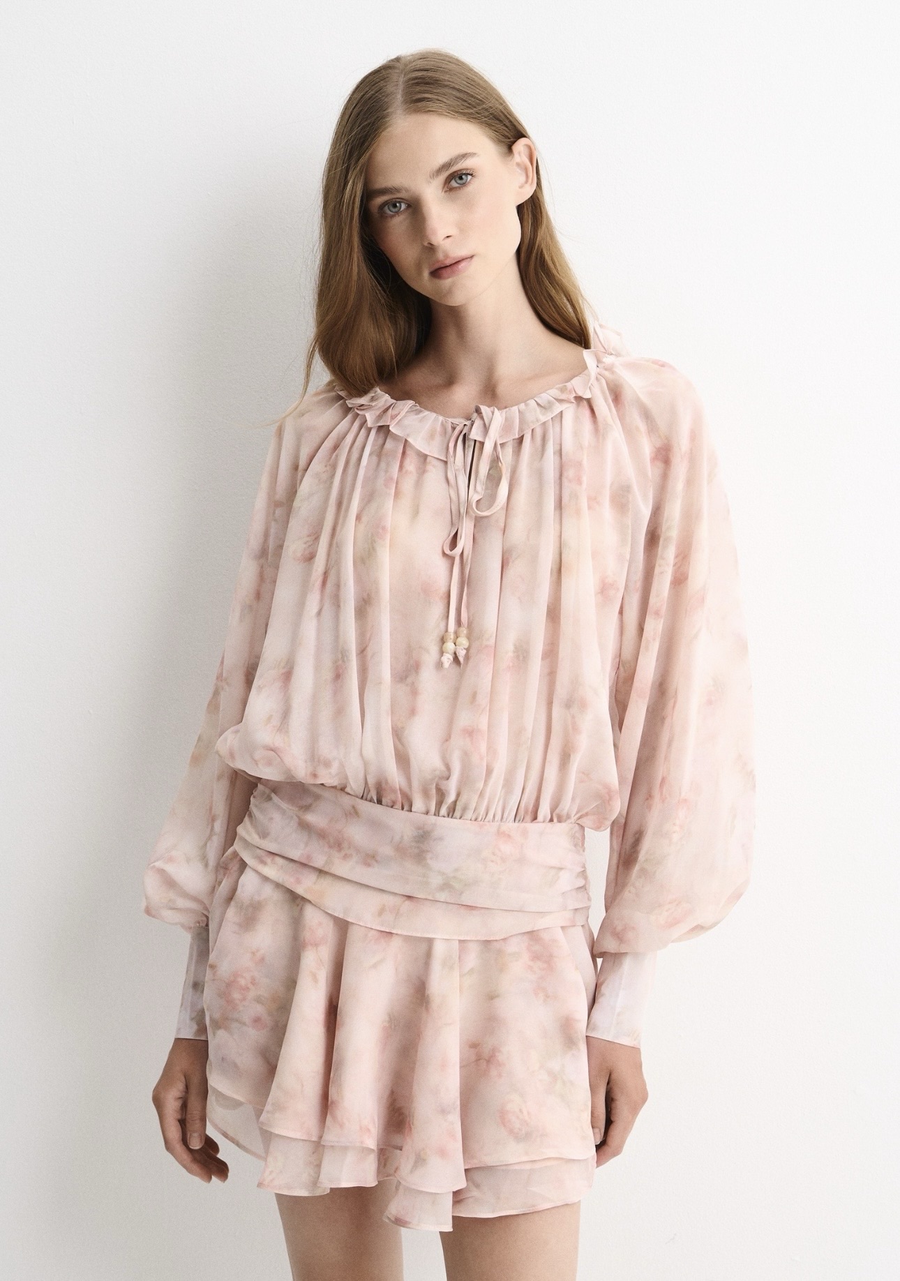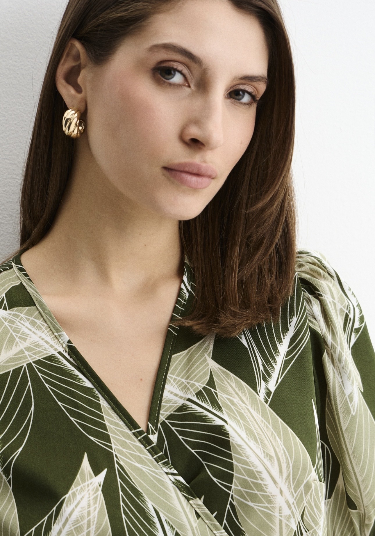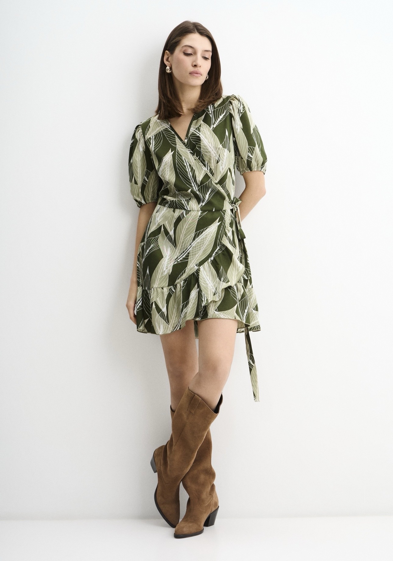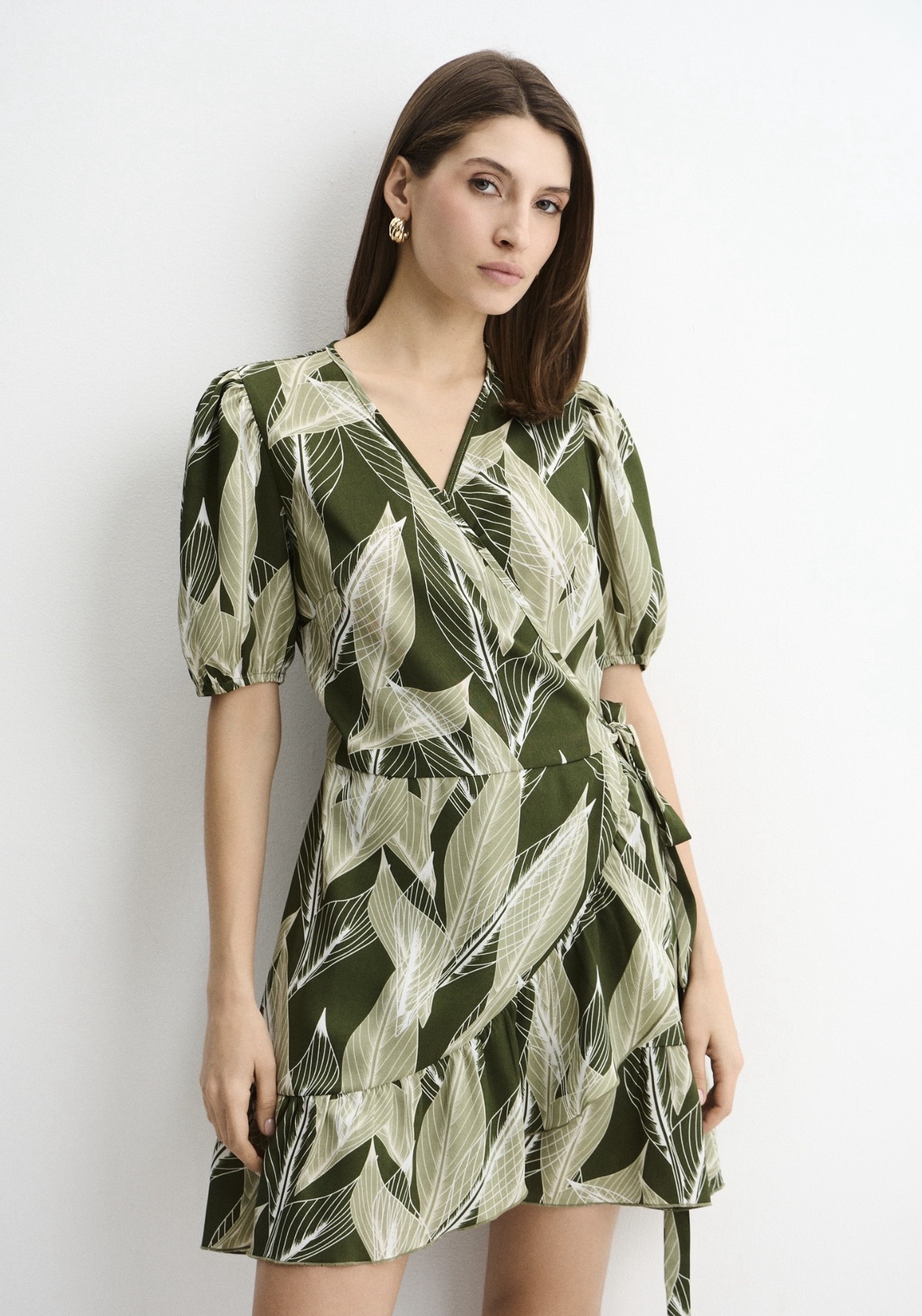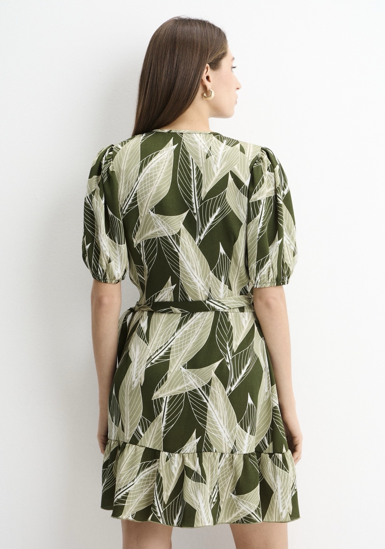 Лёгкое платье мини из струящейся ткани с выразительным растительным принтом в оттенках зелёного и молочного. Модель выполнена на запах, благодаря чему красиво подчёркивает линию талии и формирует женственный силуэт. Посадку можно регулировать с помощью пояса, который завязывается сбоку.