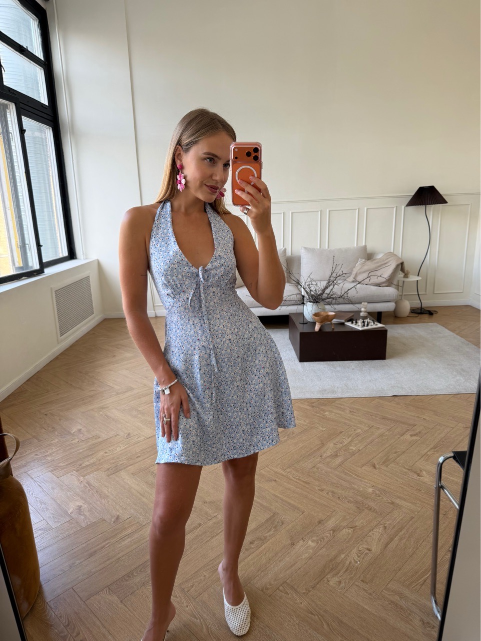 Отрезная линия талии формирует женственный силуэт, а слегка расклёшенная юбка свободно движется при ходьбе. Ткань тонкая и струящаяся, с мелким деликатным принтом, благодаря чему платье выглядит лёгким и непринуждённым. Подходит для повседневных летних образов, прогулок, отдыха и неформальных встреч