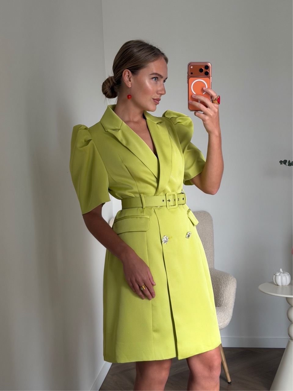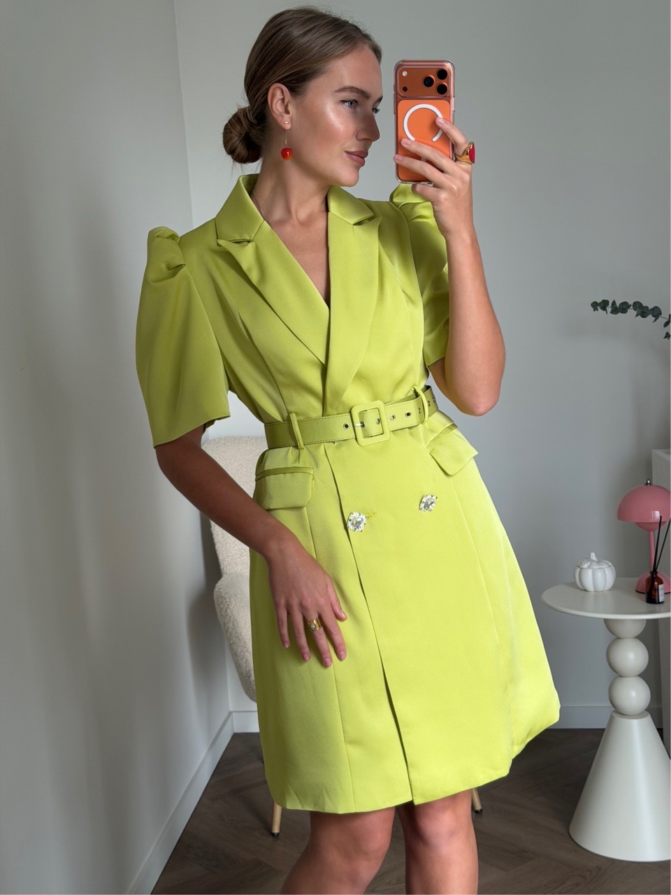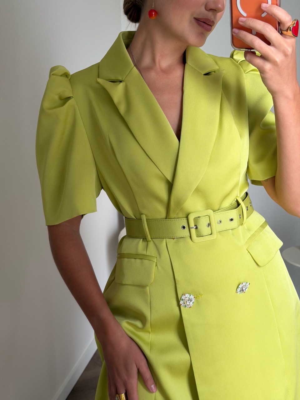 Платье-пиджак приталенного силуэта с акцентной линией плеч, широкими лацканами и поясом в комплекте. Модель сочетает строгость классического жакета и женственность мини-длины, подчёркивая фигуру и линию талии.