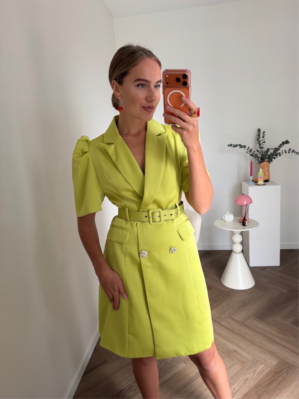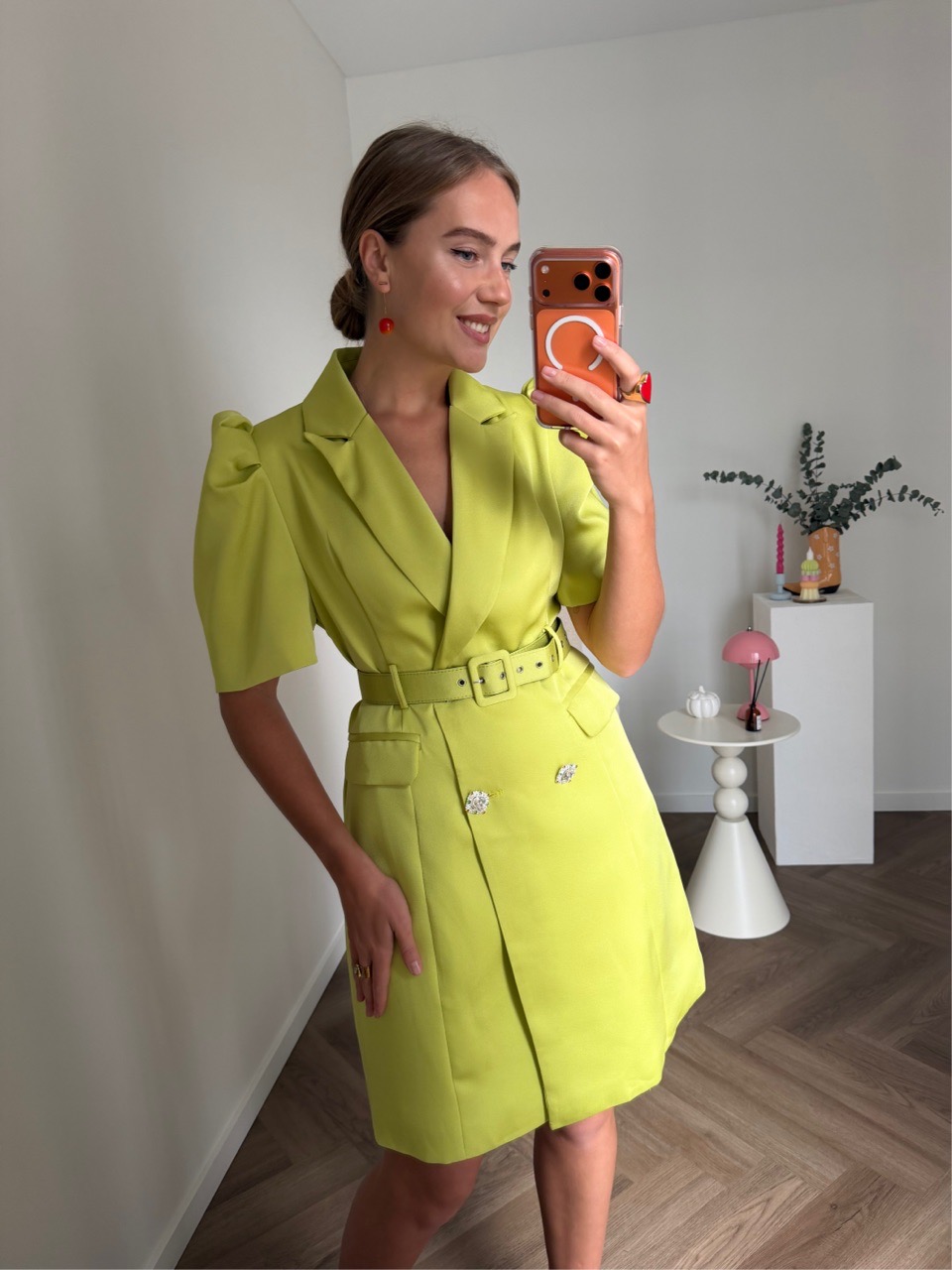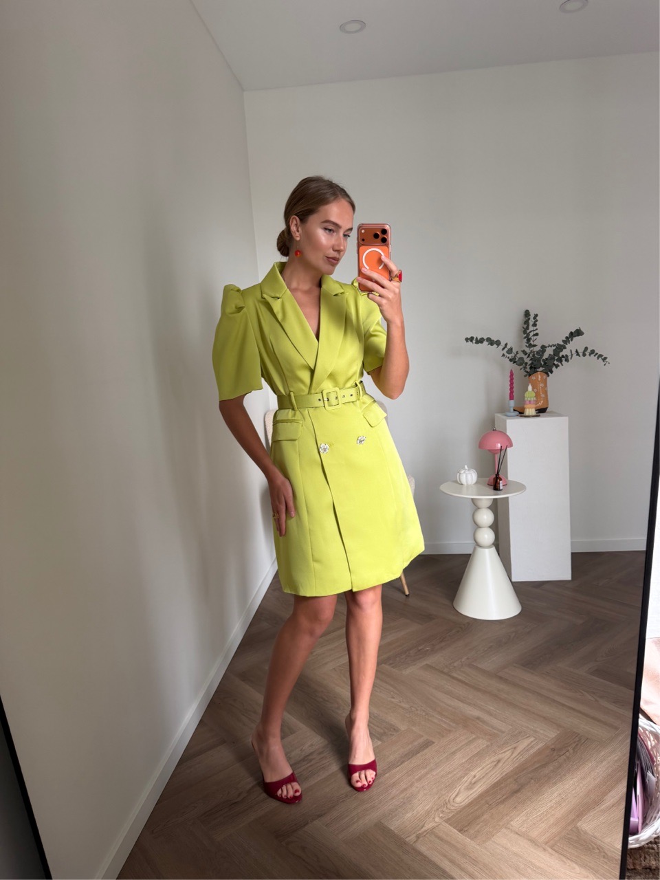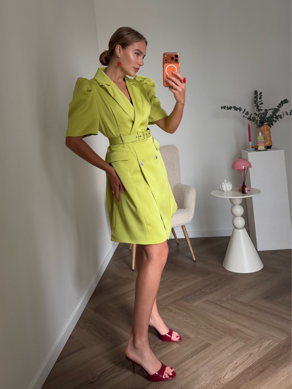 Платье-пиджак приталенного силуэта с акцентной линией плеч, широкими лацканами и поясом в комплекте. Модель сочетает строгость классического жакета и женственность мини-длины, подчёркивая фигуру и линию талии.