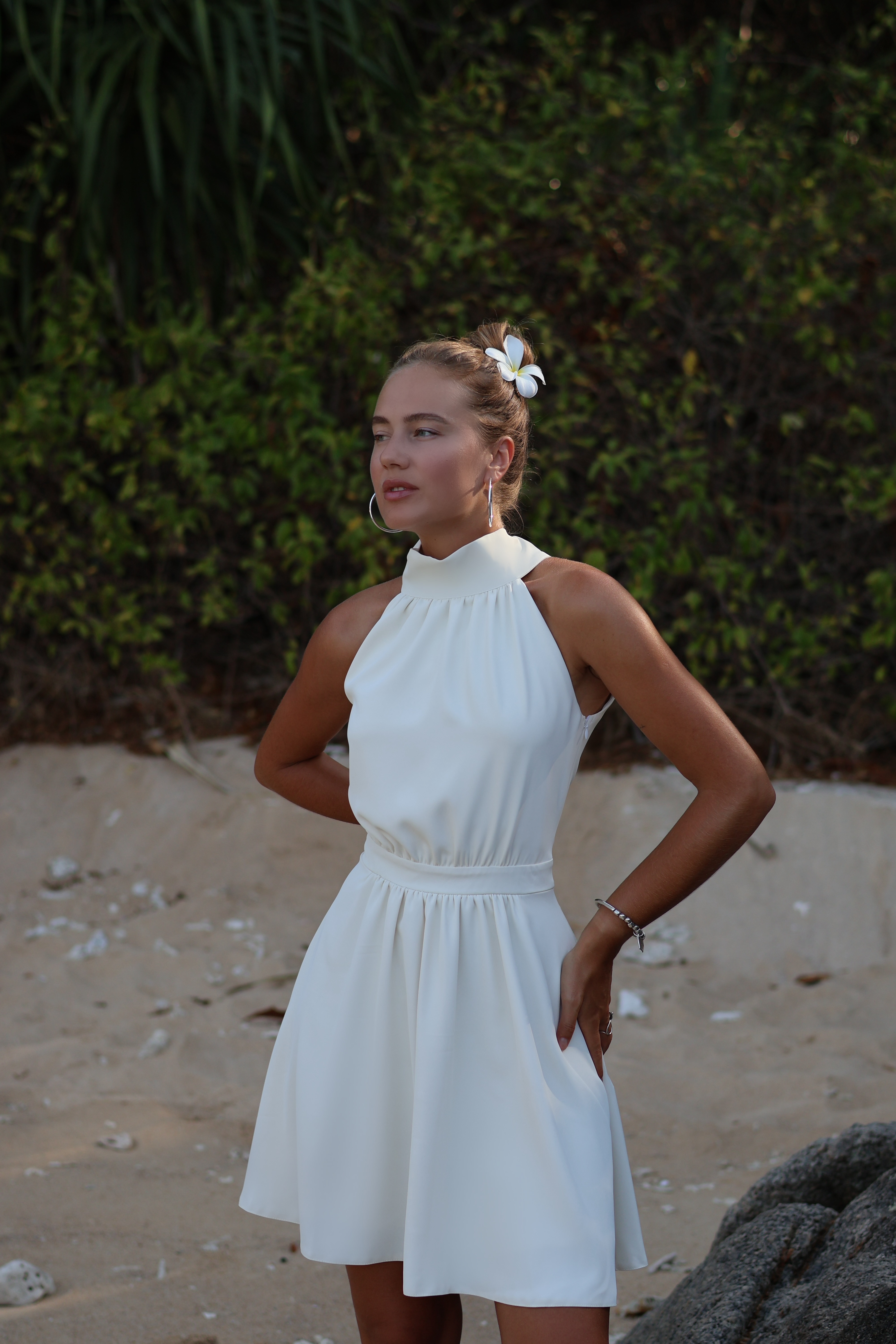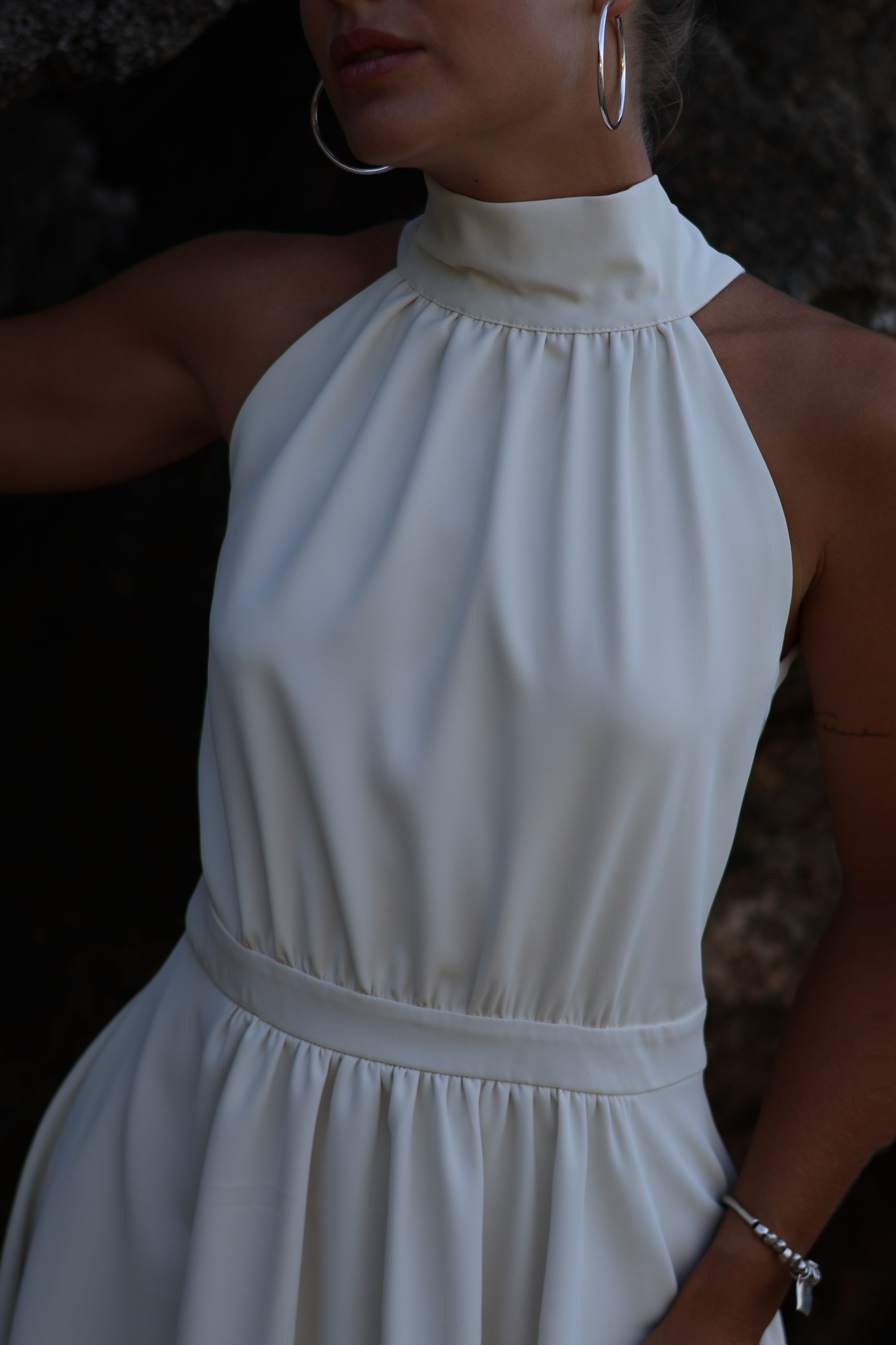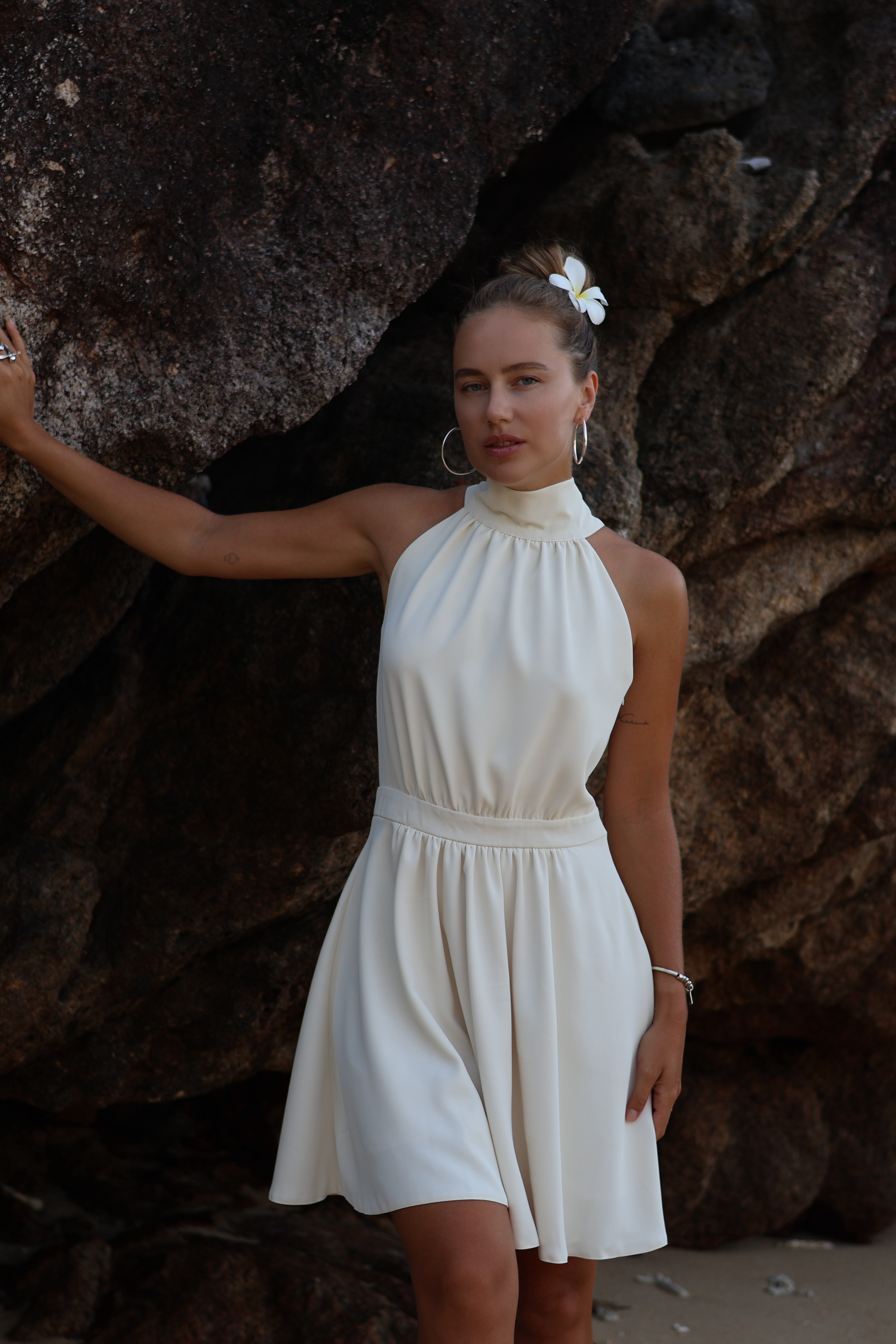 Платье мини из лёгкой струящейся ткани молочного оттенка с лаконичным и женственным силуэтом. Модель выполнена с высоким воротником-стойкой и открытой линией плеч, что визуально вытягивает силуэт и подчёркивает шею. Верх мягко драпируется, создавая аккуратные складки, а линия талии слегка присборена, формируя воздушную расклёшенную юбку.
