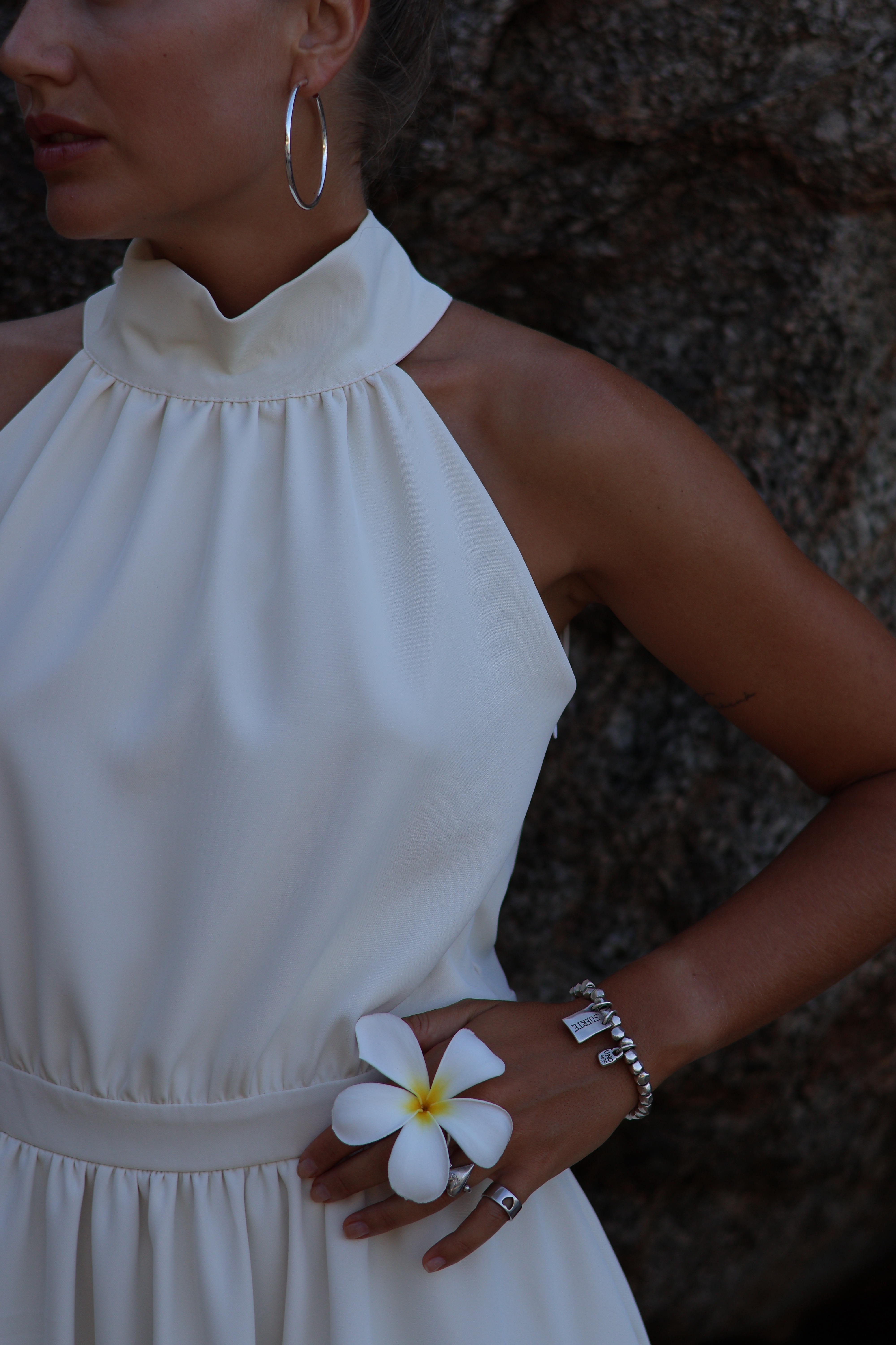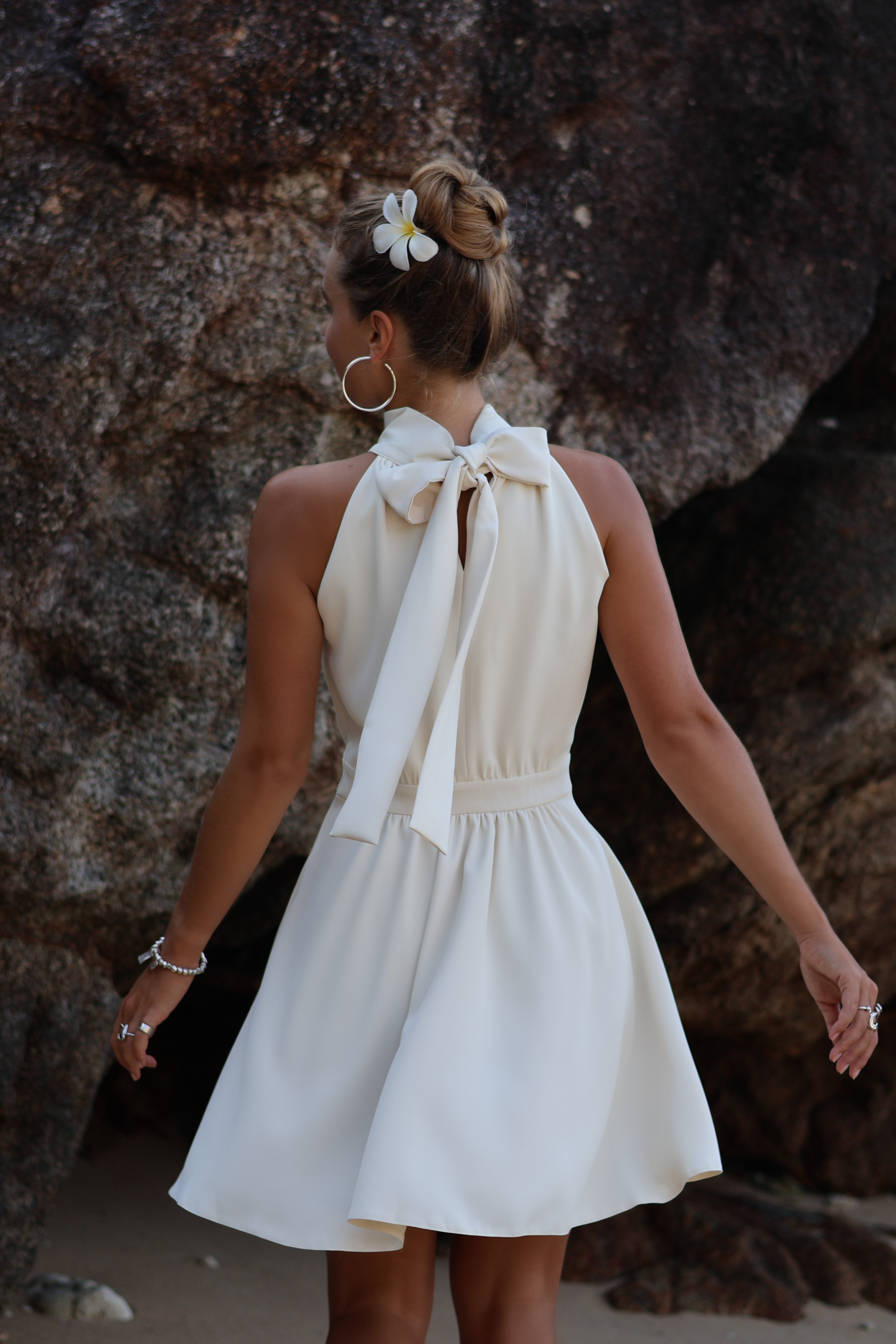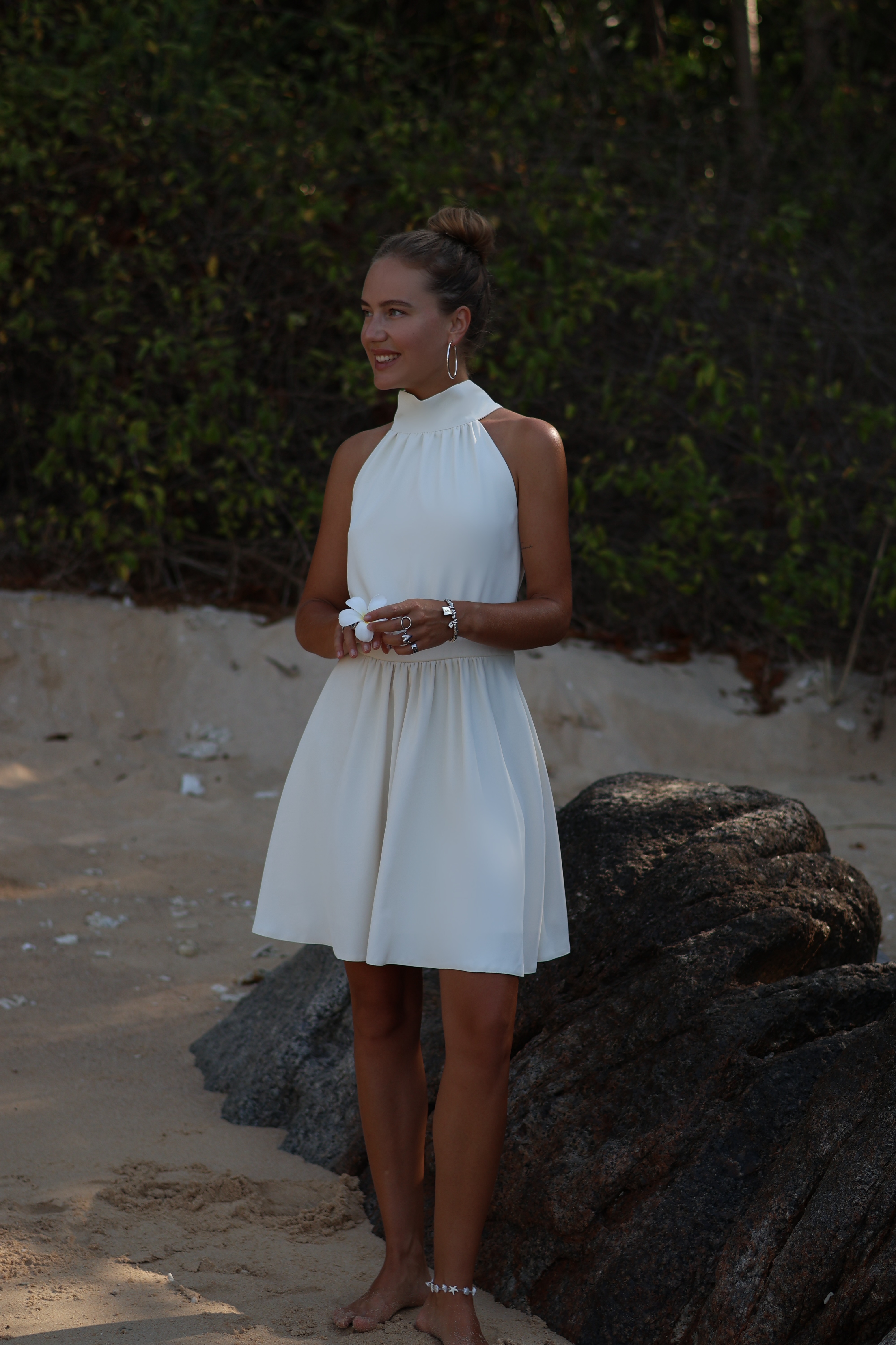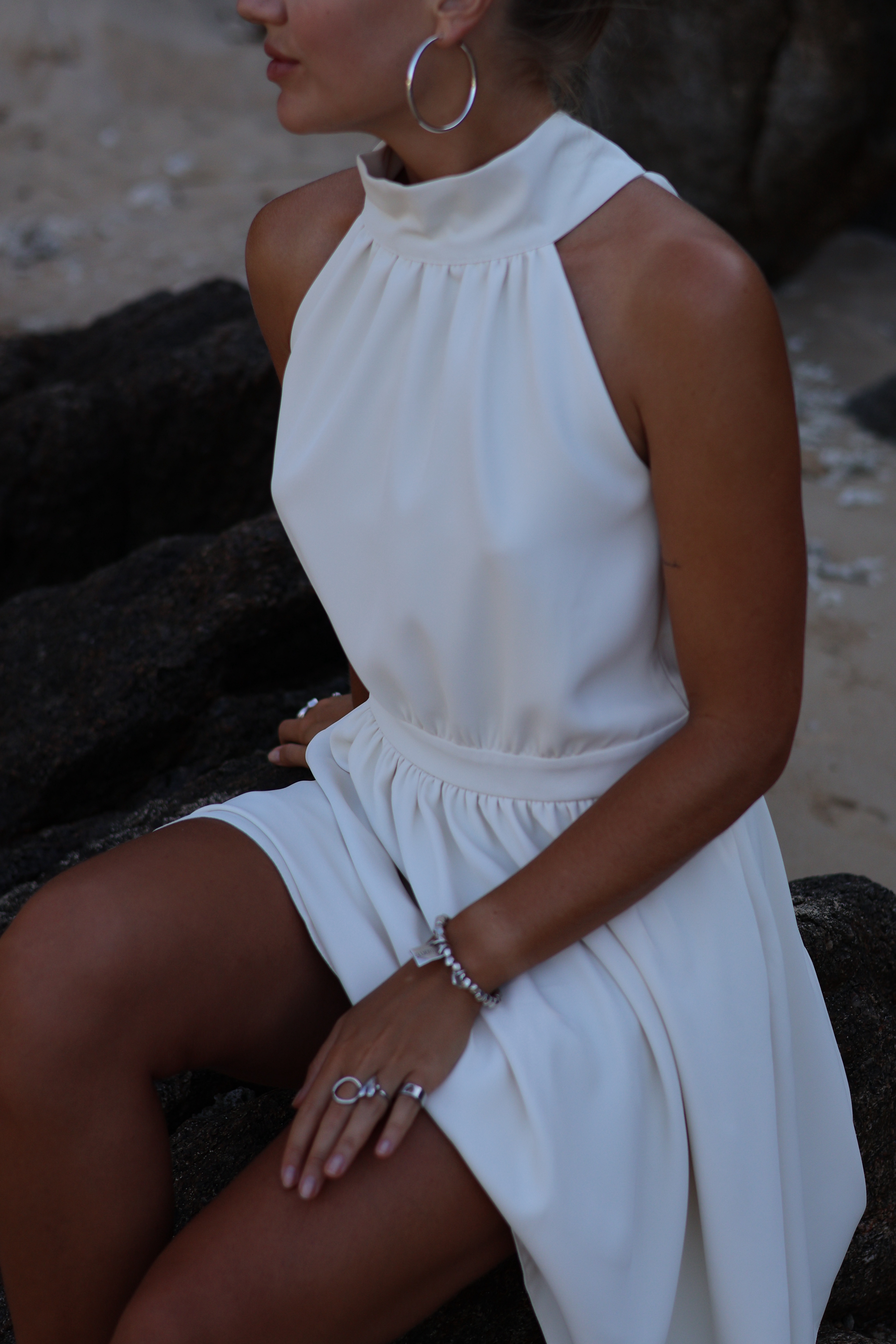Платье мини из лёгкой струящейся ткани молочного оттенка с лаконичным и женственным силуэтом. Модель выполнена с высоким воротником-стойкой и открытой линией плеч, что визуально вытягивает силуэт и подчёркивает шею. Верх мягко драпируется, создавая аккуратные складки, а линия талии слегка присборена, формируя воздушную расклёшенную юбку.