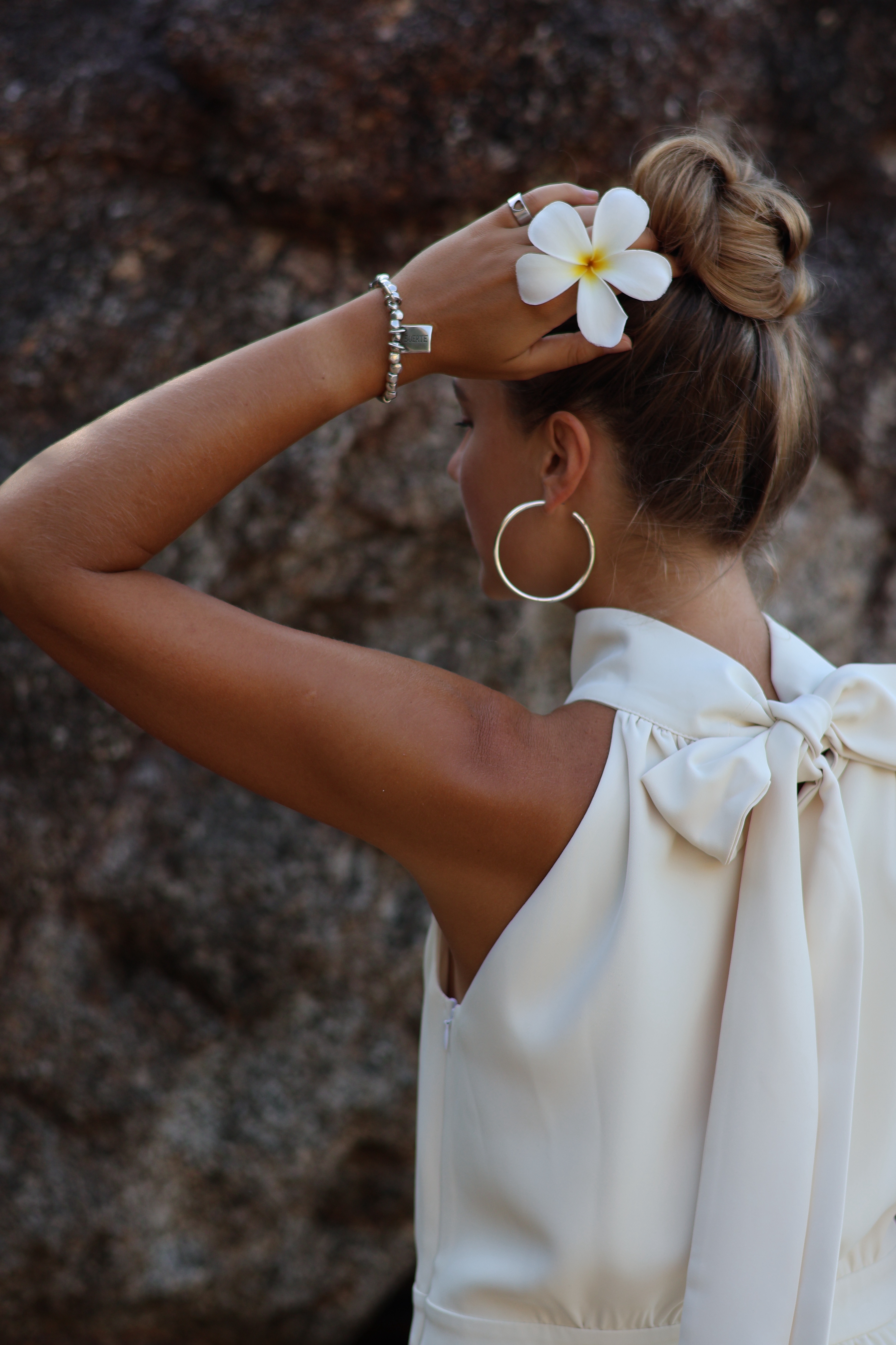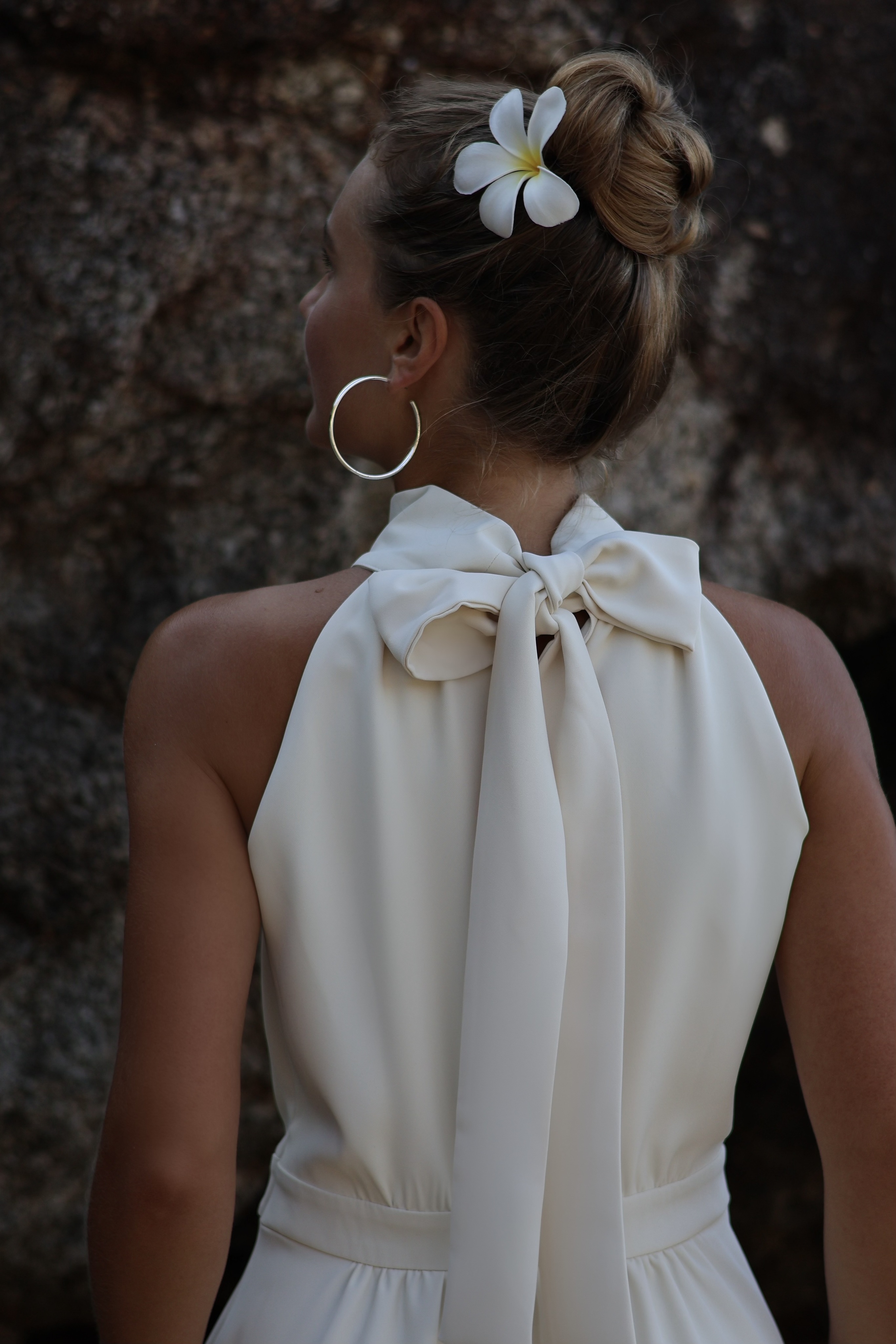 Главный акцент — декоративный бант на спине с длинными лентами и небольшим вырезом под воротником, добавляющий образу лёгкость и романтичность. Платье свободно движется при ходьбе, создавая эффект невесомости и естественной динамики.
