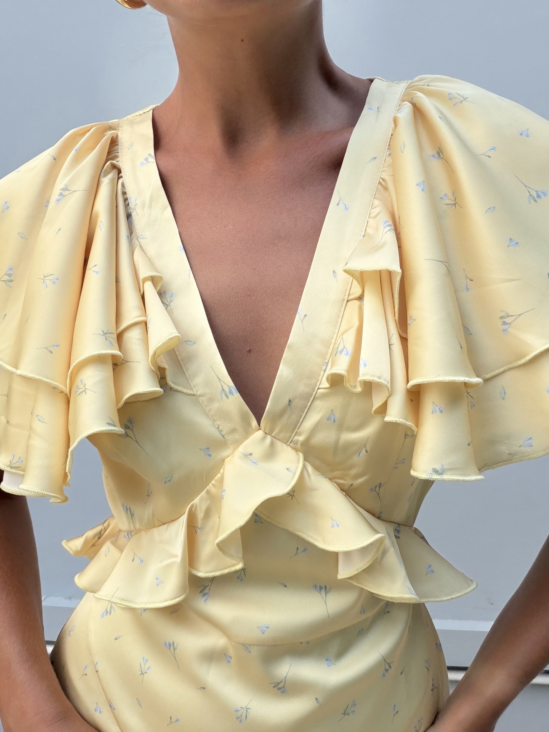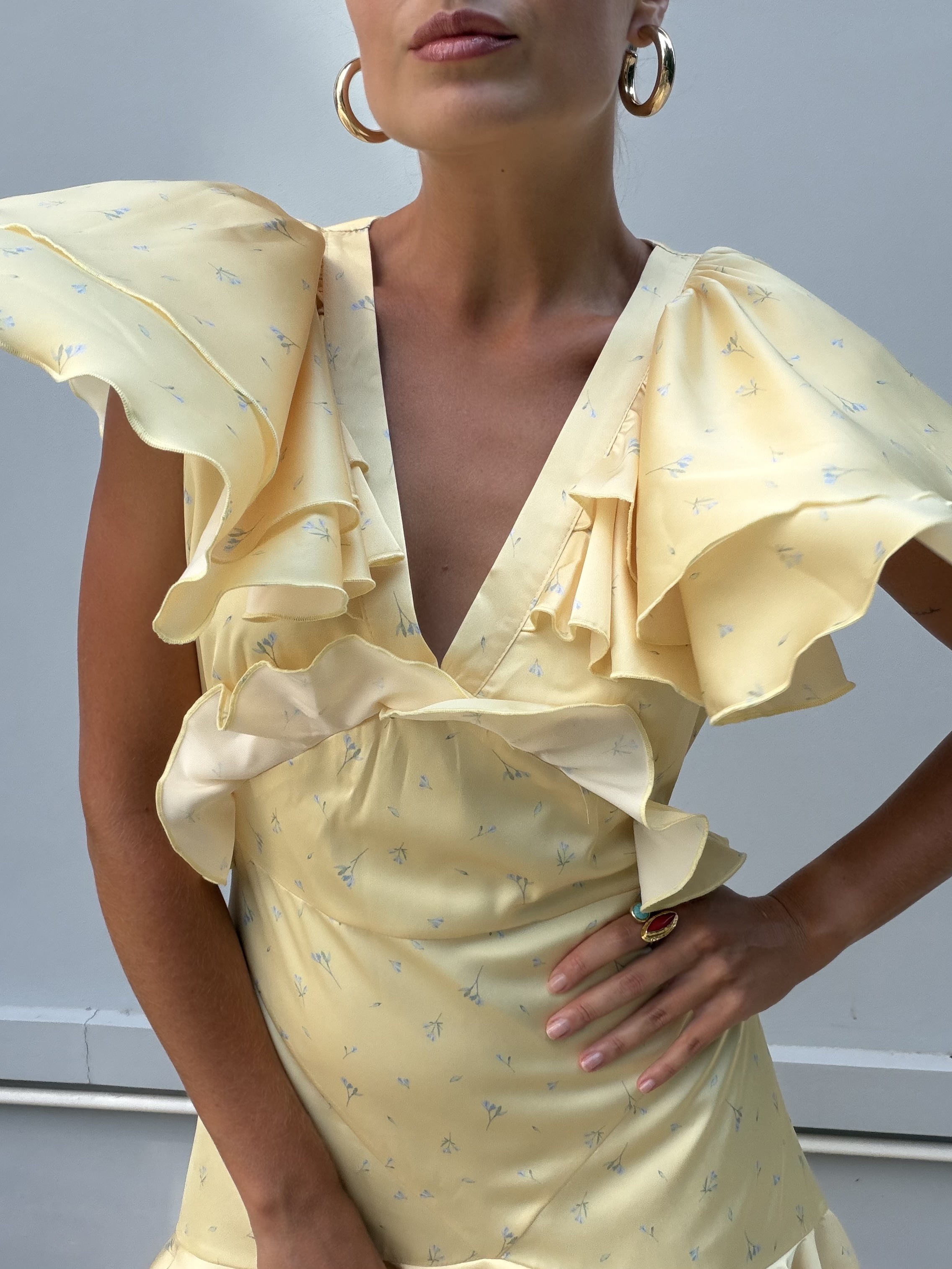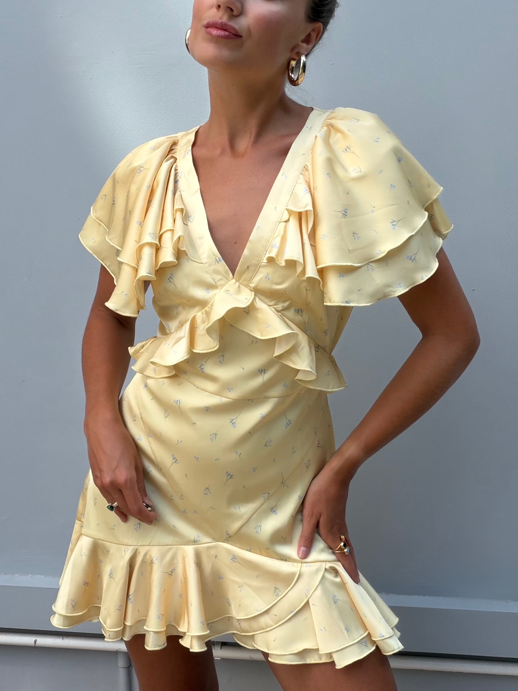 Очаровательное мини-платье в лимонном цвете с нежными голубыми цветочками - это воплощение игривого шика и женственности. Его притягательный образ создают нежные рюши, которые добавляют платью динамики и объема: они могут украшать лиф или рукава, делая каждый жест воздушным и кокетливым.