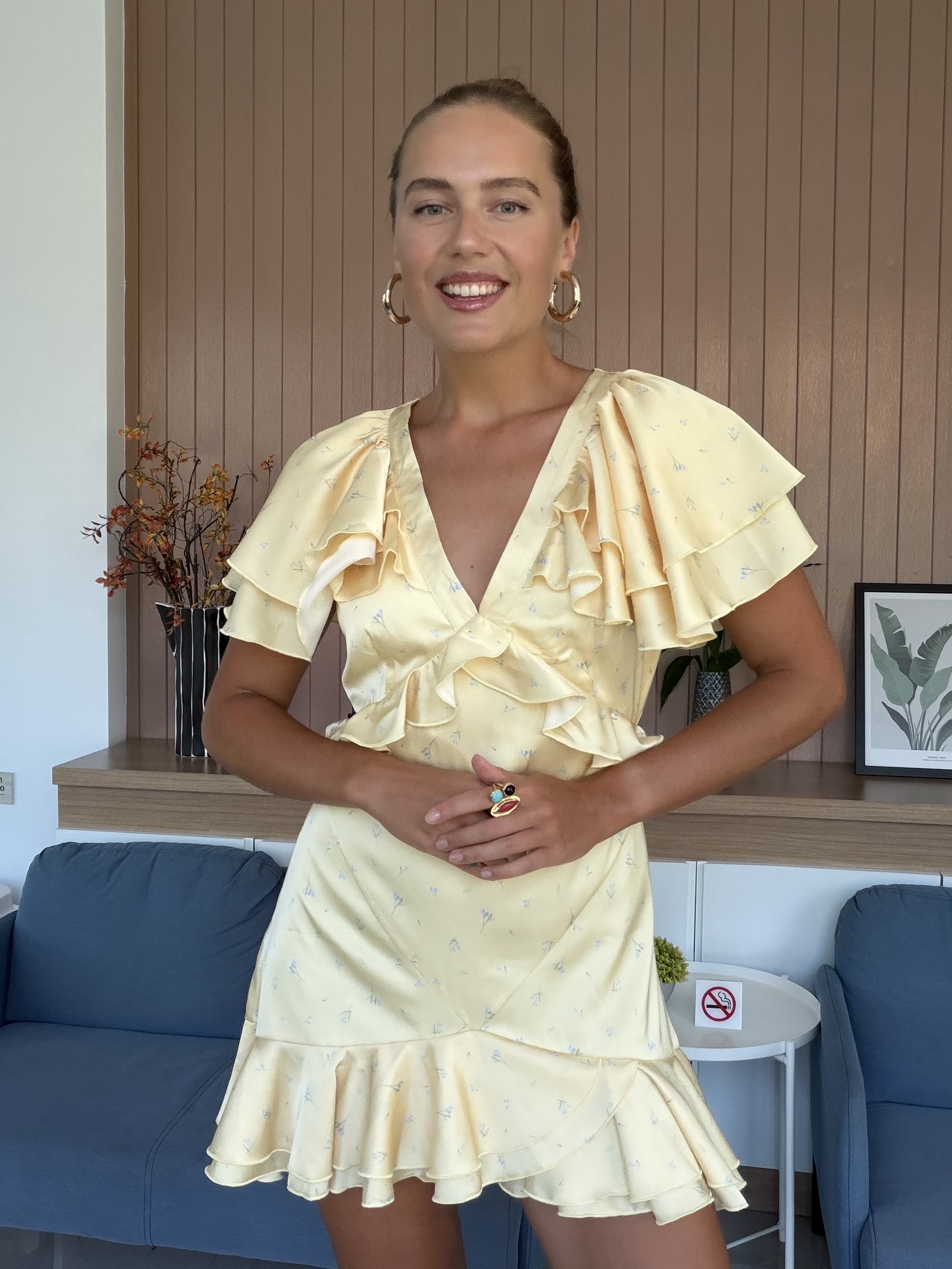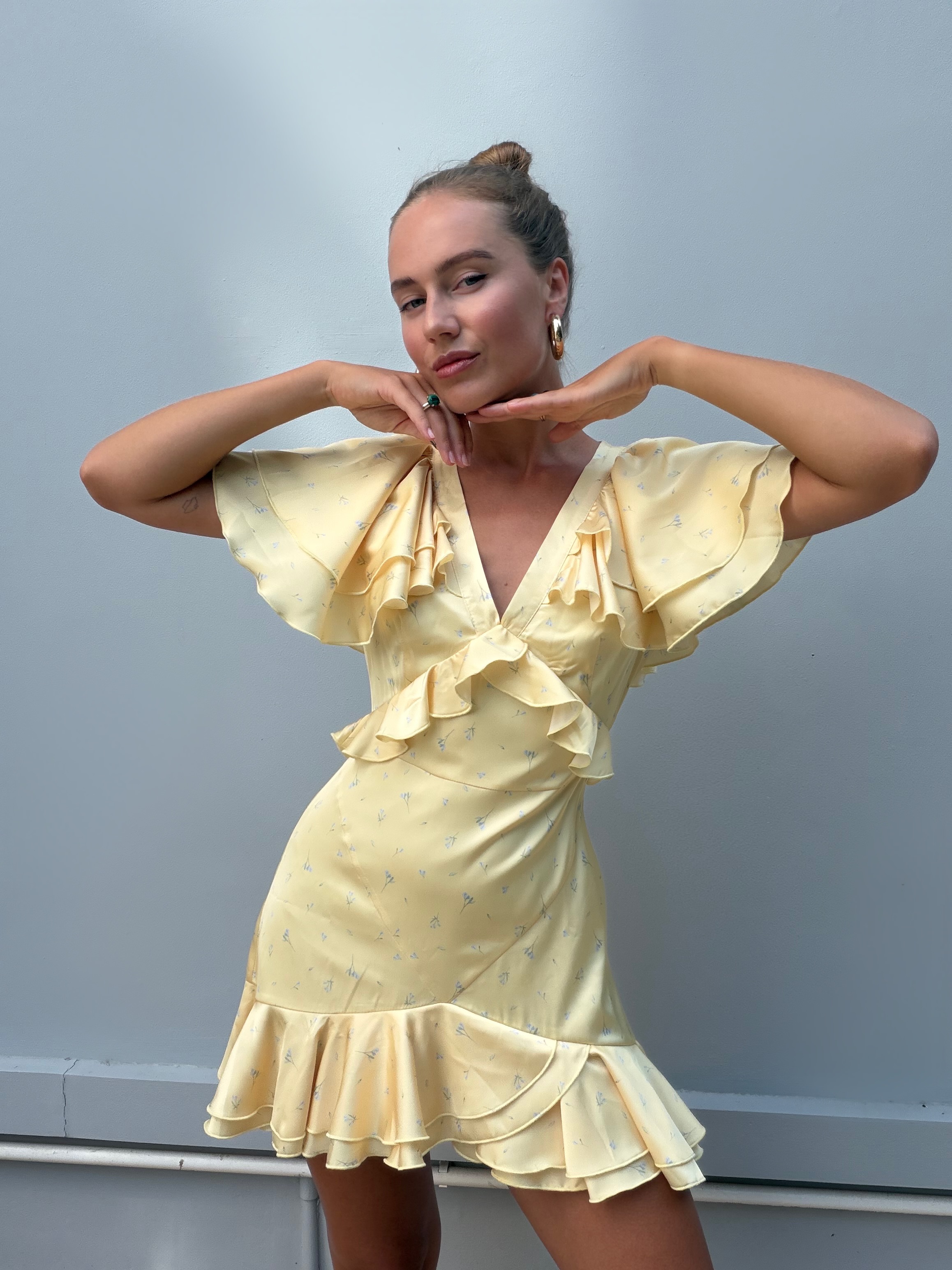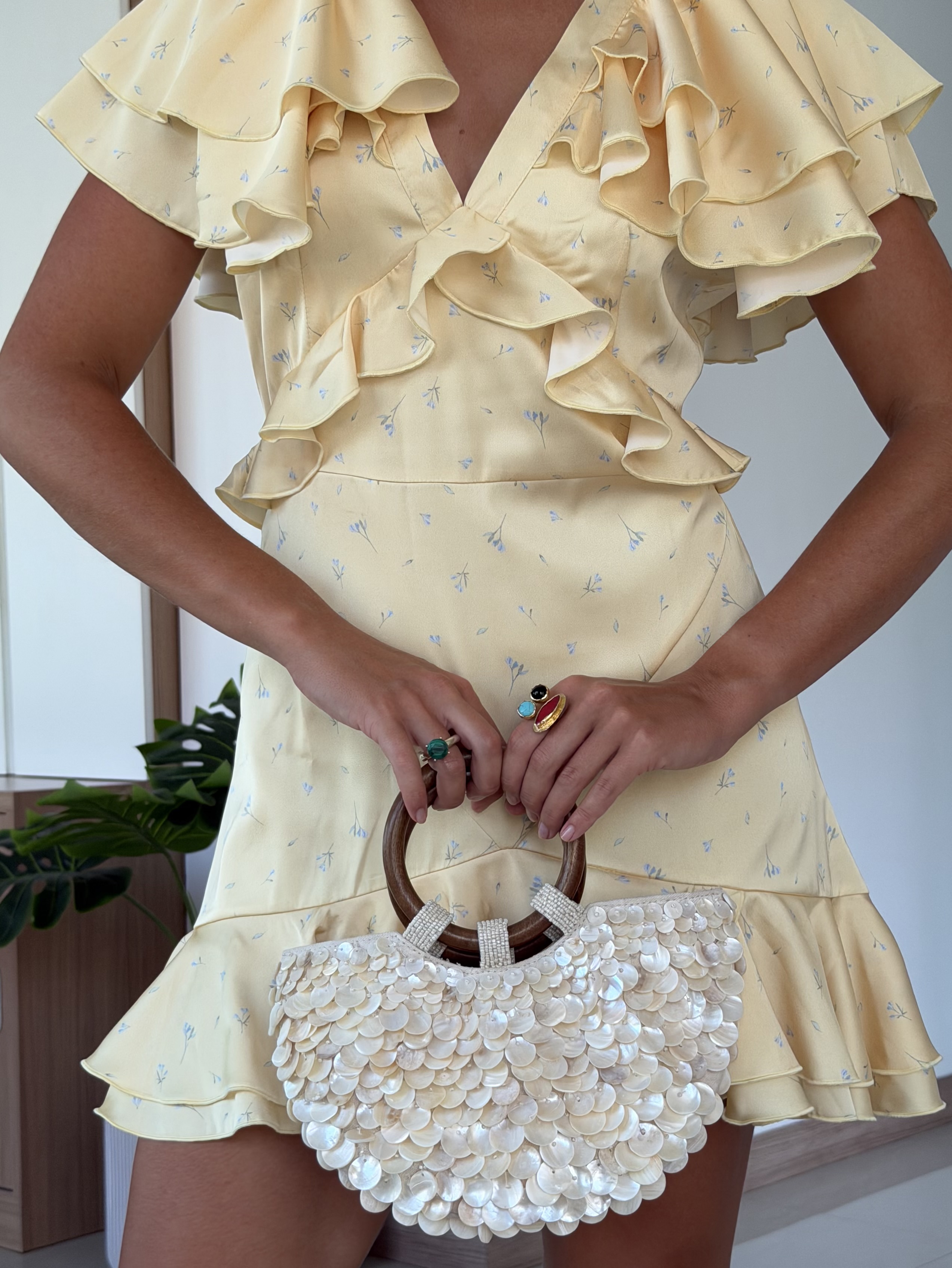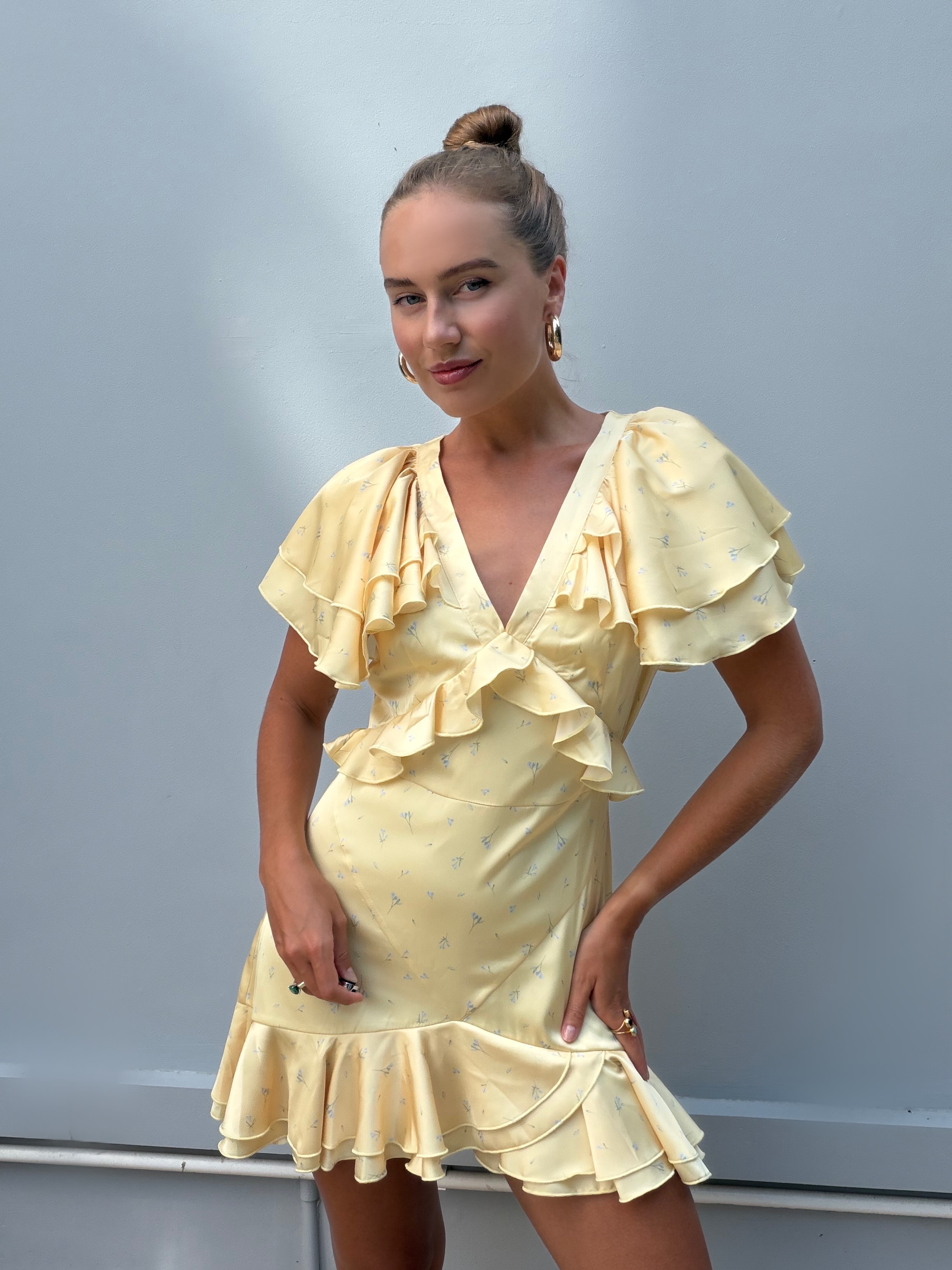Очаровательное мини-платье в лимонном цвете с нежными голубыми цветочками - это воплощение игривого шика и женственности. Его притягательный образ создают нежные рюши, которые добавляют платью динамики и объема: они могут украшать лиф или рукава, делая каждый жест воздушным и кокетливым.
