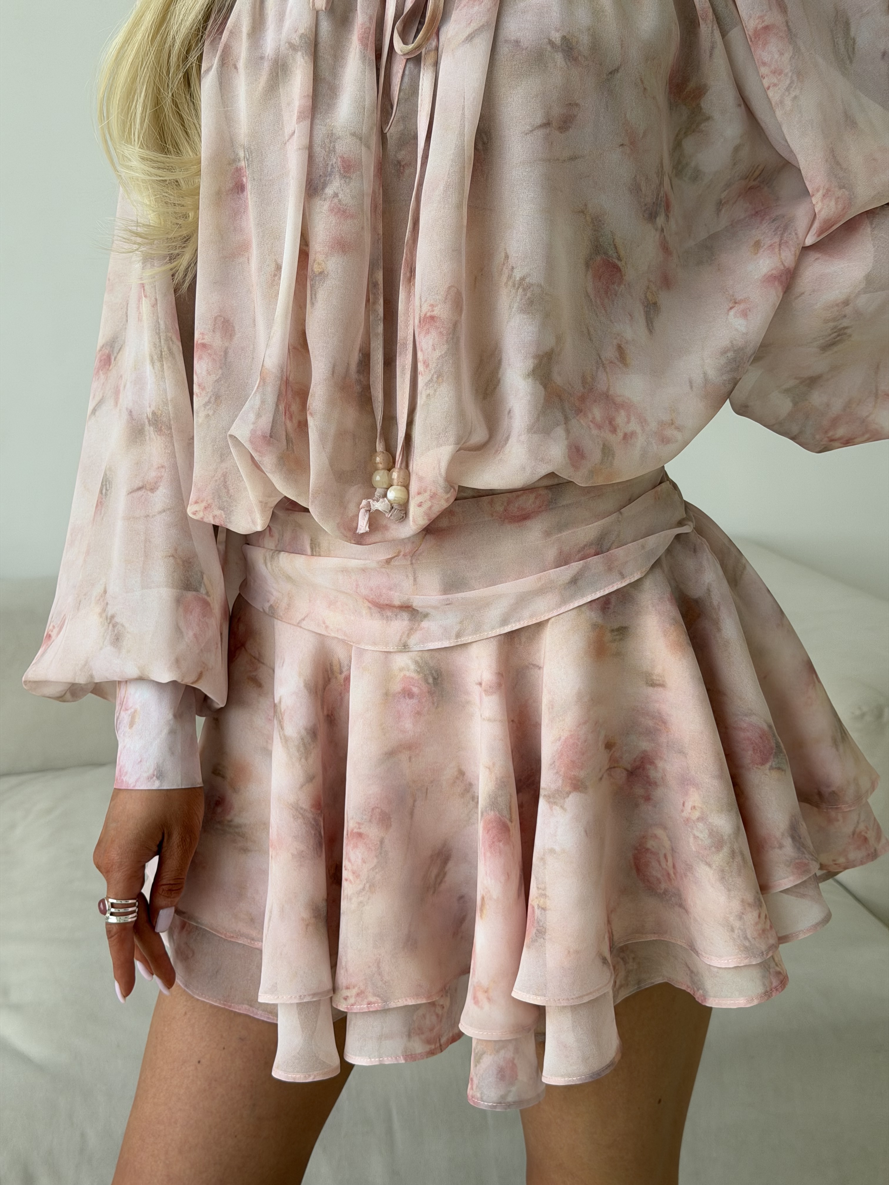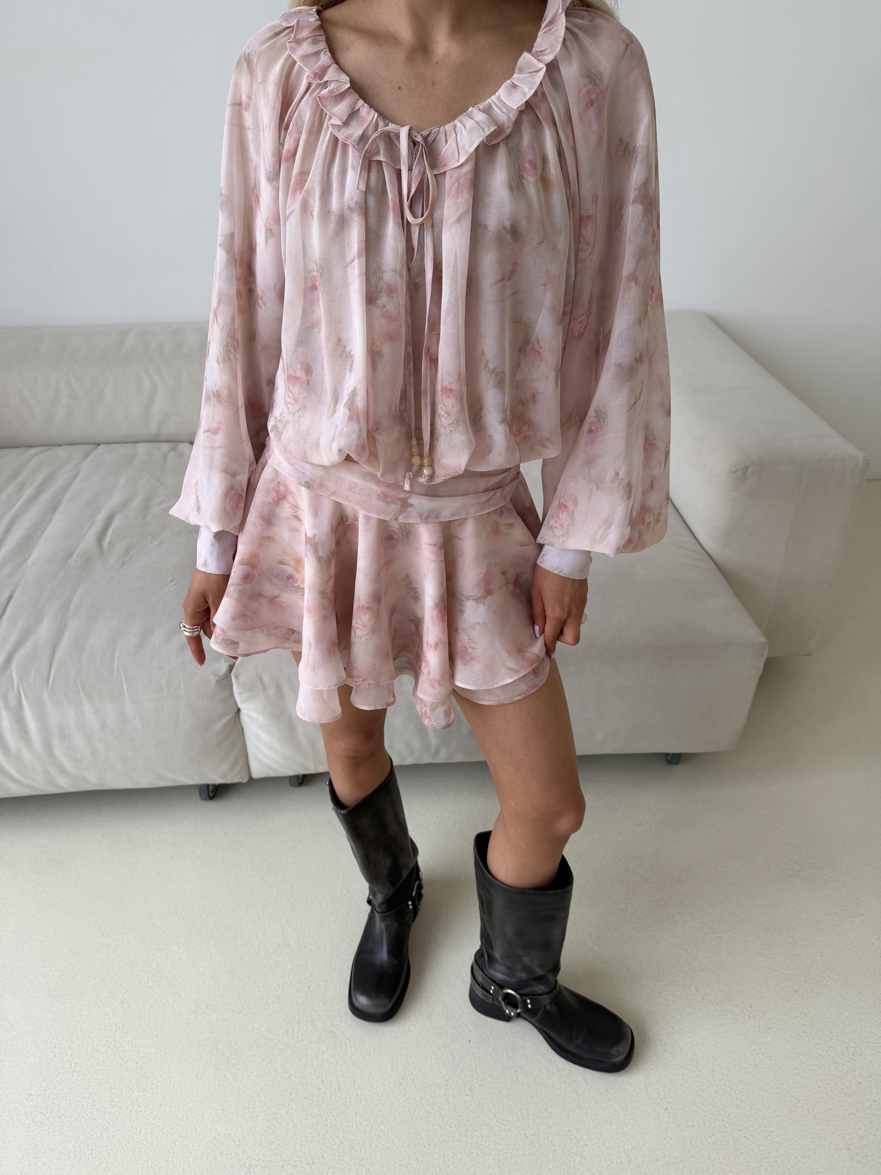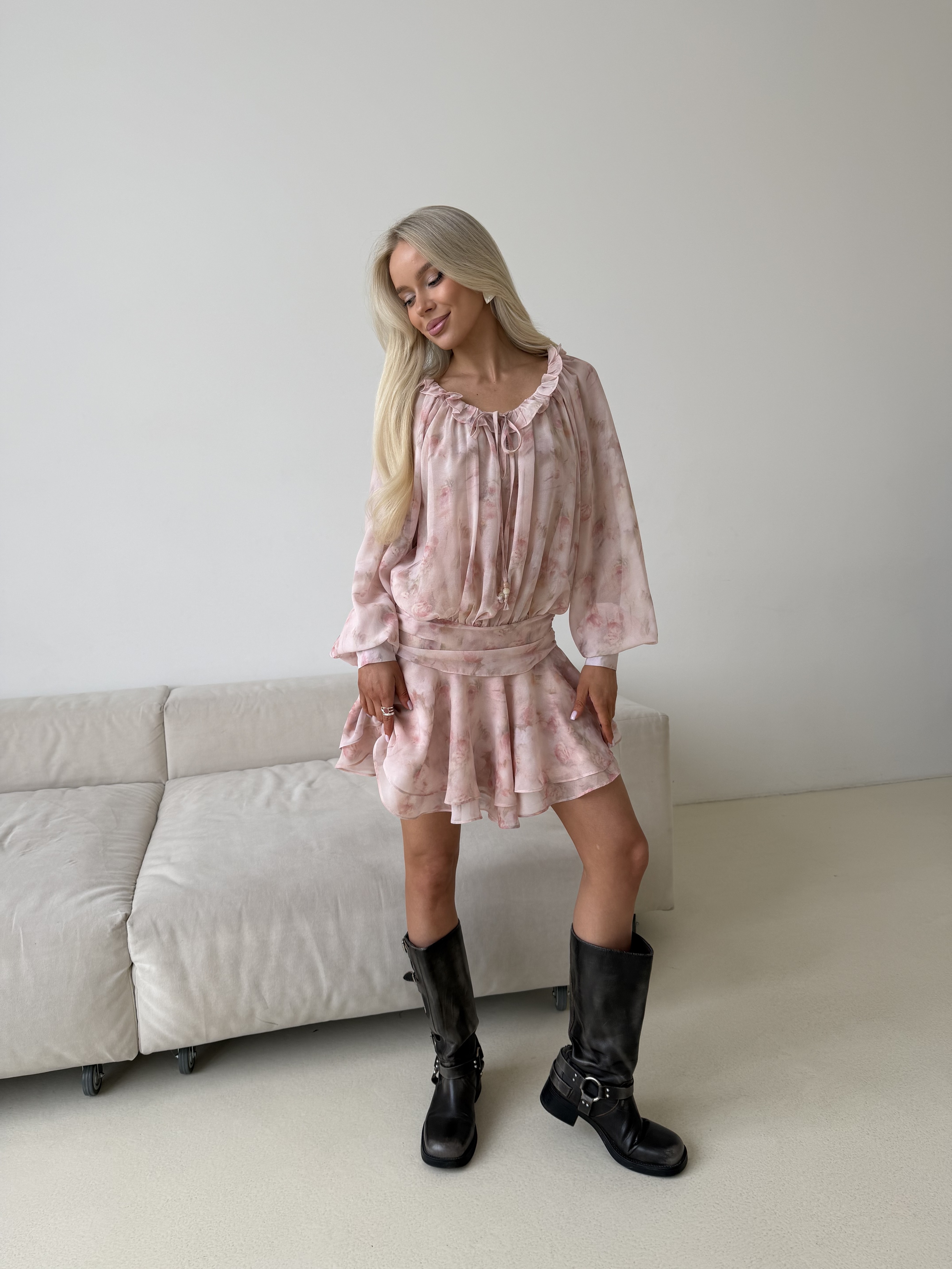 Очаровательное мини-платье в молочном цвете с розами - это воплощение игривого шика и женственности. Его притягательный образ создают нежные рюши, которые добавляют платью динамики и объема: они могут украшать лиф или рукава, делая каждый жест воздушным и кокетливым.