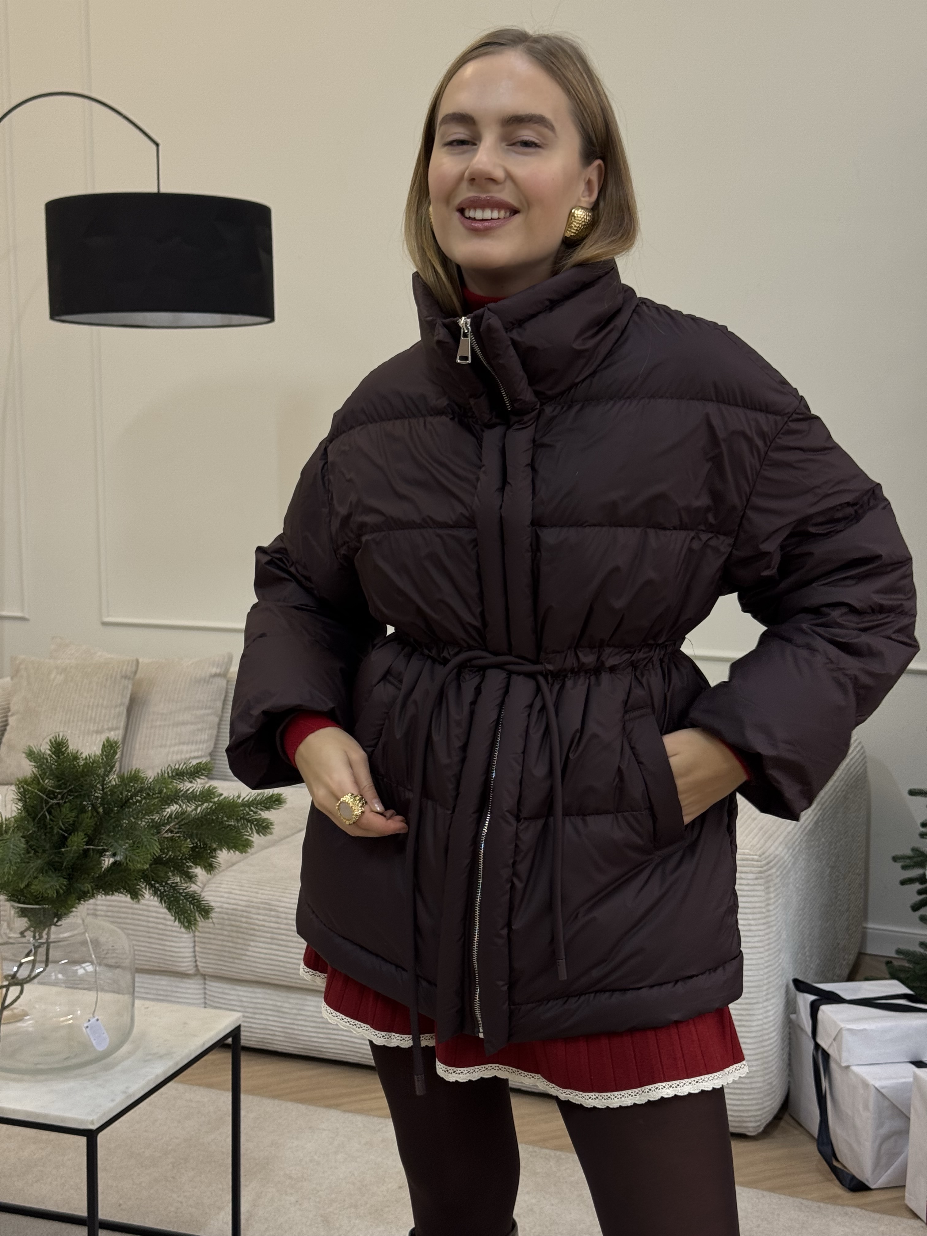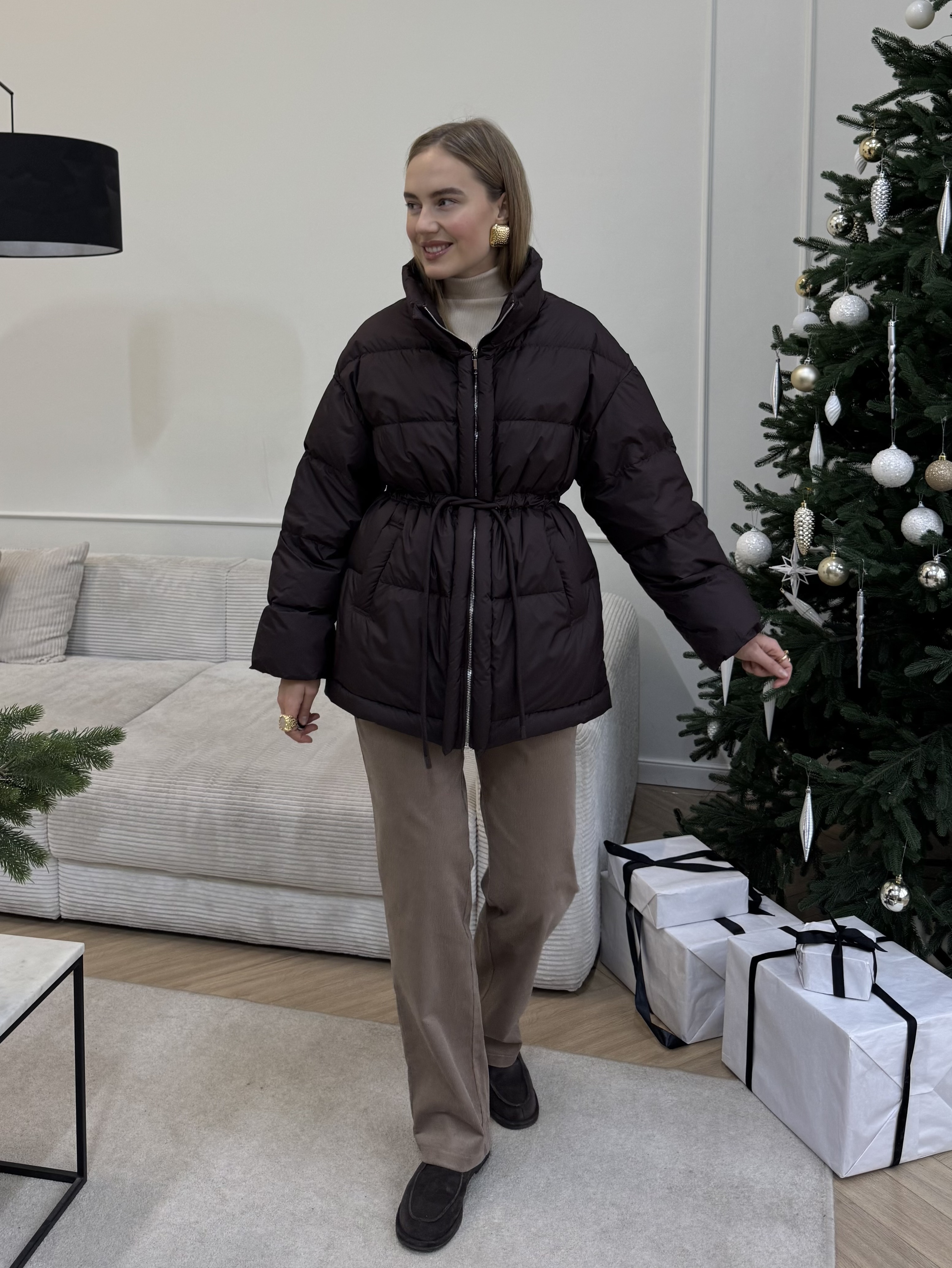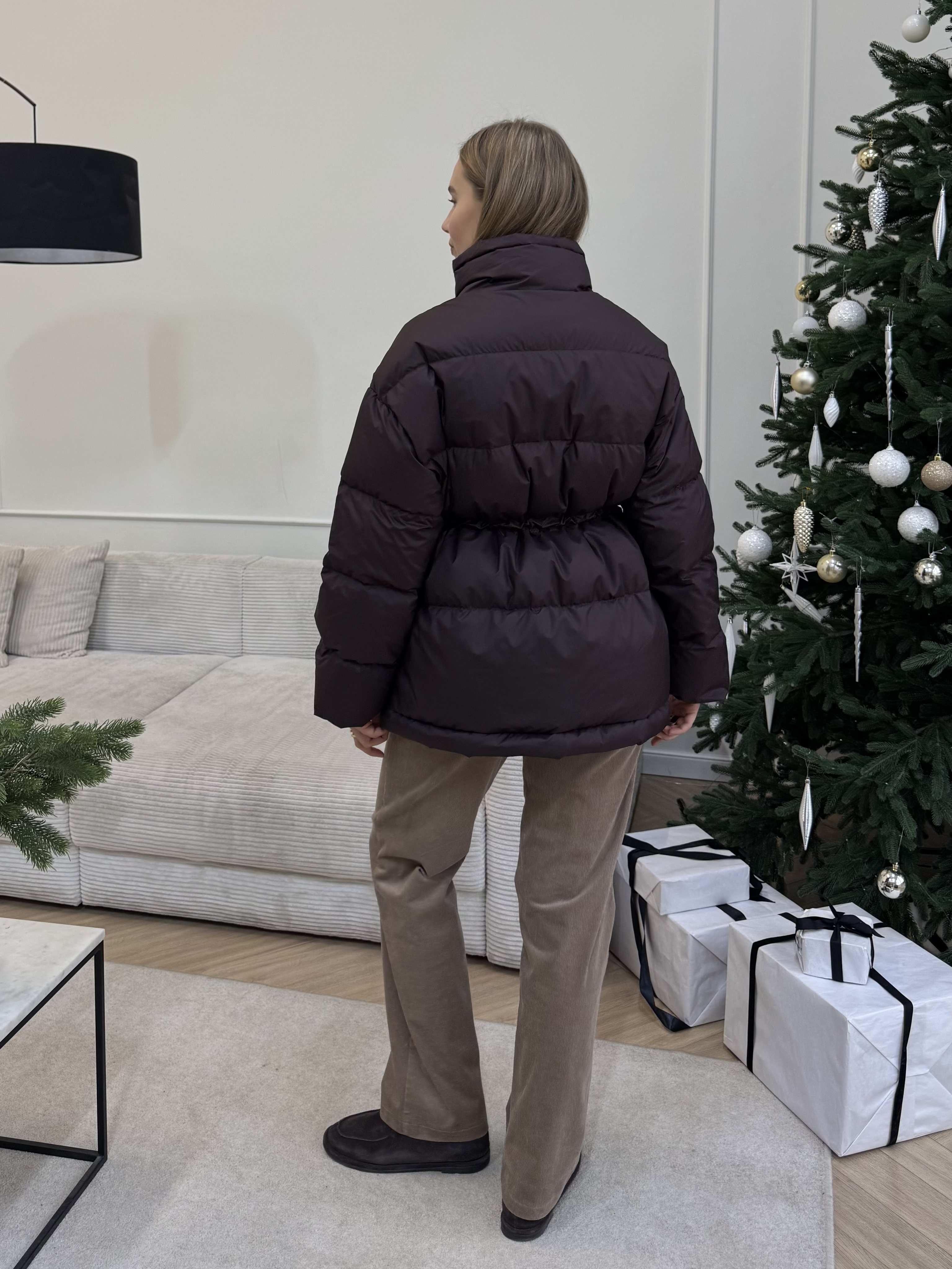 Пуховик с аккуратной стёжкой и мягким объёмом создаёт чистый, собранный силуэт без лишней массивности. За счёт утяжки по линии талии его можно носить как в прямом, так и более приталенном варианте. Ткань приятная на ощупь, матовая, хорошо защищает от ветра и удерживает тепло благодаря наполнителю из 100% гусиного пуха.