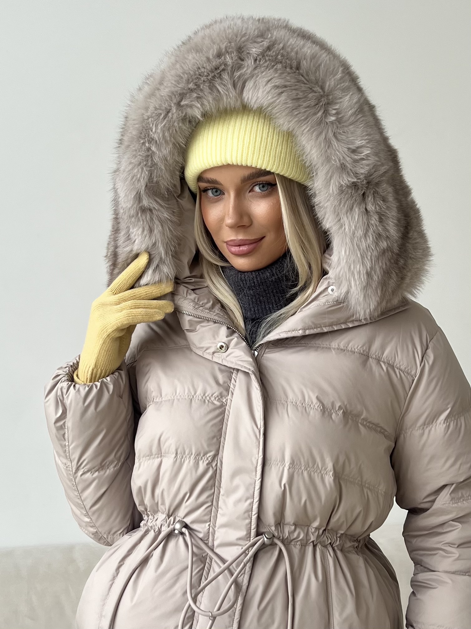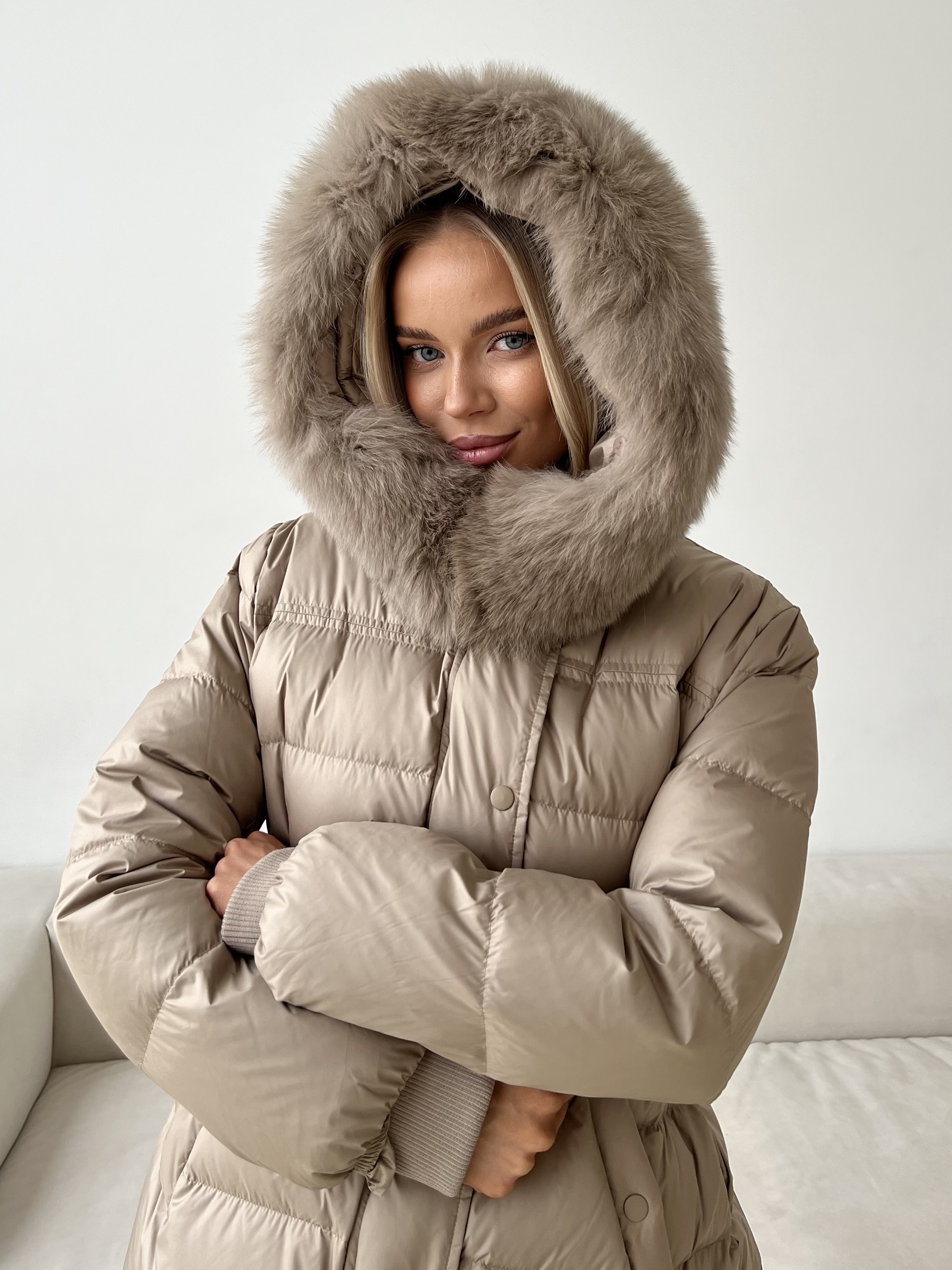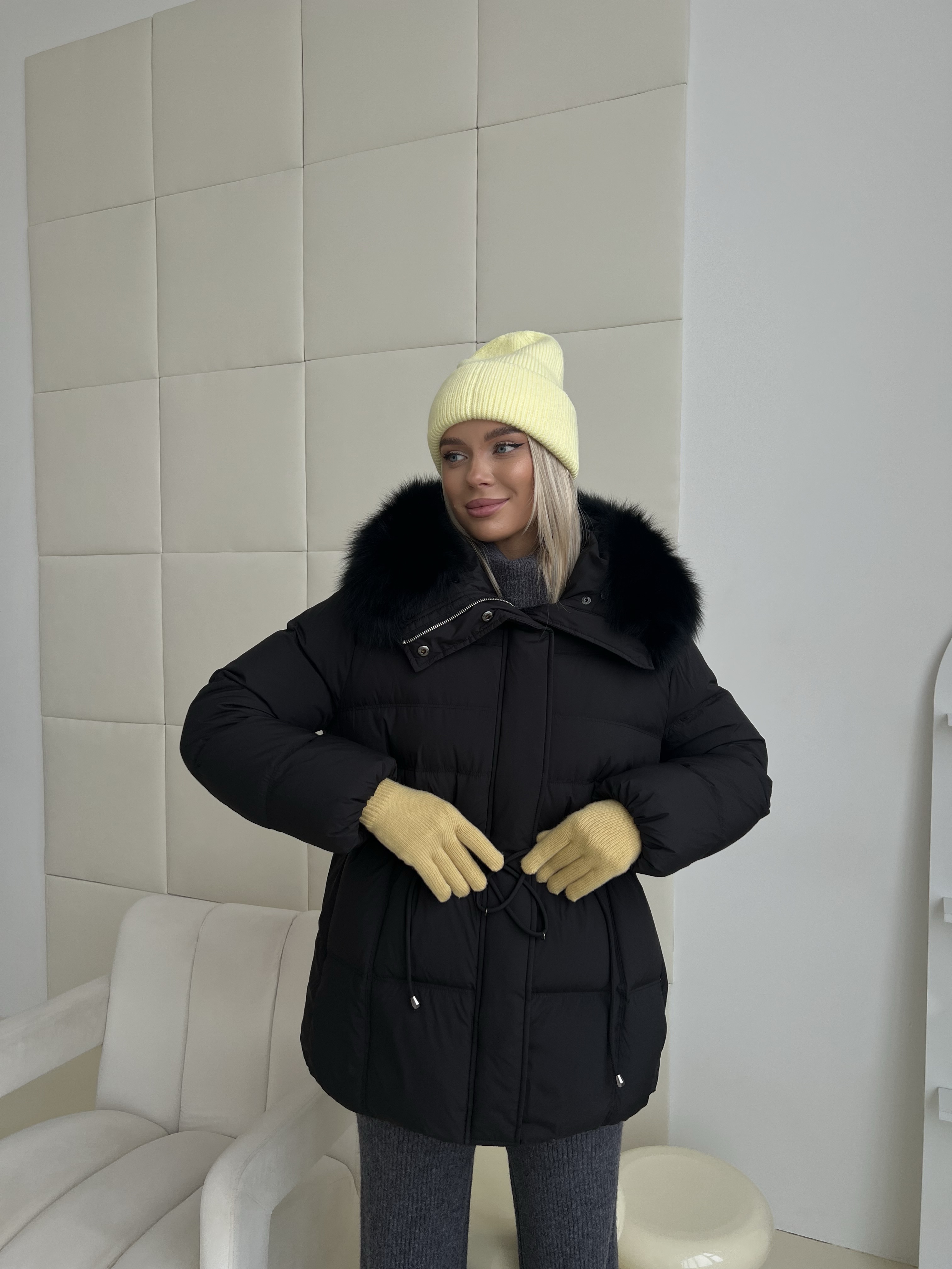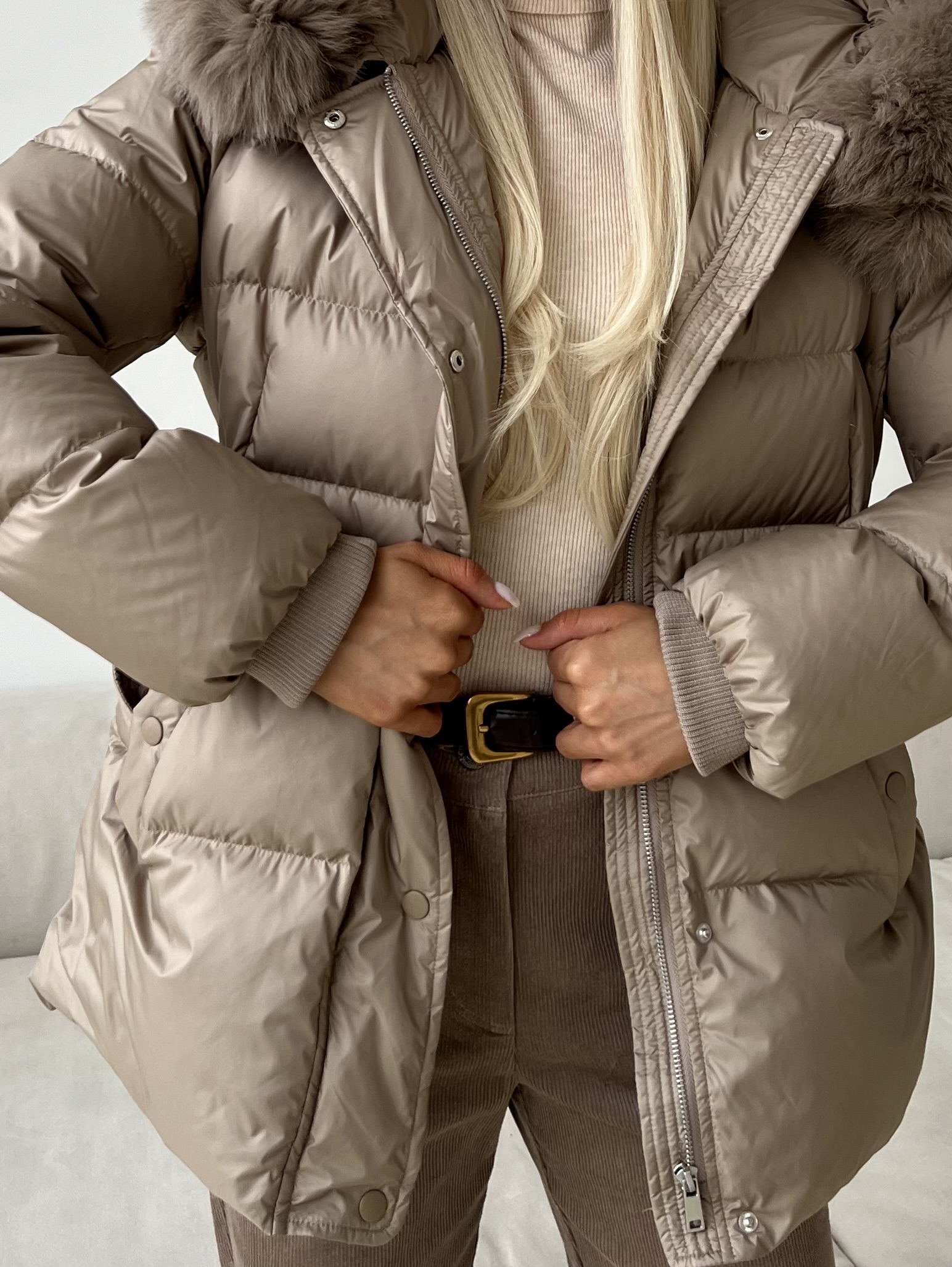 Натуральный мех добавляет образу статусности и завершённости, делая пуховик особенно эффектным. Пояс подчёркивает талию и позволяет регулировать посадку — можно носить как более приталенно, так и свободно. Универсальный вариант для города, поездок и долгих зимних прогулок
