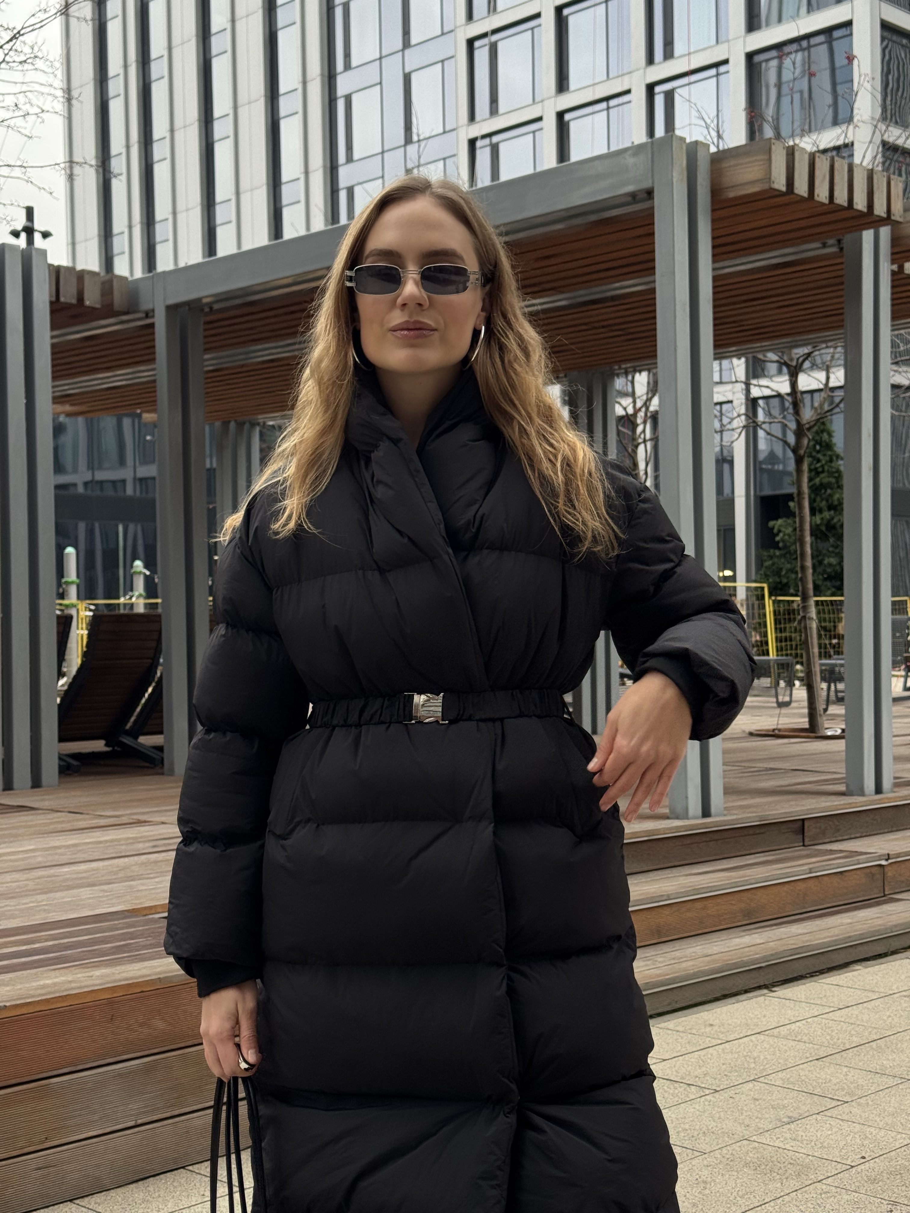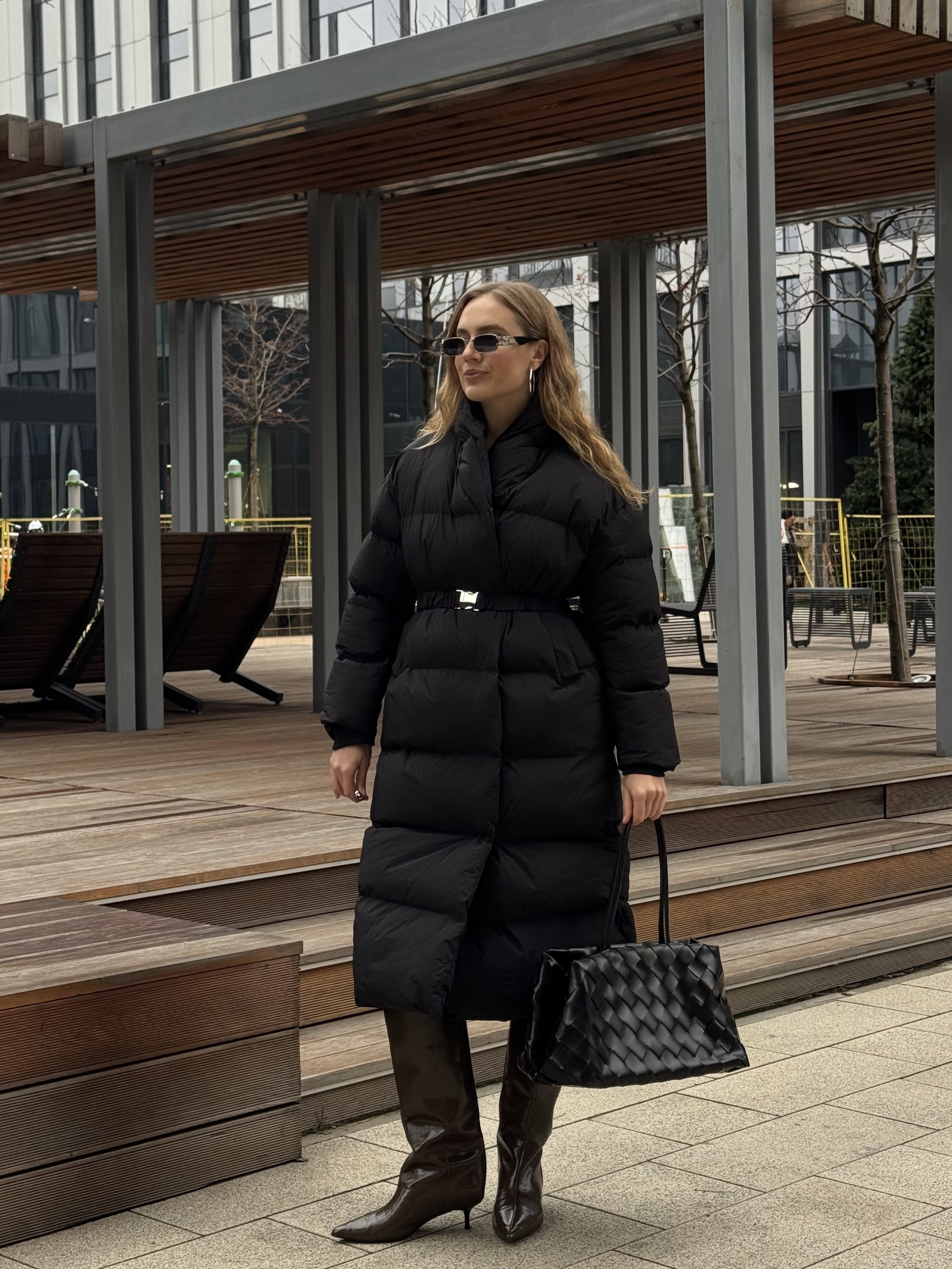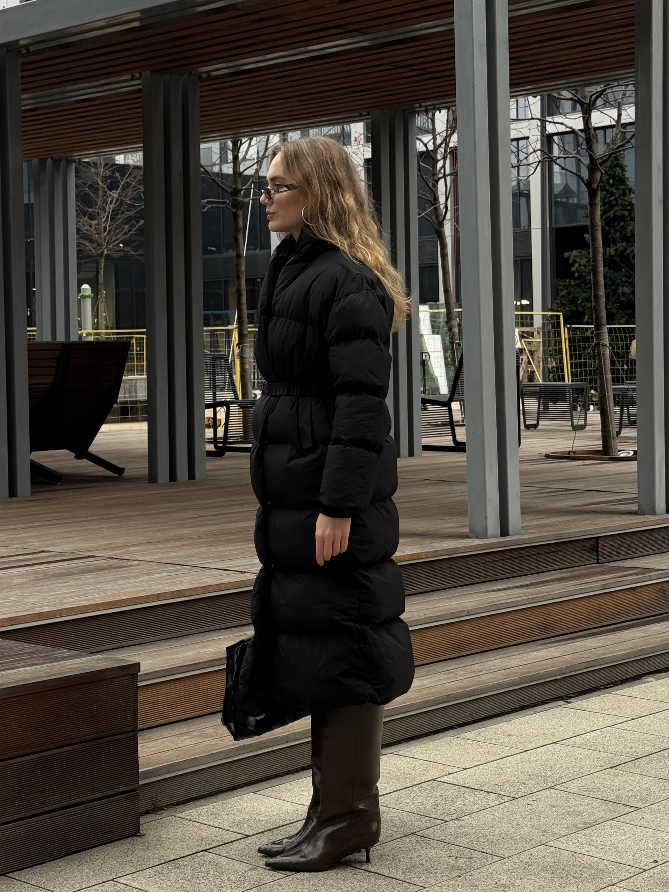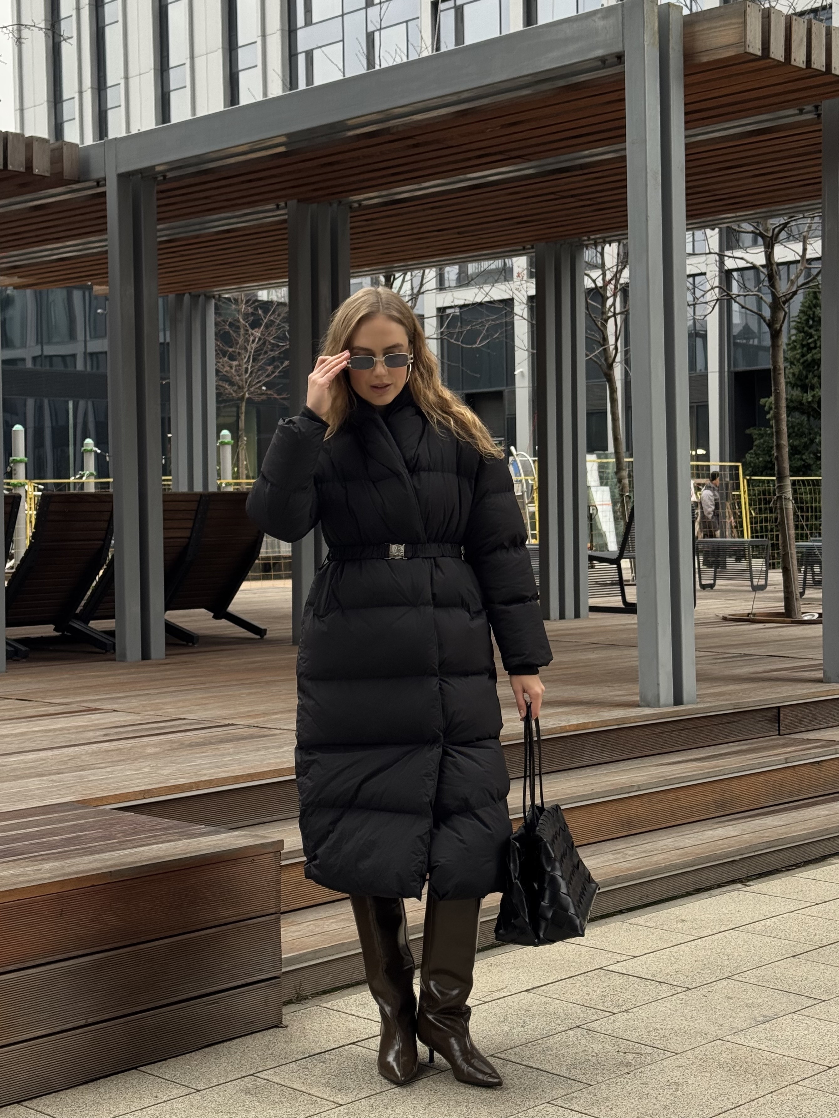 Этот длинный пуховик создаёт ощущение полного укрытия благодаря объёмной стёжке, прямому силуэту и высокому воротнику. Модель выглядит аккуратно и продуманно: длина до середины голени обеспечивает надёжную защиту и комфорт в холодные дни.