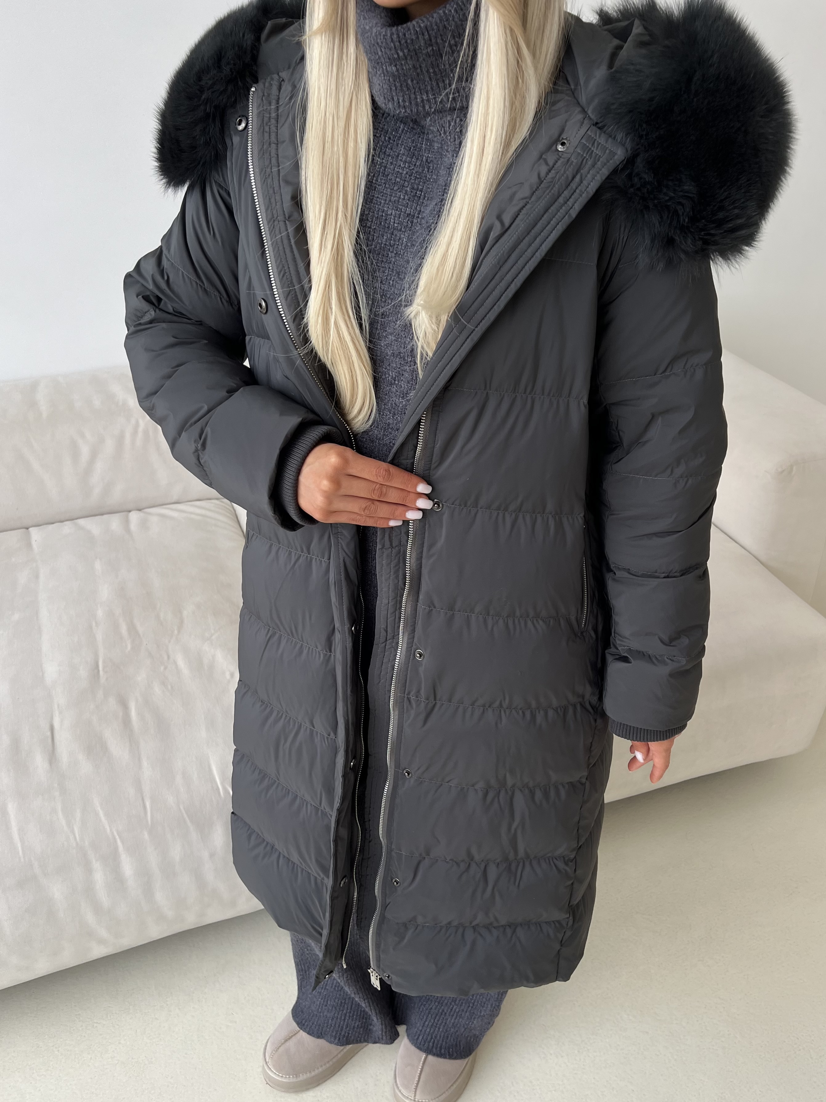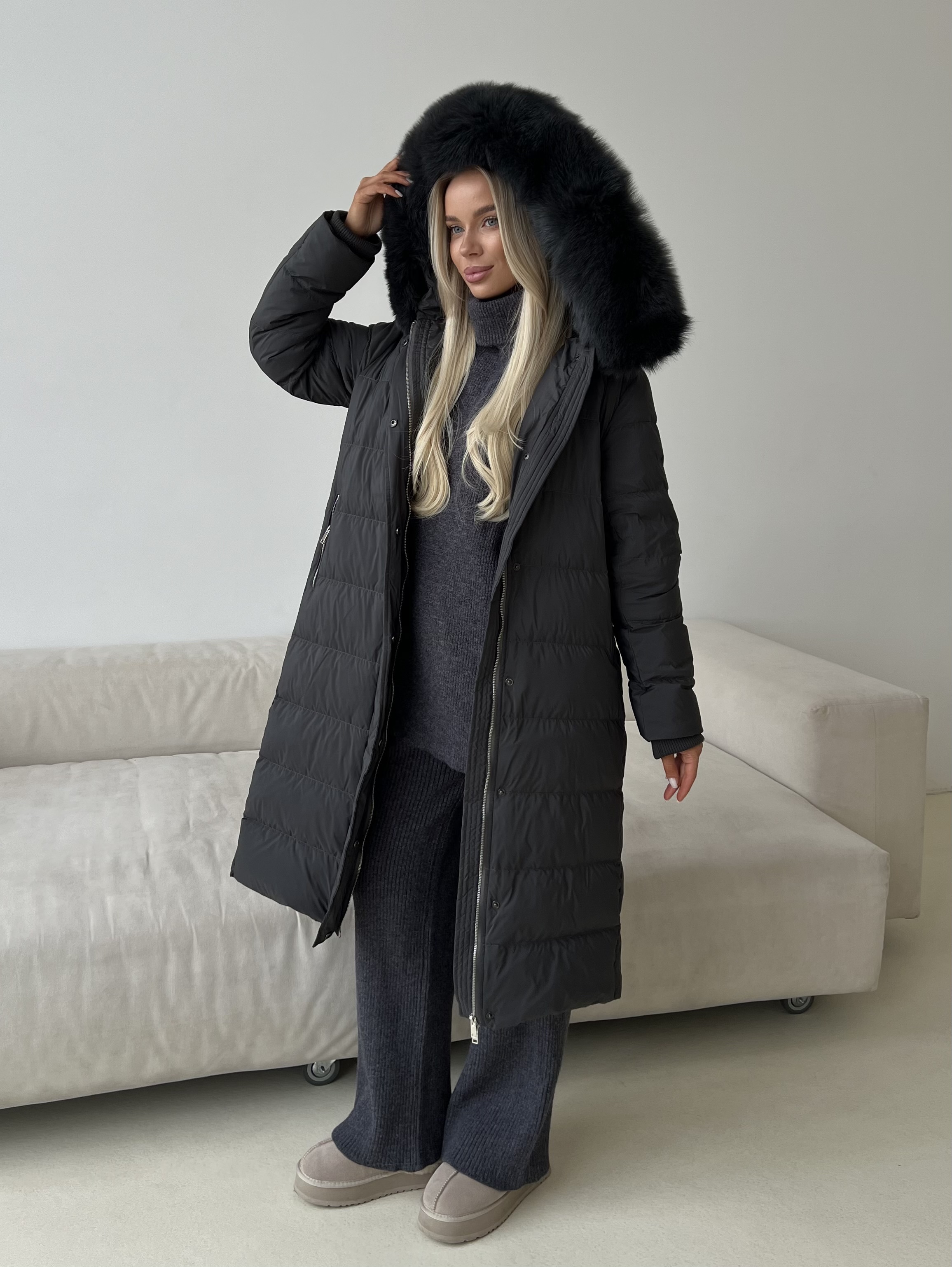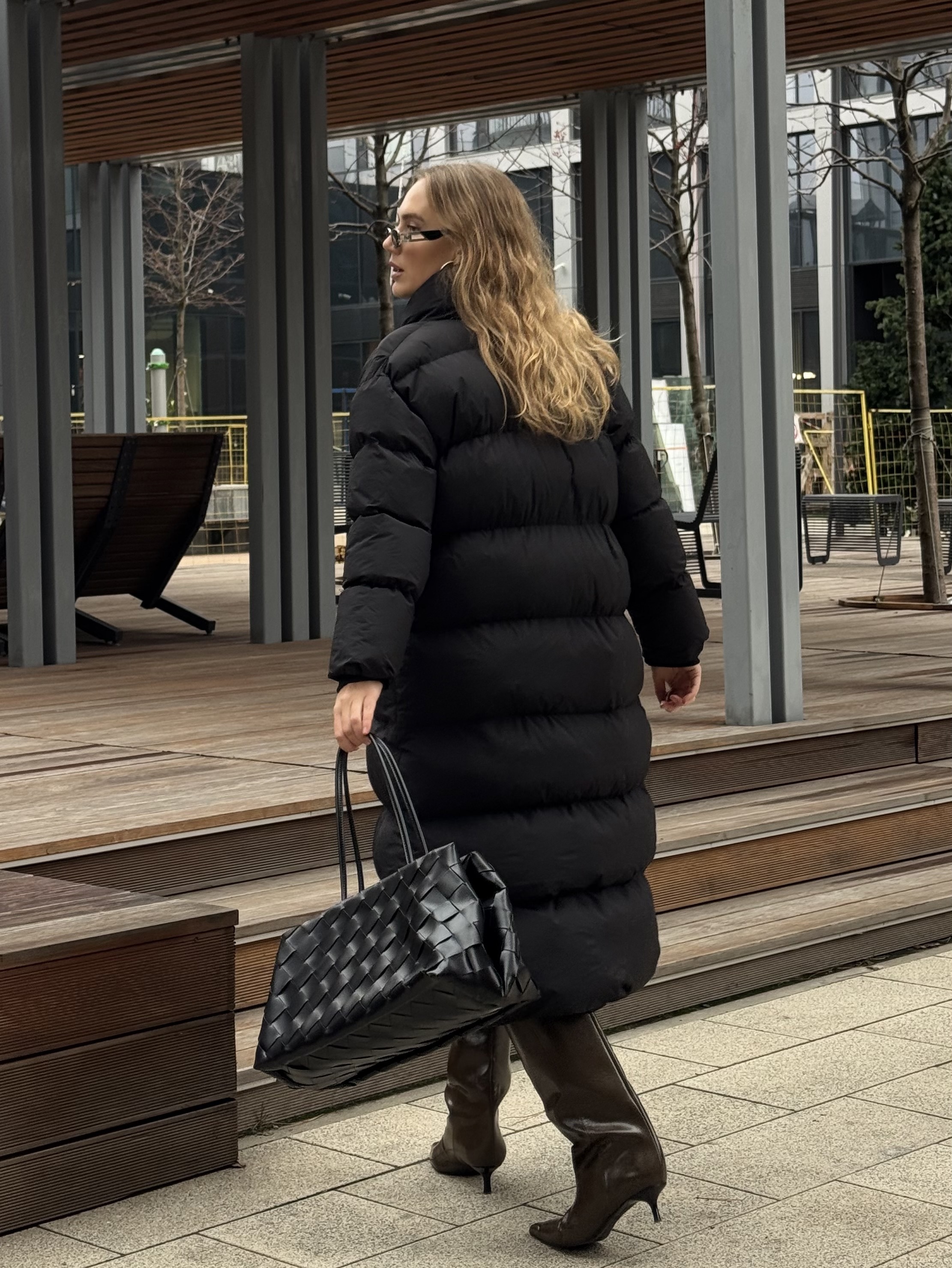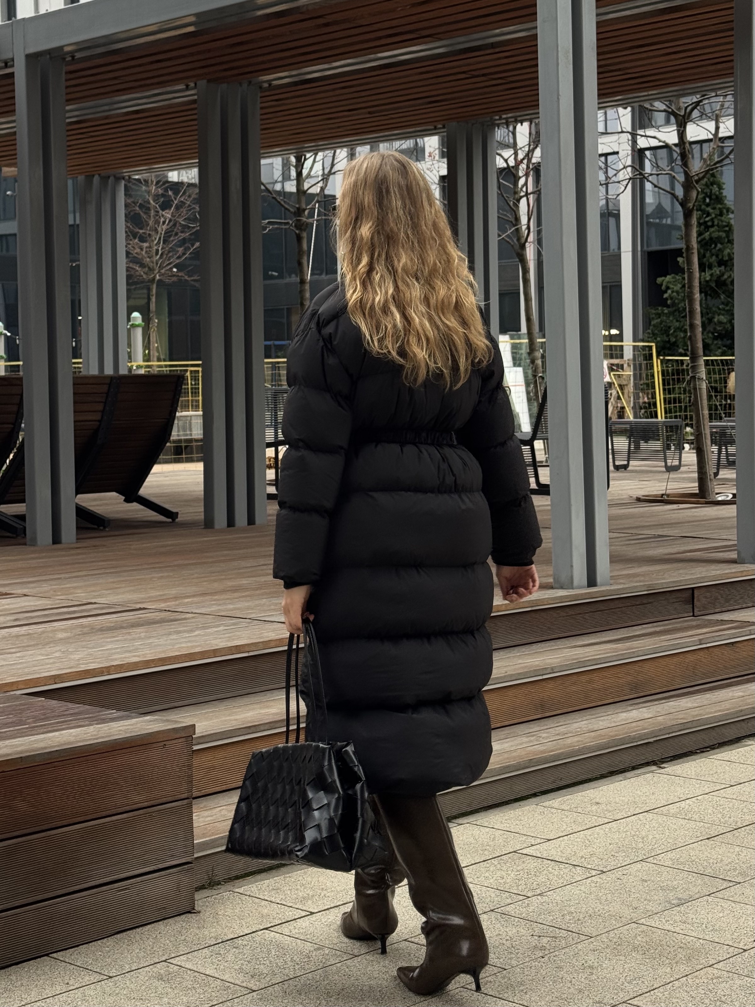 Этот длинный пуховик создаёт ощущение полного укрытия благодаря объёмной стёжке, прямому силуэту и высокому воротнику. Модель выглядит аккуратно и продуманно: длина до середины голени обеспечивает надёжную защиту и комфорт в холодные дни.
