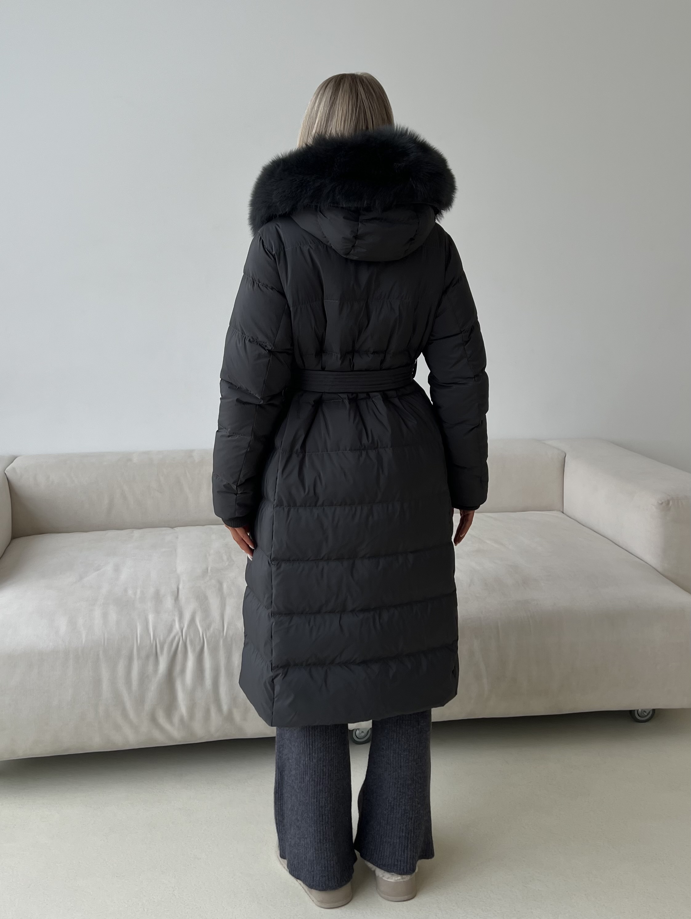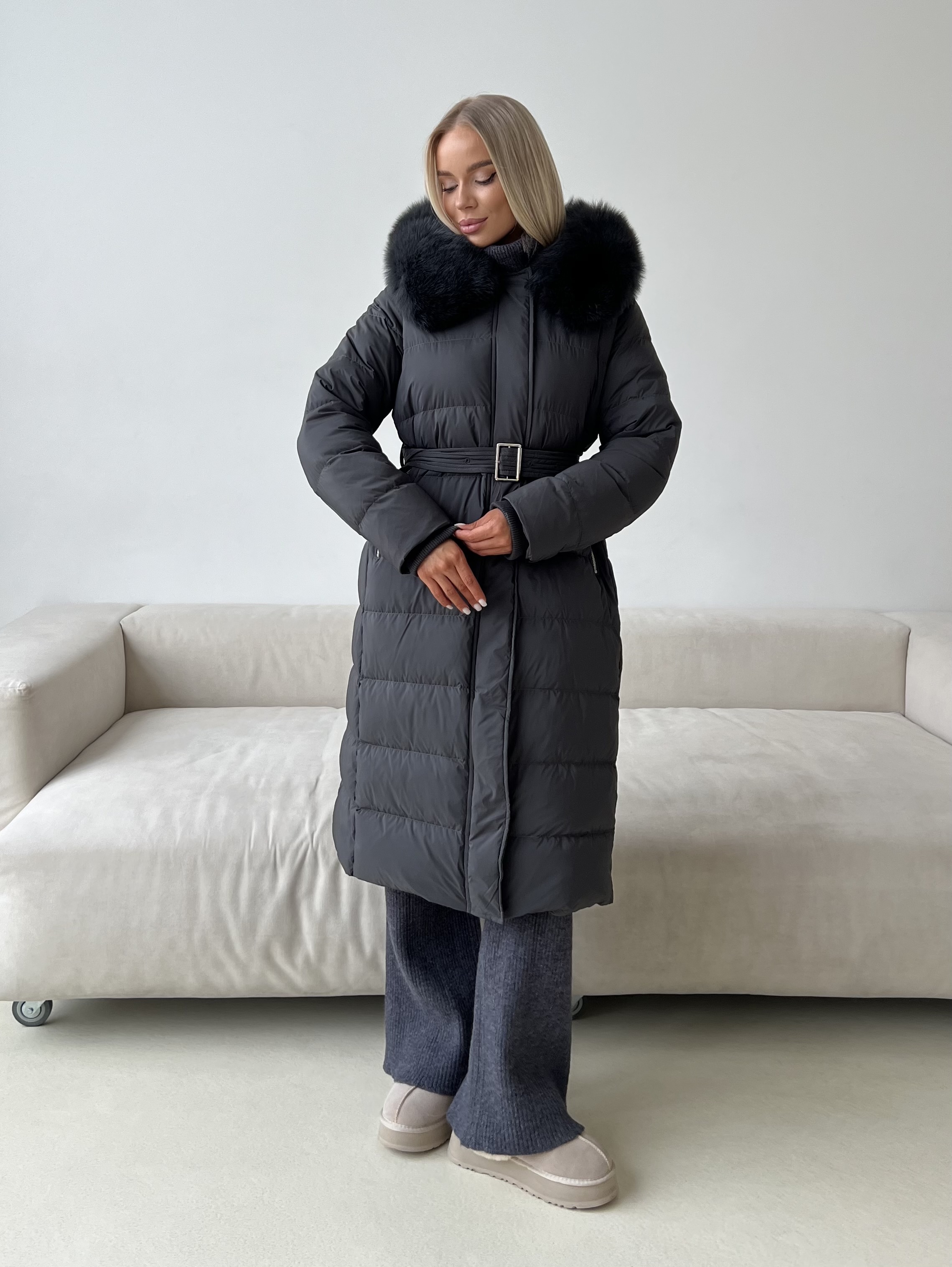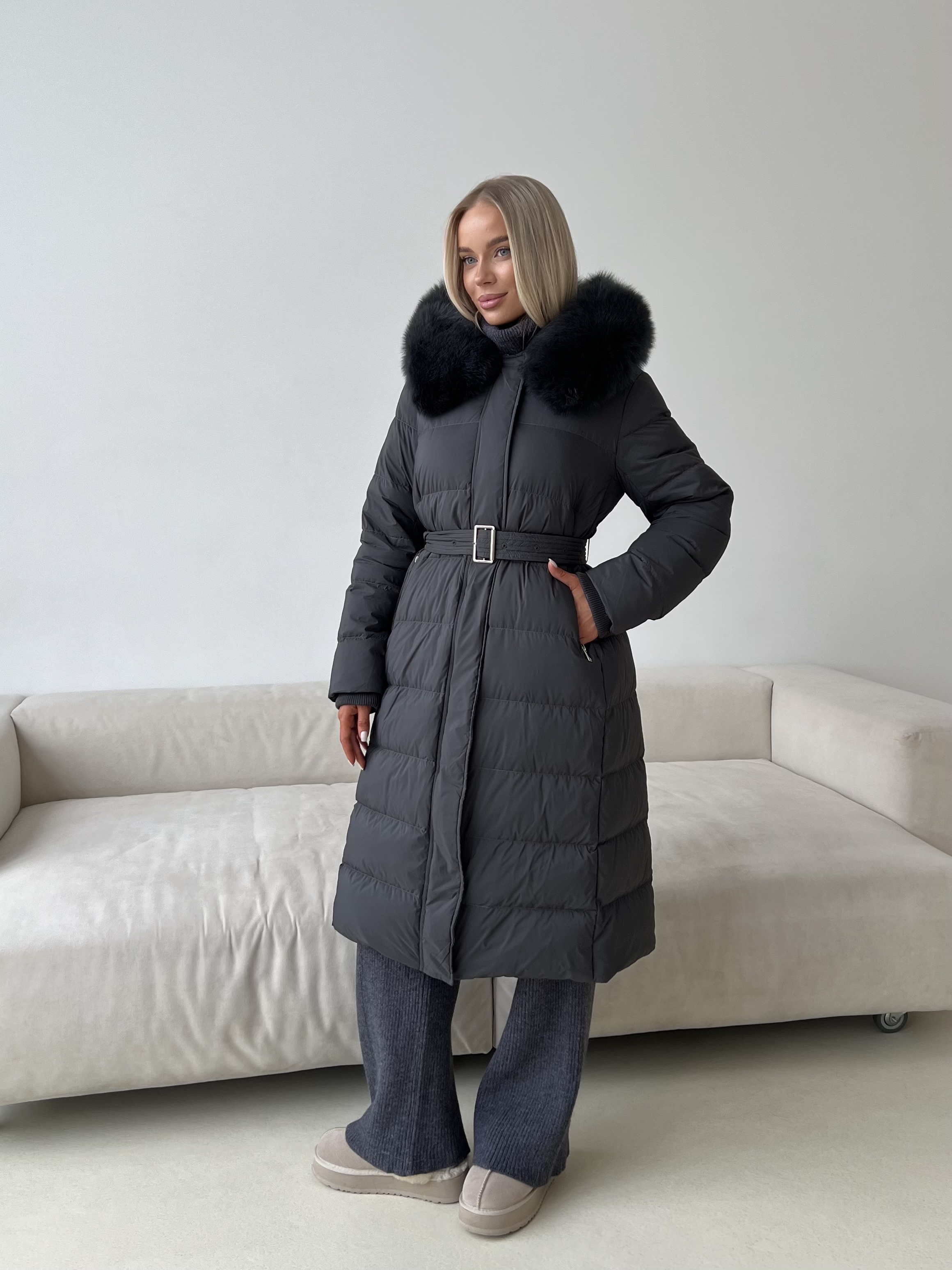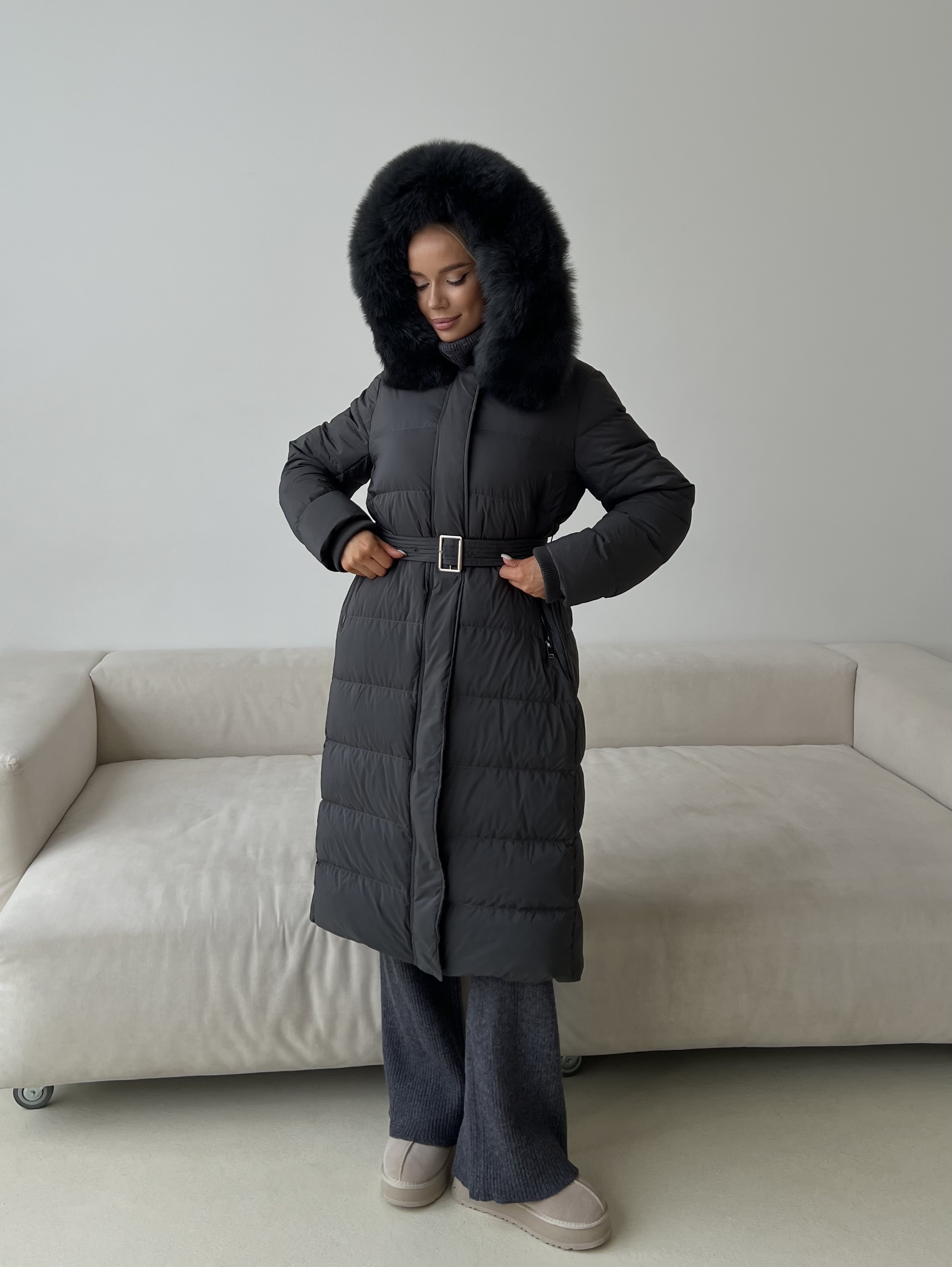 Этот длинный пуховик создаёт ощущение полного укрытия благодаря объёмной стёжке, прямому силуэту и высокому воротнику. Модель выглядит аккуратно и продуманно: длина до середины голени обеспечивает надёжную защиту и комфорт в холодные дни.
