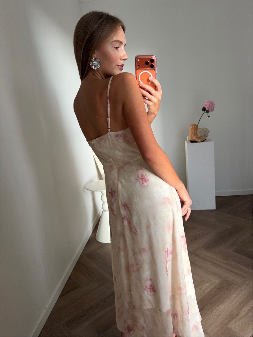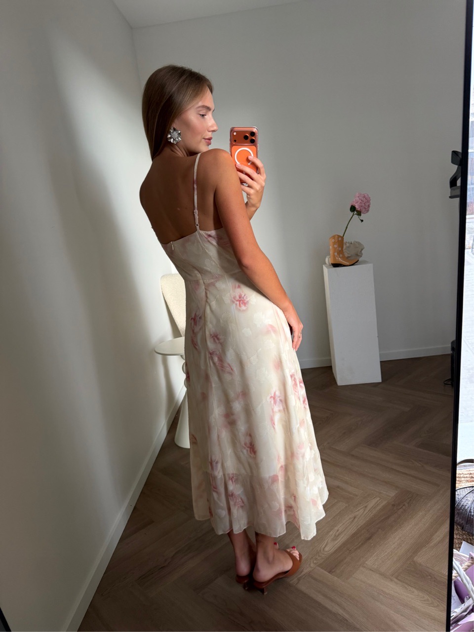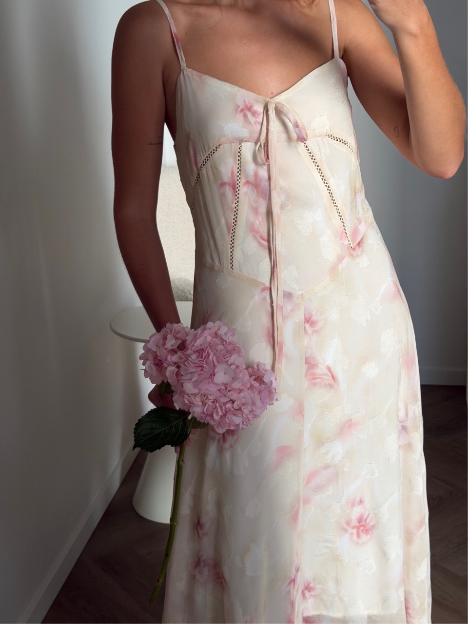 Ткань струится при движении и мягко ложится по телу, а расклешённая юбка добавляет образу воздушности и плавности. Модель выглядит женственно и утончённо, легко вписываясь как в романтичные повседневные образы, так и в более нарядные сочетания с лаконичными аксессуарами и открытой обувью.