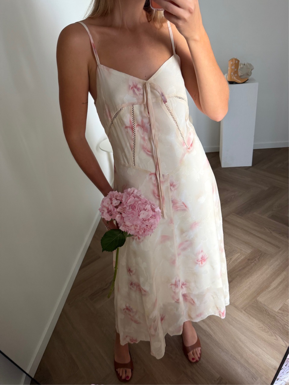 Лёгкое платье на тонких бретелях с мягко приталенным силуэтом, который аккуратно подчёркивает фигуру. Лиф выполнен с деликатными декоративными линиями и аккуратной сборкой по центру, создающей изящный акцент и визуально вытягивающей силуэт.