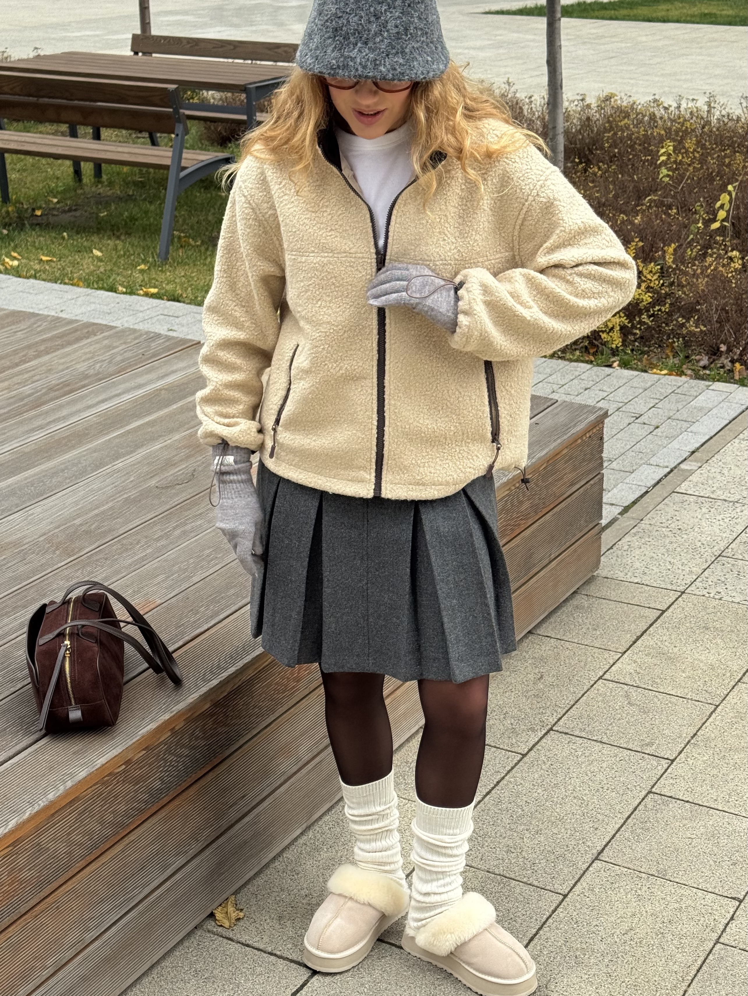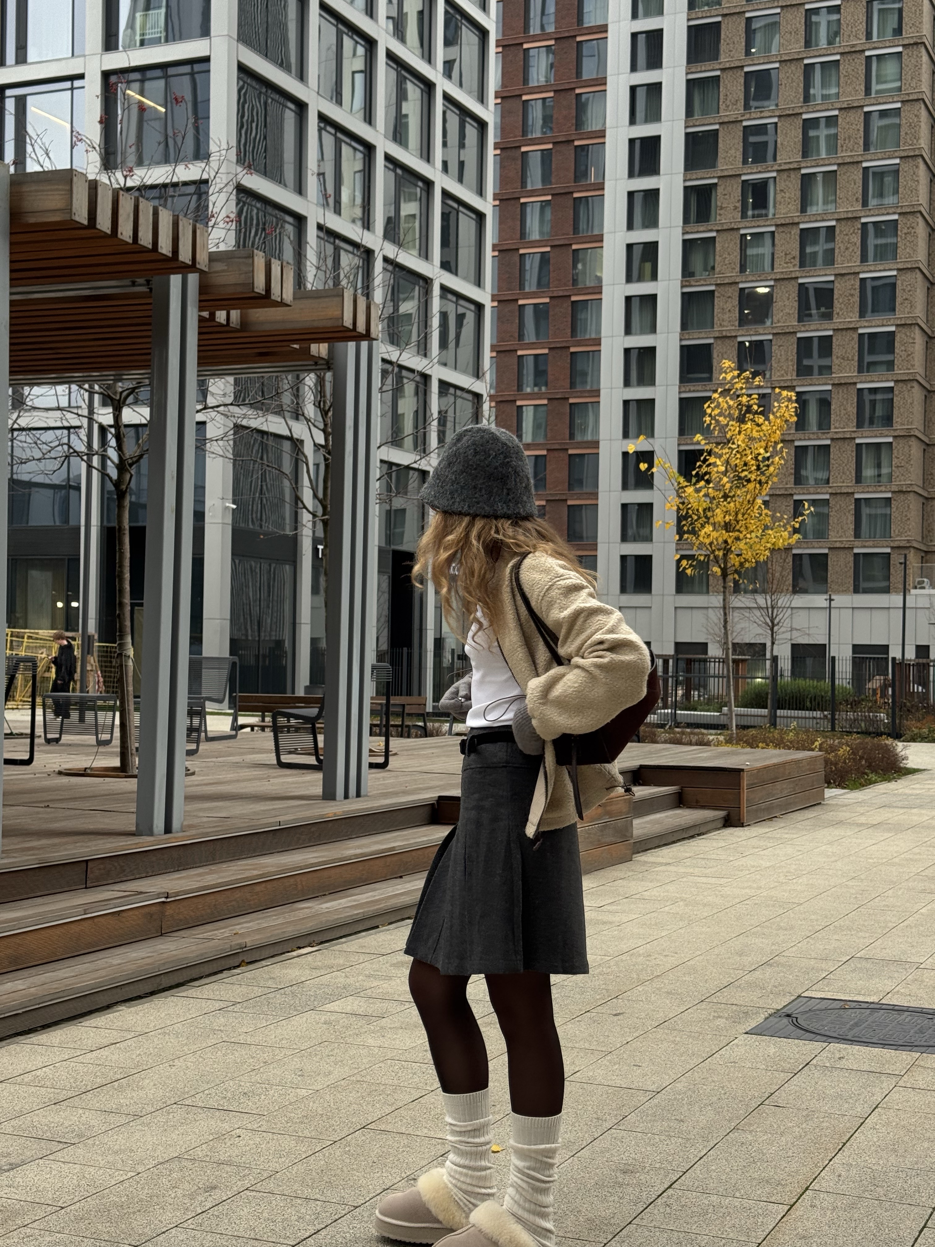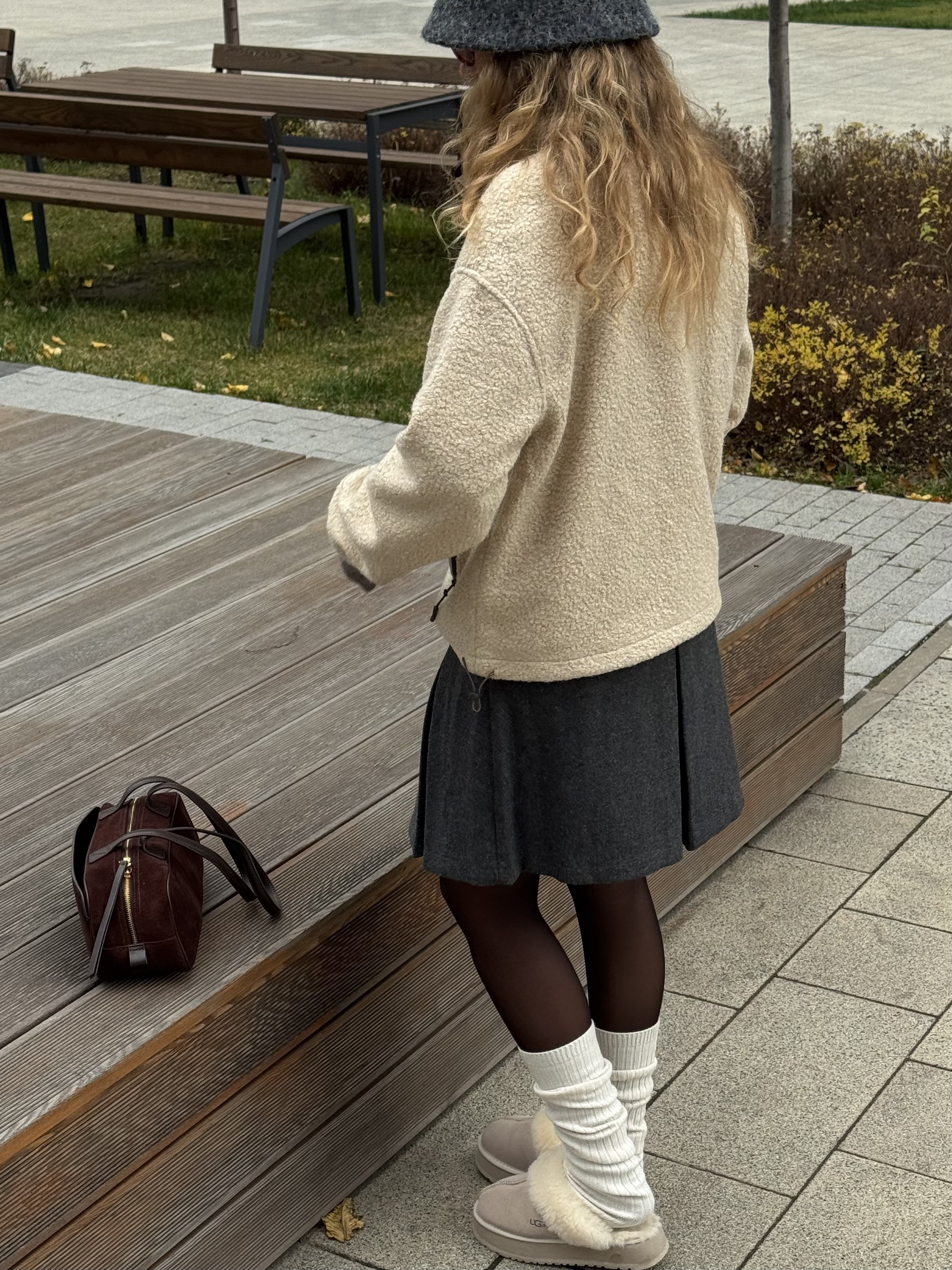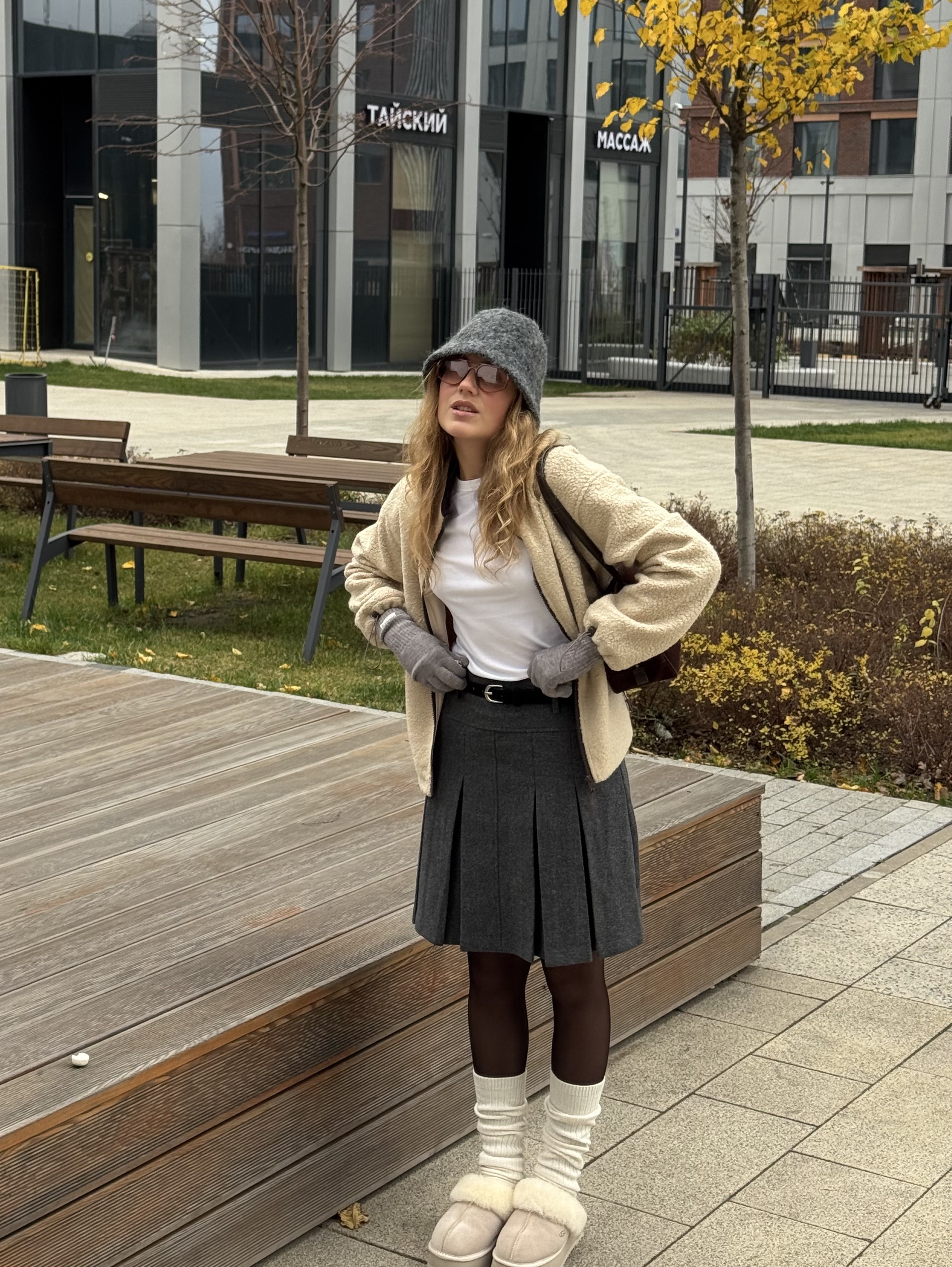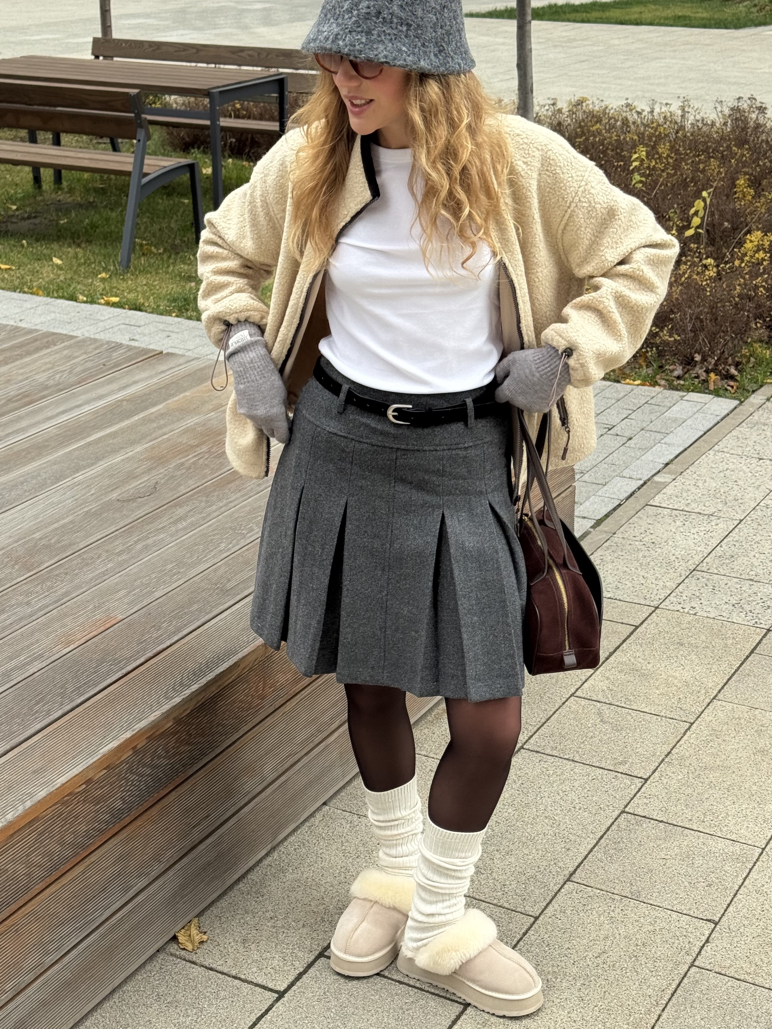 Юбка из тёплой шерстяной ткани с мягкой фактурой и удобной посадкой на талии. Глубокие встречные складки создают аккуратный объём и красиво двигаются при ходьбе. Благодаря плотному материалу модель отлично подходит для зимнего сезона — она сохраняет тепло и при этом выглядит элегантно. Идеальна для образов с уютными свитерами, гольфами, лонгсливами и тёплыми ботинками.